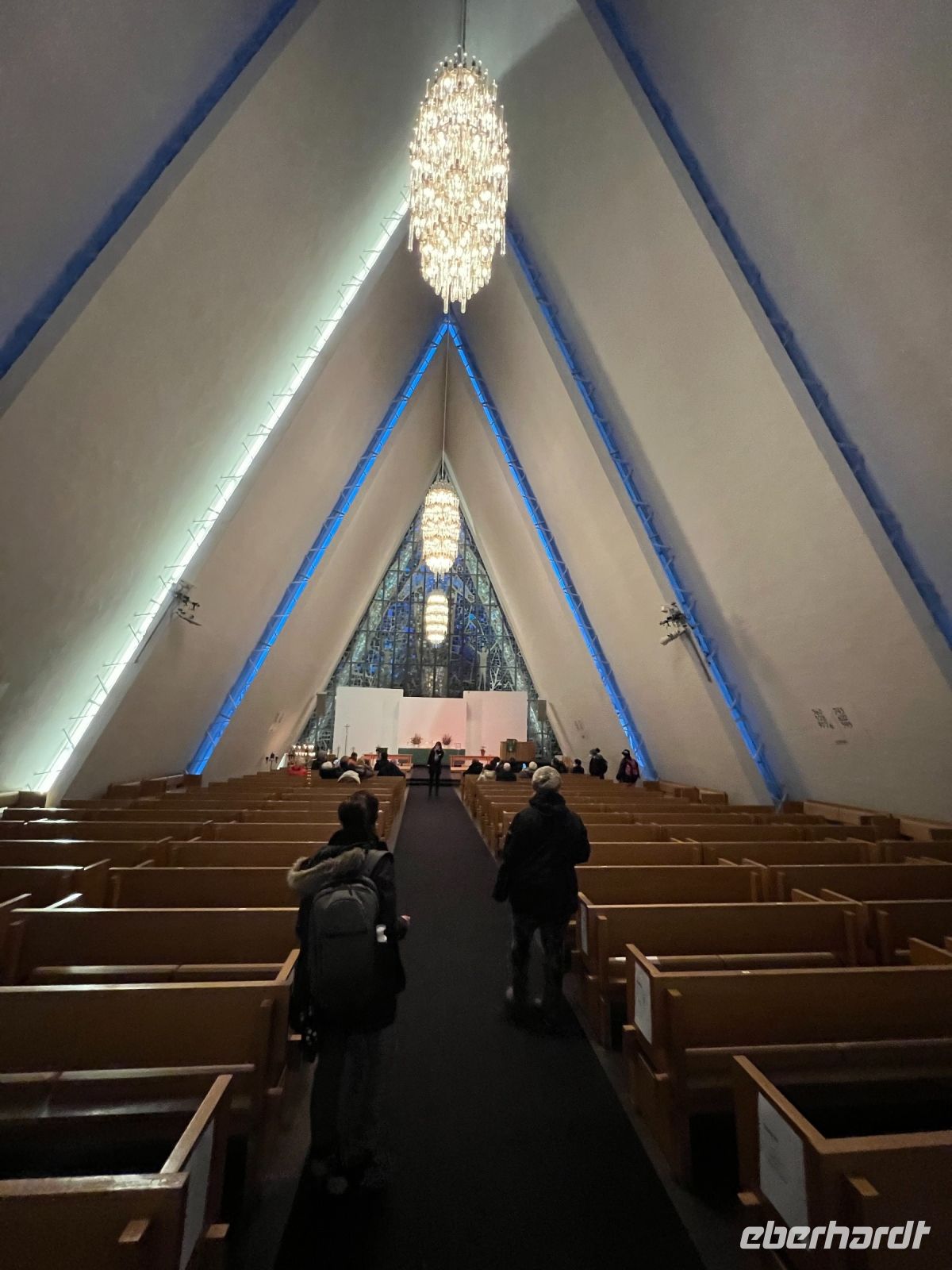 Ob Eigenanreise oder Transfer nach Dresden – alle waren pünktlich in Dresden am Flughafen, so dass wir nach den Check-in-Formalitäten unter Corona- Bedingungen auf den Abflug nach Tromsö warteten. Pünktlich starteten wir in Richtung Norden und nach der Landung u. Gepäckaufnahme und Schnelltest das sehr viel Zeit in Anspruch nahm, erwartete uns schon unser örtlicher Guide für die Stadtführung in Tromsö. Die Stadt mit ca. 78.000 Einwohner liegt auf dem Breitengrad von Nordalaska und wird liebevoll auch „Paris des Nordens“ oder auch „Venedig des Nordens“ genannt. Schon die ersten Eindrücke auf der Rundfahrt lässt sich der Flair und Charme dieser Stadt erahnen. Vorbei mit einem Blick auf den Hausberg der Stadt und den Sehenswürdigkeiten wie Dom, Zentrum u. Hafen, Erlebniszentrum Polaria, Polarmuseum steuerten wir auch die bekannte Eismeer-Kathedrale von Tromsö an. Gilt sie heute doch als Wahrzeichen der Stadt. Was den Architekten in Bezug auf das Aussehen inspiriert hat, ist bis heute offen und wird wohl nie gelöst werden. In der Interpretation glich das Gebäude einem Eisberg genauso wie dem Trockungsgestell für Fische. Im Inneren besticht aber das 23 Meter hohe Glasmosaik mit dem Titel „Die Wiederkehr Jesu“ und gilt als das größte Glasgemälde Europas. Am Ende der Tour hat sich so mancher vielleicht in diese Stadt verliebt – ob das Blaulicht und die winterliche Stimmung dazu beigetragen hat, konnte beim Abendessen ausgewertet werden. Einige wollte die Stadt bei Nacht noch entdecken. Das eigentliche Polarlicht blieb uns heute aber verschlossen. So mussten wir mit den „künstlichen Polarlichtern“ der Stadt vorlieb nehmen. Ein Glanz der etwas entschädigte.