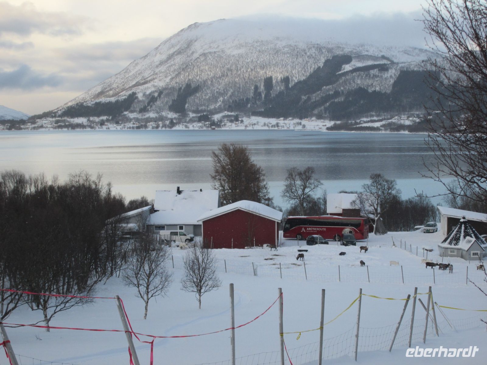 Glücklicherweise lässt der Schneesturm etwas nach, sodass wir auch die Fjordlandschaft, die an uns vorbeizieht, genießen können. Unser Weg führt uns dann, mit einem Stopp in Finnsnes, durch die Rystraumen-Enge. Hier liegt auch die 2,1 km lange und rund 900 Meter breite Insel Ryøy, die viele Jahre durch die Universität Tromsø genutzt wurde, um dort Moschusochsen anzusiedeln und deren Verhalten zu erforschen.