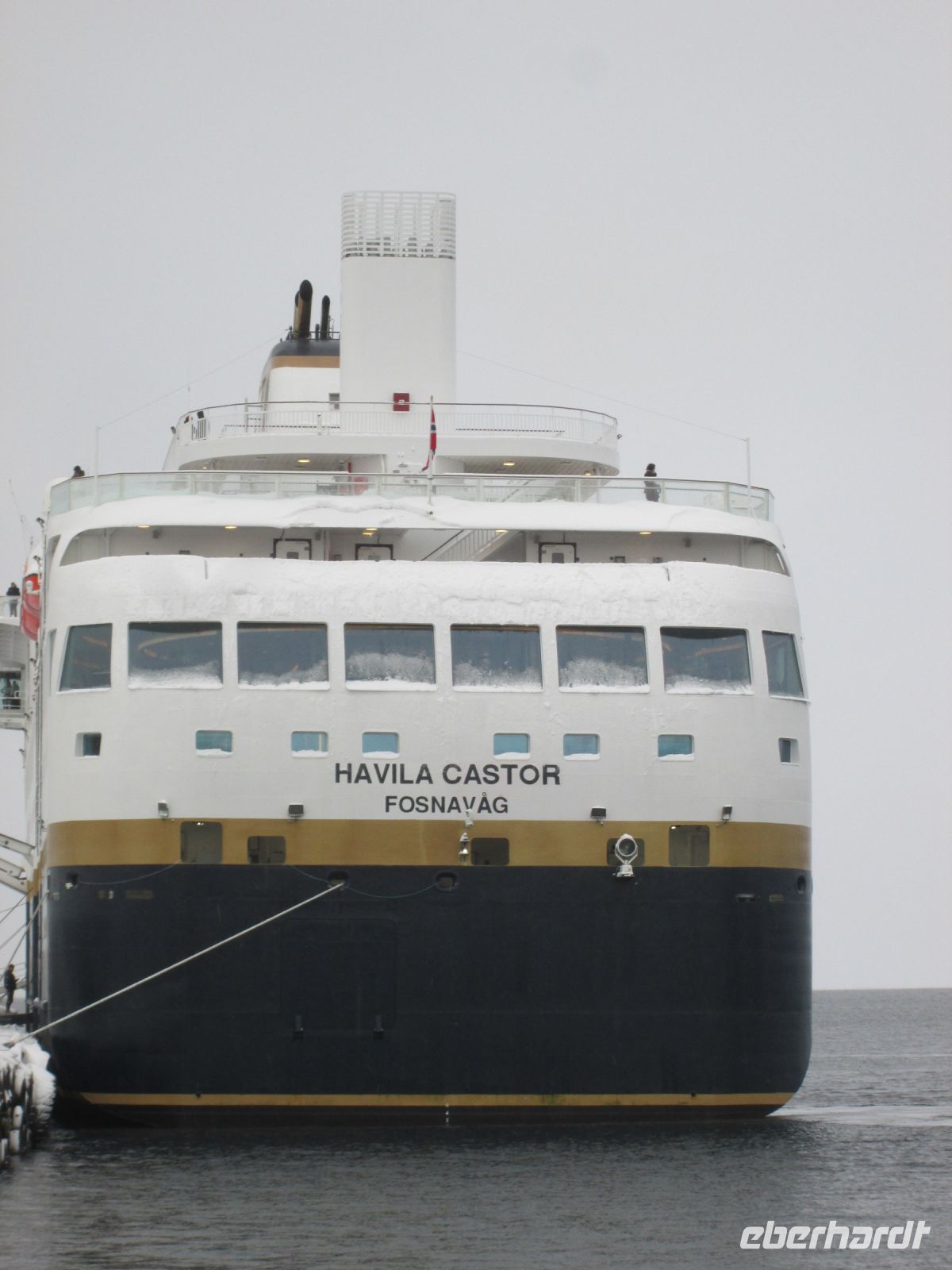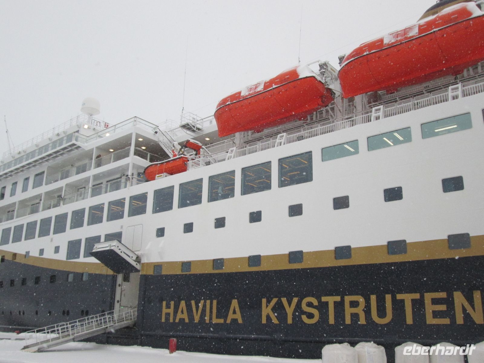 Früh am Morgen verlassen wir unser Hotel in Harstadt. Unser Gepäck wird in den Bus verladen und dann geht es für uns im Schneesturm zum nahegelegenen Hafen. Auf der Postschiffroute wollen wir heute zurück nach Tromø fahren. Seit 2021 hat die legendäre Hurtigruten Konkurrenz bekommen, sie teilen sich den Fahrplan nun mit der Reederei Havila. Das ebenfalls norwegische Unternehmen hat sich auf die Flagge geschrieben, seine Schiffe so nachhaltig und emissionsfrei wie möglich durch die schützenswerten Fjorde Norwegens fahren zu lassen. Sie verfügen über die größten Schiffakkus der Welt, die an Land mit Strom aus Wasserkraft geladen werden. Im Verbrennerbetrieb arbeiten sie mit Wasserstoff und scheiden somit 24% weniger CO² aus als mit herkömmlichem Schiffsdiesel.