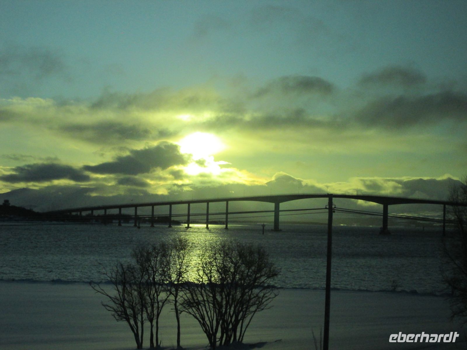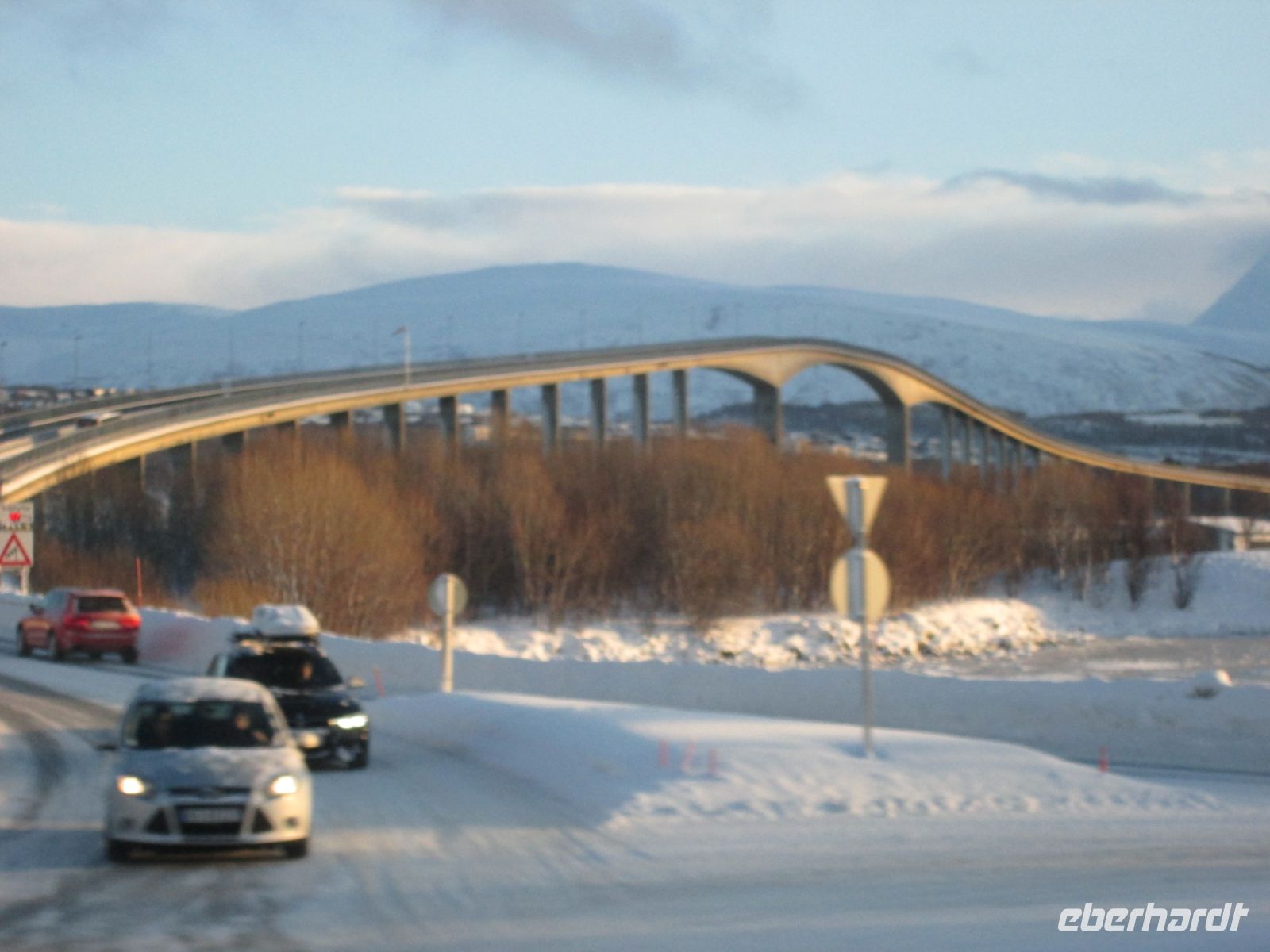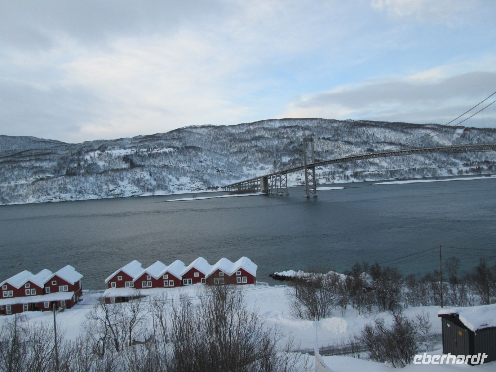 Wir folgen dem Fjord weiter in Richtung Westen. Am frühen Nachmittag erreichen wir den Tjeldsund, welcher das norwegische Festland von der Vesterålen-Insel Hinnøya trennt. Wir legen hier unsere letzte Pause ein und überqueren anschließend die Brücke, die in den 1960er Jahren gebaut wurde. Leider zieht sich nun der Himmel langsam zu und die ersten Schneeflocken fallen - weitere Bergpanoramen bleiben uns also erst einmal verwehrt. Zu unserer Freude machen wir jedoch mehrere Elch-Sichtungen, einige davon sogar sehr nah der Straße. Stehen bleiben ist aber, so gerne wir es wollten, mitten auf der Schnellstraße keine Option.