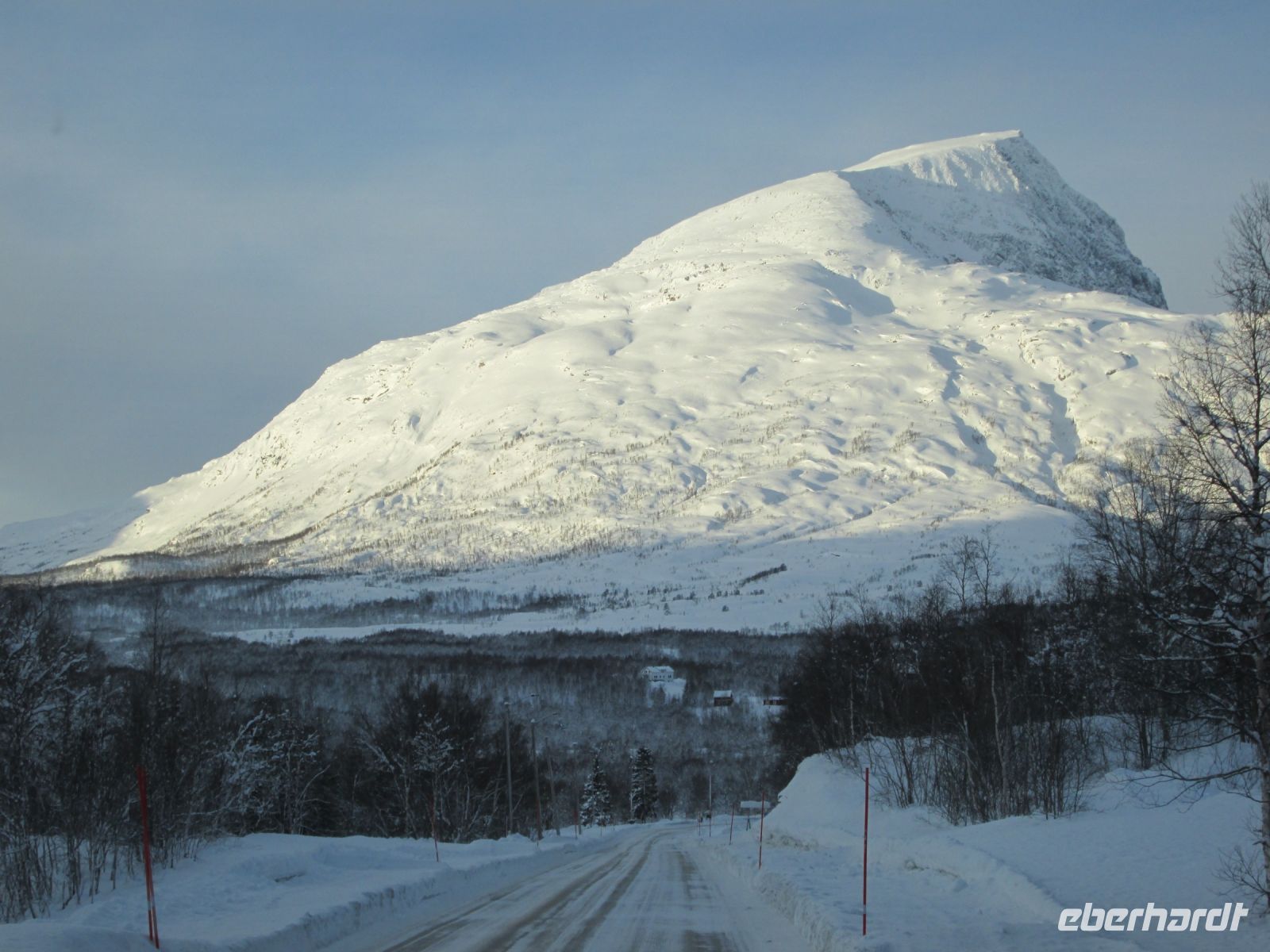 Schnell lassen wir Tromsø hinter uns. Entlang der Nationalstraße E8 folgen wir dem Balsfjord Richtung Süden und können in der schönen Morgenstimmung später auch das ein oder andere Foto schießen. Dann geht es weiter über die E6 durch das Målselv-Tal und dann weiter bei nach Bjerkvik am Ofotfjord. Der mächtige Meeresarm ist fast 80 Kilometer lang und an den tiefsten Stellen über 500 Meter tief. Von Weitem sehen wir die Hafenstadt Narvik, welche während des Zweiten Weltkriegs traurigen Ruhm erlangte. Der Grund für die blutigen Kämpfe zwischen Wehrmacht und Alliierten war der wichtige, ganzjährig eisfreie Erzhafen von Narvik und der Zugang zu dem Eisenerz aus der schwedischen Stadt Kiruna.