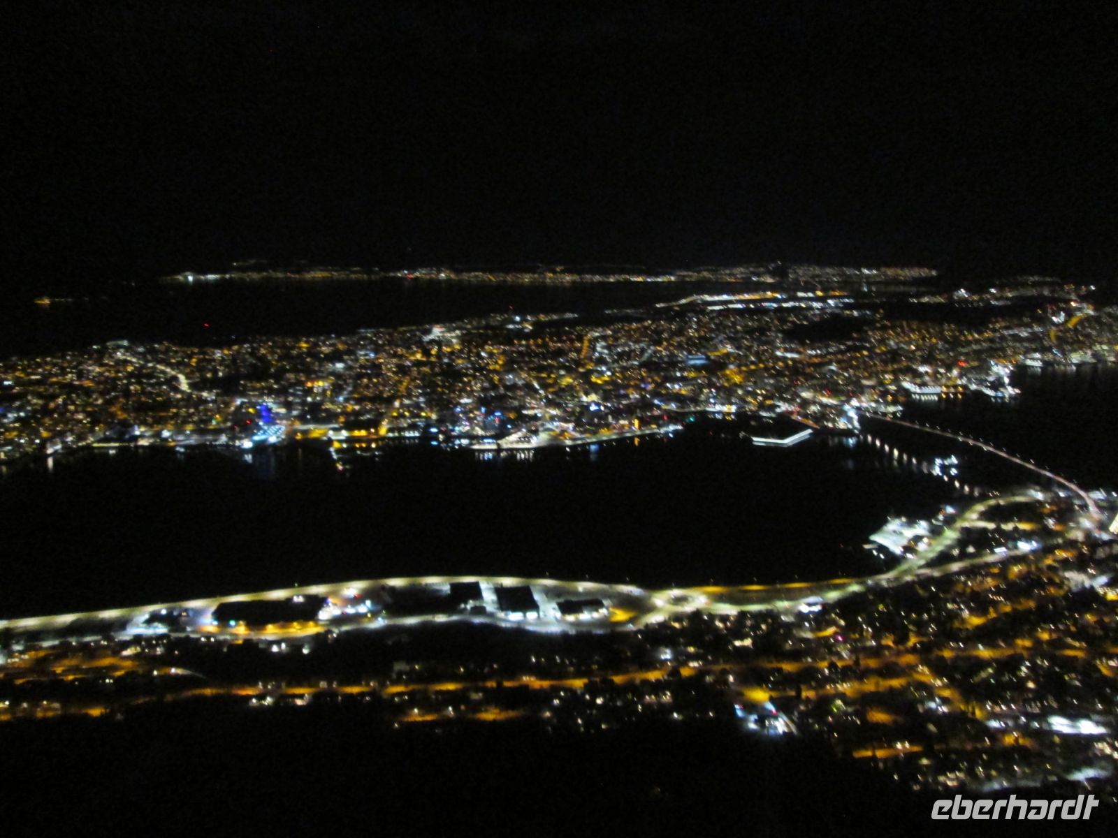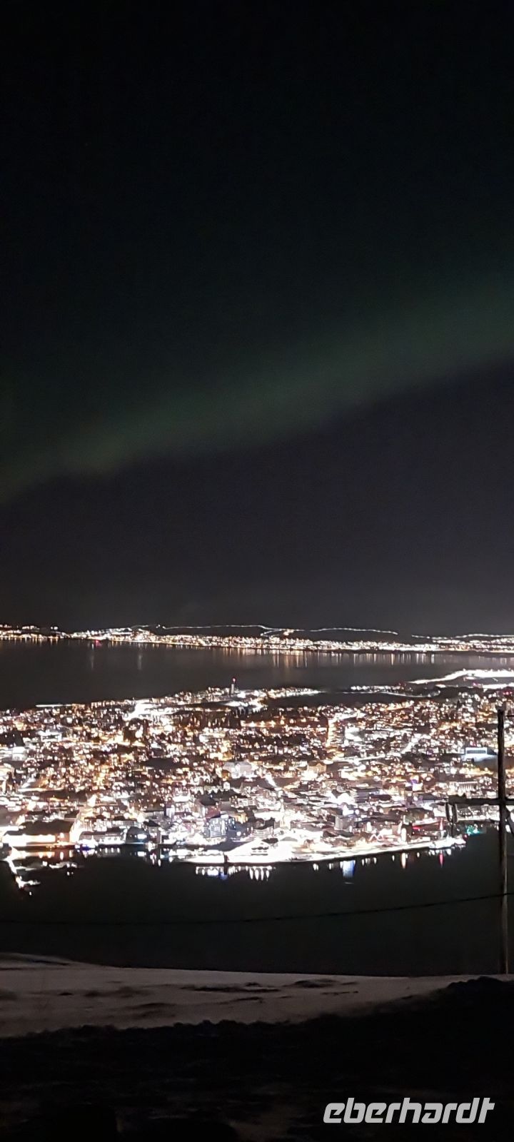 Mit dem Linienbus fahren wir zur Talstation der Bergbahn, die hinauf auf den Fjellheisen, den 421 Meter hohen Hausberg der Stadt, fährt. Oben angekommen zieht es uns natürlich zunächst auf die große Aussichtsterrasse. Alleine die Aussicht auf die hellerleuchtete Stadt wäre es ja eigentlich schon wert herzukommen - aber relativ schnell erkennen wir: am Himmel zeichnet sich ein deutlicher Bogen ab. Da ist sie, die Aurora Borealis!