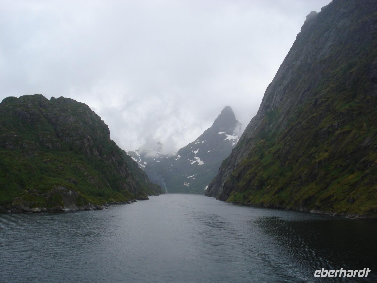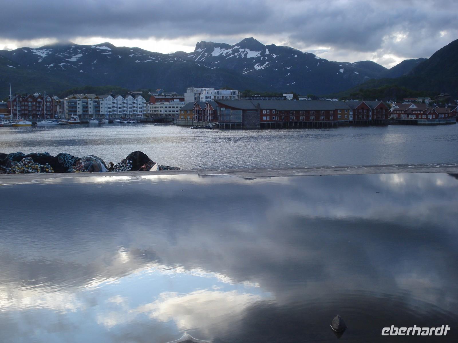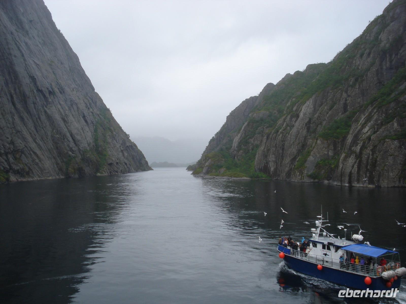 Und heute hatten wir immer noch Dauerregen. Ein Blick auf Narvik war uns allerdings vergönnt, bevor wir über die Tjeldsundbrücke die größte der Vesterålen - Insel Hinnoya erreichten. Unser Schiff trafen wir genau auf der Hadselbrücke bei Stokmarknes. Hier begann 1893 die Geschichte der „Reichsstrasse 1“ oder auch der schönsten Seereise der Welt der Hurtigrute. Wir fuhren mit dem Schiff Vesterålen durch den berühmten Raftsund und den Trollfjord nach Svolvaer. Das verregnete Wetter war wirklich ärgerlich. Angelangt auf den Lofoten verließen wir das Schiff in Svolvaer und spazierten zu unserem Rica Hotel auf der Insel Langholmen.