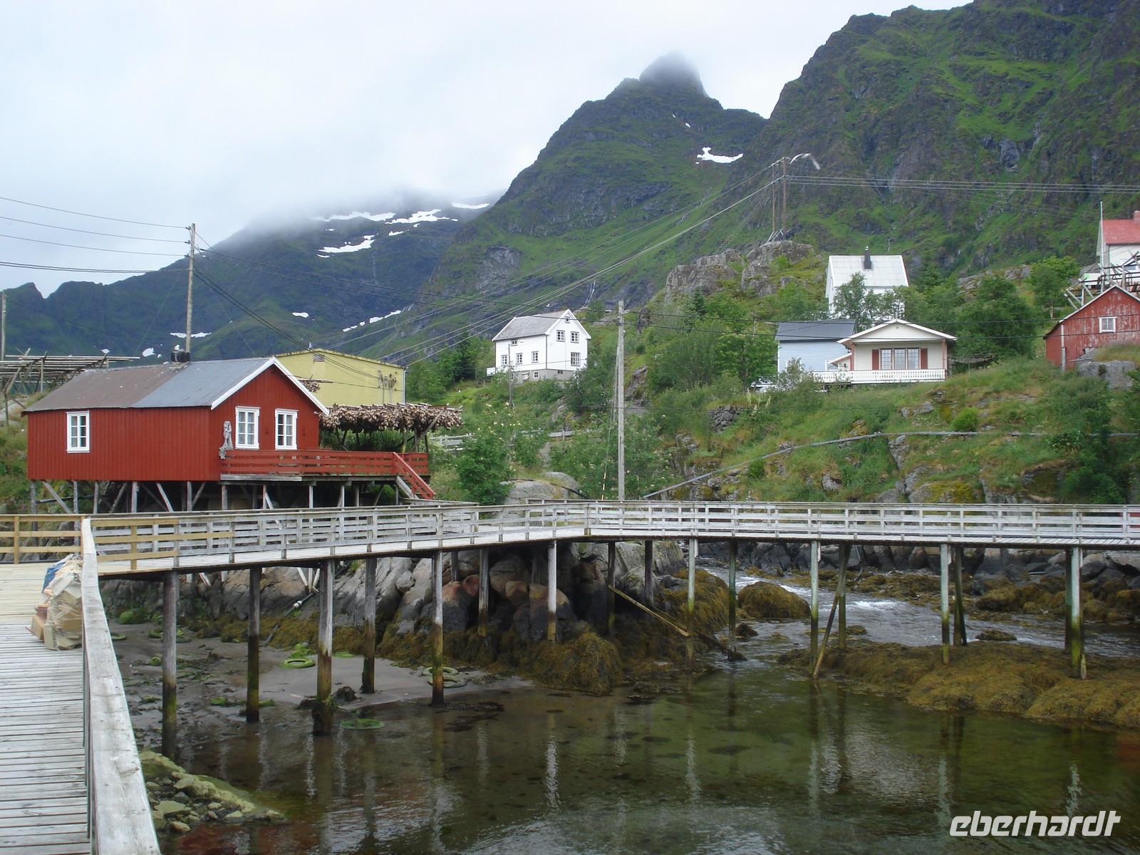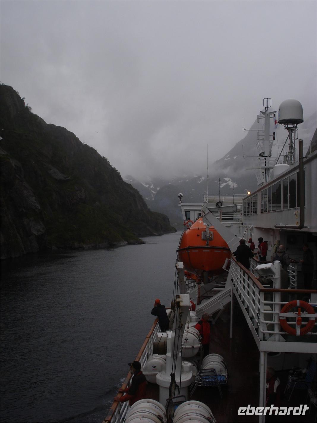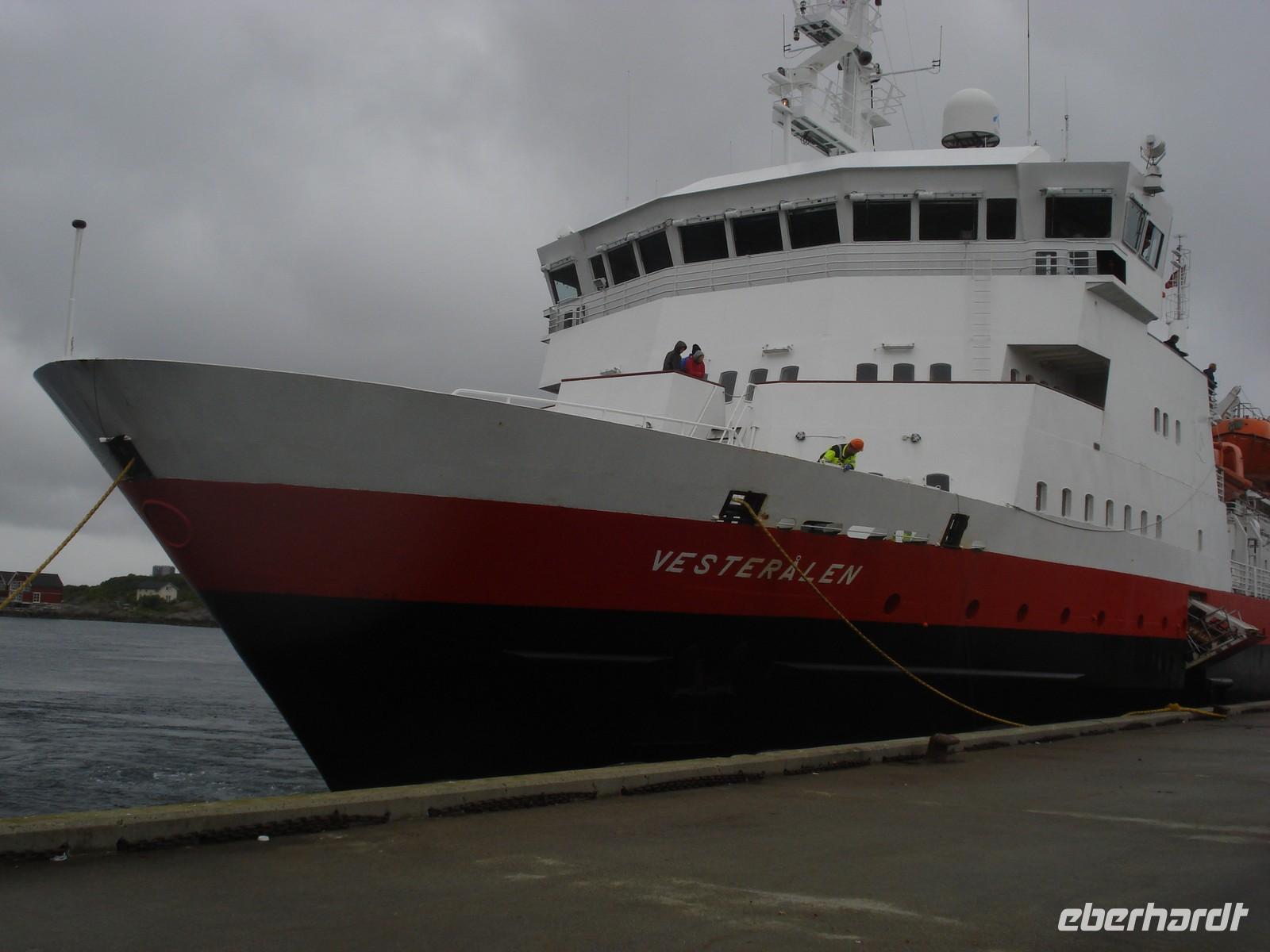 Und heute hatten wir immer noch Dauerregen. Ein Blick auf Narvik war uns allerdings vergönnt, bevor wir über die Tjeldsundbrücke die größte der Vesterålen - Insel Hinnoya erreichten. Unser Schiff trafen wir genau auf der Hadselbrücke bei Stokmarknes. Hier begann 1893 die Geschichte der „Reichsstrasse 1“ oder auch der schönsten Seereise der Welt der Hurtigrute. Wir fuhren mit dem Schiff Vesterålen durch den berühmten Raftsund und den Trollfjord nach Svolvaer. Das verregnete Wetter war wirklich ärgerlich. Angelangt auf den Lofoten verließen wir das Schiff in Svolvaer und spazierten zu unserem Rica Hotel auf der Insel Langholmen.