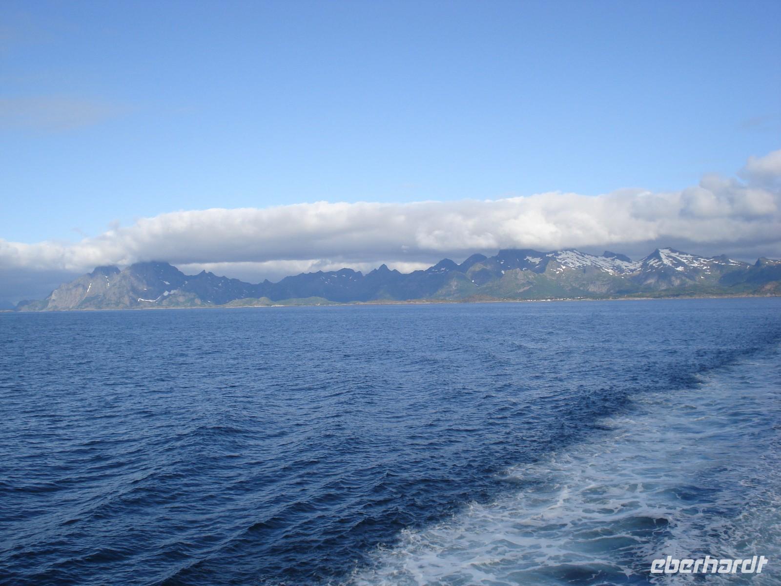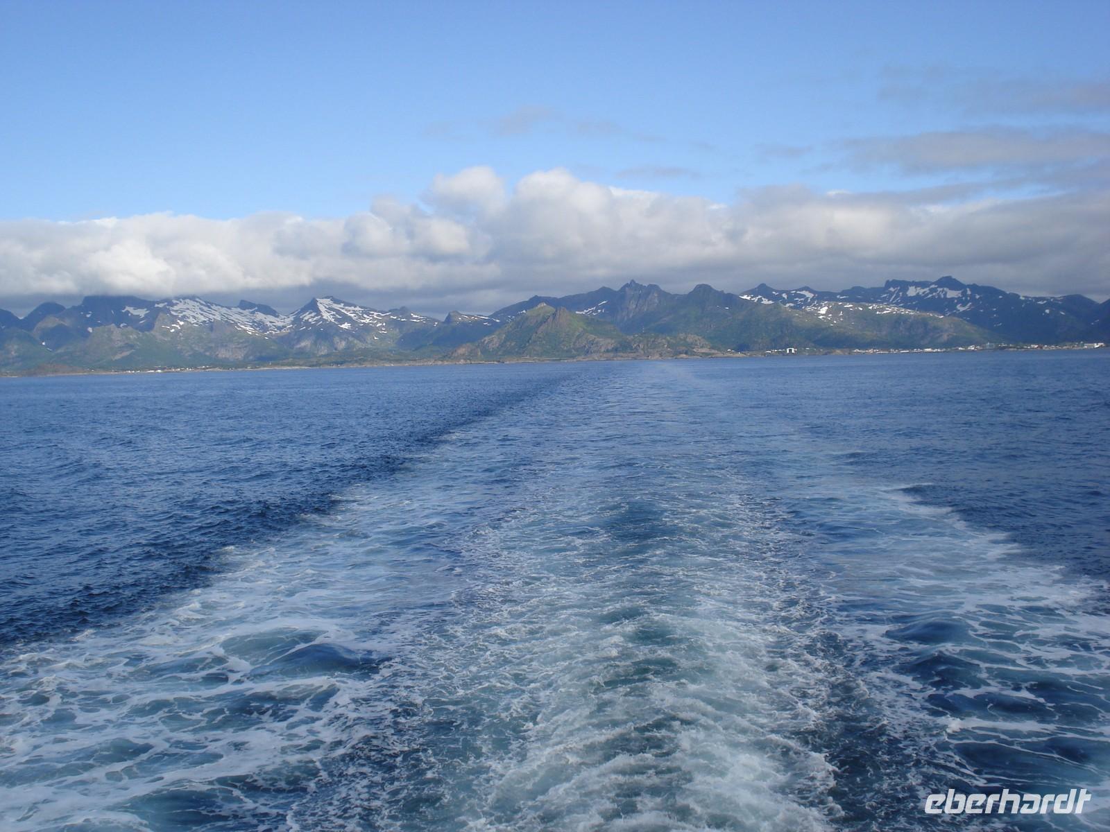 Am frühen Morgen verließen wir die Lofoten mit der Fähre von Svolvaer nach Skutvik. Die gut zwei Stunden über den Vestfjord konnten wir bei schönstem Wetter in vollen Zügen genießen. Es boten sich immer wieder beeindruckende Bilder Richtung Festland und der Lofoten- sowie Vesteralenwand. Das Schiff legte einen Halt auf der Insel Skova ein. Im Fährhafen Skutvik im Knut Hamsun Land erreichten wir wieder das Festland und fuhren weiter Richtung Süden. Südlich des Polarkreises erreichten wir Mo i Rana, wo wir im Hotel Meyergarden übernachteten.
