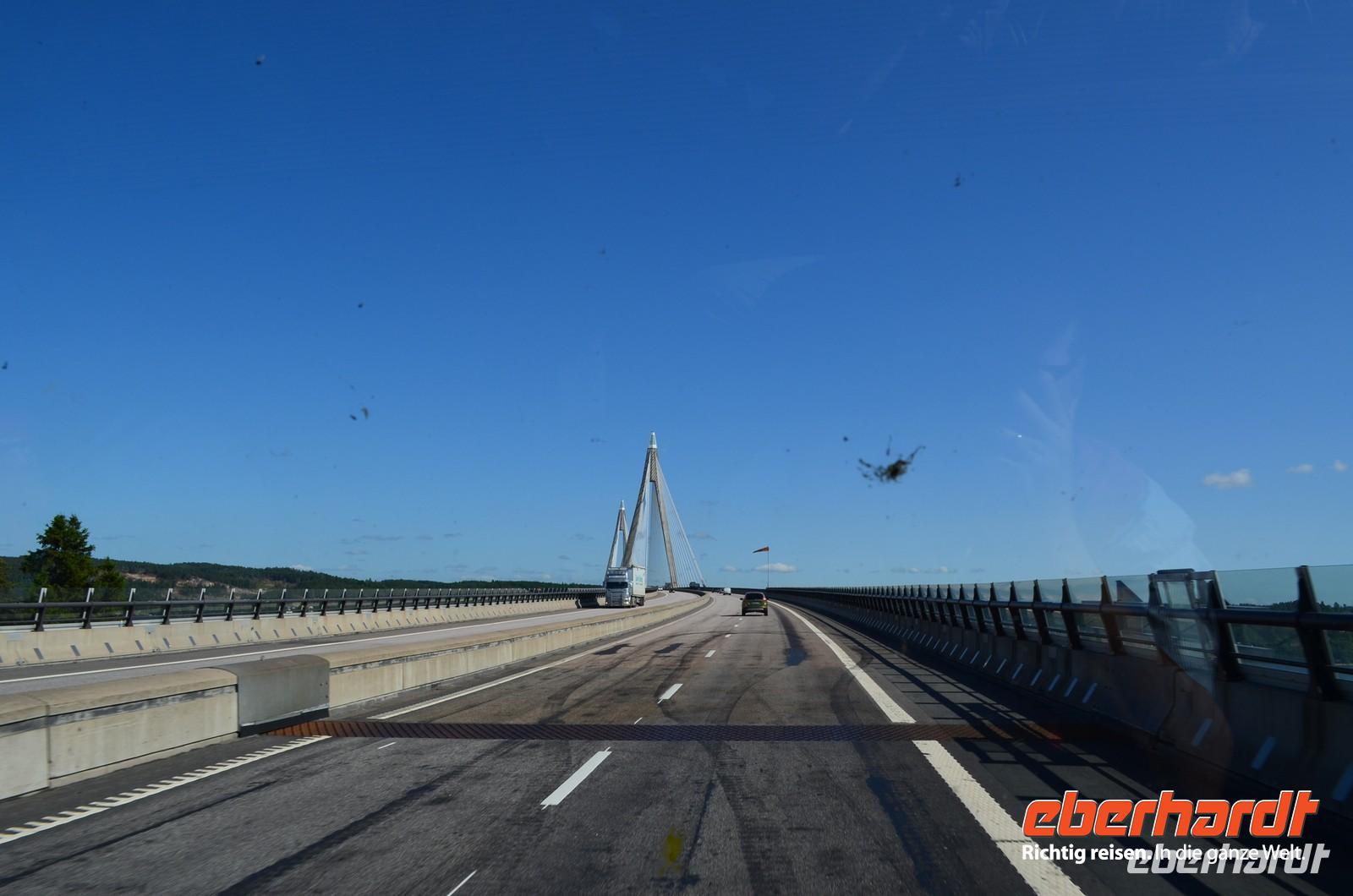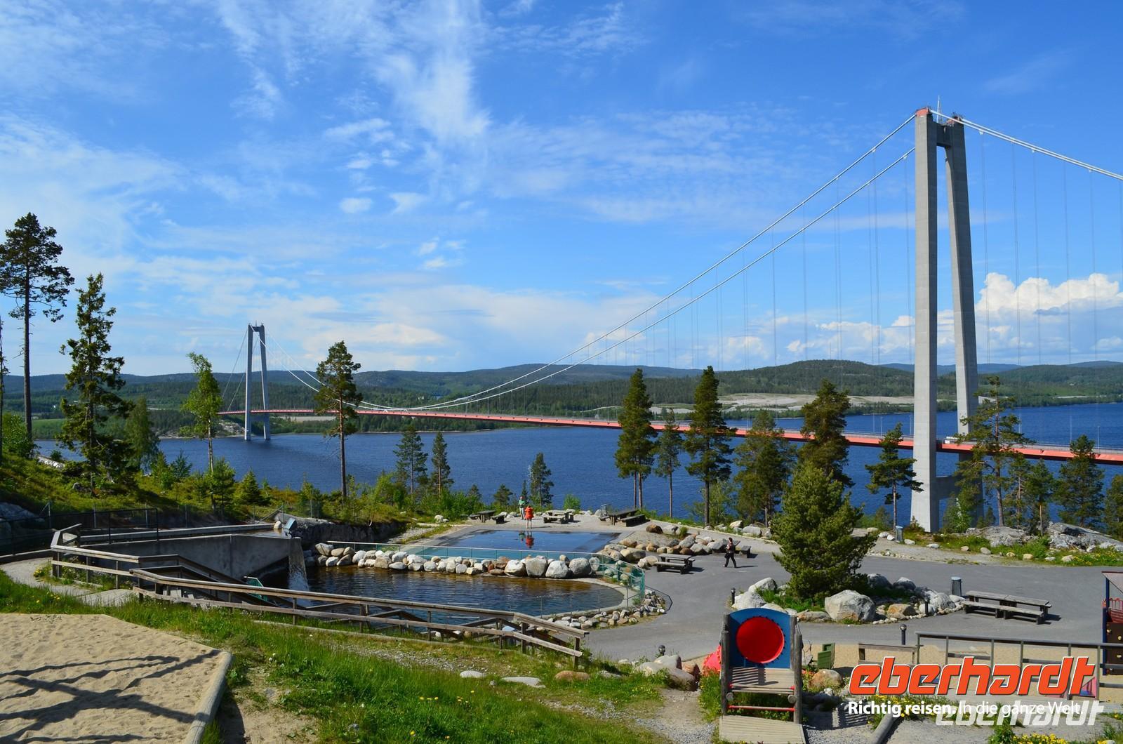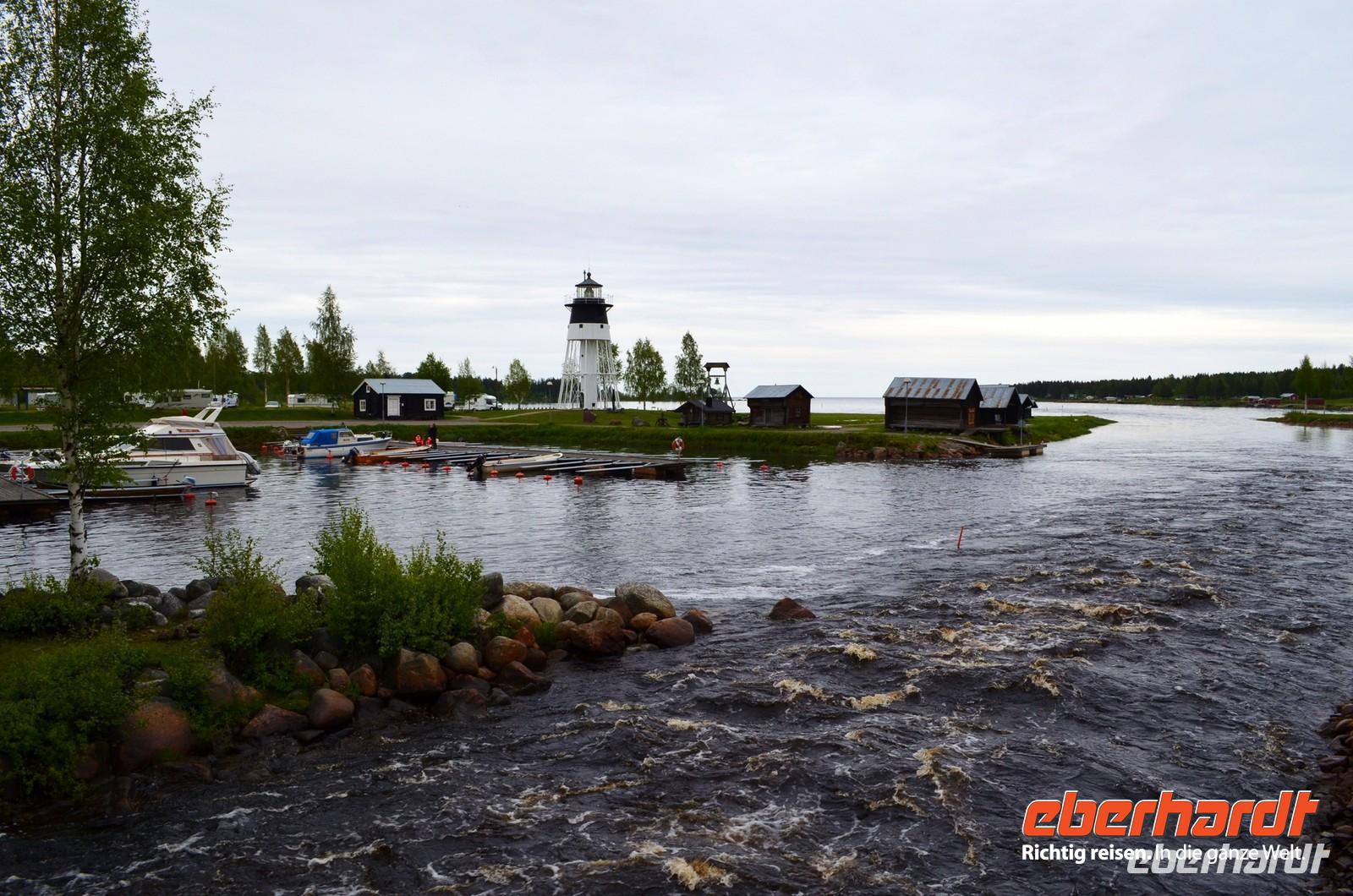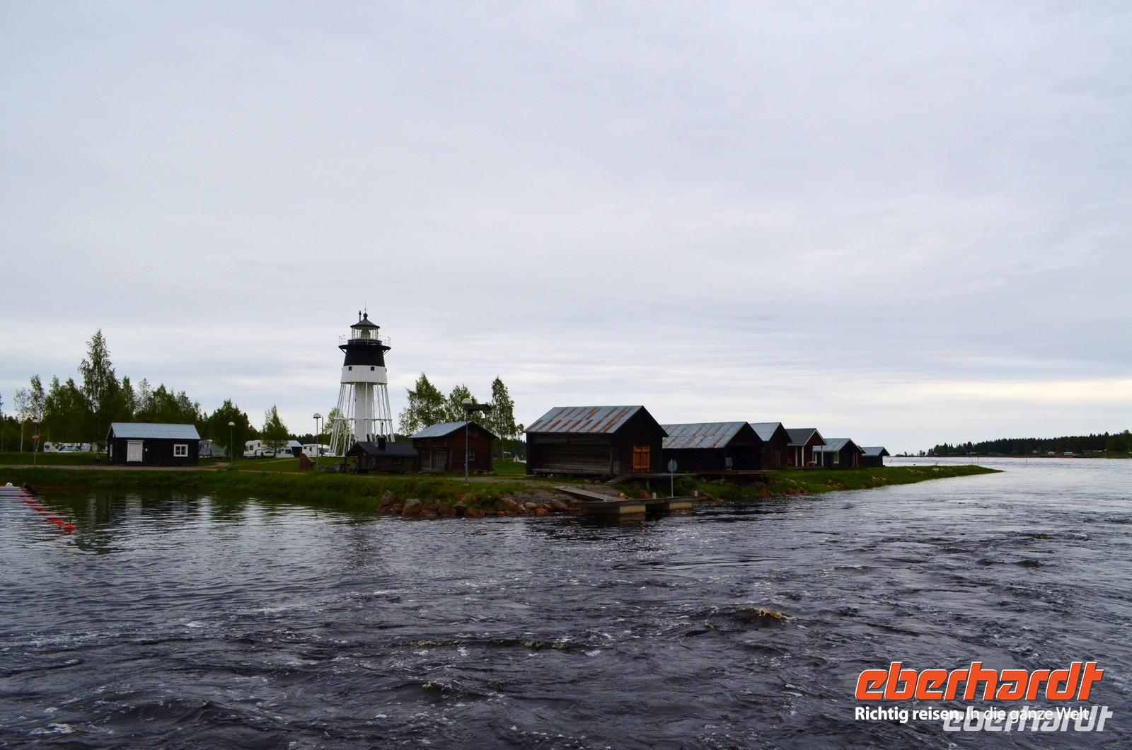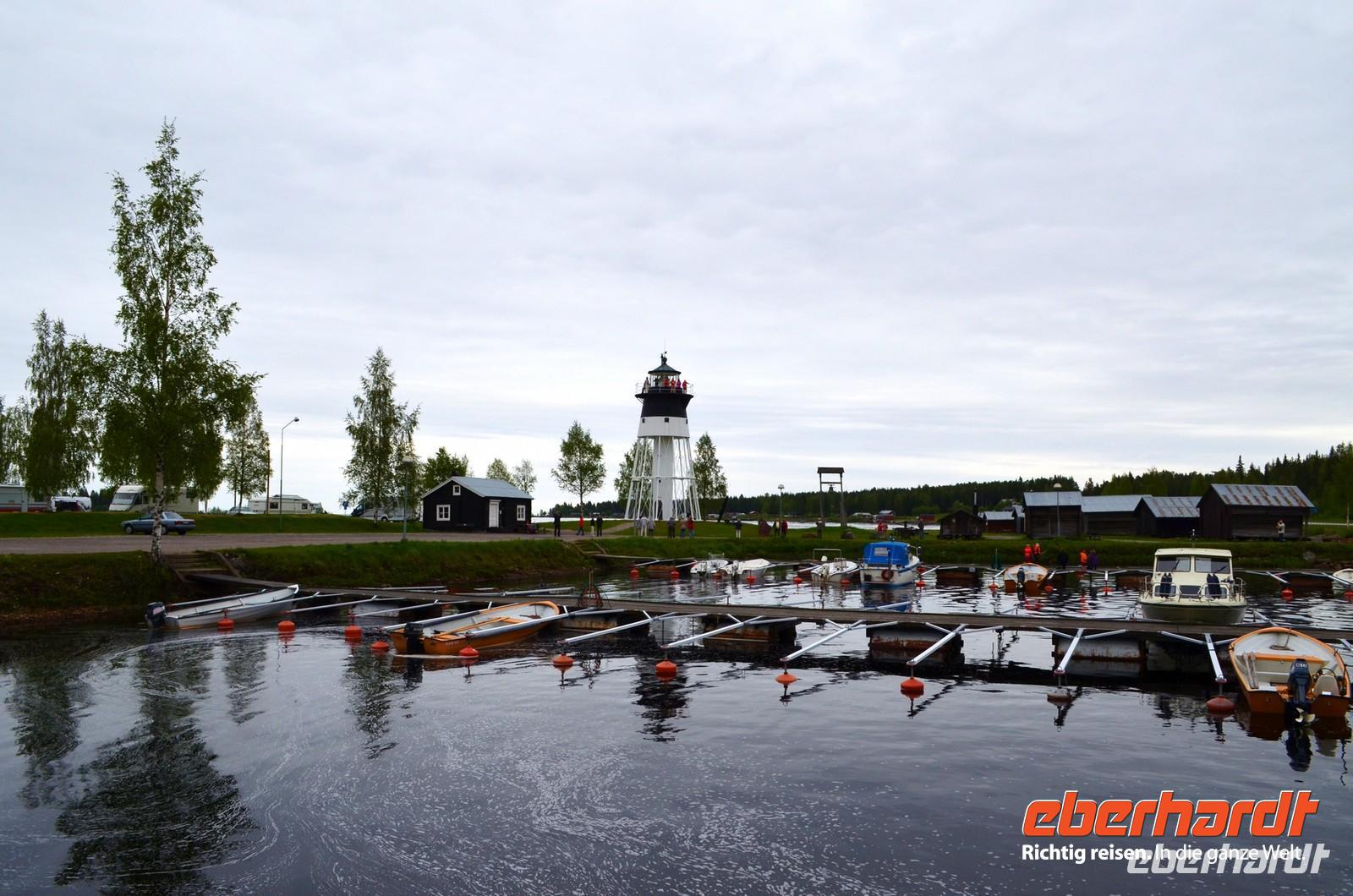 Wir besichtigten die Häuschen und die Landschaft der Insel Alnö bei einer Rundfahrt. Dann ging es weiter nordwärts, vorbei an den kleinen Dörfern mit ihren Kirchen und den extra stehenden Glockentürmen, der immer wechselnden Landschaft, die allmählich zur „Hohen Küste“ ansteigt, über deren große Brücke, hin zum Kirchendorf Lövanger und weiter zum Leuchturm bei Jävre. Bis schließlich Luleá, die Stadt mit dem großen schwedischen Erzhafen, erreicht ist und wir fast am Polarkreis.