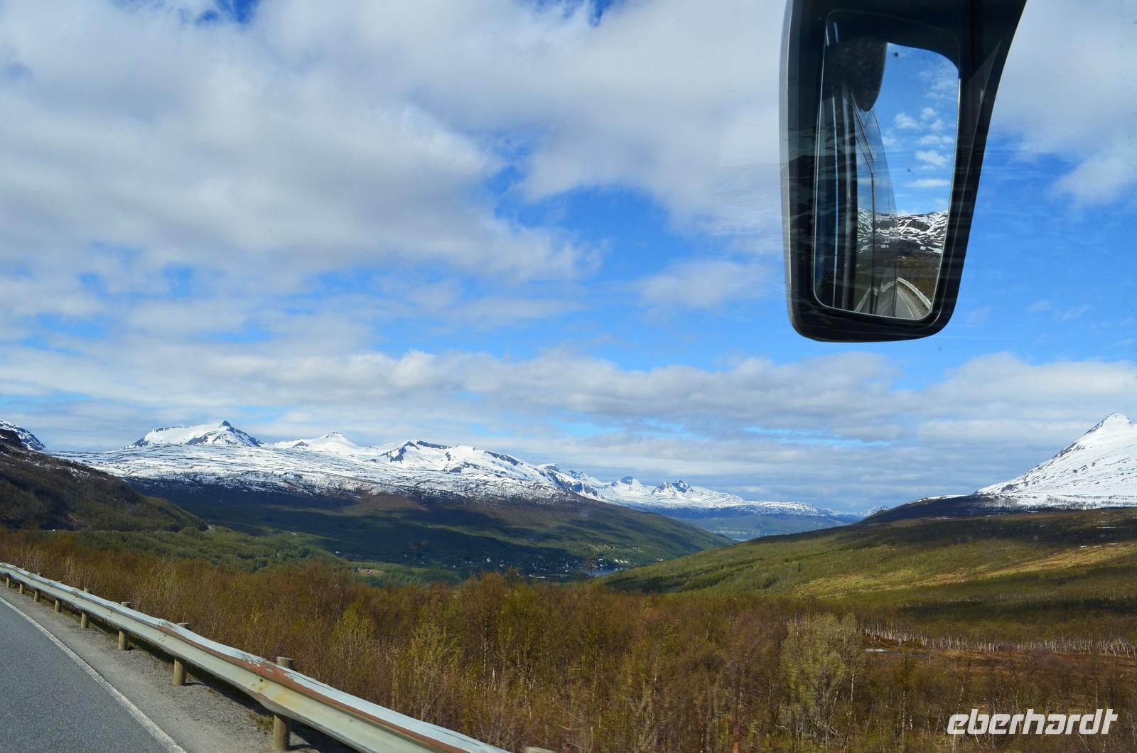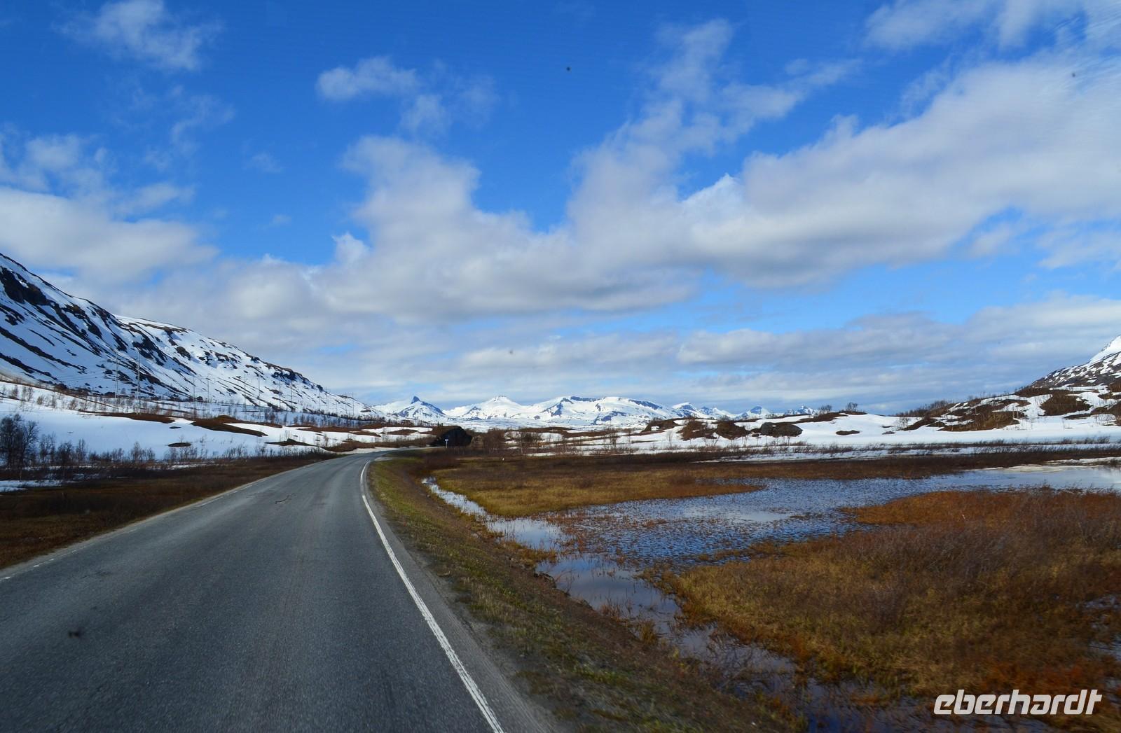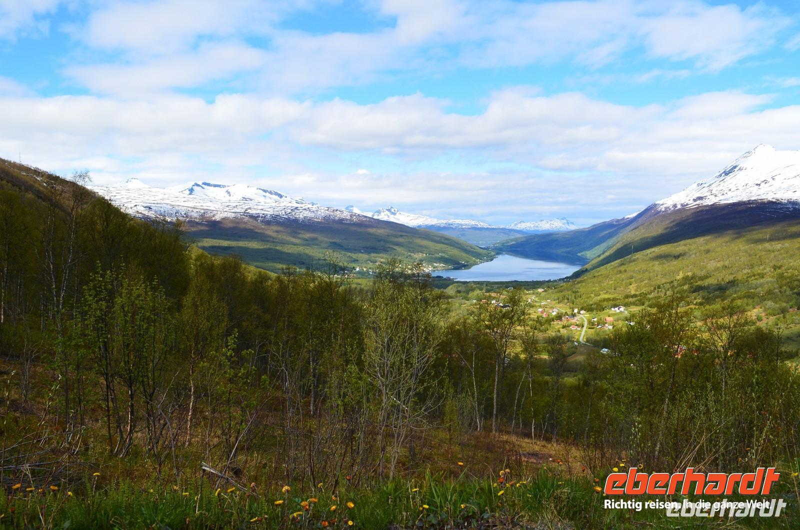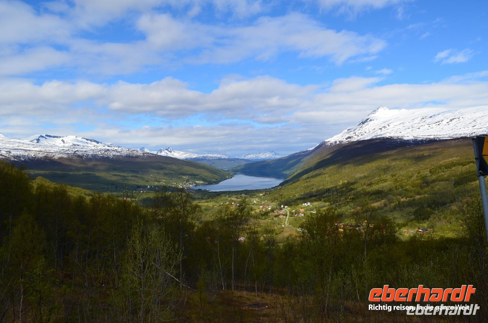 Traumhafte Panoramen um und über dem Ofotfjord, die Täler in den leuchtenden Farben des Frühlings, auf den Pässen die Seen noch eisüberzogen.