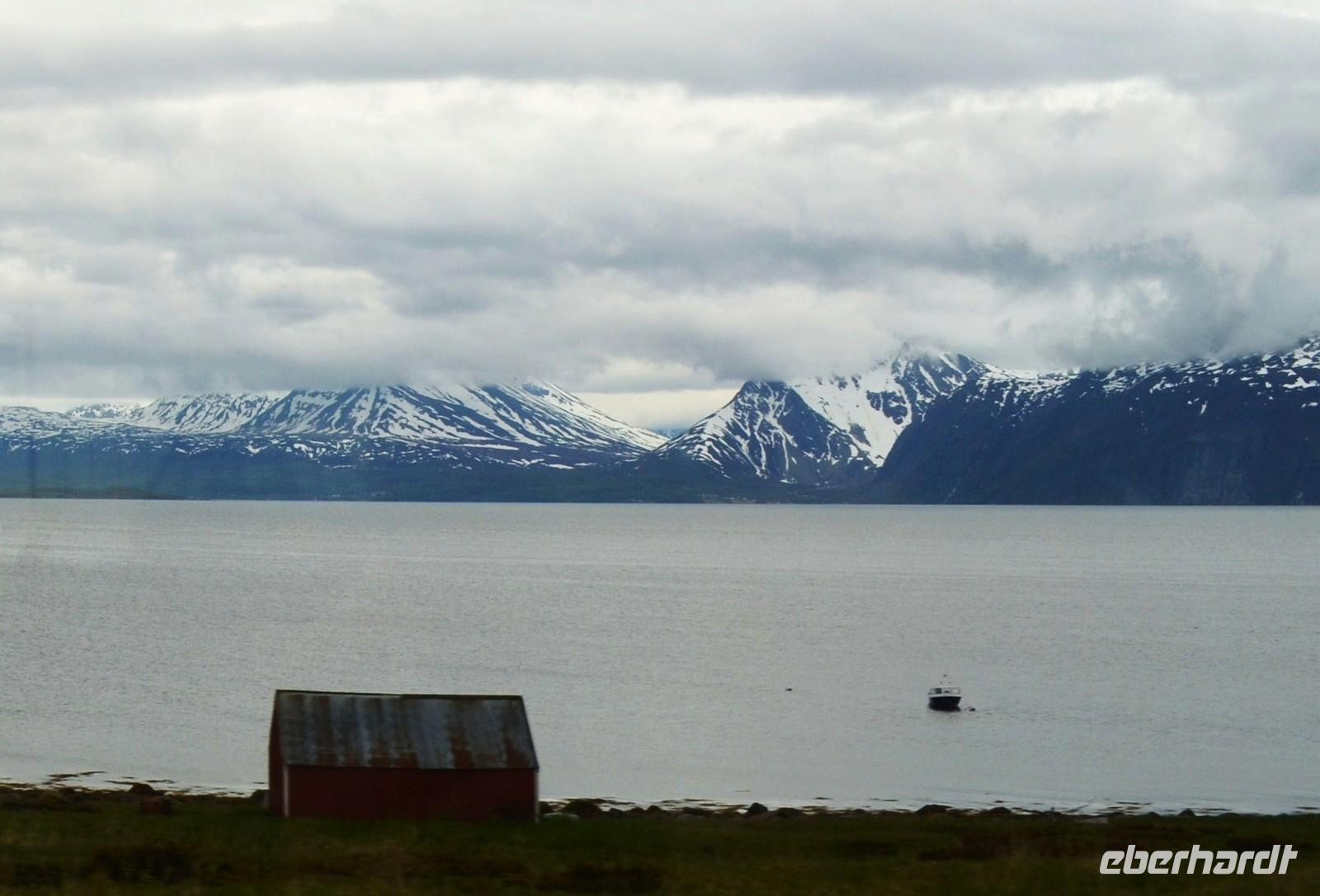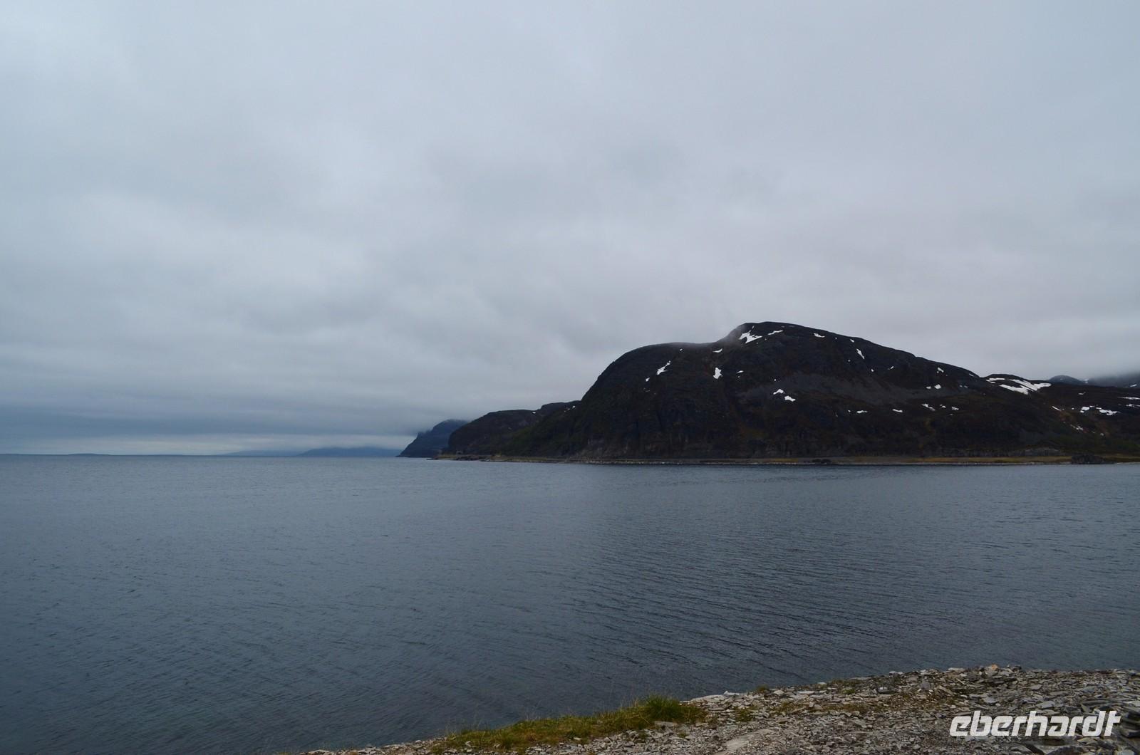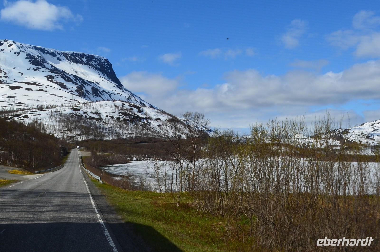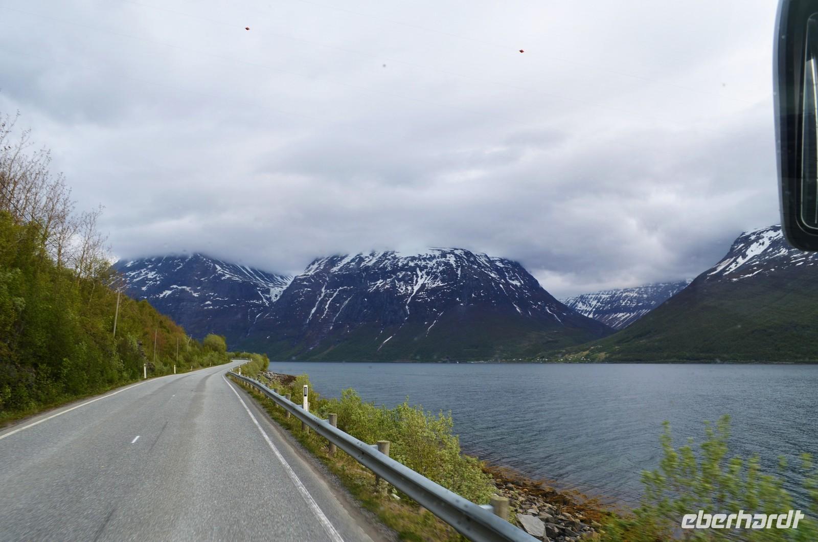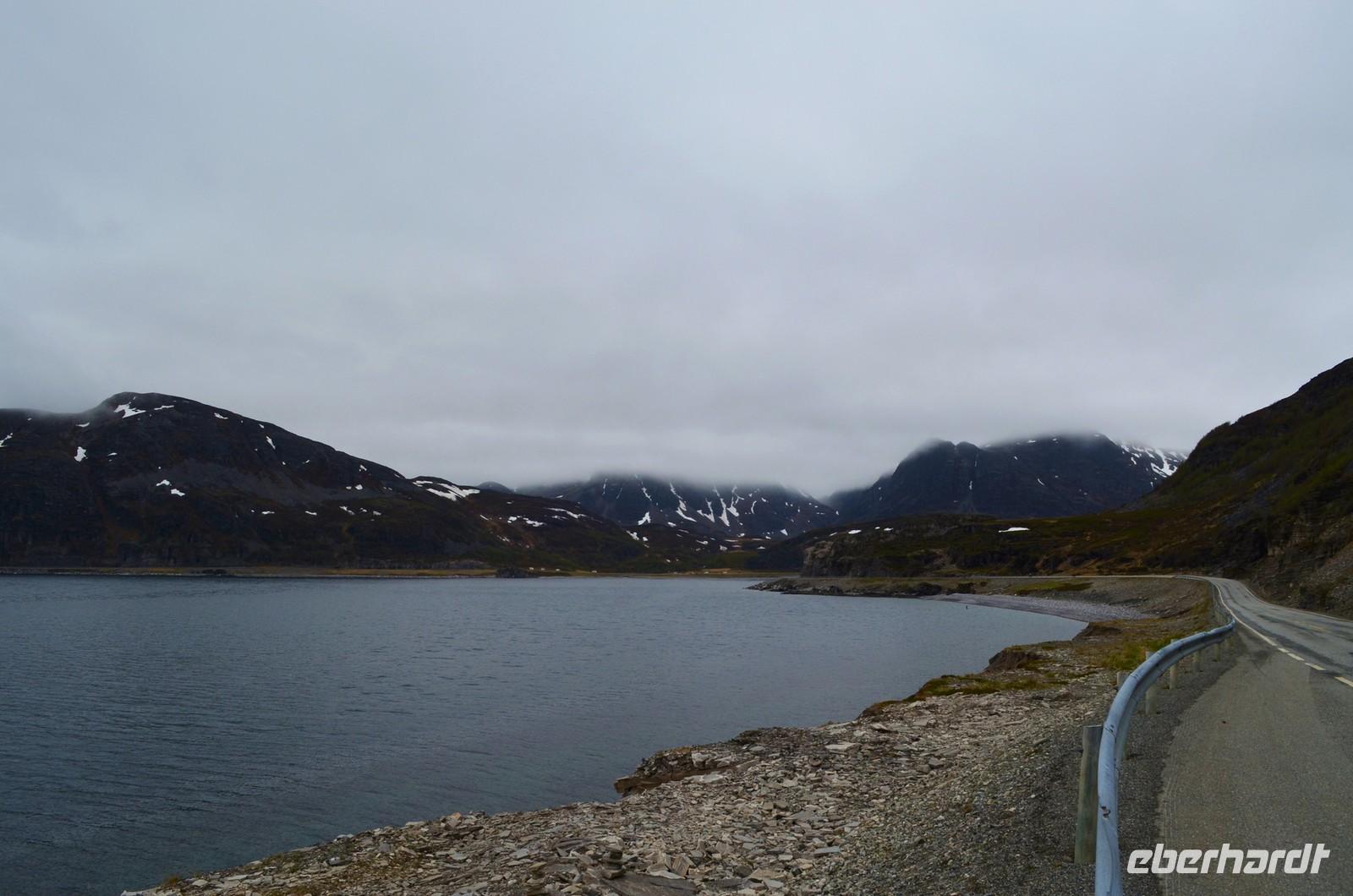 Ganz im Norden angekommen, erreichen wir die ersten hohen Berge - schneebedeckt - und die ersten Fjorde mit dem Porsanger- und dem Olderfjord.