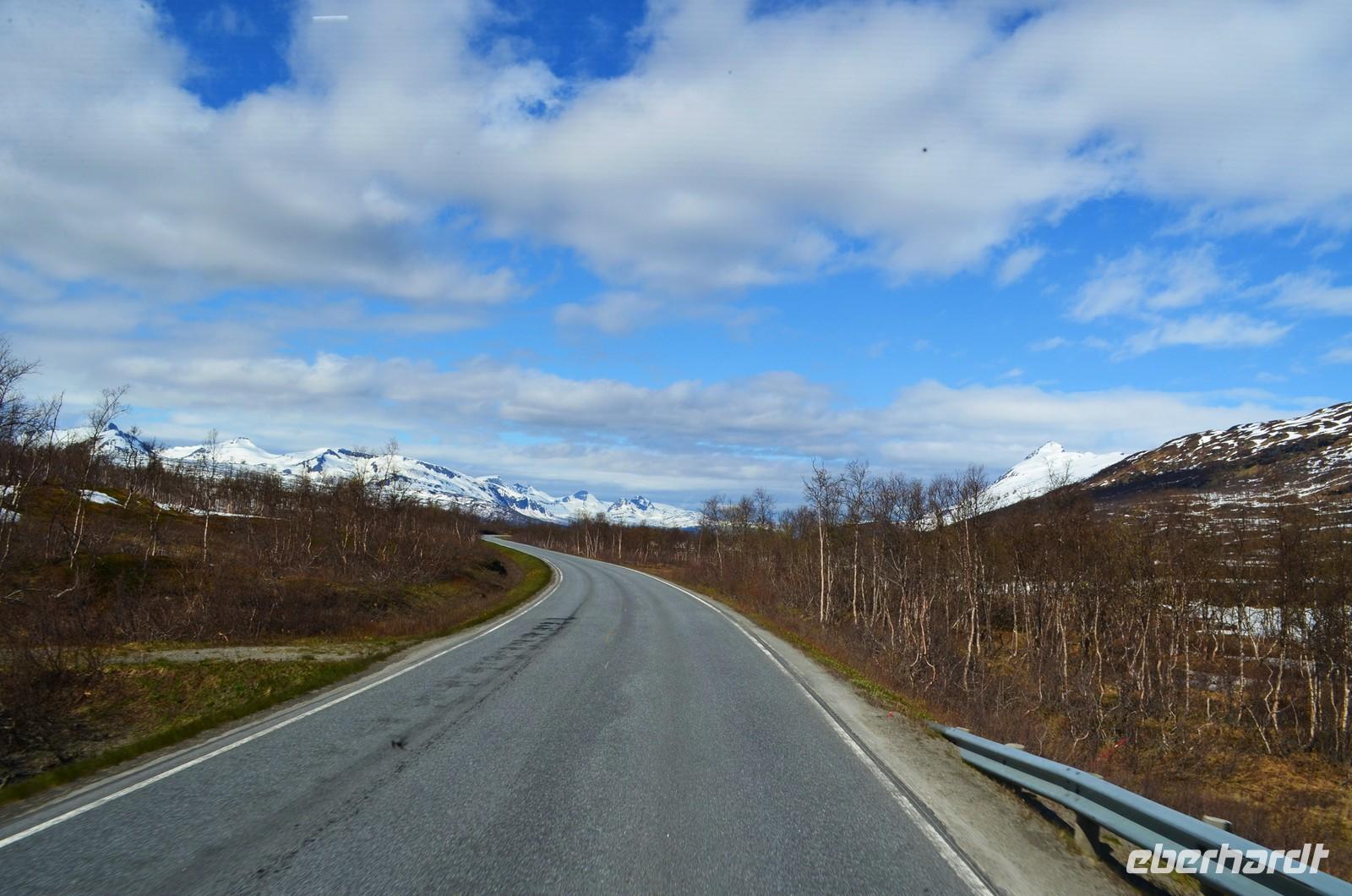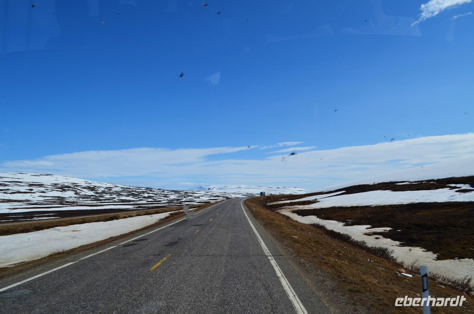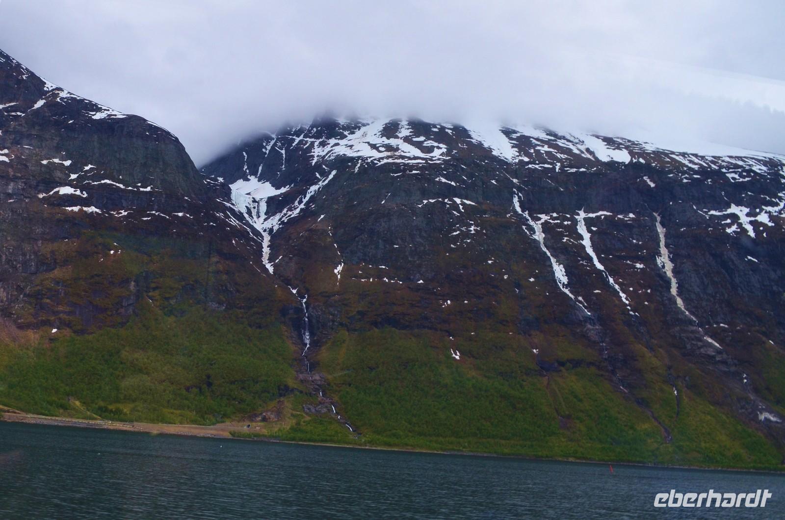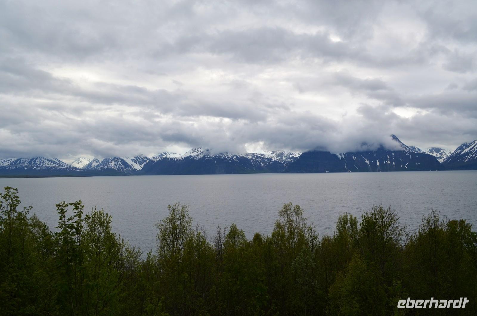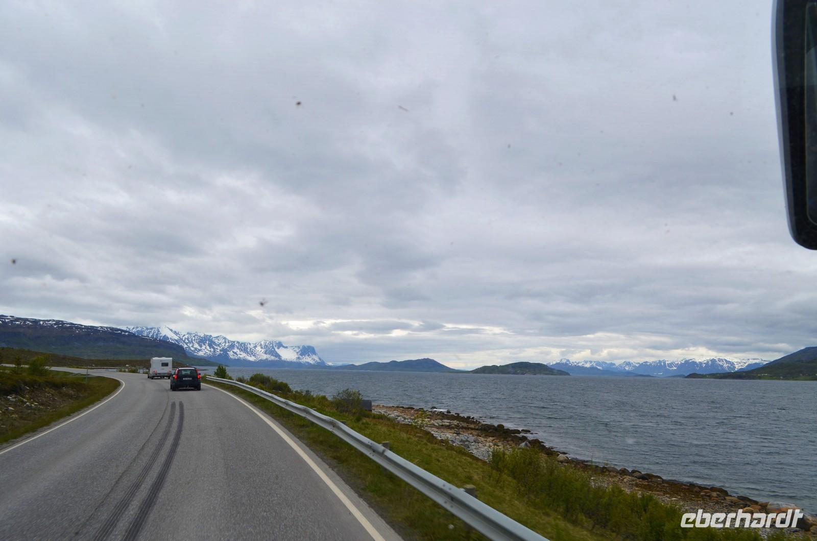 Ganz im Norden angekommen, erreichen wir die ersten hohen Berge - schneebedeckt - und die ersten Fjorde mit dem Porsanger- und dem Olderfjord.