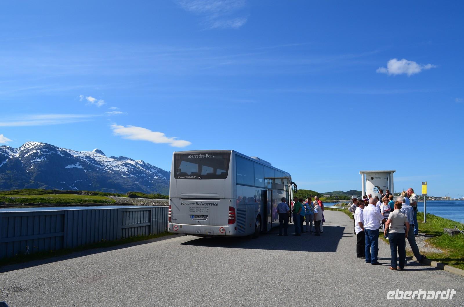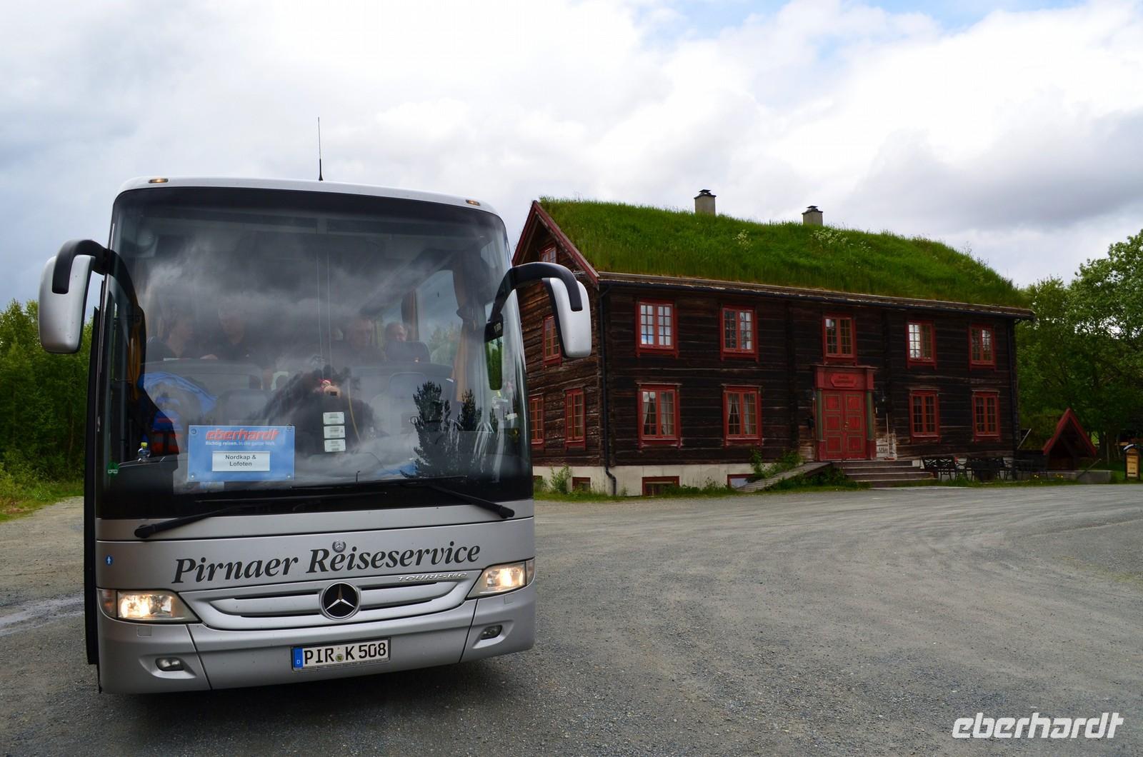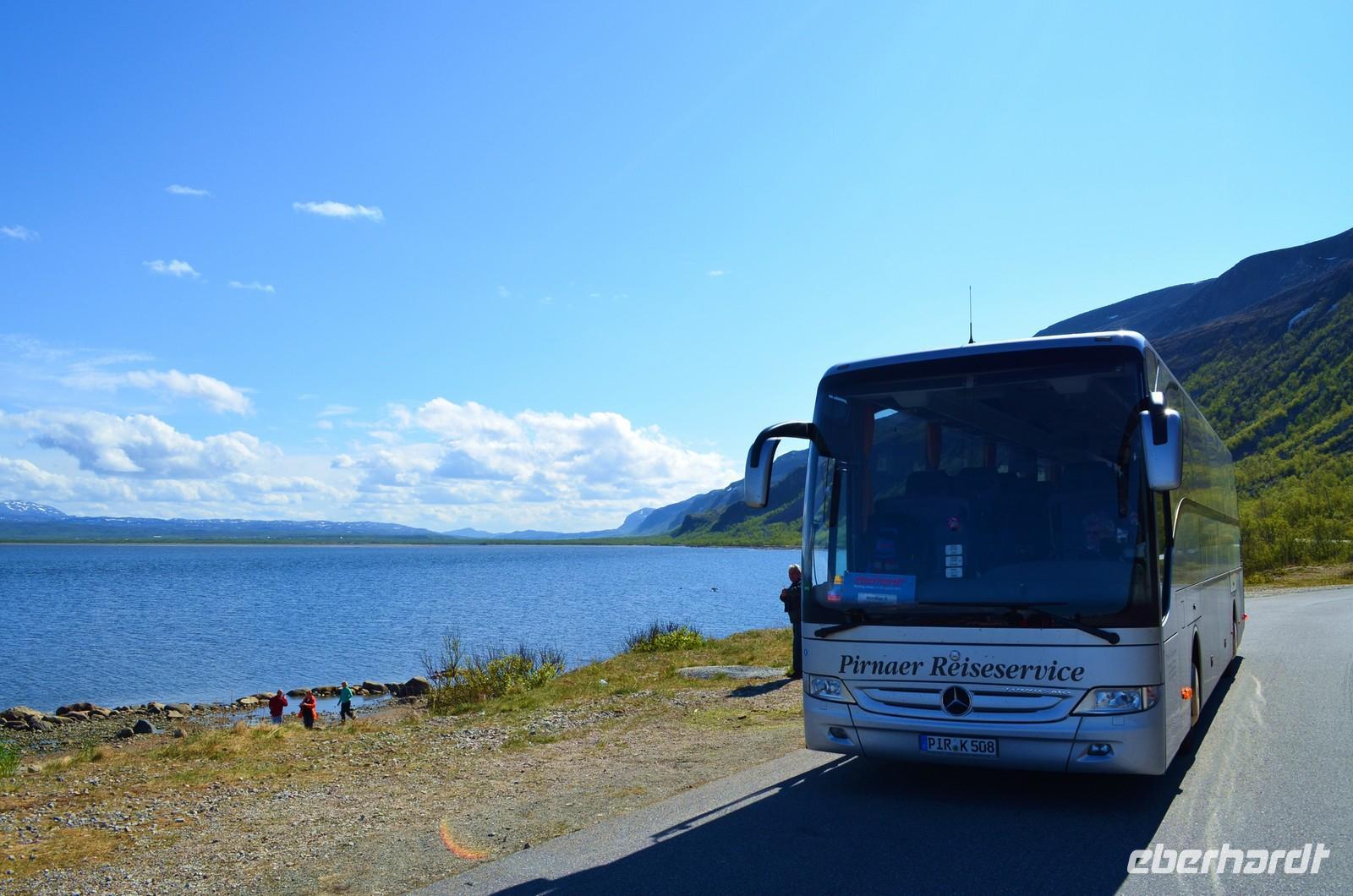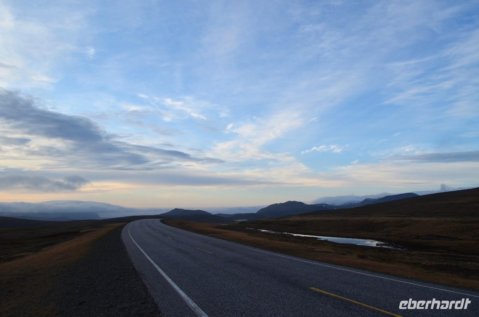 Es ist 21 Uhr und 30 Minuten als wir mit unserem Bus in Honningsvag starten und hinauf auf die Hochfläche des Nordkap`s fahren. Die Mitternachtssonne scheint, doch als wir am ersten Aussichtspunkt übe