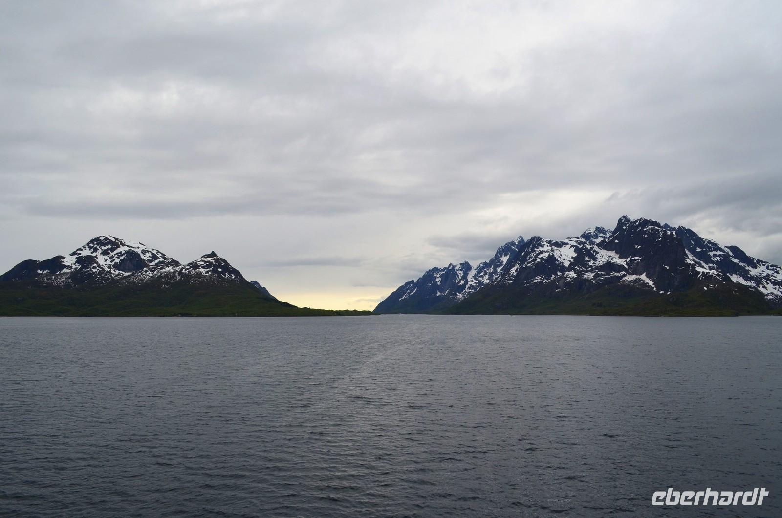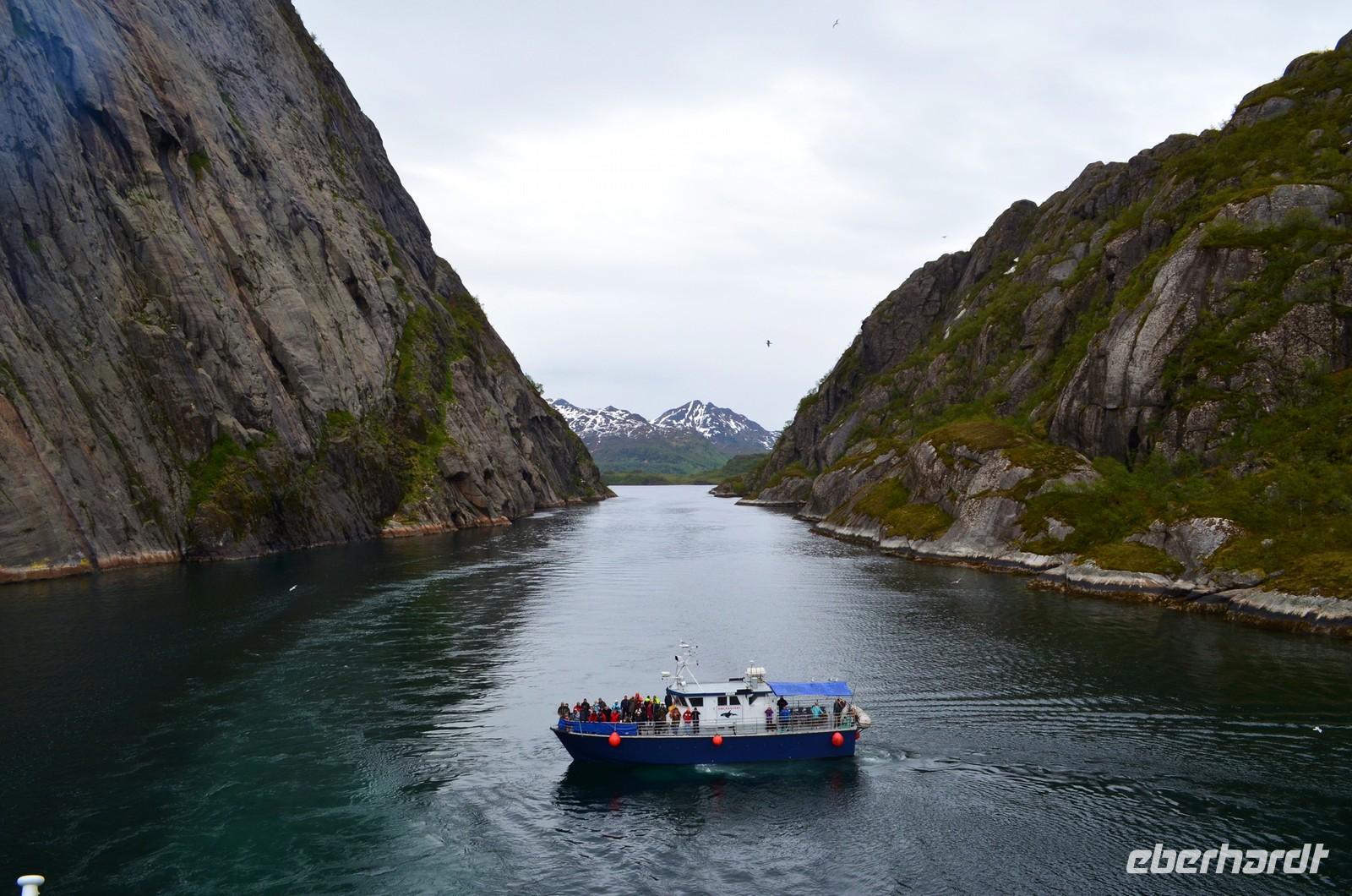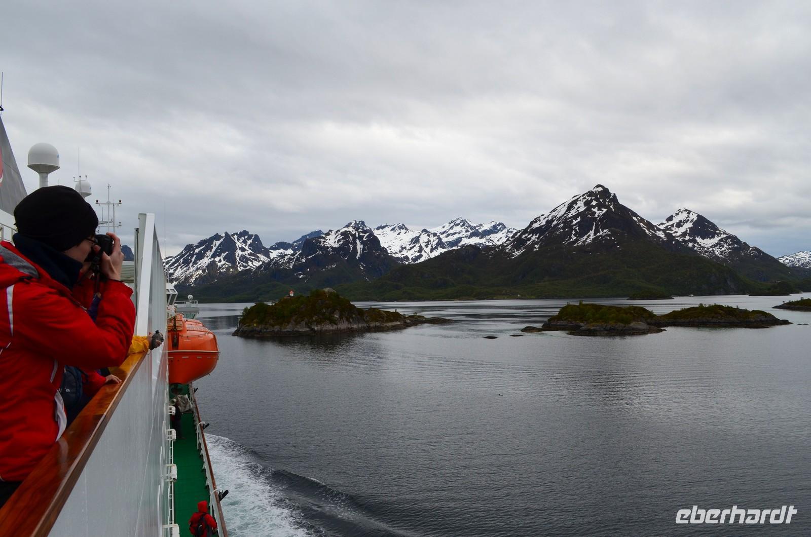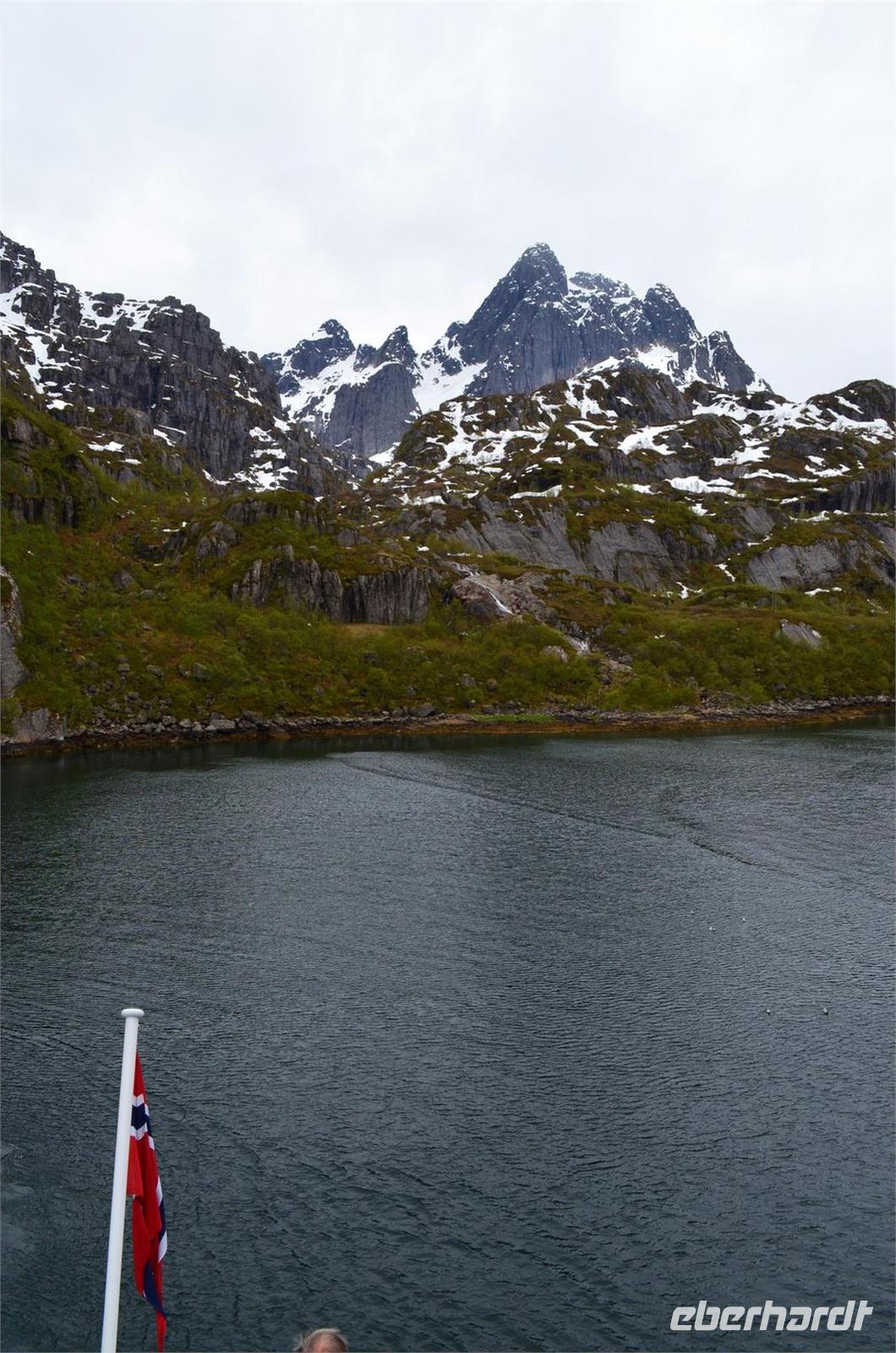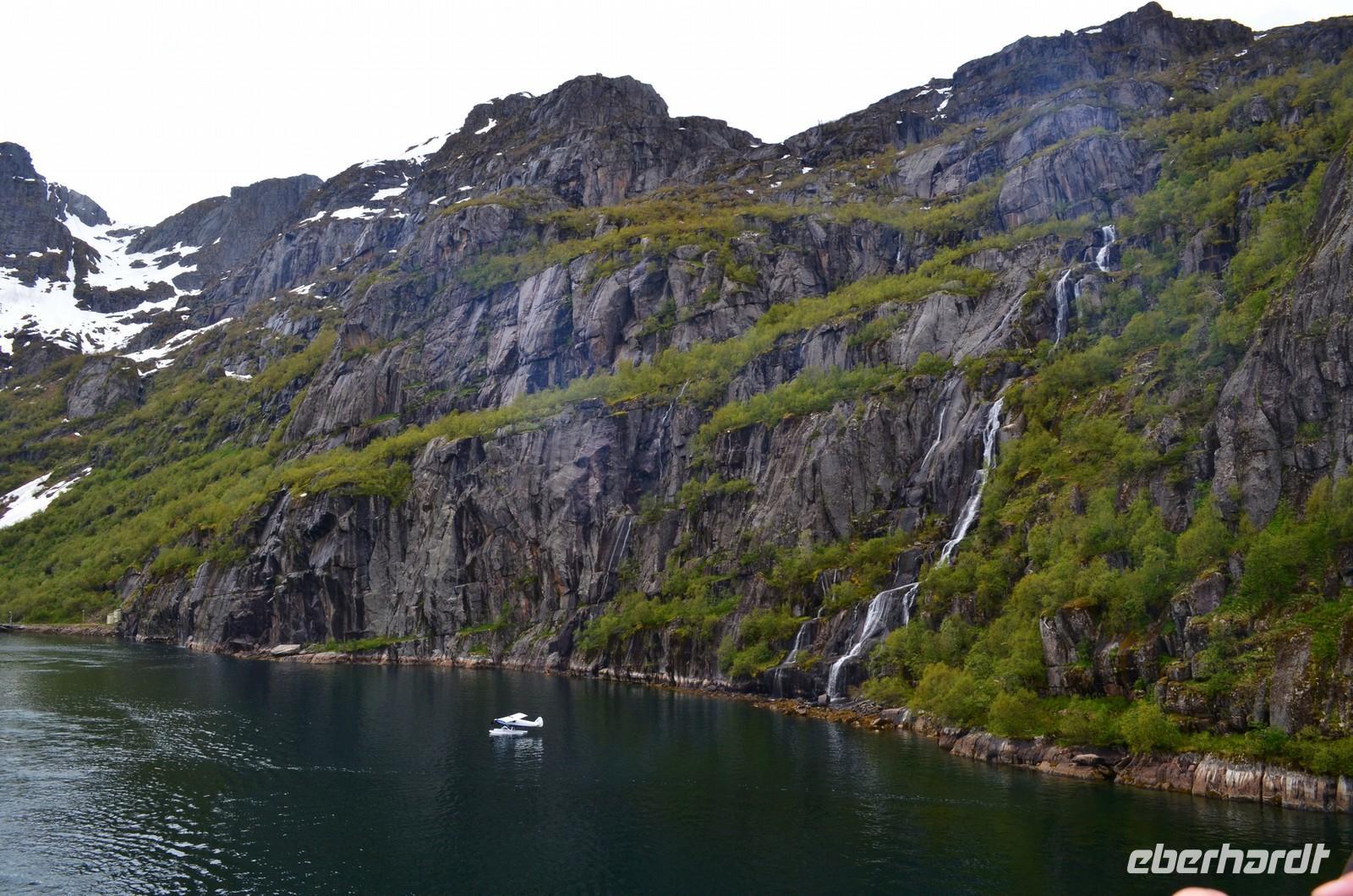 Dann die Vesteralen mit Stockmarknes - das gleiche Bild: Grüne, erblühende Landschaft darüber schneebedeckte Gipfelriesen mit immer bizarreren Formen. Anschließend die Fahrt mit der MS „Richard With“, einem der modernen Schiffe der Hurtigroutenflotte, das uns nach Svolvár auf die Lofoten bringt. Die Fahrt durch den Raftsündet, mit dem Abstecher in den engen Tollfjord und durch die Inseln der Lofoten ist ein besonderes Erlebnis, auch wenn gleichzeitig Wasserflugzeuge den Fjord besuchen.