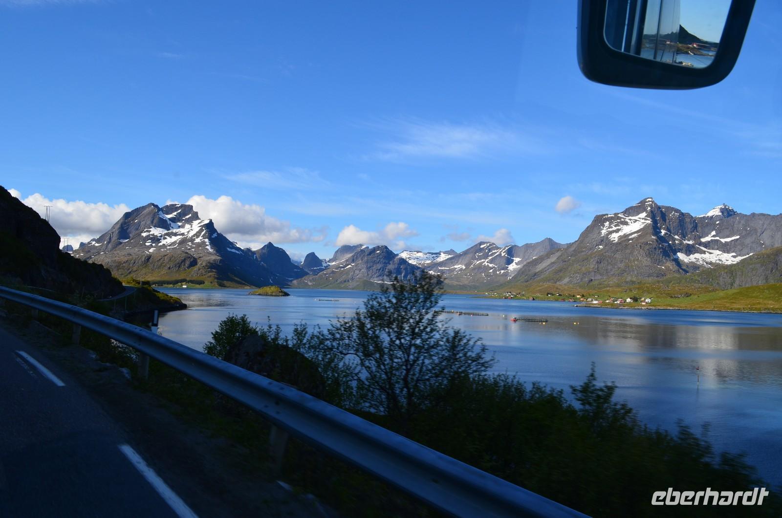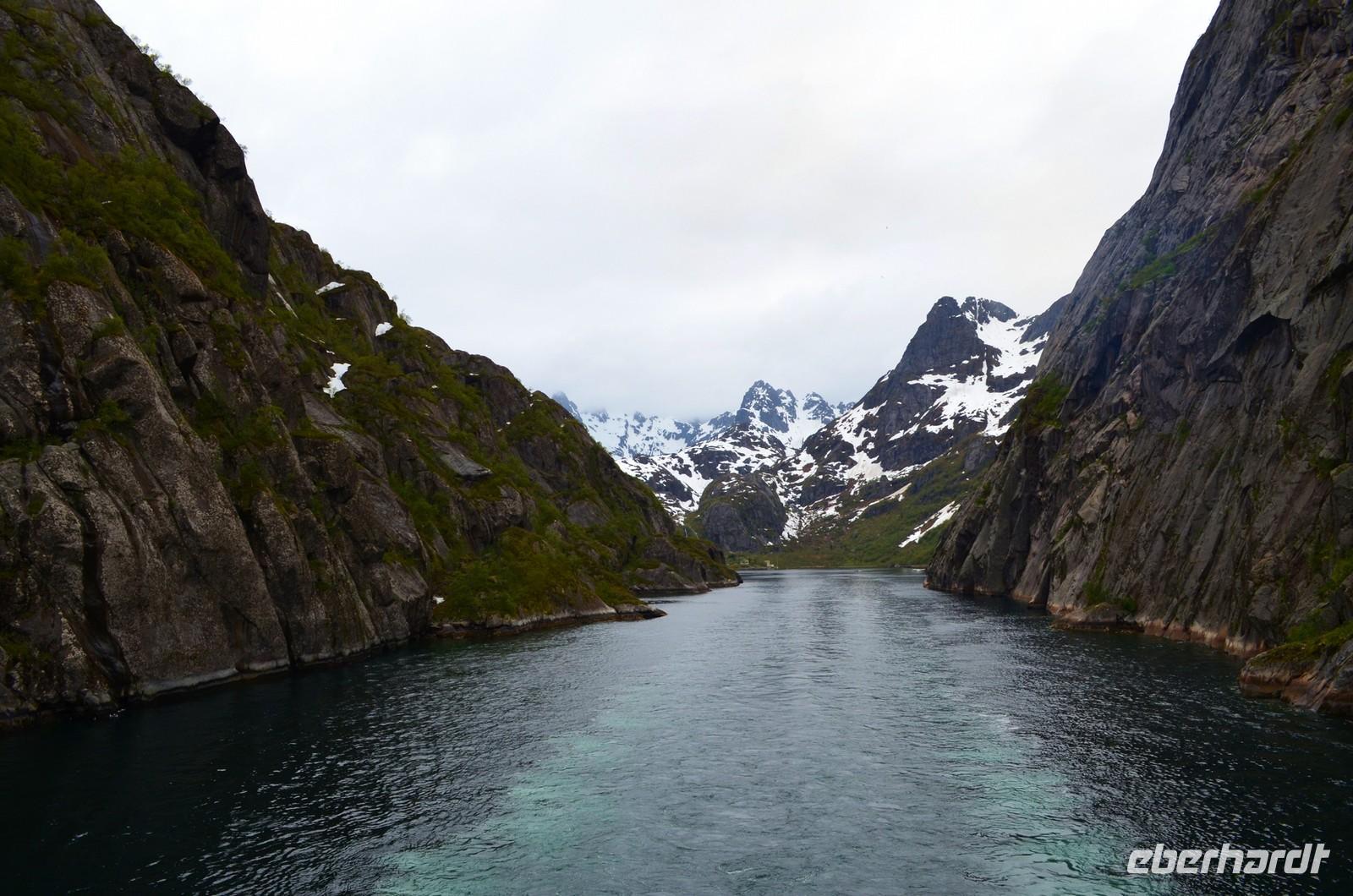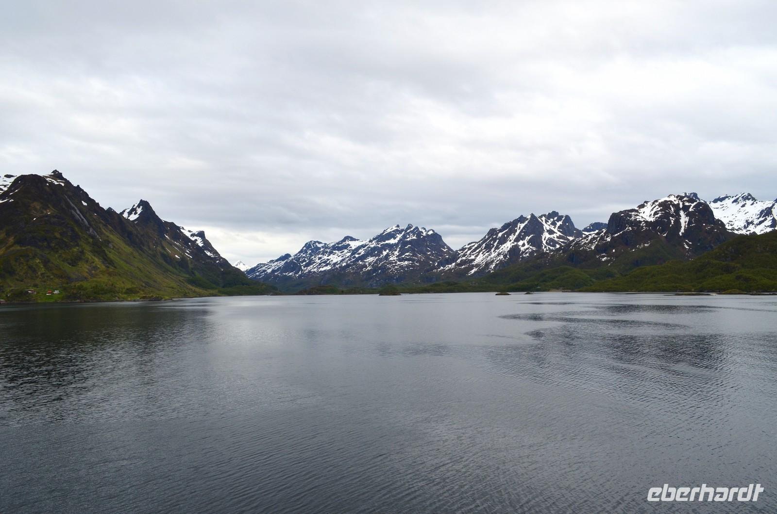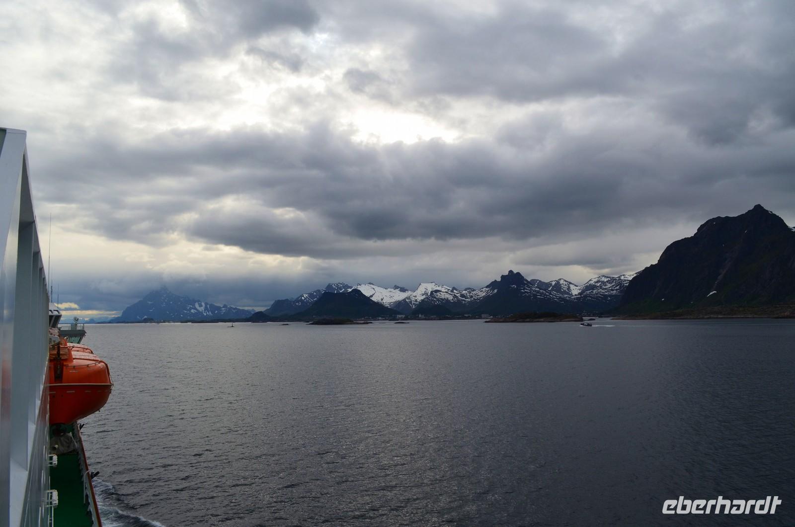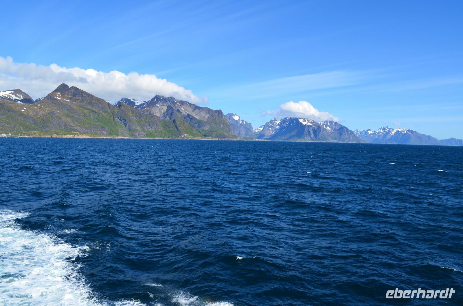 Dann die Vesteralen mit Stockmarknes - das gleiche Bild: Grüne, erblühende Landschaft darüber schneebedeckte Gipfelriesen mit immer bizarreren Formen. Anschließend die Fahrt mit der MS „Richard With“, einem der modernen Schiffe der Hurtigroutenflotte, das uns nach Svolvár auf die Lofoten bringt. Die Fahrt durch den Raftsündet, mit dem Abstecher in den engen Tollfjord und durch die Inseln der Lofoten ist ein besonderes Erlebnis, auch wenn gleichzeitig Wasserflugzeuge den Fjord besuchen.