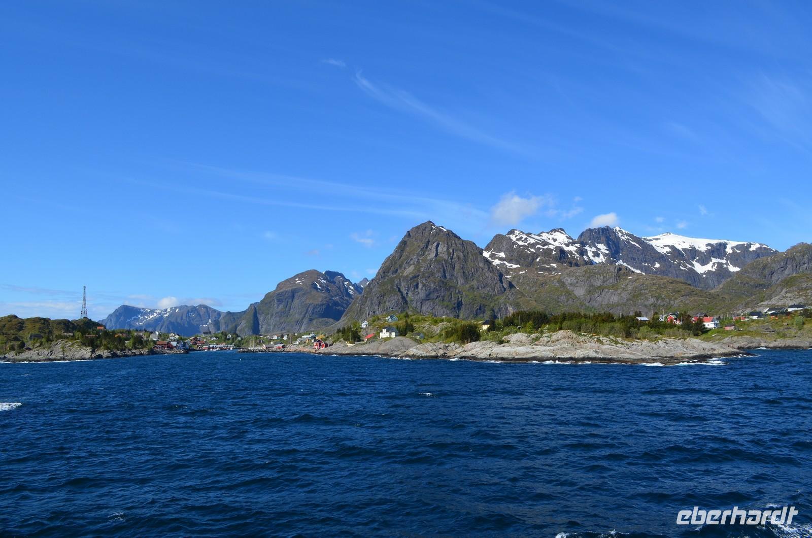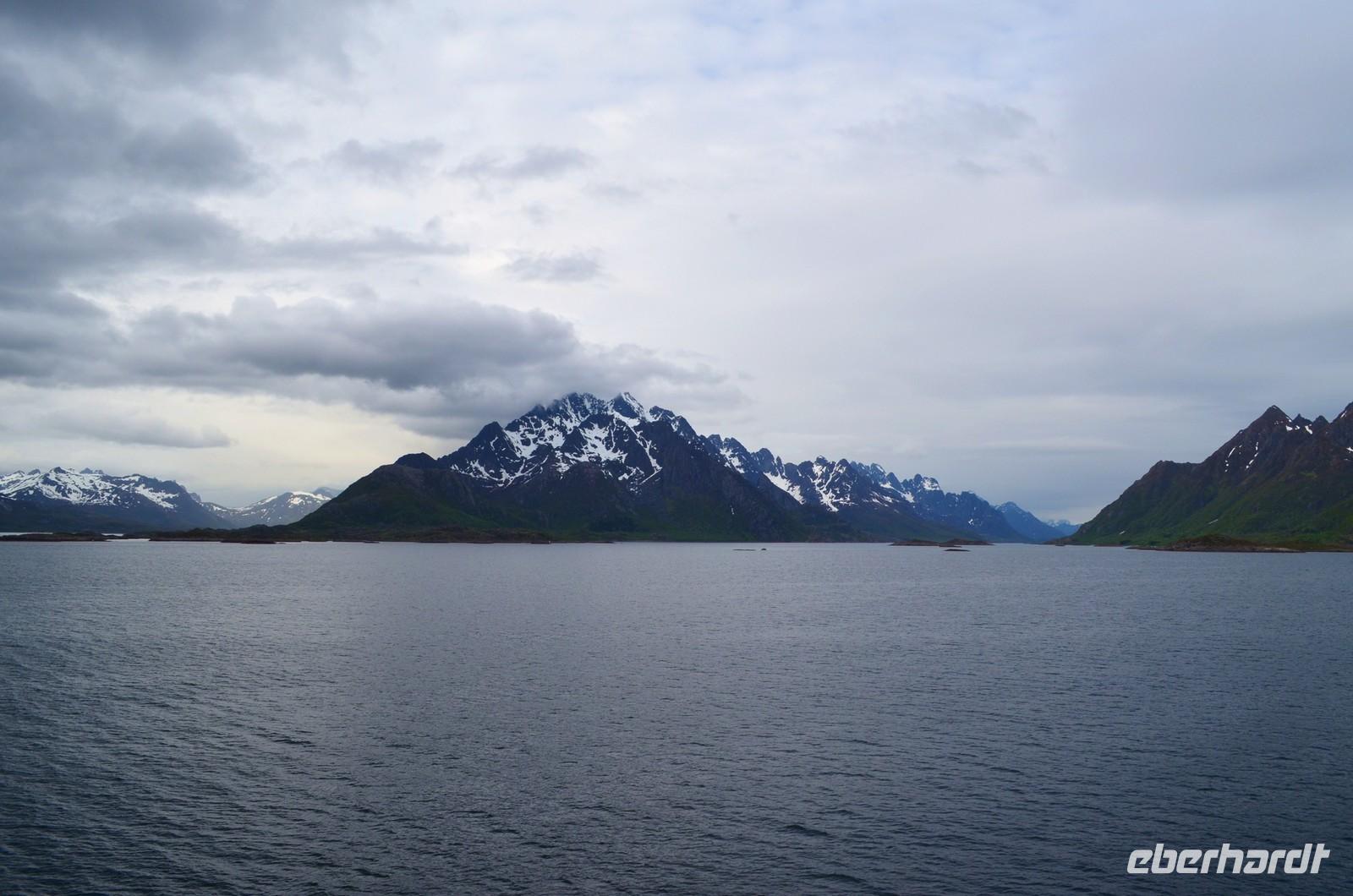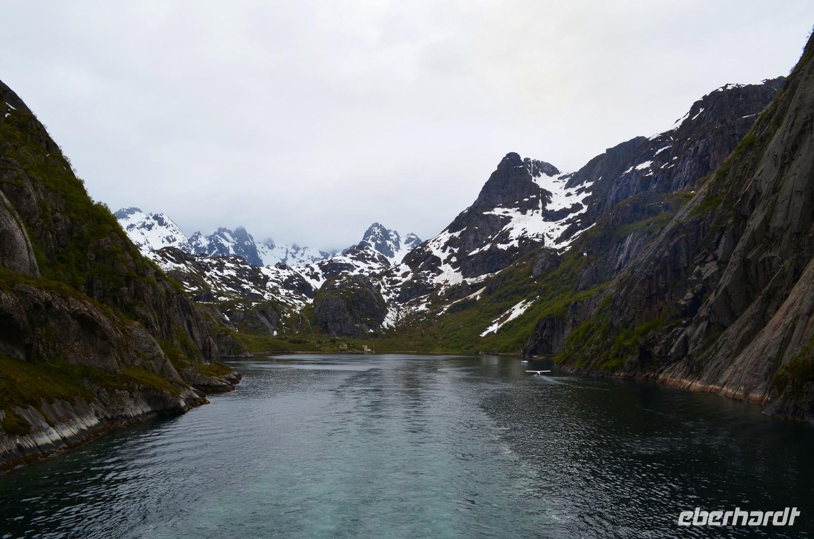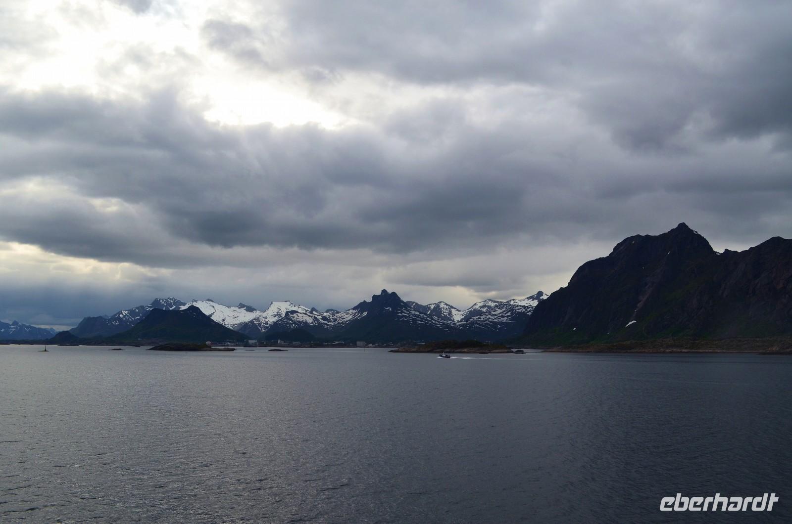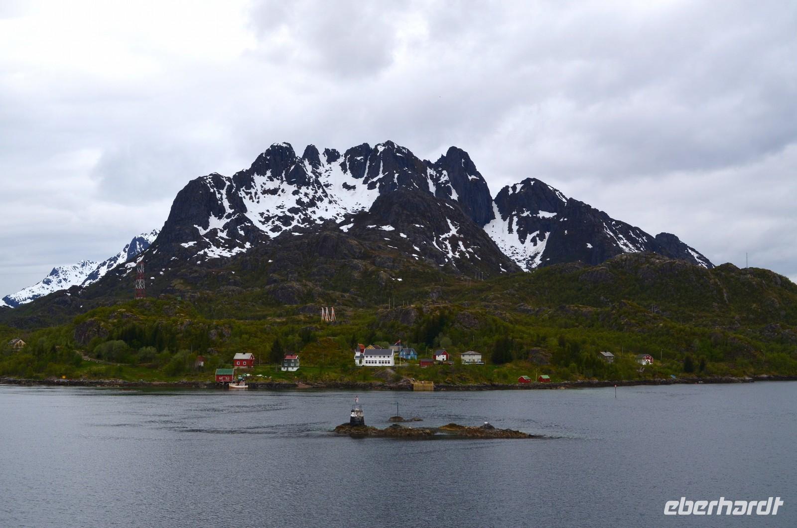 Dann die Vesteralen mit Stockmarknes - das gleiche Bild: Grüne, erblühende Landschaft darüber schneebedeckte Gipfelriesen mit immer bizarreren Formen. Anschließend die Fahrt mit der MS „Richard With“, einem der modernen Schiffe der Hurtigroutenflotte, das uns nach Svolvár auf die Lofoten bringt. Die Fahrt durch den Raftsündet, mit dem Abstecher in den engen Tollfjord und durch die Inseln der Lofoten ist ein besonderes Erlebnis, auch wenn gleichzeitig Wasserflugzeuge den Fjord besuchen.