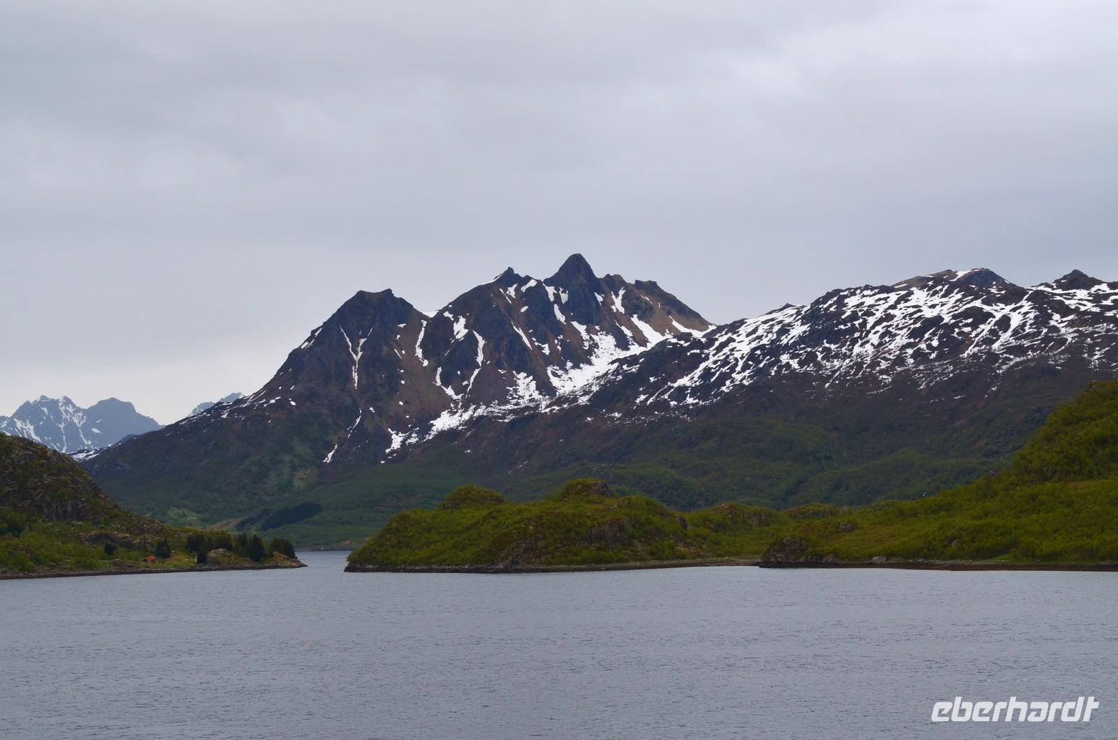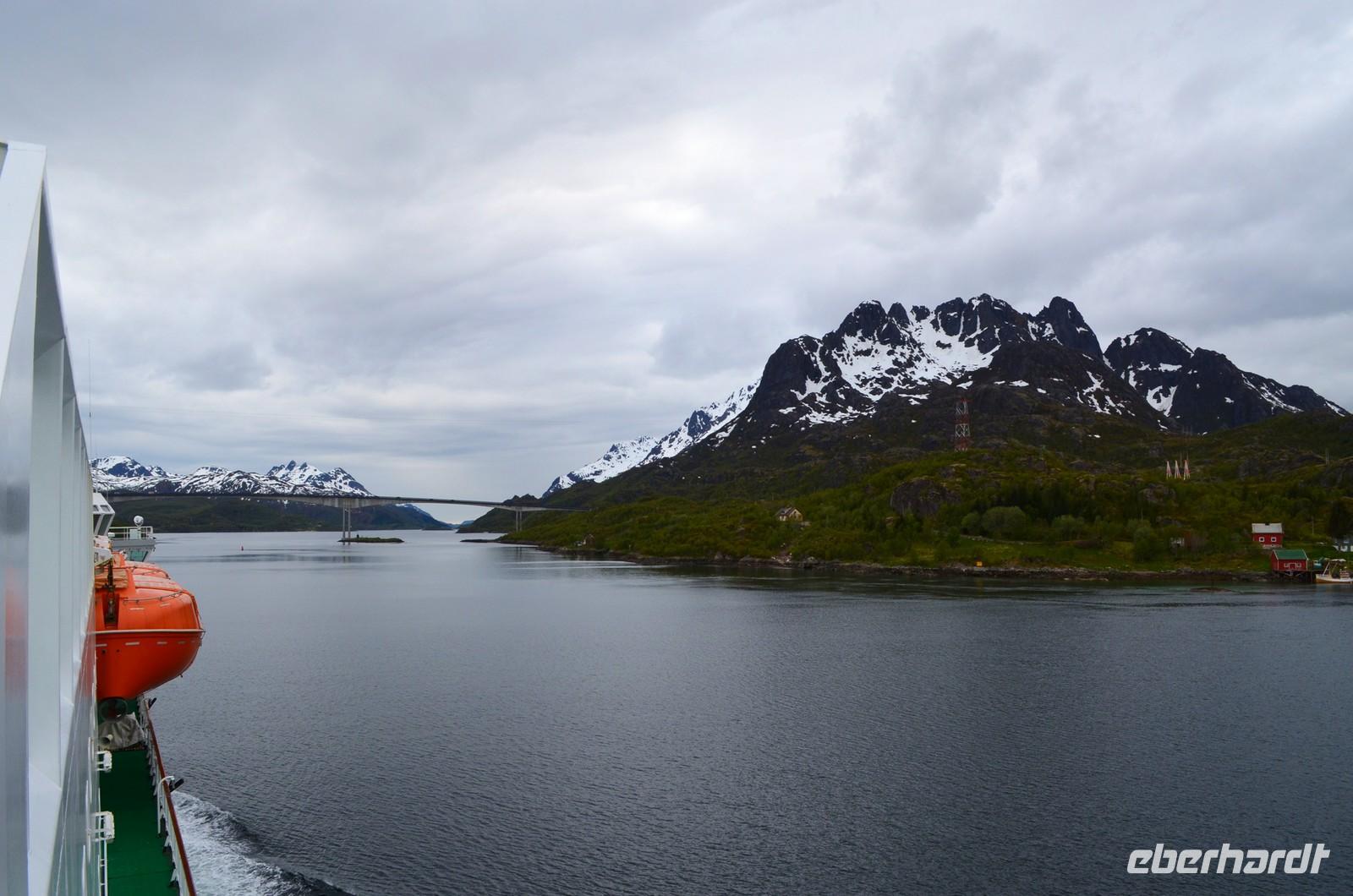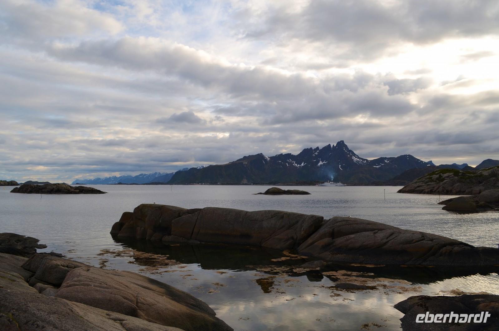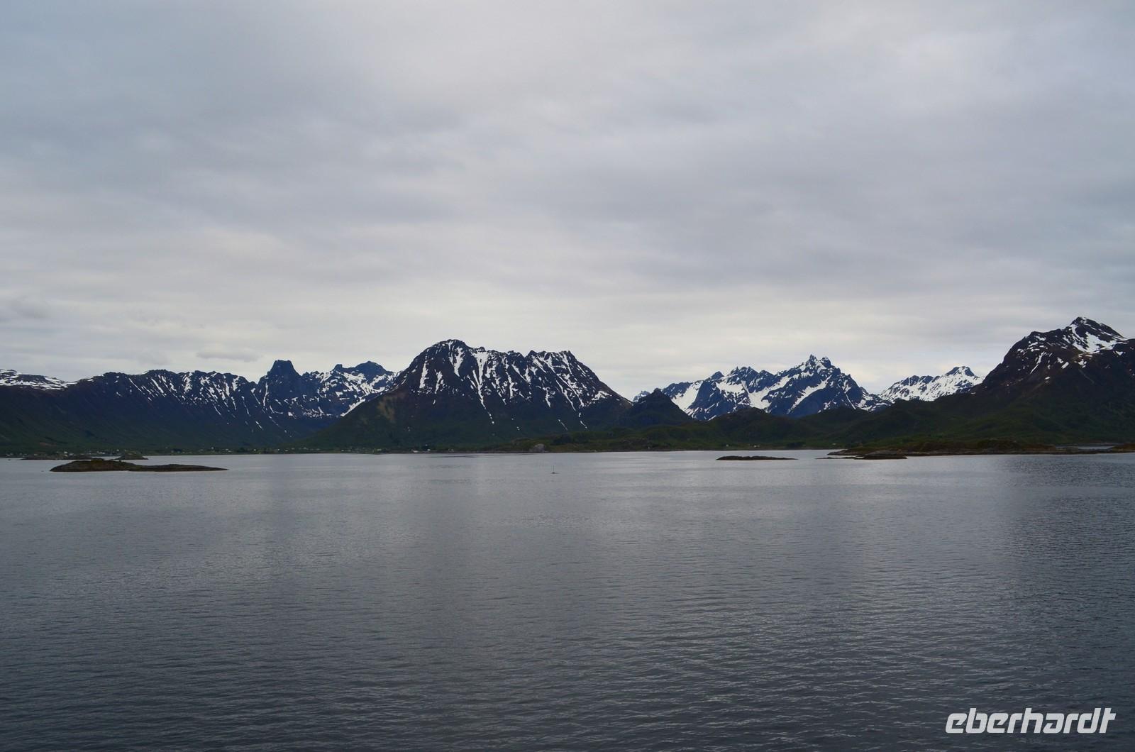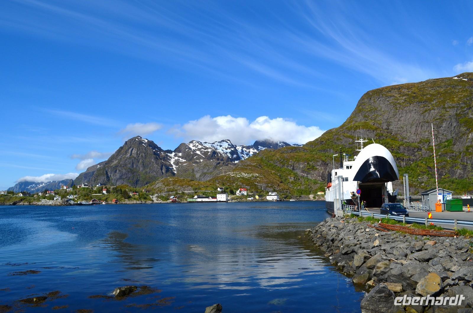 Dann die Vesteralen mit Stockmarknes - das gleiche Bild: Grüne, erblühende Landschaft darüber schneebedeckte Gipfelriesen mit immer bizarreren Formen. Anschließend die Fahrt mit der MS „Richard With“, einem der modernen Schiffe der Hurtigroutenflotte, das uns nach Svolvár auf die Lofoten bringt. Die Fahrt durch den Raftsündet, mit dem Abstecher in den engen Tollfjord und durch die Inseln der Lofoten ist ein besonderes Erlebnis, auch wenn gleichzeitig Wasserflugzeuge den Fjord besuchen.