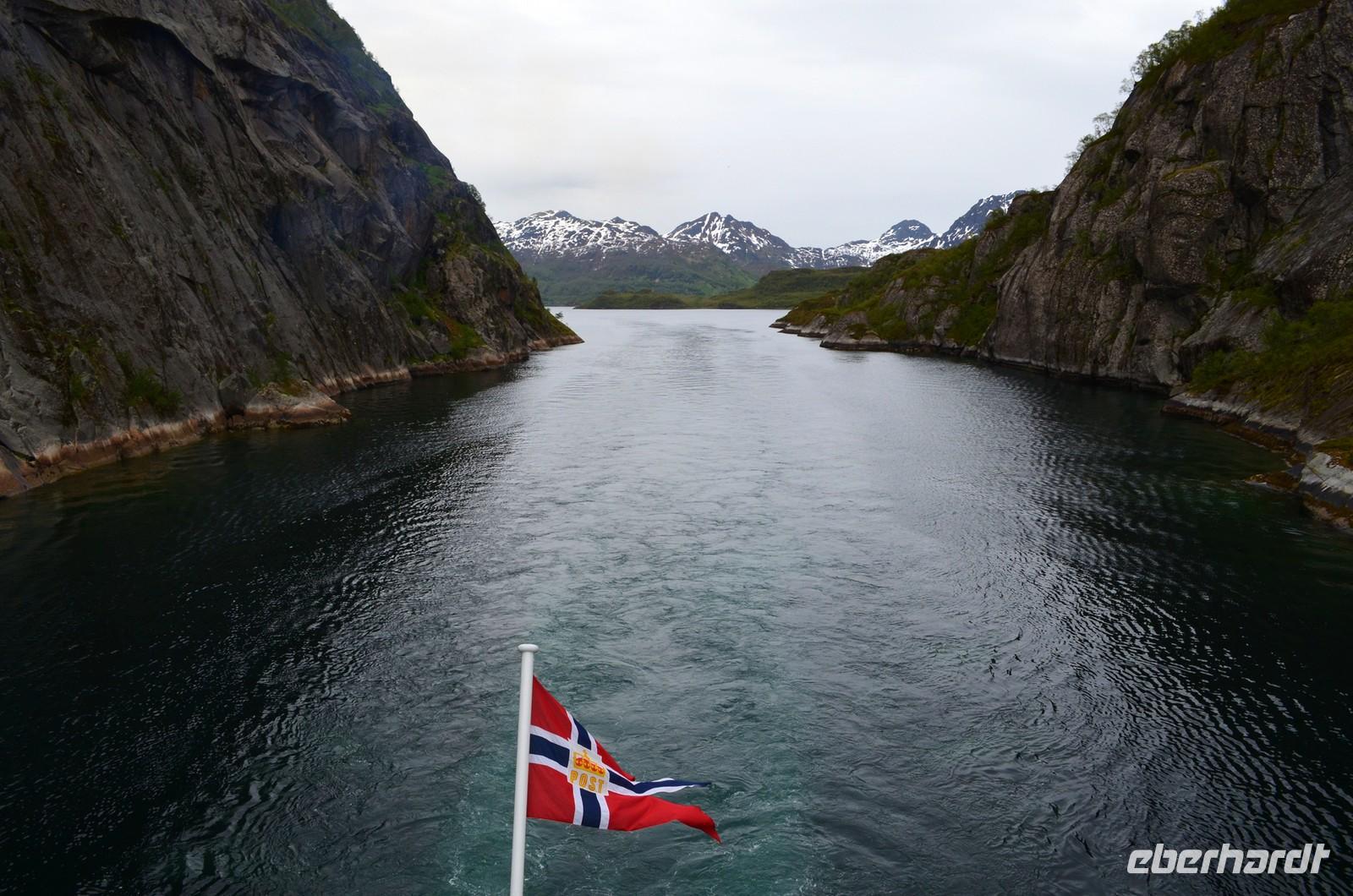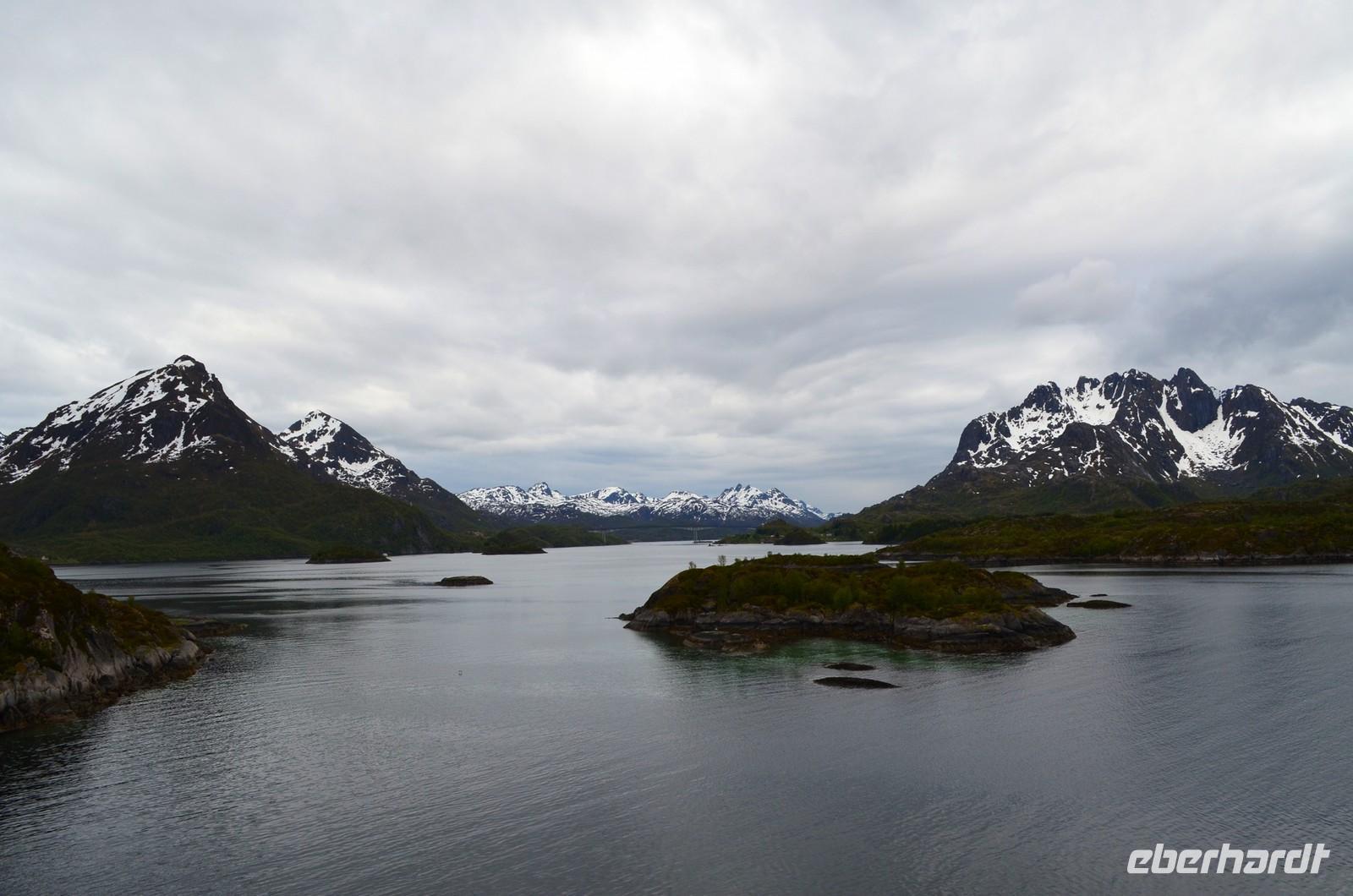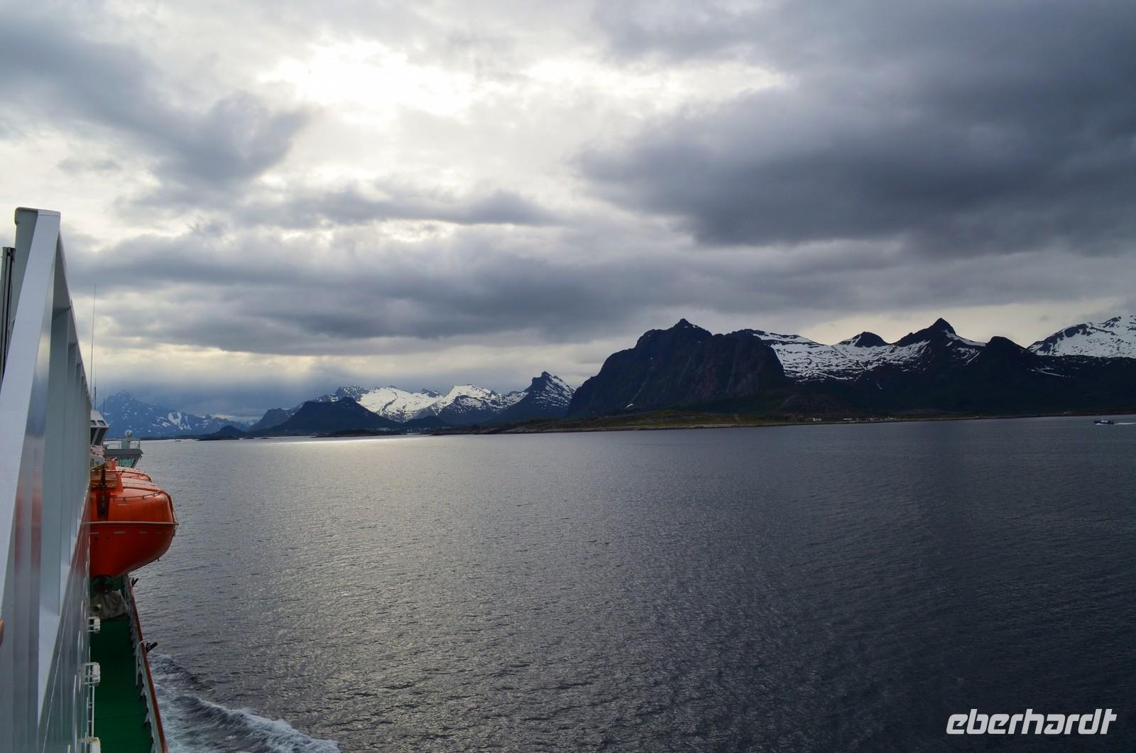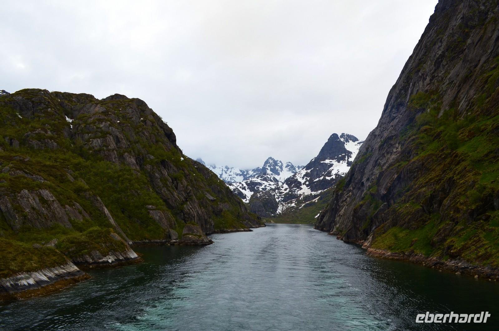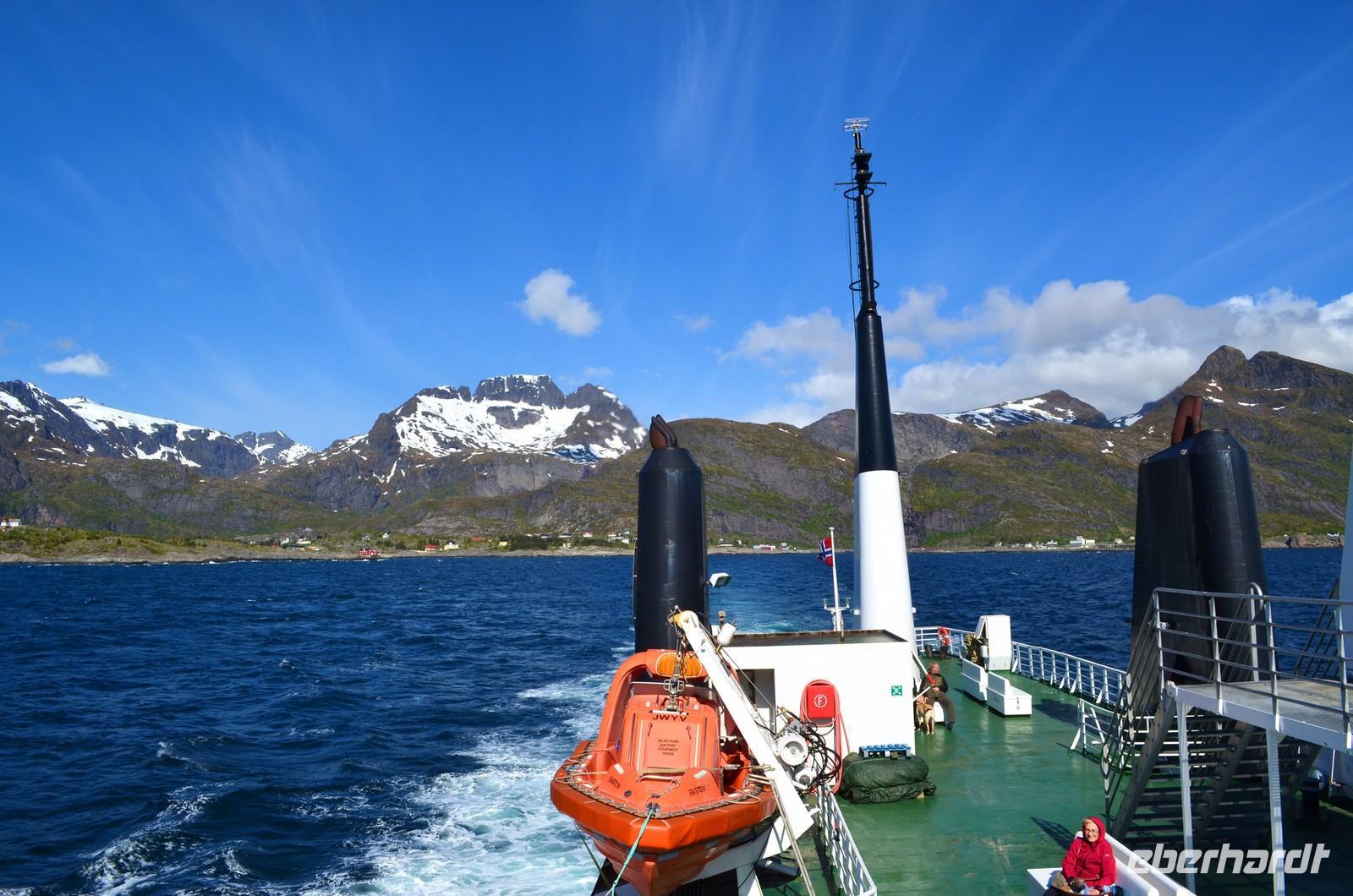 Dann die Vesteralen mit Stockmarknes - das gleiche Bild: Grüne, erblühende Landschaft darüber schneebedeckte Gipfelriesen mit immer bizarreren Formen. Anschließend die Fahrt mit der MS „Richard With“, einem der modernen Schiffe der Hurtigroutenflotte, das uns nach Svolvár auf die Lofoten bringt. Die Fahrt durch den Raftsündet, mit dem Abstecher in den engen Tollfjord und durch die Inseln der Lofoten ist ein besonderes Erlebnis, auch wenn gleichzeitig Wasserflugzeuge den Fjord besuchen.