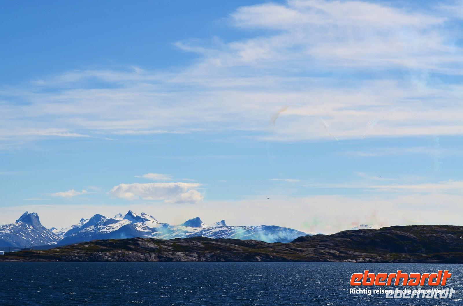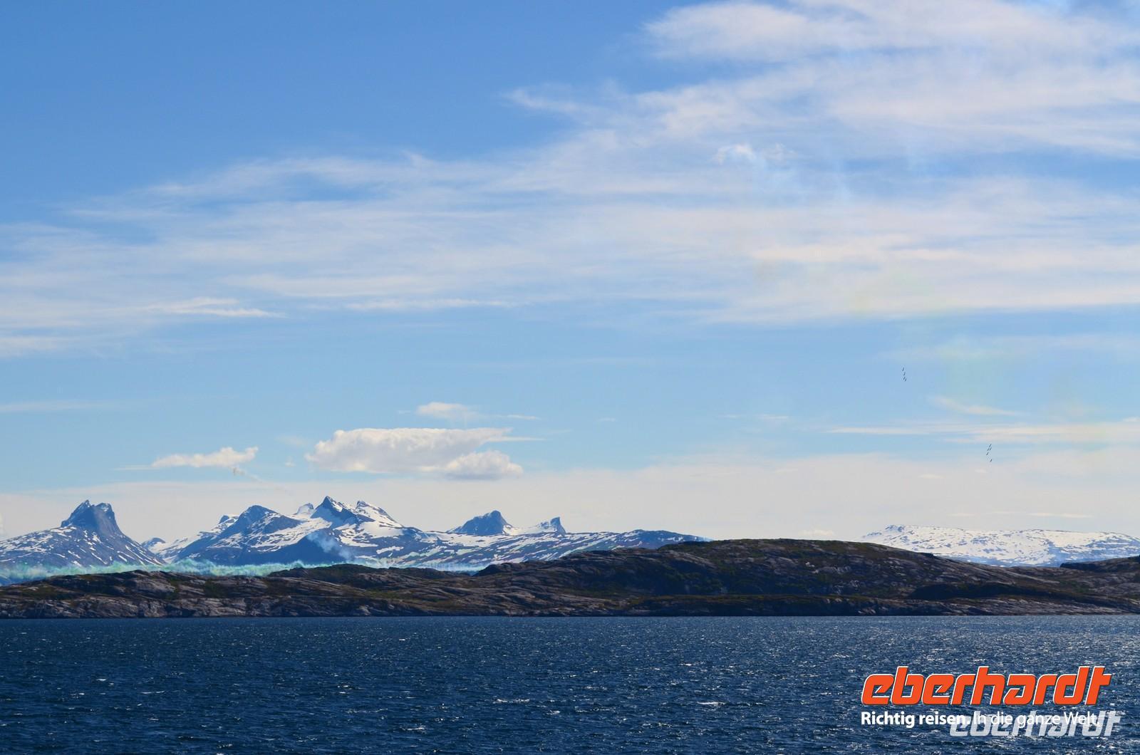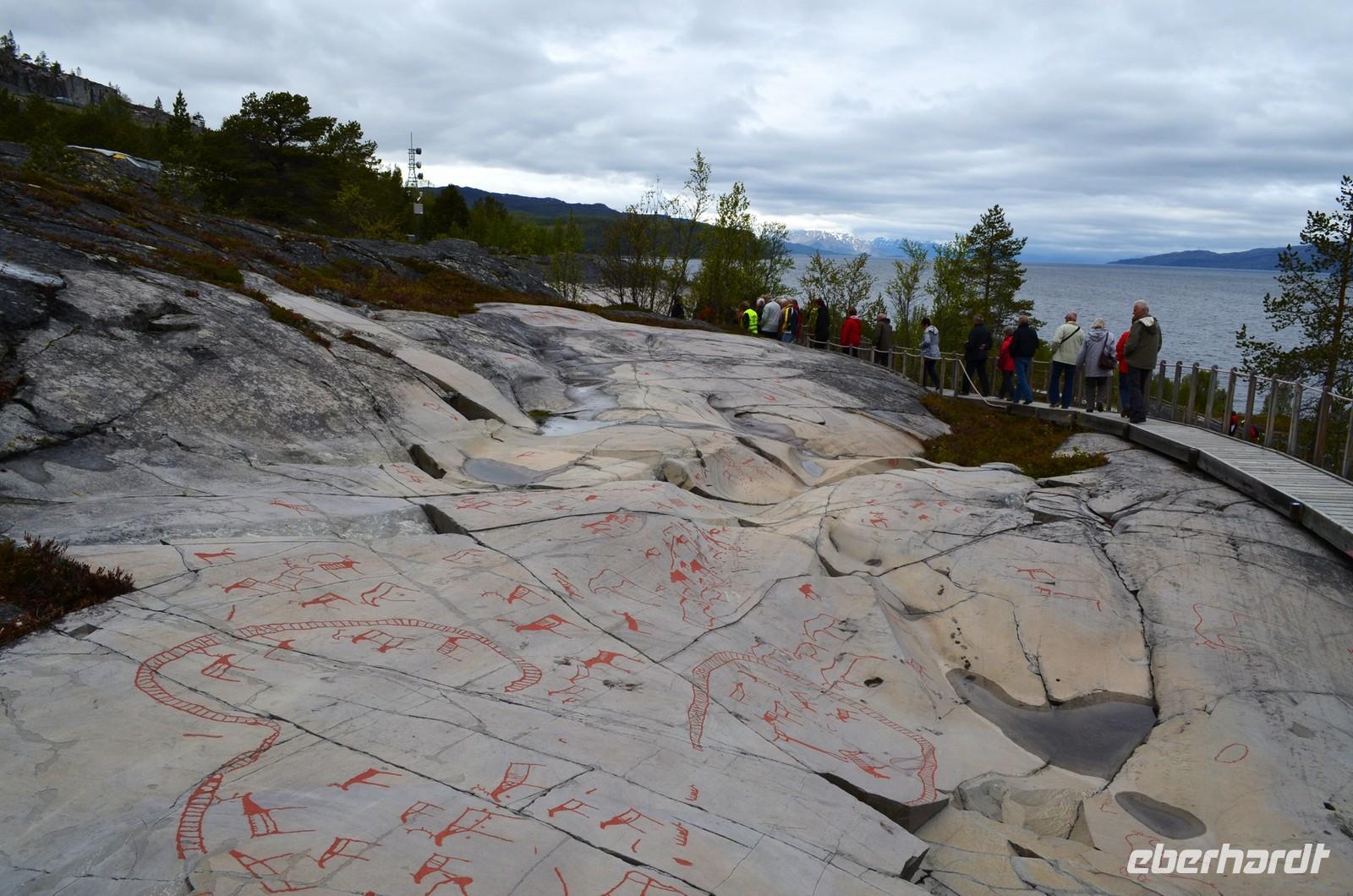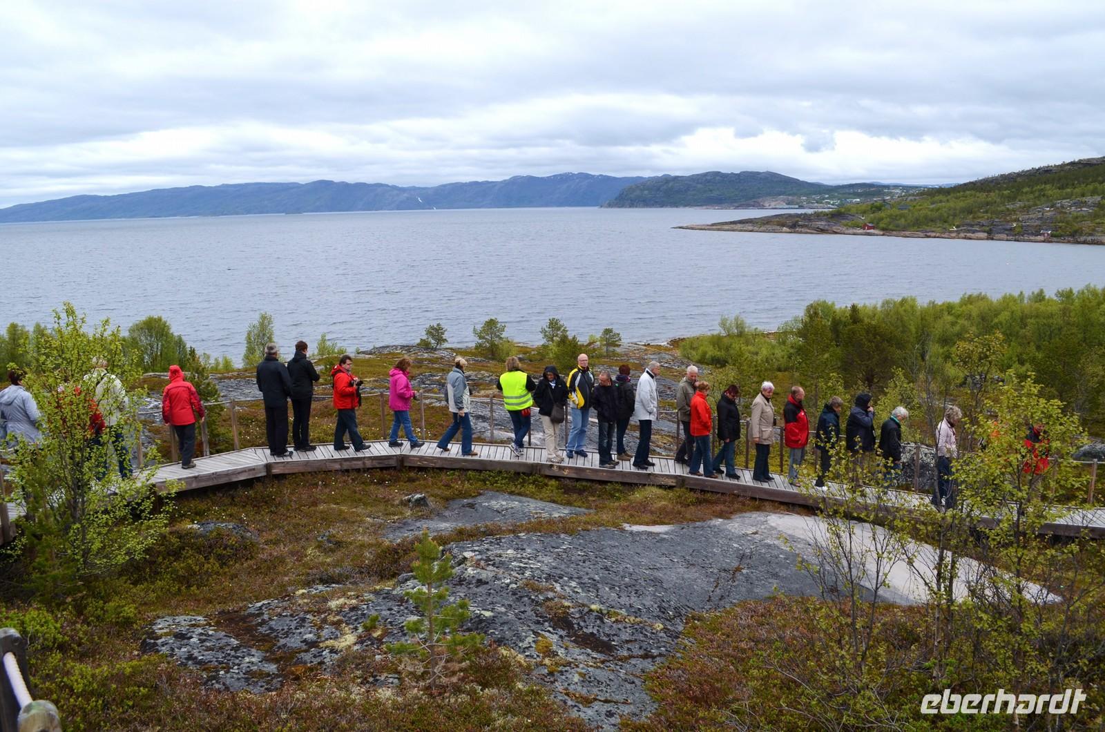Wunderschönes, kühles aber sehr klares Wetter - Die Fahrt über die Fjelle und entlang der Küste nach Oteren, die wechselnden Formen und Farben der Berge, der Fjelle und der Fjorde - die phantastischen Felszeichnungen bei Alta, schneebedeckte Berge und die gletscherbedeckten Lynger-Alpen über dem Lyngerfjord.