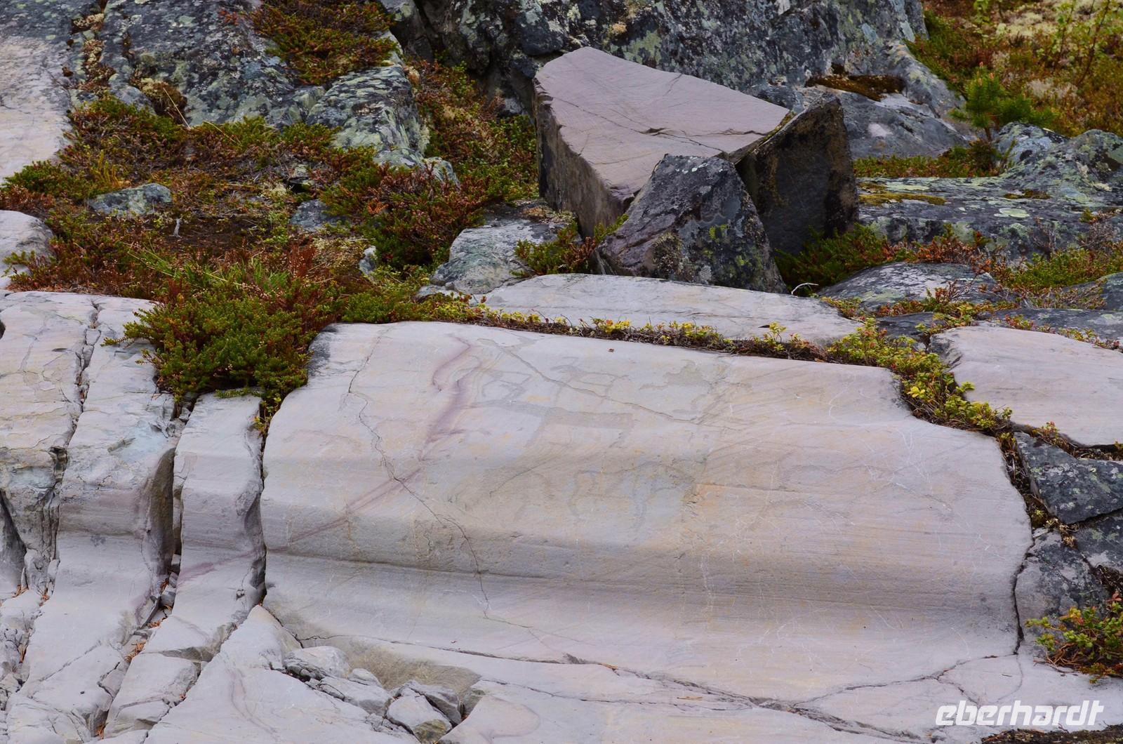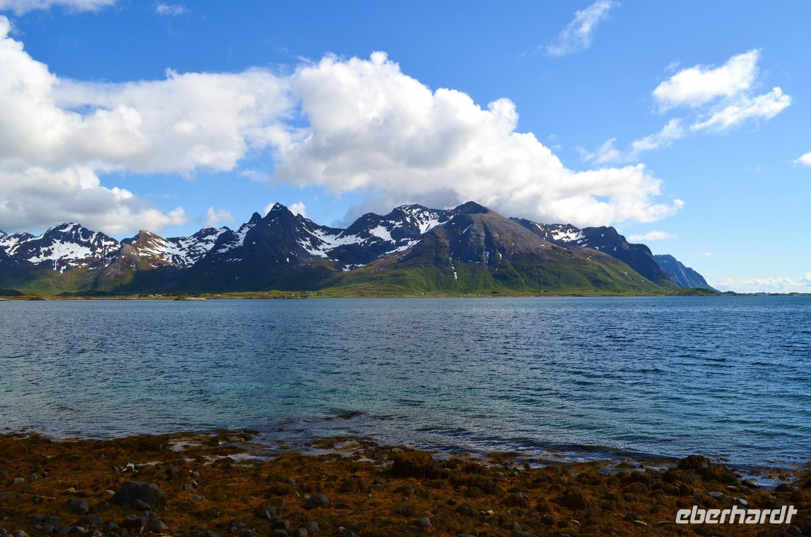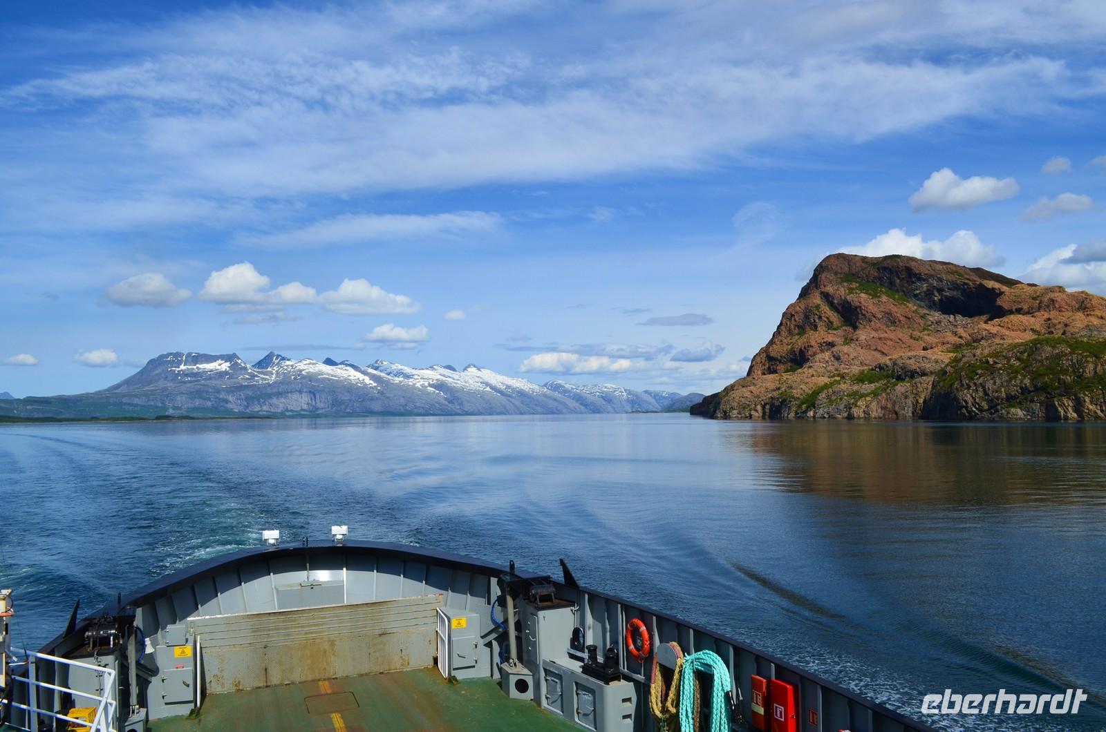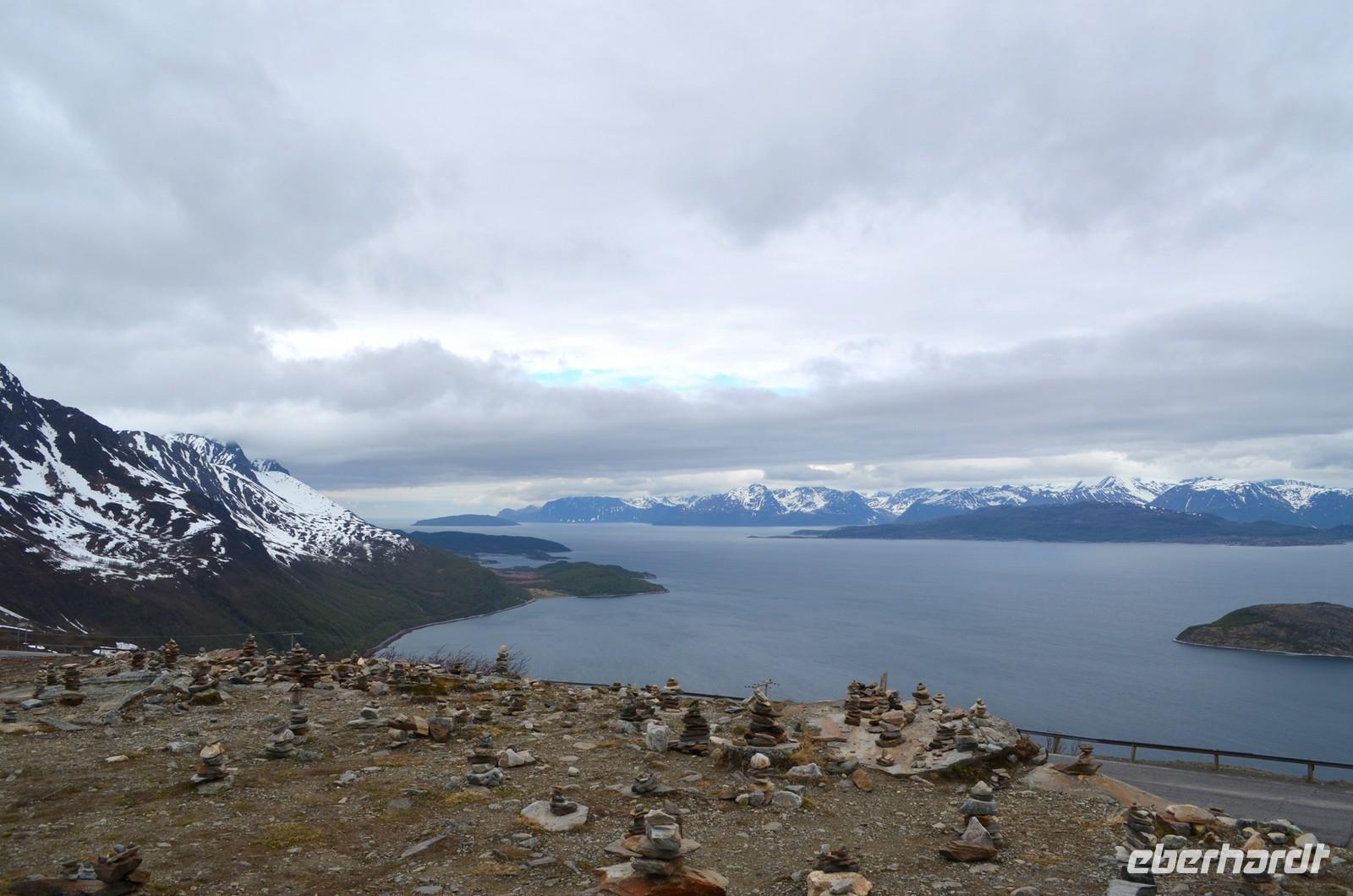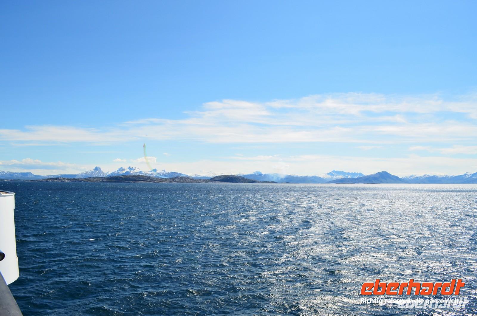 Wunderschönes, kühles aber sehr klares Wetter - Die Fahrt über die Fjelle und entlang der Küste nach Oteren, die wechselnden Formen und Farben der Berge, der Fjelle und der Fjorde - die phantastischen Felszeichnungen bei Alta, schneebedeckte Berge und die gletscherbedeckten Lynger-Alpen über dem Lyngerfjord.