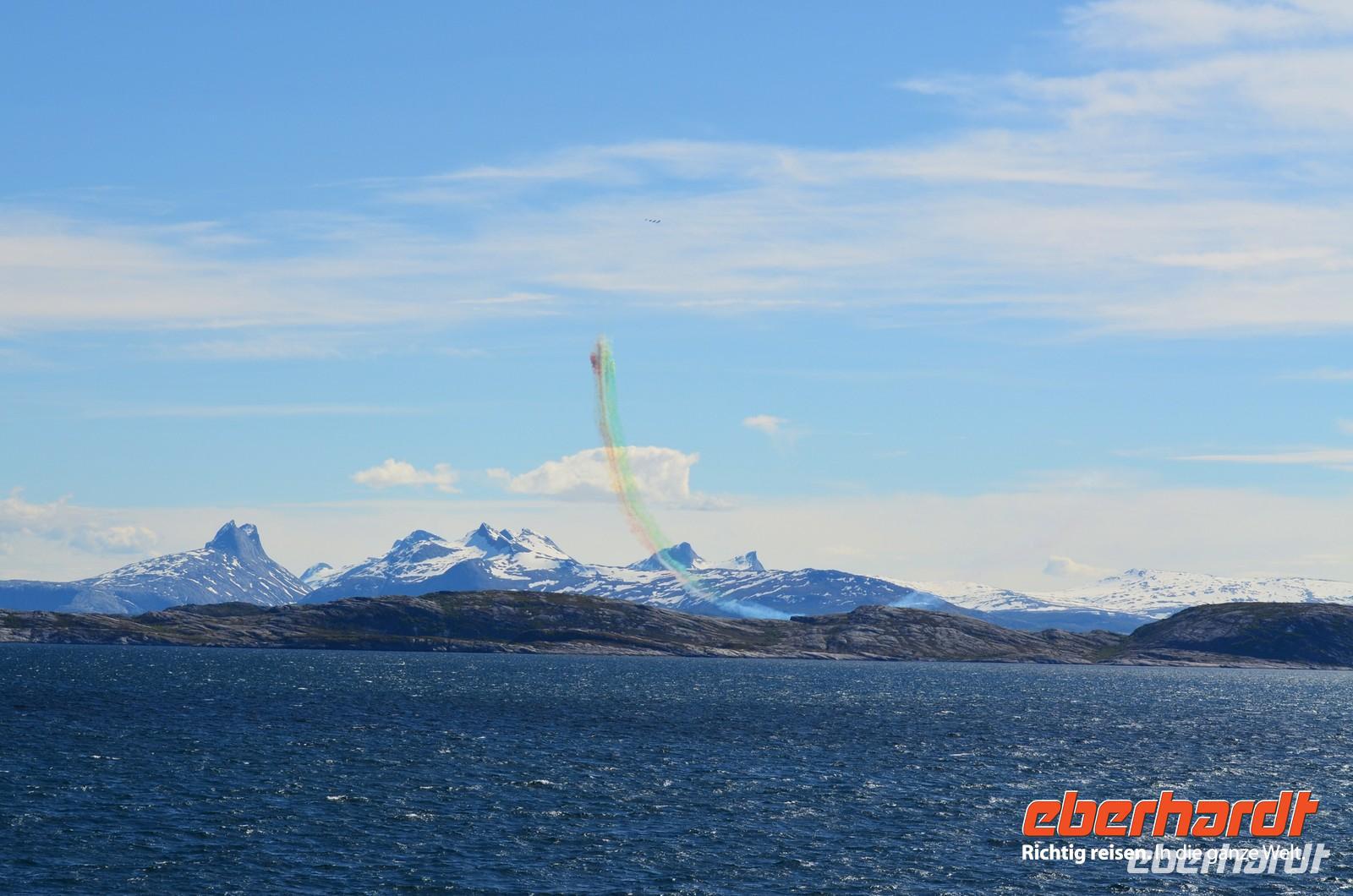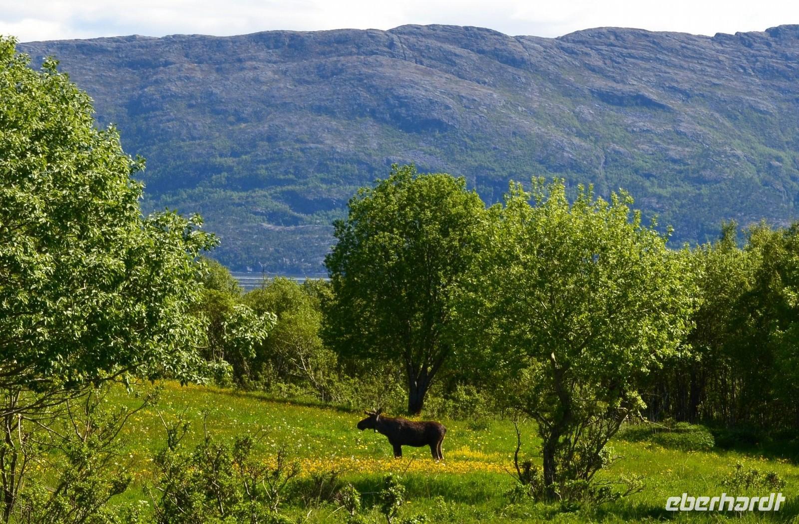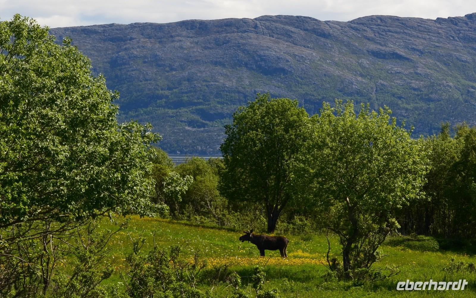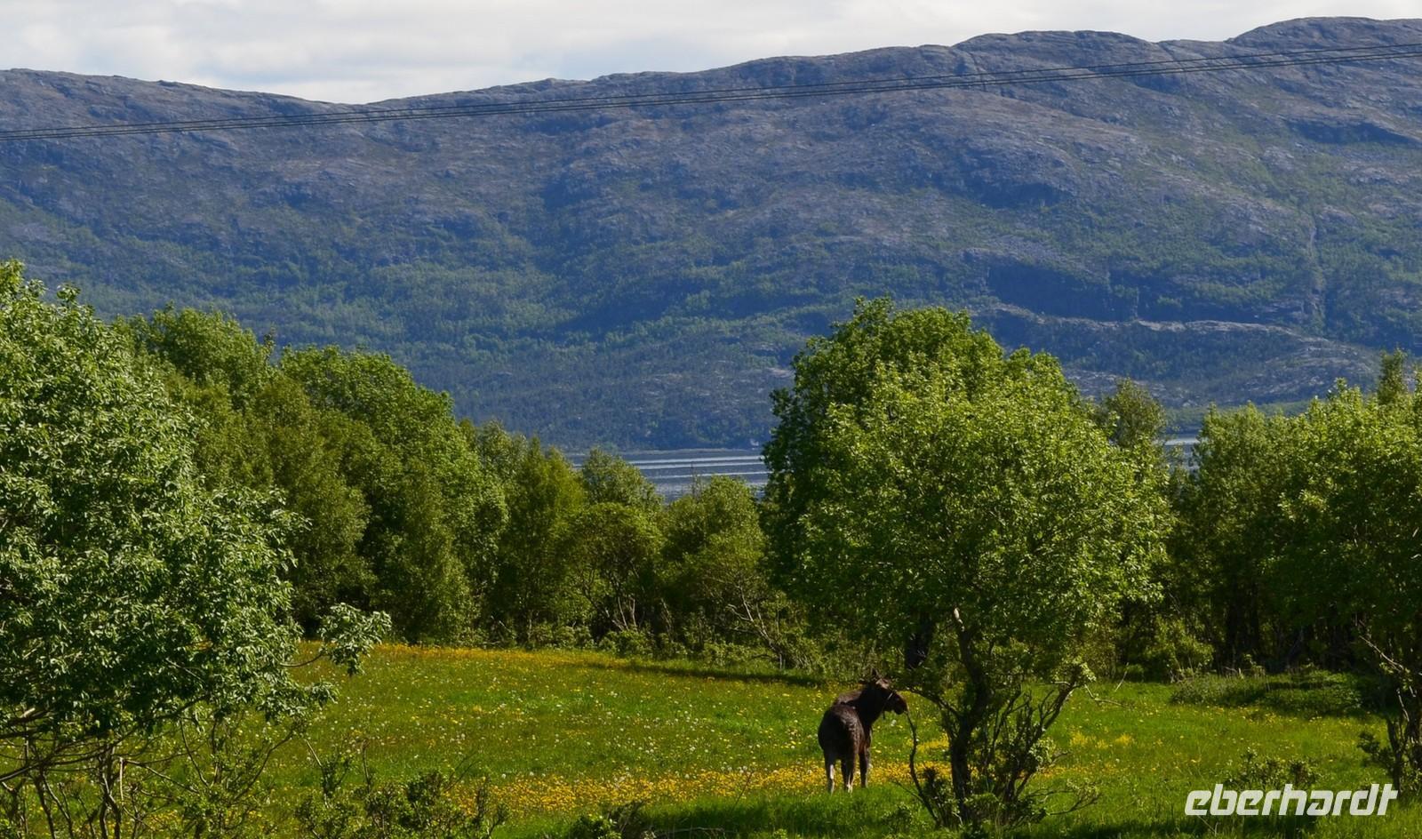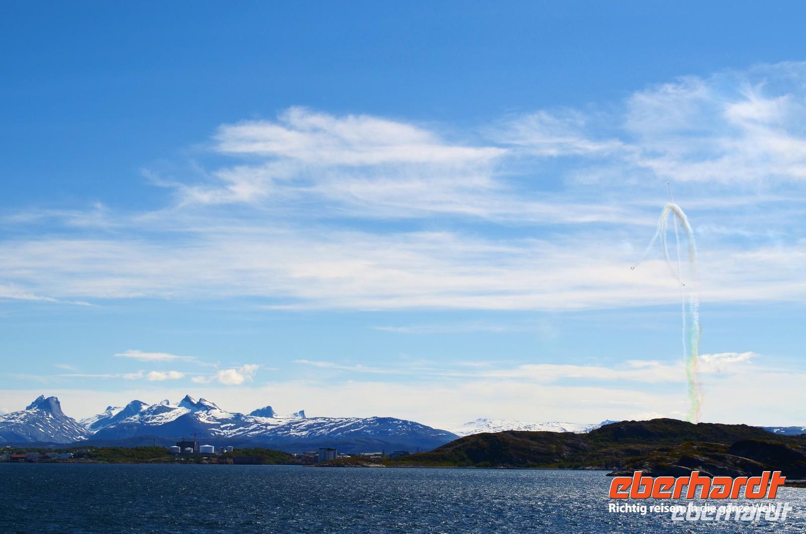 Die weitere Fahrt abwechselnd mit Bus und Fähren entlang der Küste, hinüber nach Bodö, was uns mit einer tollen Flugshow von 9 Jets empfängt, hin zu den Strudeln des Saltstraumen, vorbei an der Marmorstadt Fauske nach Mo i Rana, durch das Helgeland - mit dem prägnanten Bergmassiv der Sieben Schwestern, dem Torghatten, einem Bilderbuchelch auf einer Blumenwiese und am Abend nochmals 4 Elchen (endlich einmal auf der rechten Seite! - nach Steinkjer. Hier blühen Flieder, Tulpen und Narzissen.