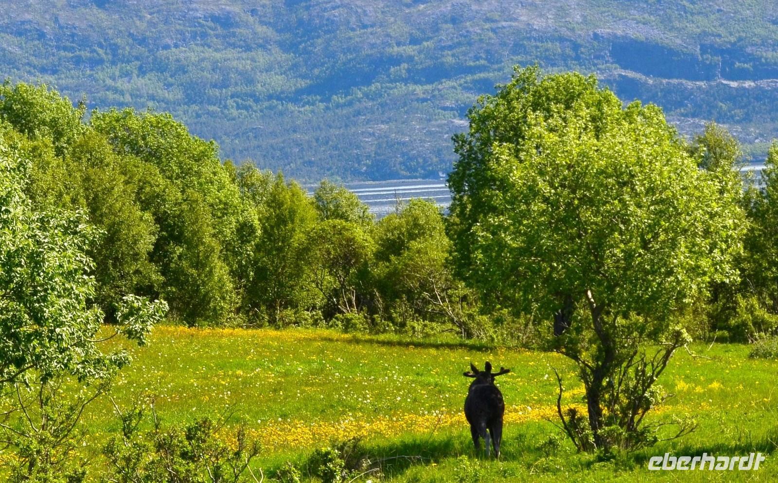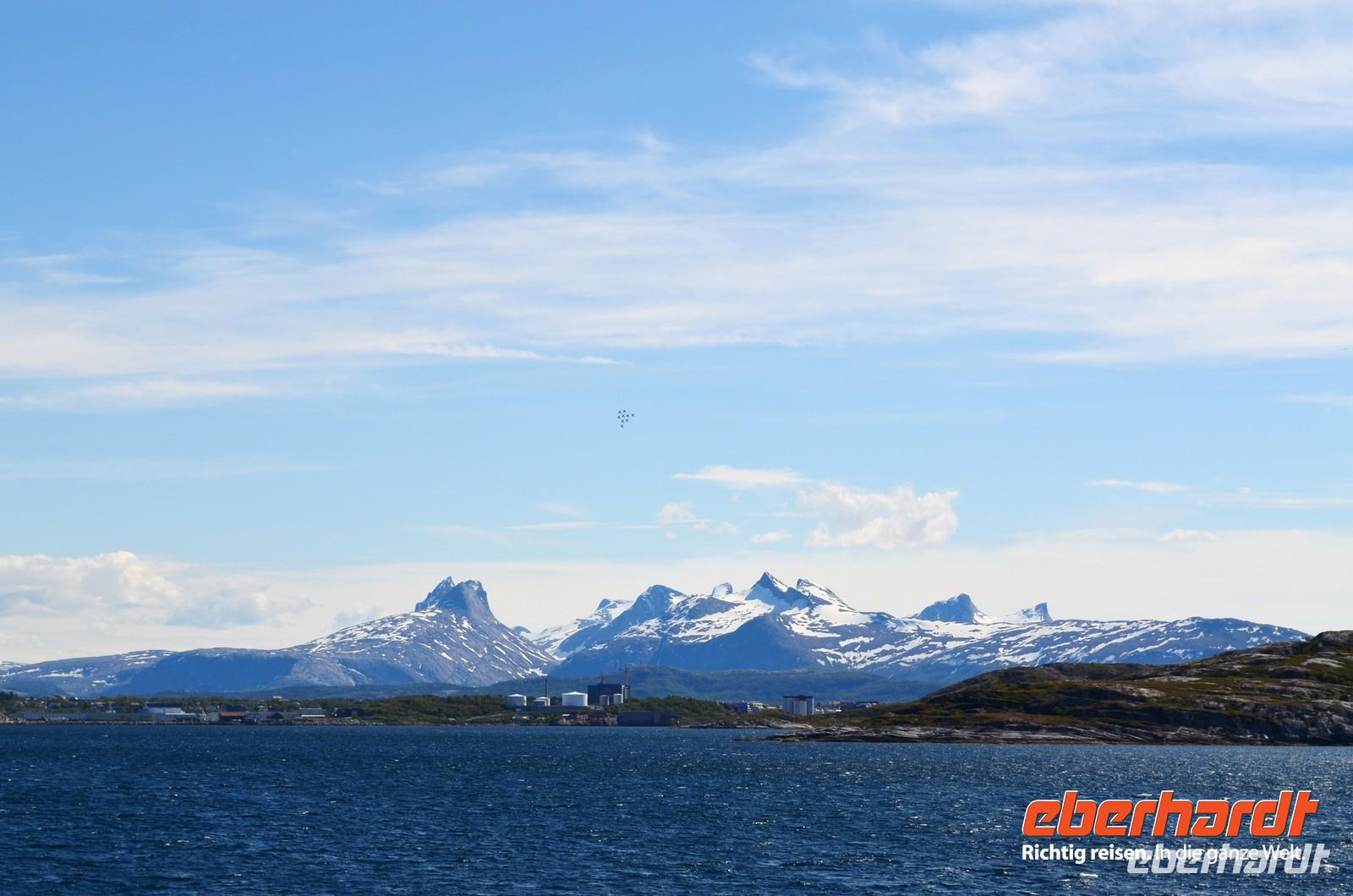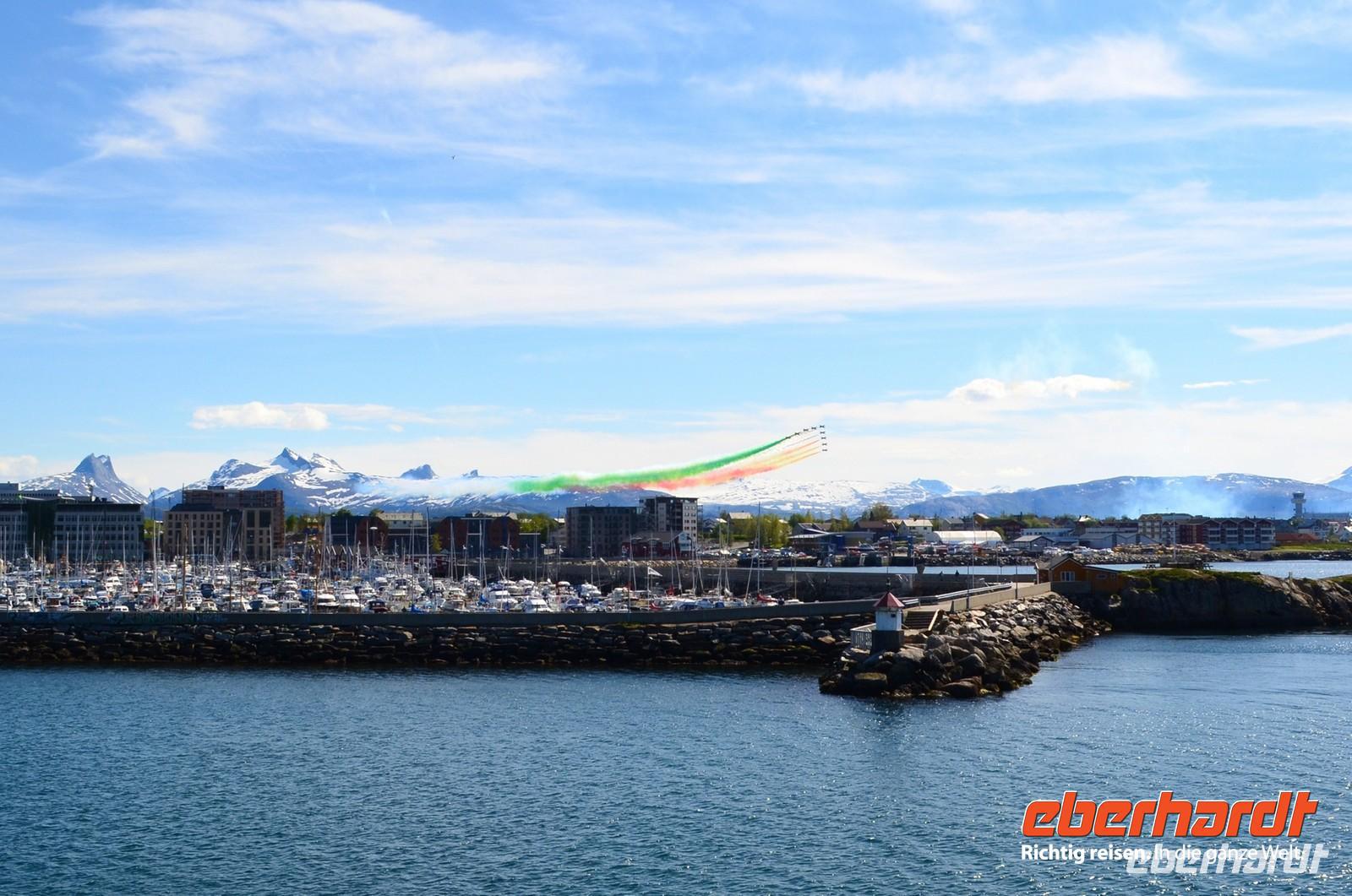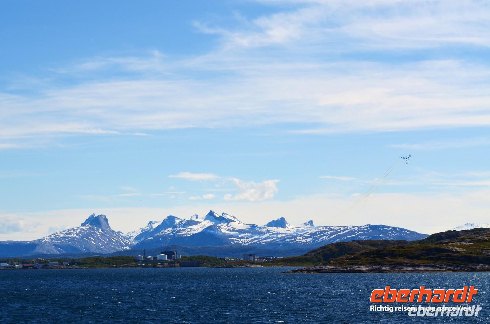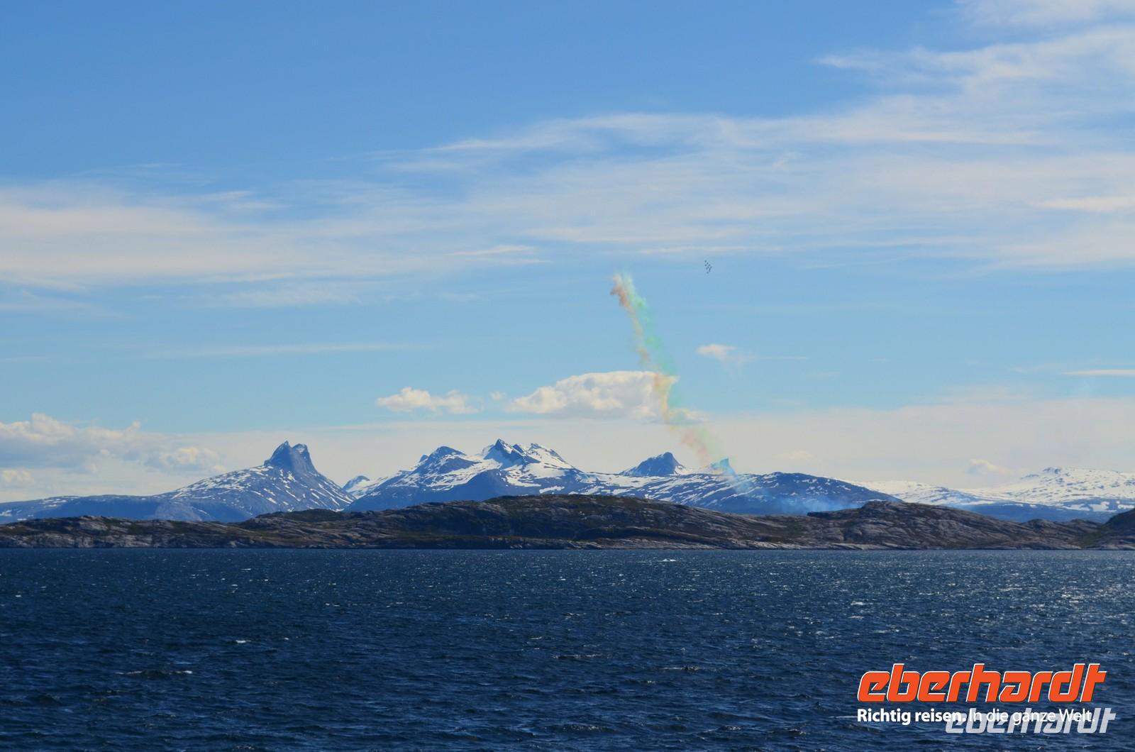 Die weitere Fahrt abwechselnd mit Bus und Fähren entlang der Küste, hinüber nach Bodö, was uns mit einer tollen Flugshow von 9 Jets empfängt, hin zu den Strudeln des Saltstraumen, vorbei an der Marmorstadt Fauske nach Mo i Rana, durch das Helgeland - mit dem prägnanten Bergmassiv der Sieben Schwestern, dem Torghatten, einem Bilderbuchelch auf einer Blumenwiese und am Abend nochmals 4 Elchen (endlich einmal auf der rechten Seite! - nach Steinkjer. Hier blühen Flieder, Tulpen und Narzissen.