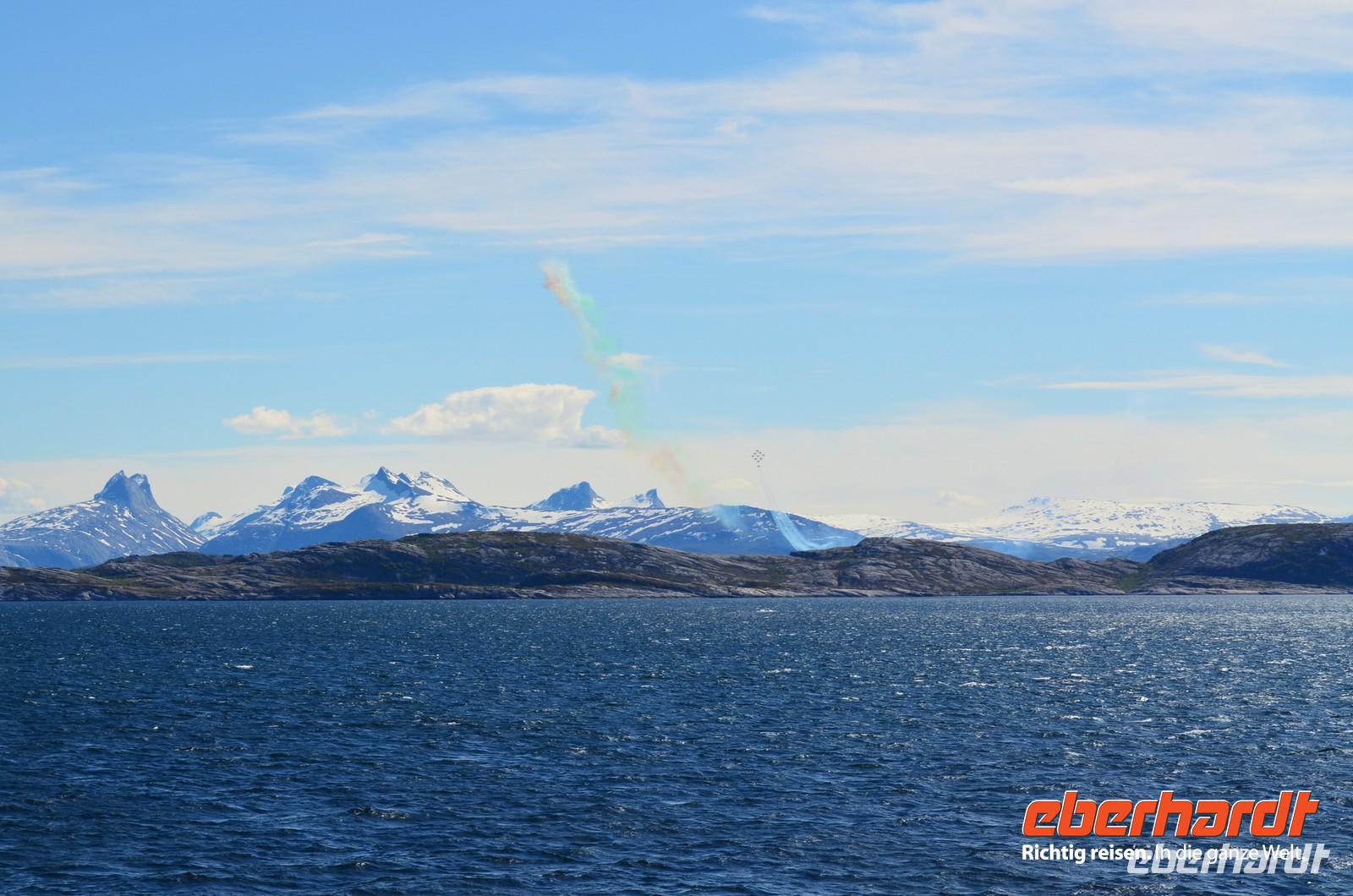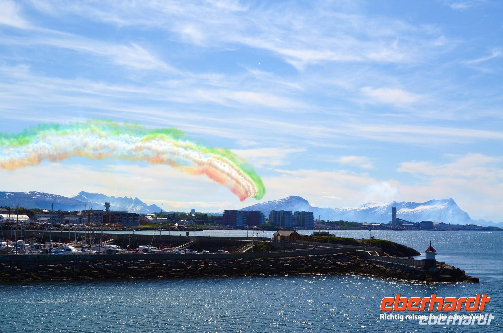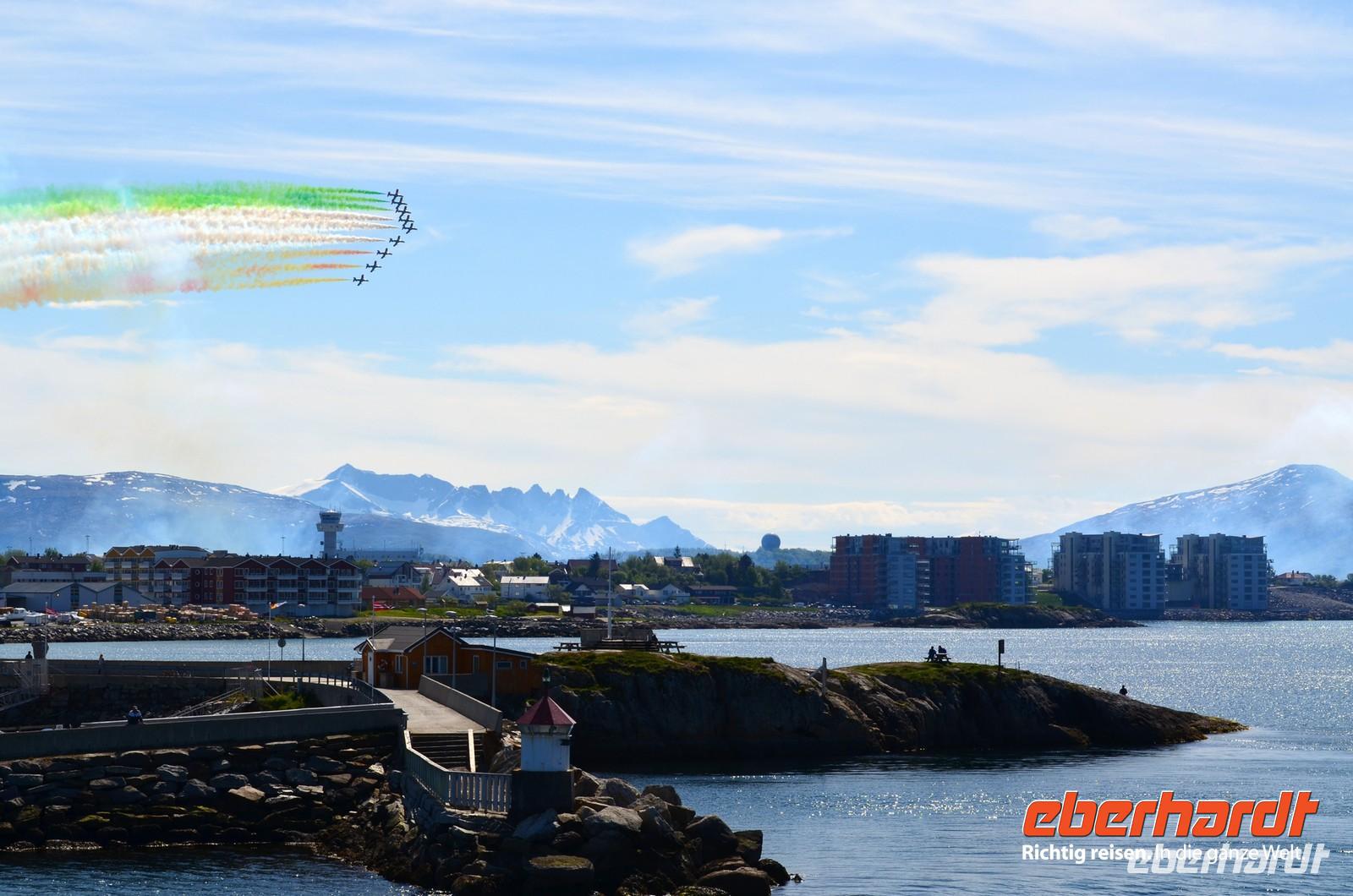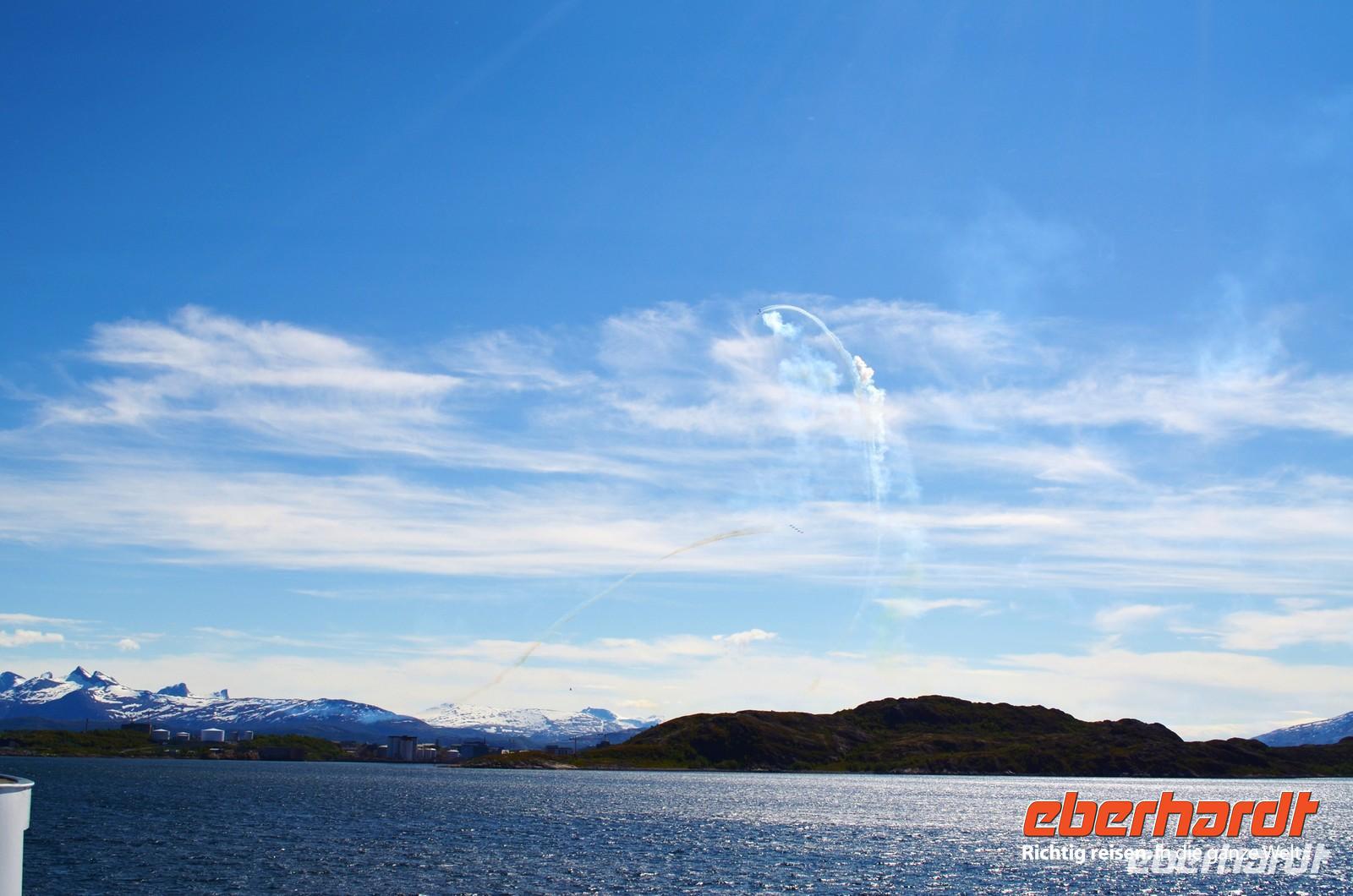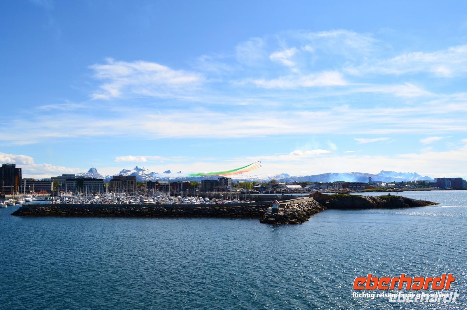 Die weitere Fahrt abwechselnd mit Bus und Fähren entlang der Küste, hinüber nach Bodö, was uns mit einer tollen Flugshow von 9 Jets empfängt, hin zu den Strudeln des Saltstraumen, vorbei an der Marmorstadt Fauske nach Mo i Rana, durch das Helgeland - mit dem prägnanten Bergmassiv der Sieben Schwestern, dem Torghatten, einem Bilderbuchelch auf einer Blumenwiese und am Abend nochmals 4 Elchen (endlich einmal auf der rechten Seite! - nach Steinkjer. Hier blühen Flieder, Tulpen und Narzissen.