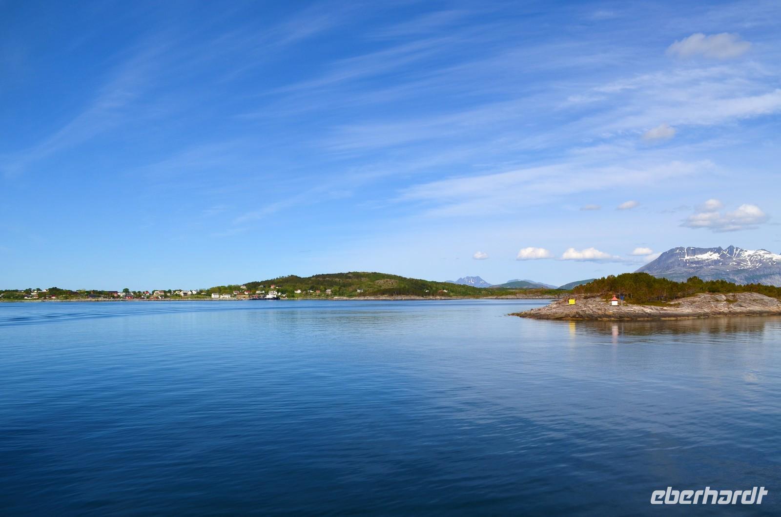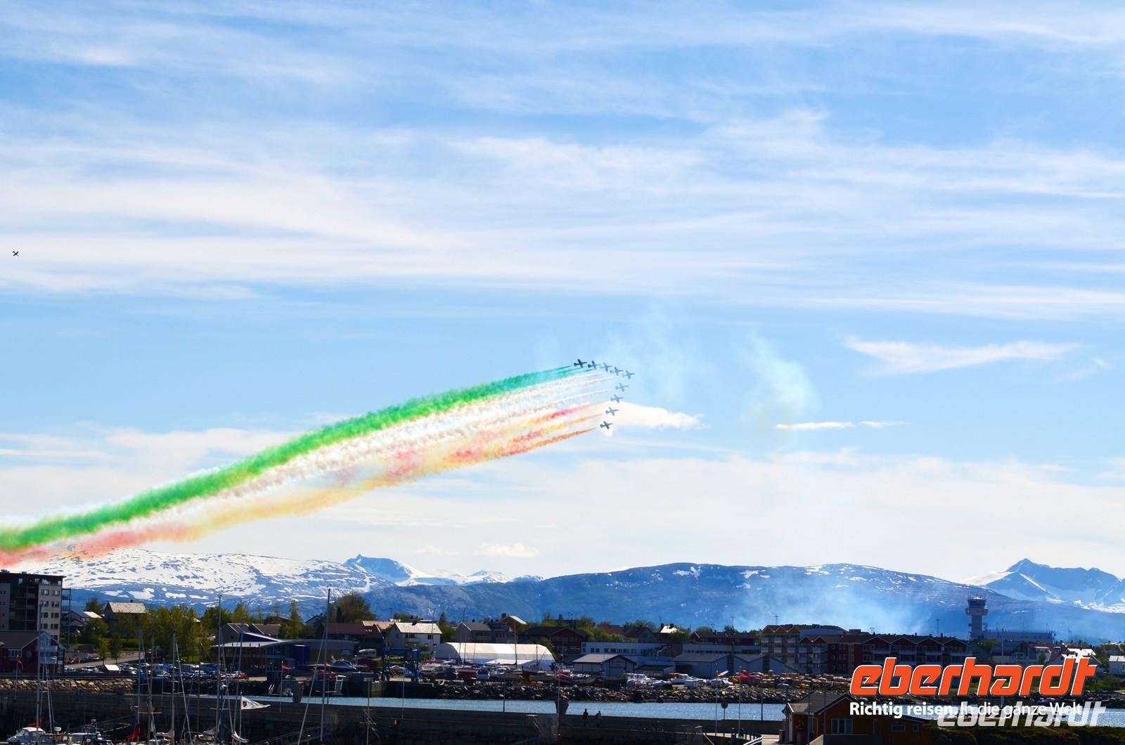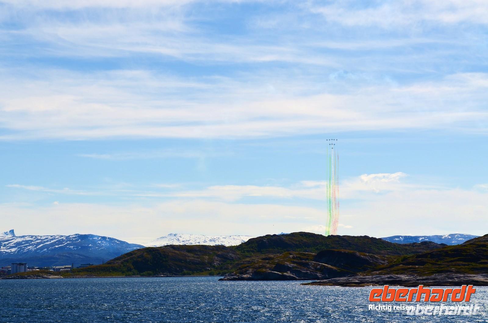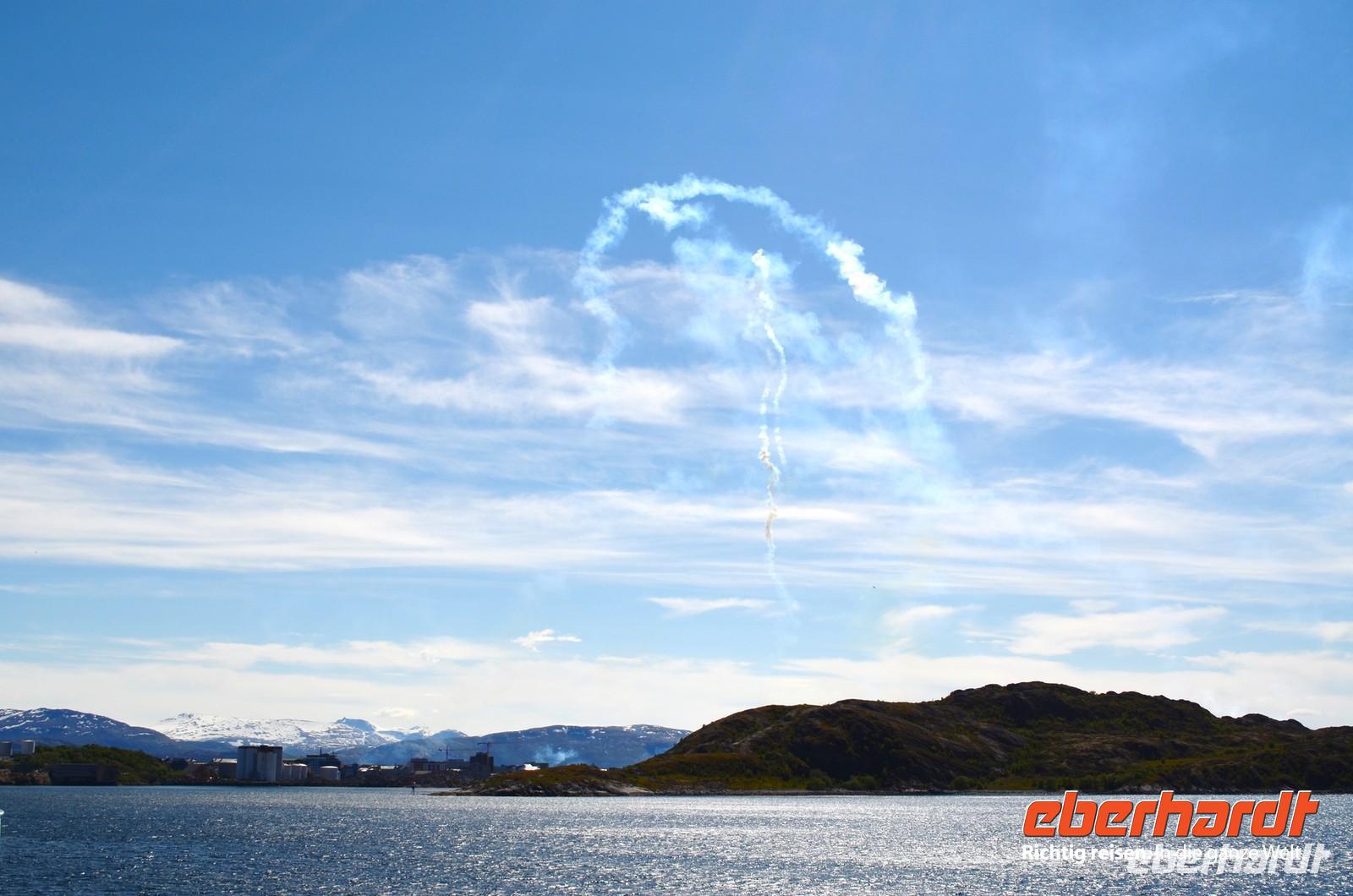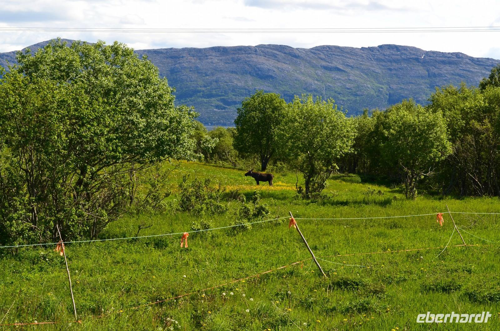 Die weitere Fahrt abwechselnd mit Bus und Fähren entlang der Küste, hinüber nach Bodö, was uns mit einer tollen Flugshow von 9 Jets empfängt, hin zu den Strudeln des Saltstraumen, vorbei an der Marmorstadt Fauske nach Mo i Rana, durch das Helgeland - mit dem prägnanten Bergmassiv der Sieben Schwestern, dem Torghatten, einem Bilderbuchelch auf einer Blumenwiese und am Abend nochmals 4 Elchen (endlich einmal auf der rechten Seite! - nach Steinkjer. Hier blühen Flieder, Tulpen und Narzissen.