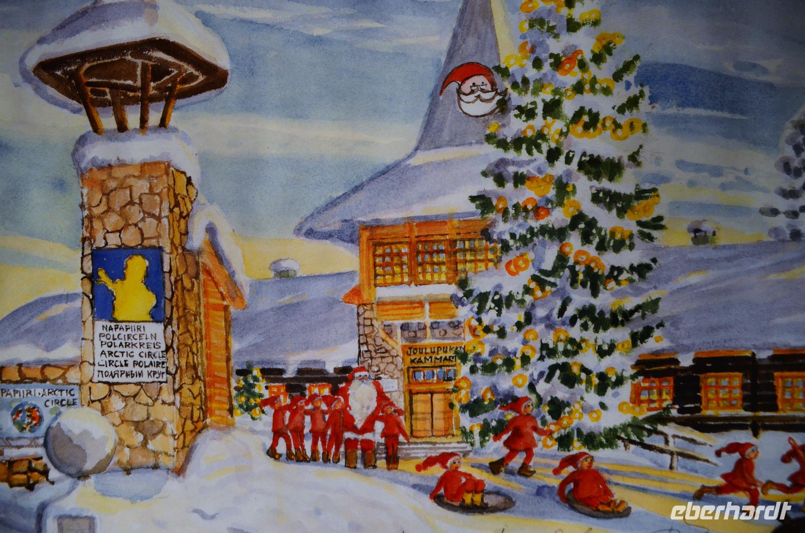 Der heutige Tag ist ein Regentag. Bei der Fahrt durch Wälder mit zahllosen Mooren, Seen und Flüssen stört uns das aber nicht. Erster Halt ist an dem großen Einkaufspark der Stadt Tornio an der schwedisch-finnischen Grenze. Von hier geht es mittags weiter in den Norden hinauf. Schließlich treffen wir bei Rovaniemi auf den Polarkreis und das Weihnachtsdorf. Für die Polarkreisüberquerung gibt es ein Glas Sekt von eberhardt Travel für jeden Gast.