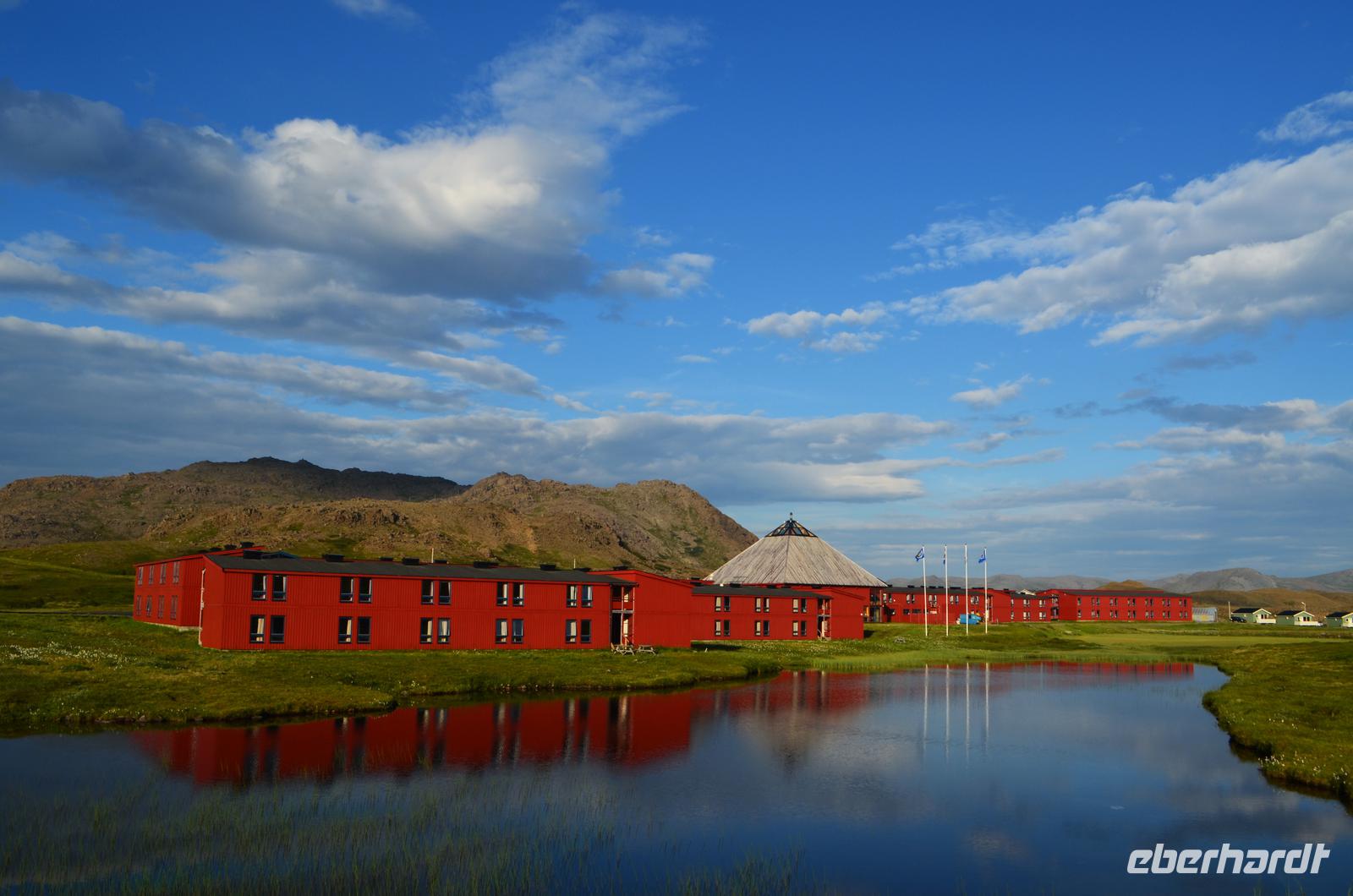 Am Nachmittag haben wir den Nordkaptunnel passiert und betreten die Insel Magerøe. Das Rica Nordkap Hotel empfängt uns mit eitel Sonnenschein.