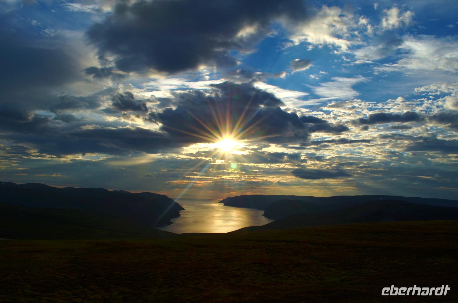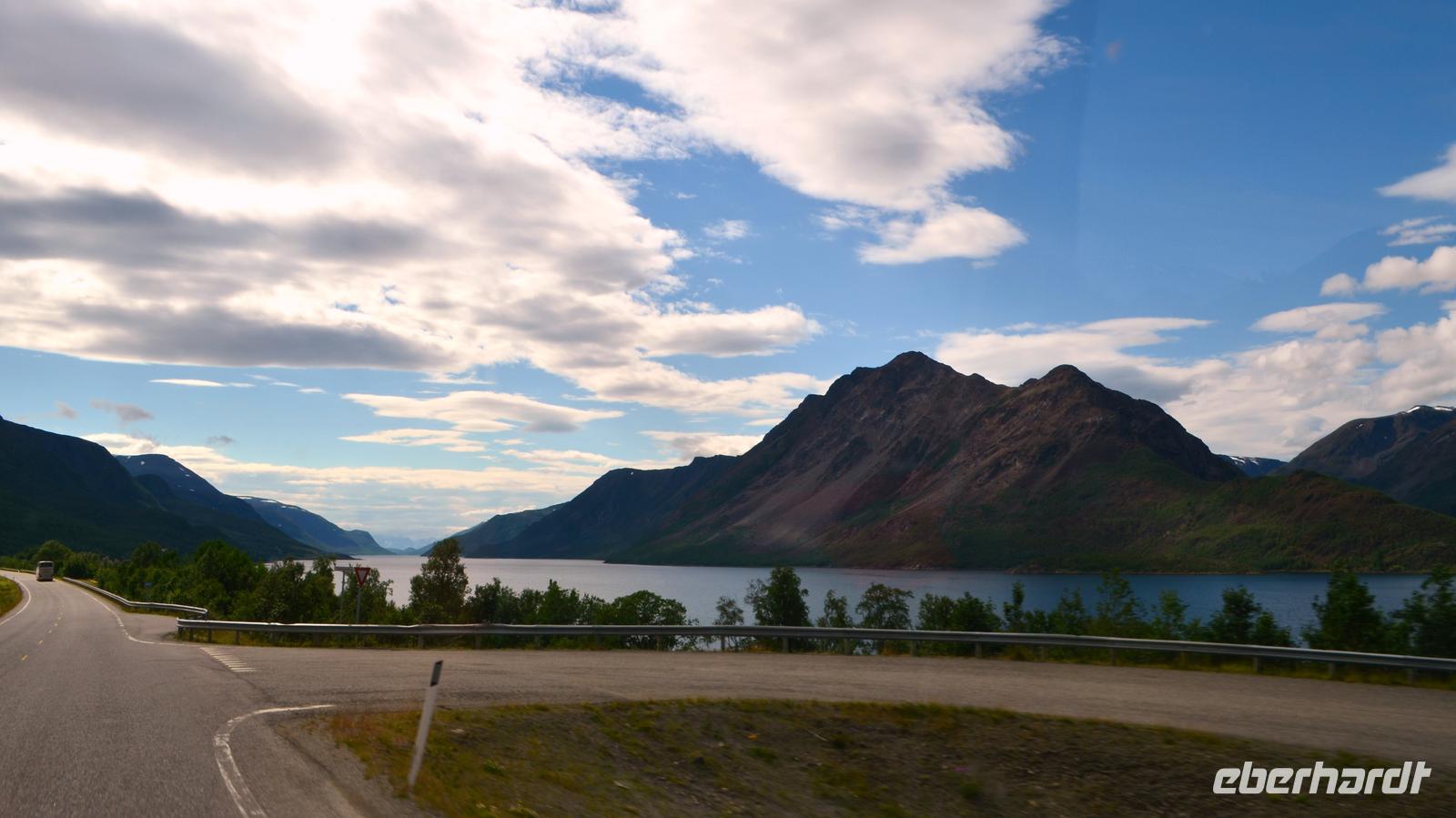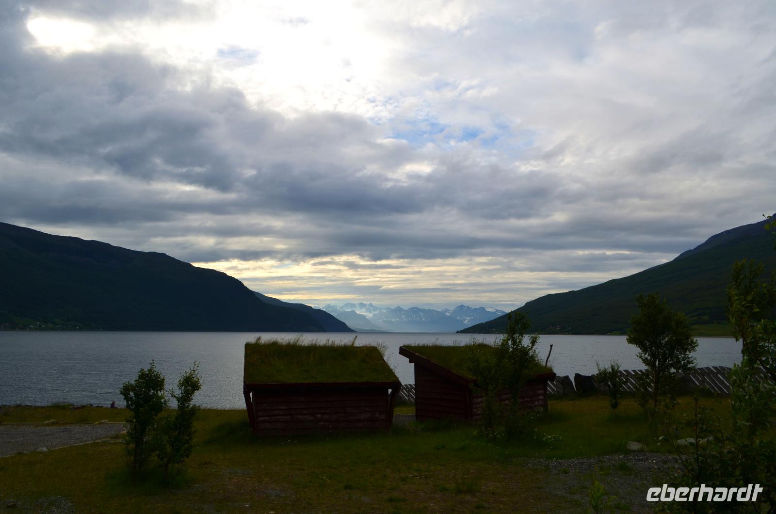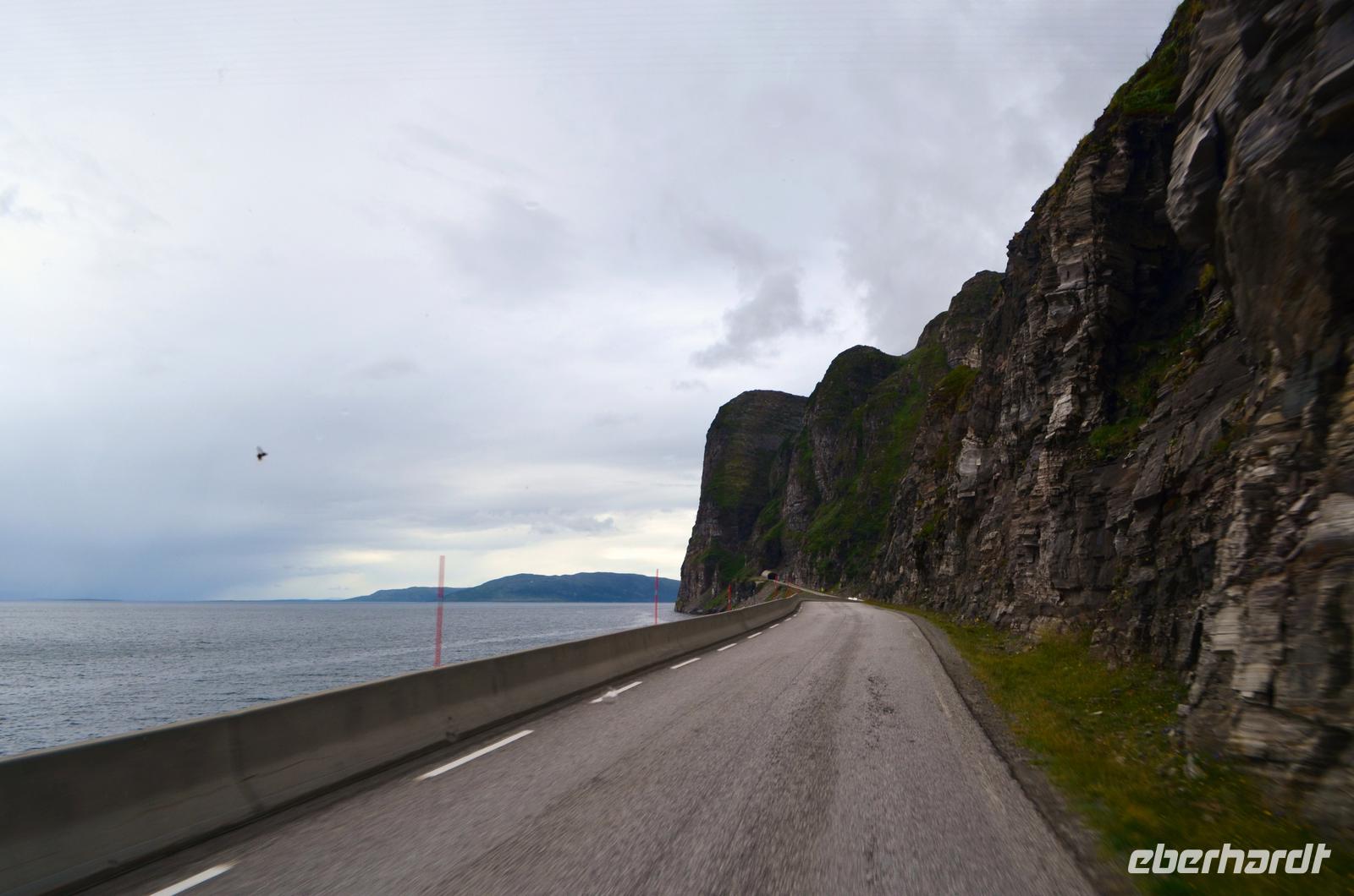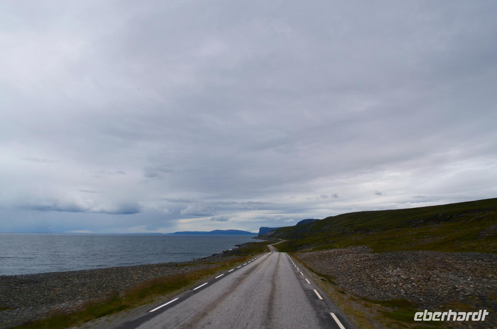 Ganz im Norden angekommen, erreichen wir die ersten hohen Berge und Fjorde. Bei Lakslev am Porsangerfjord geht ein gewaltiger Gewitterschauer nieder und so beeilen wir uns weiter zu kommen, denn im nördlichen Teil des Porsangerfjordes scheint die Sonne.