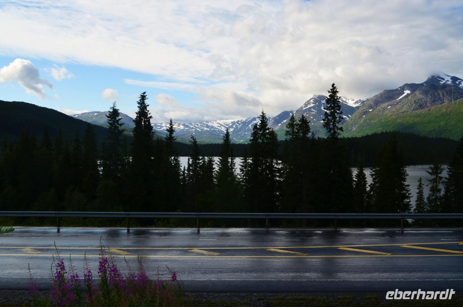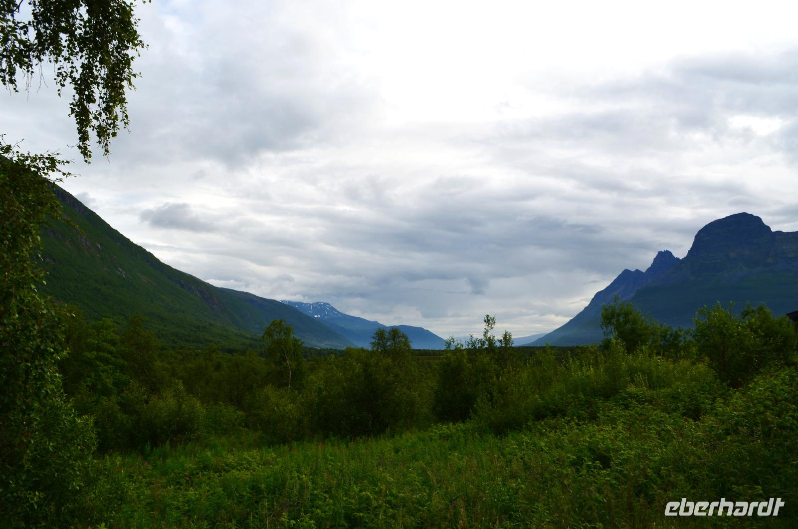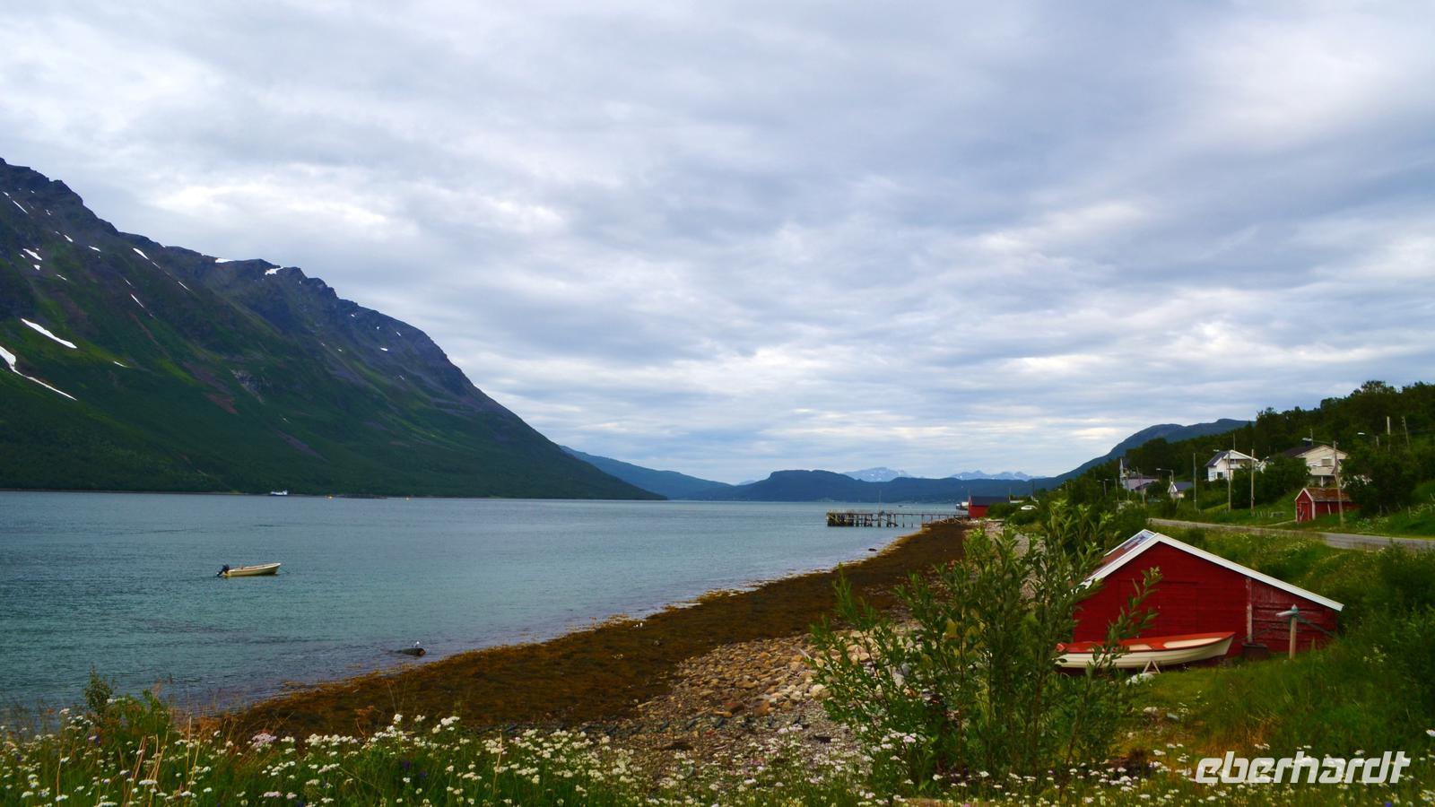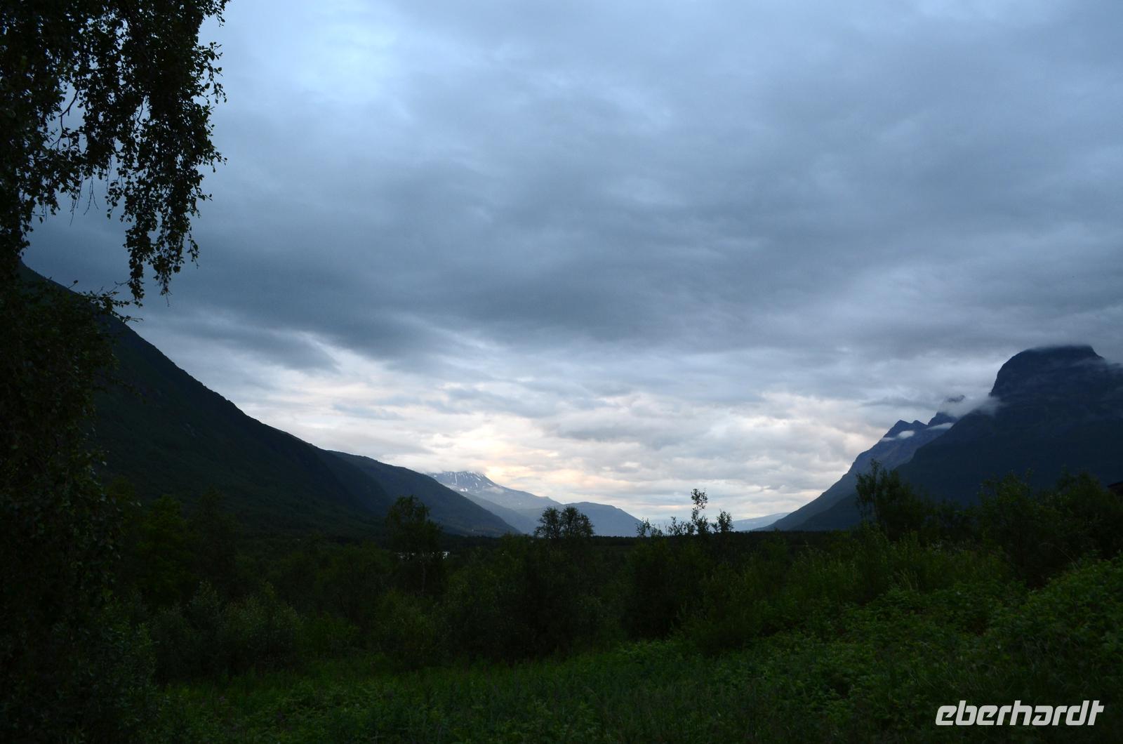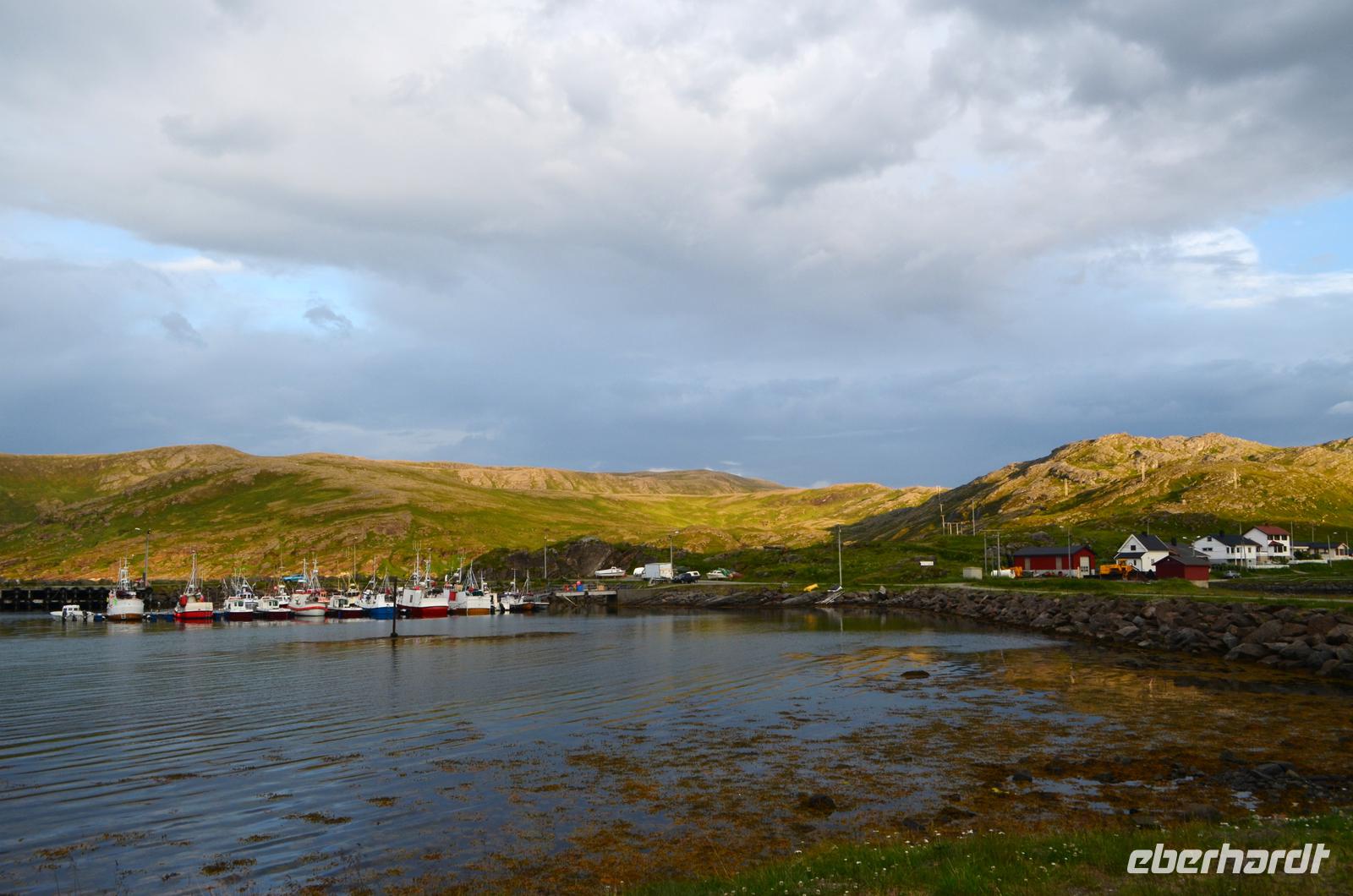 Ganz im Norden angekommen, erreichen wir die ersten hohen Berge und Fjorde. Bei Lakslev am Porsangerfjord geht ein gewaltiger Gewitterschauer nieder und so beeilen wir uns weiter zu kommen, denn im nördlichen Teil des Porsangerfjordes scheint die Sonne.