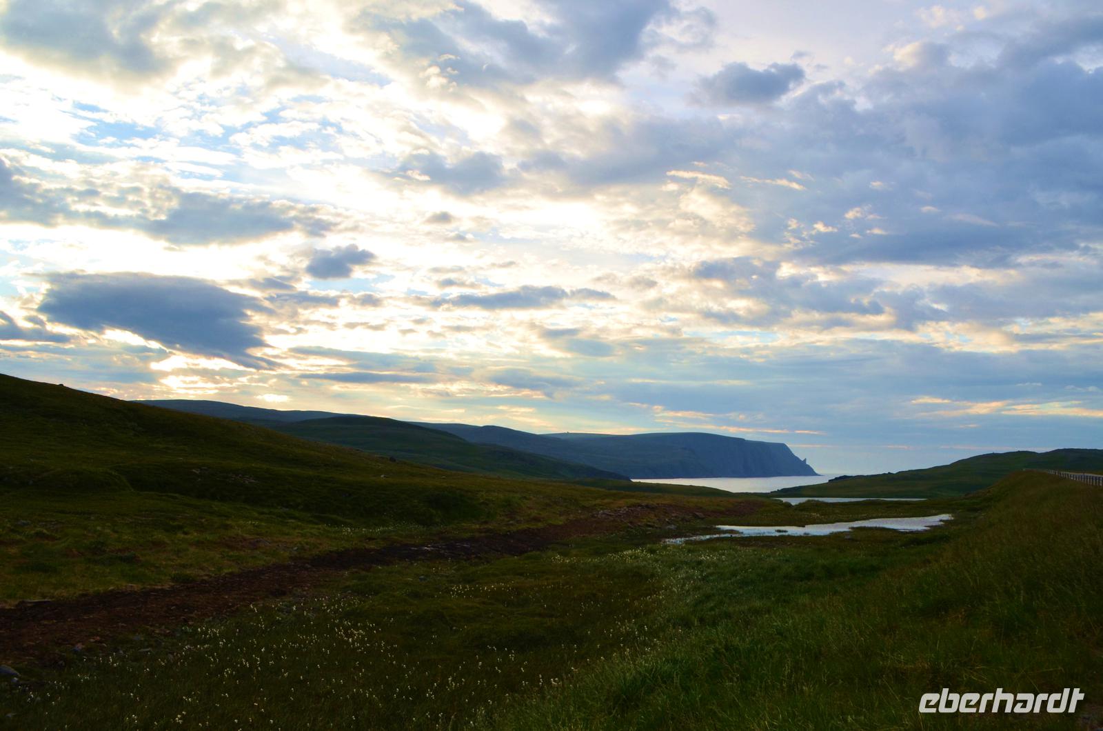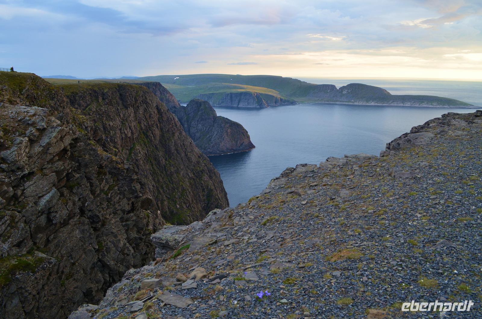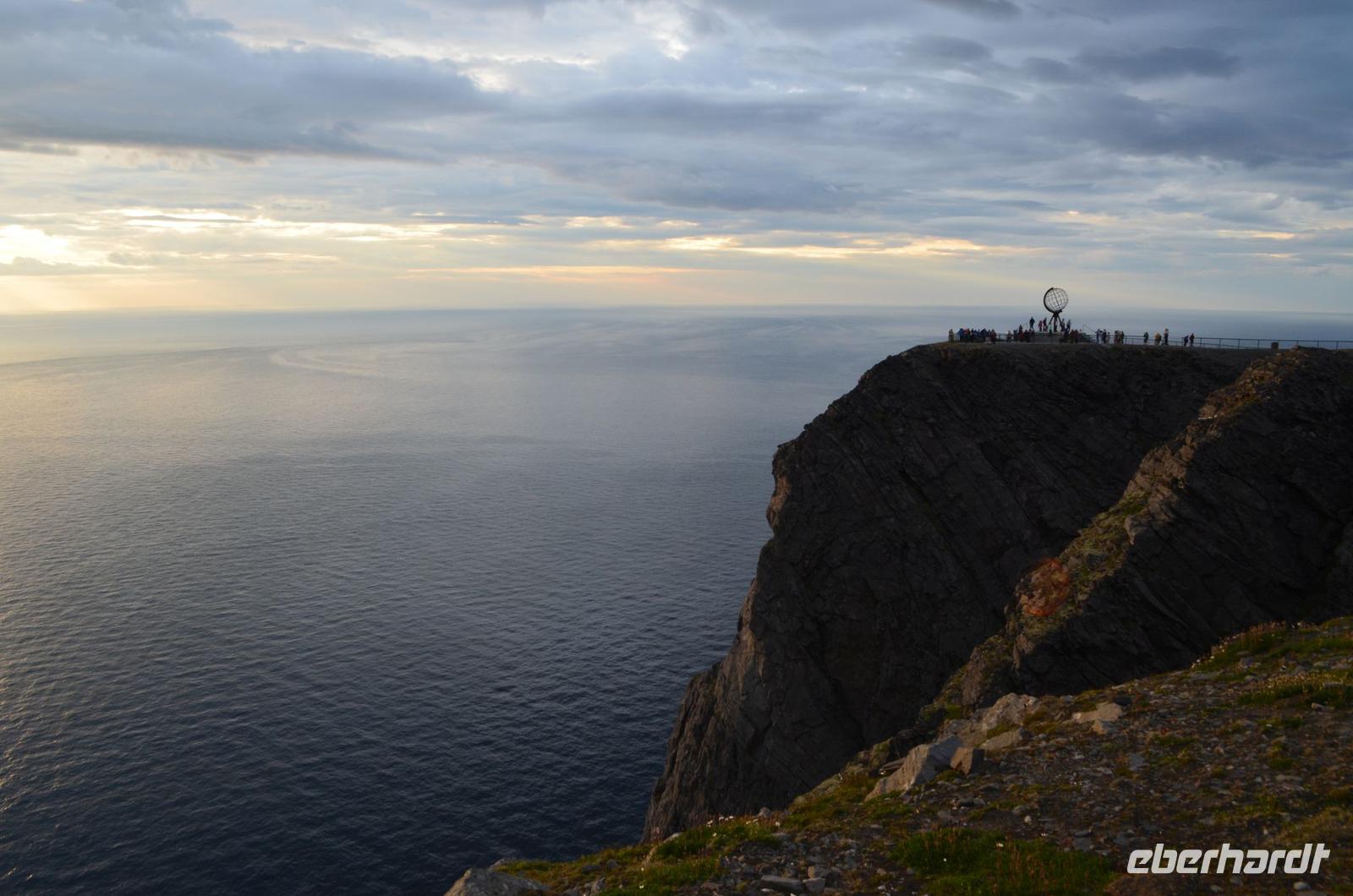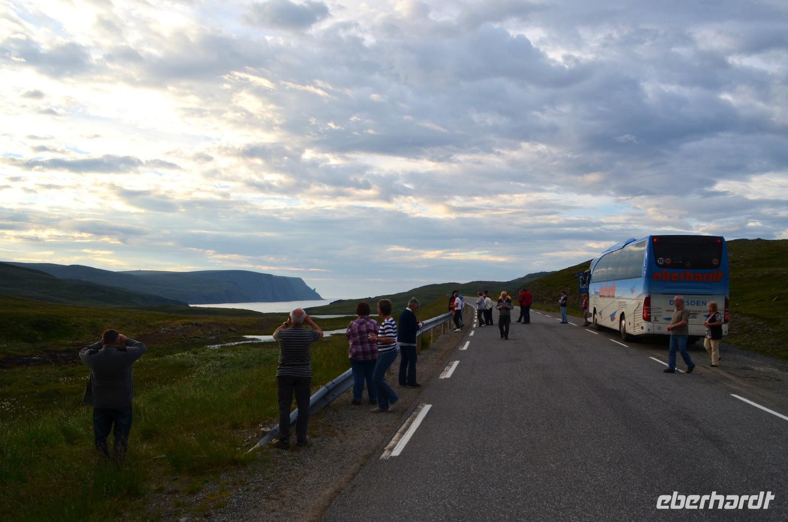Es ist 21 Uhr und 50 Minuten als unser Bus, jetzt mit dem Fahrer José Maria aus Barcelona vom Nordkapservice, die Hochfläche der Insel erreicht. Und die Sonne scheint, die Buchten spiegeln das Licht und wir fotografieren das Nordkaphorn. Am Nordkapcenter angekommen geht zuerst keiner in das Gebäude, sondern alle genießen den Ausblick von den Aussichtsterrassen.