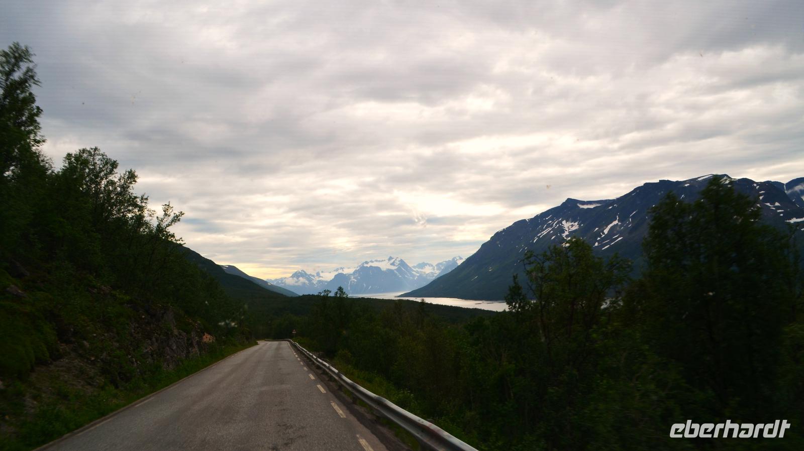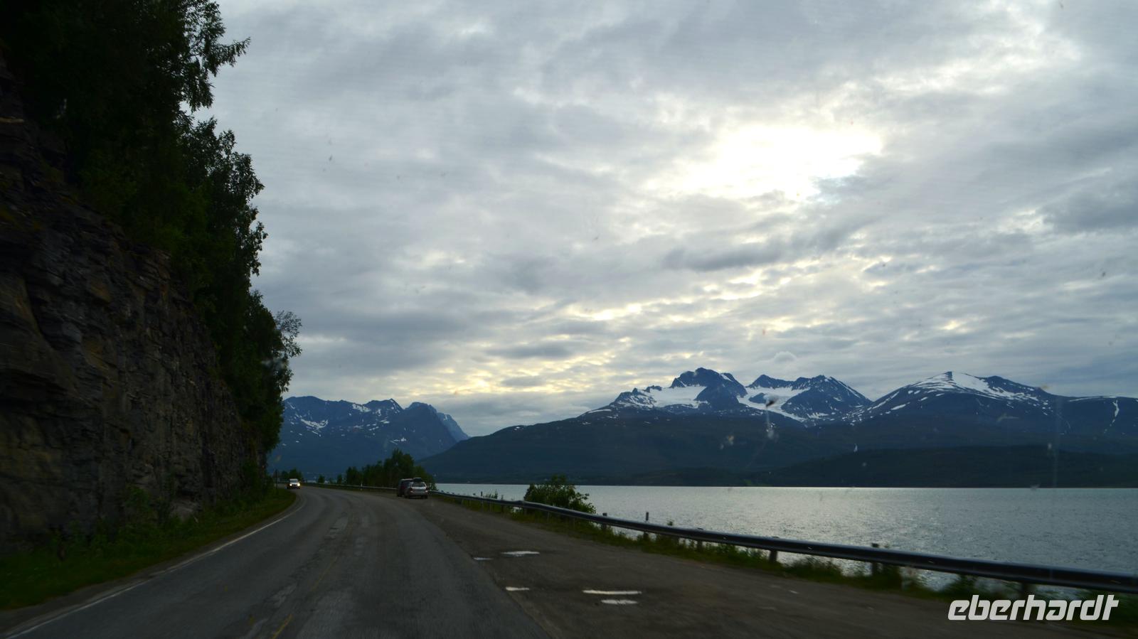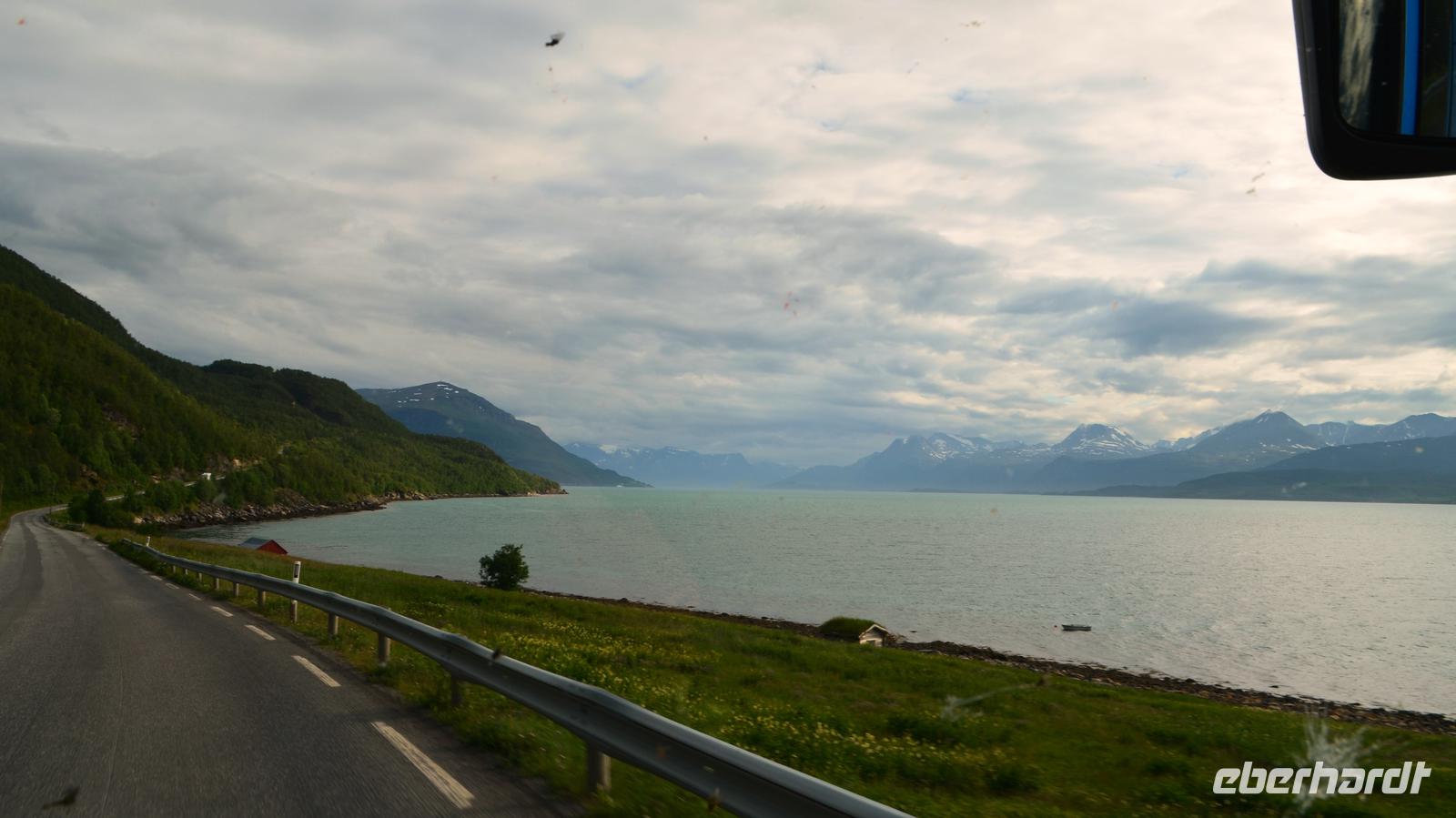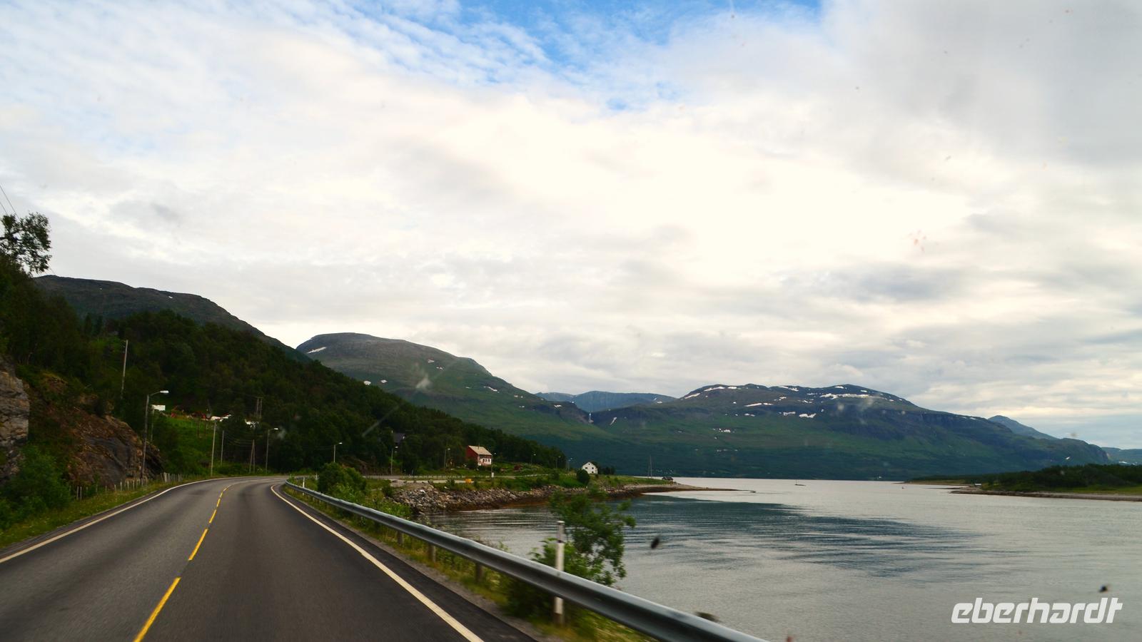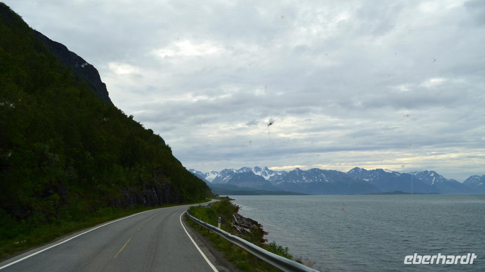 Die Landschaften am Kahfjord und am Langfjord, dann die schneebedeckten Lynger-Alpen über dem Lyngerfjord, deren Gletscher in der Sonne glänzen. Eine traumhaft schöne Fahrt.