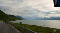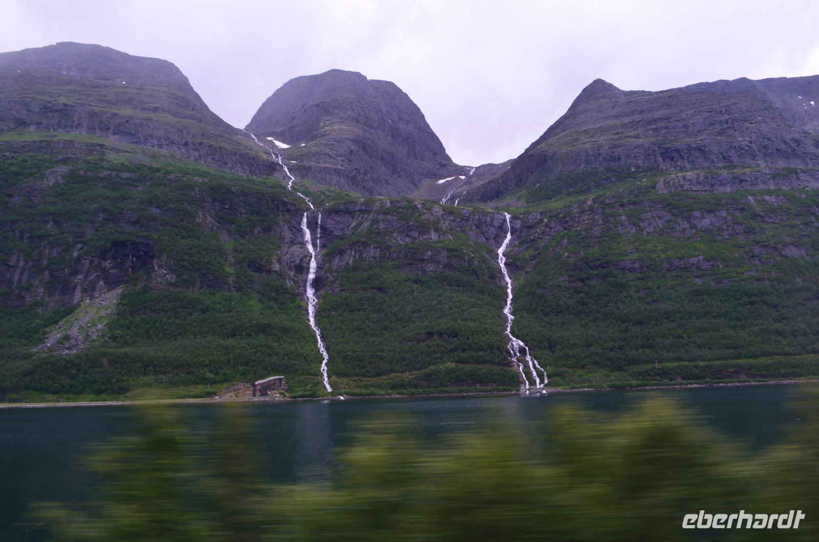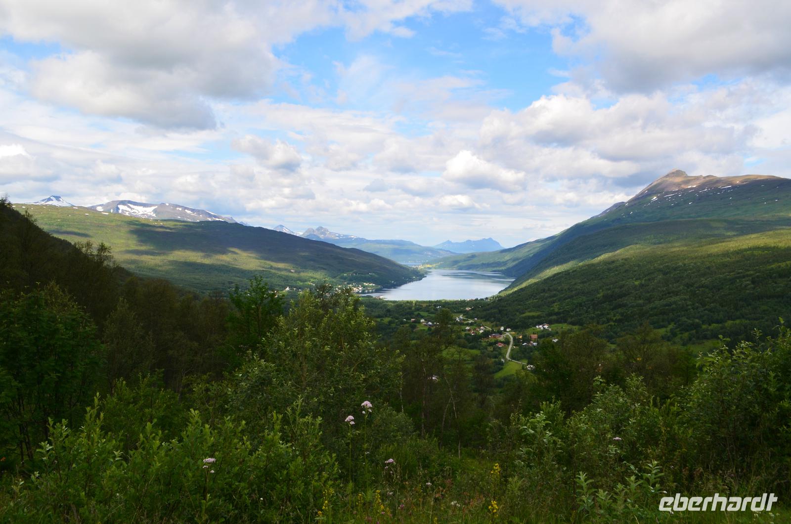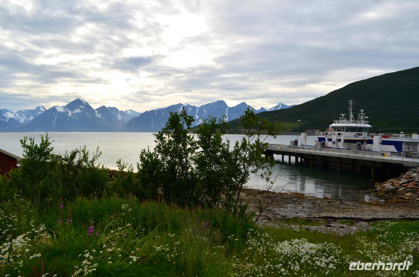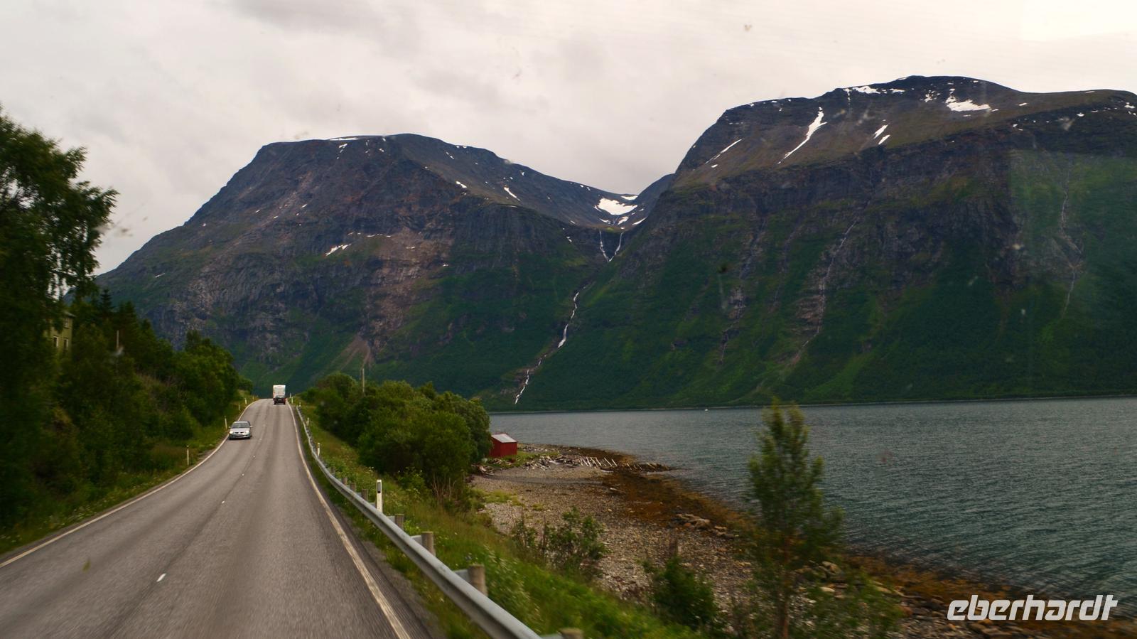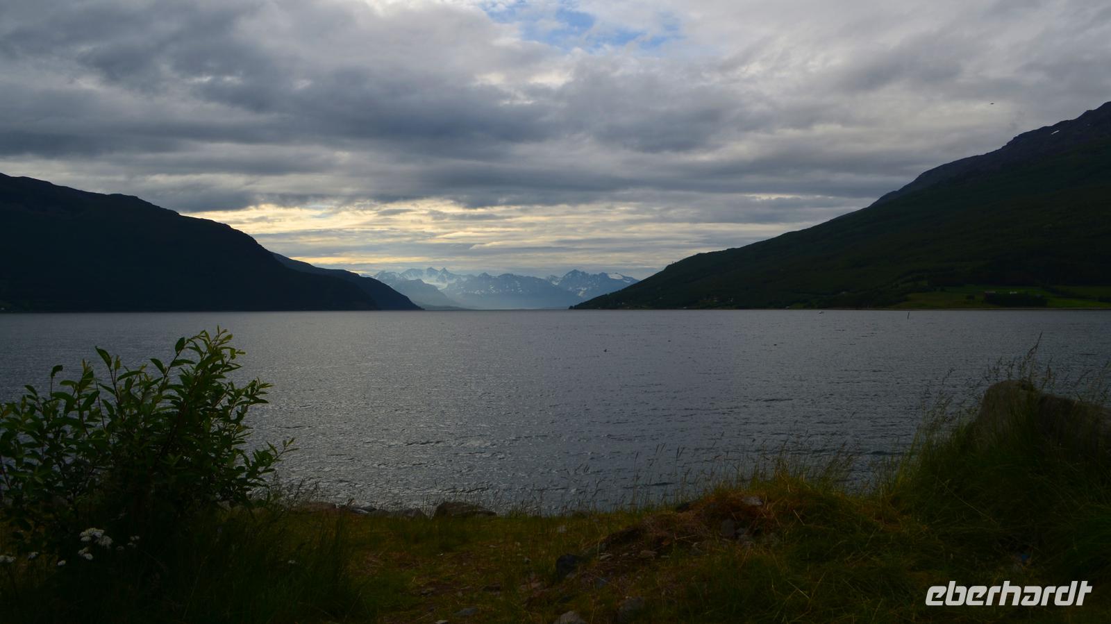 Die Landschaften am Kahfjord und am Langfjord, dann die schneebedeckten Lynger-Alpen über dem Lyngerfjord, deren Gletscher in der Sonne glänzen. Eine traumhaft schöne Fahrt.