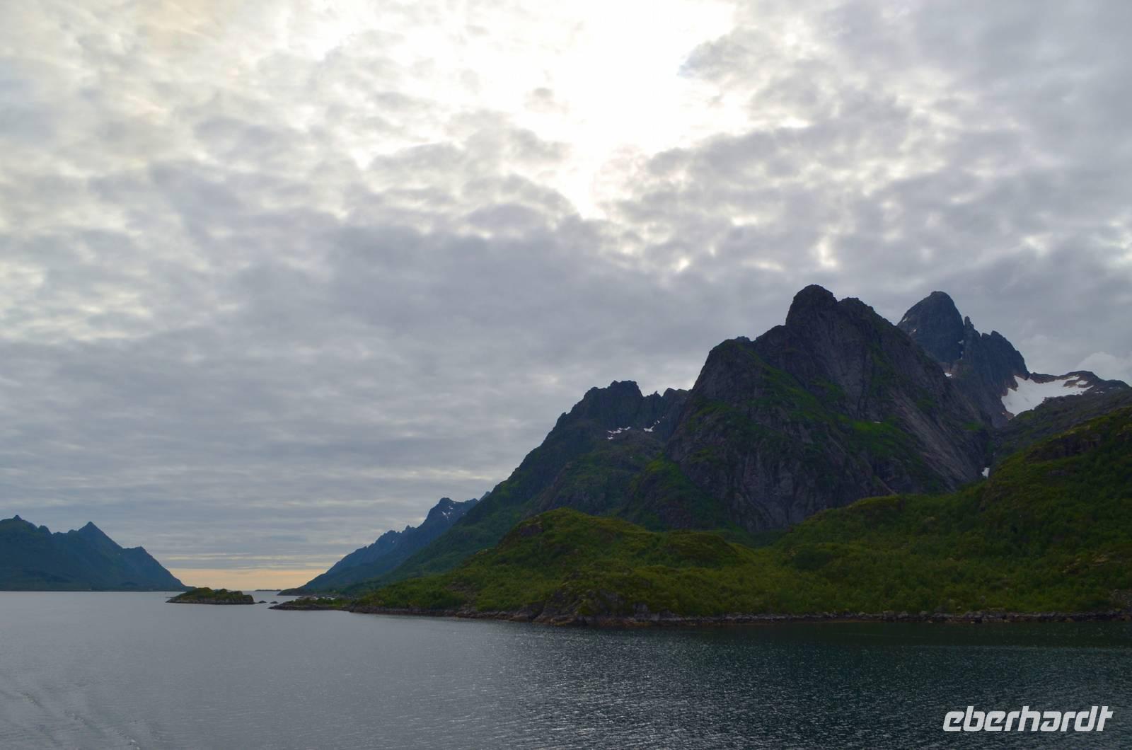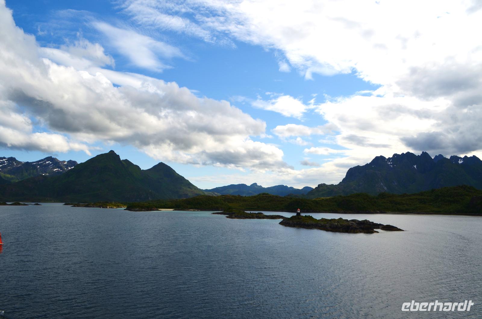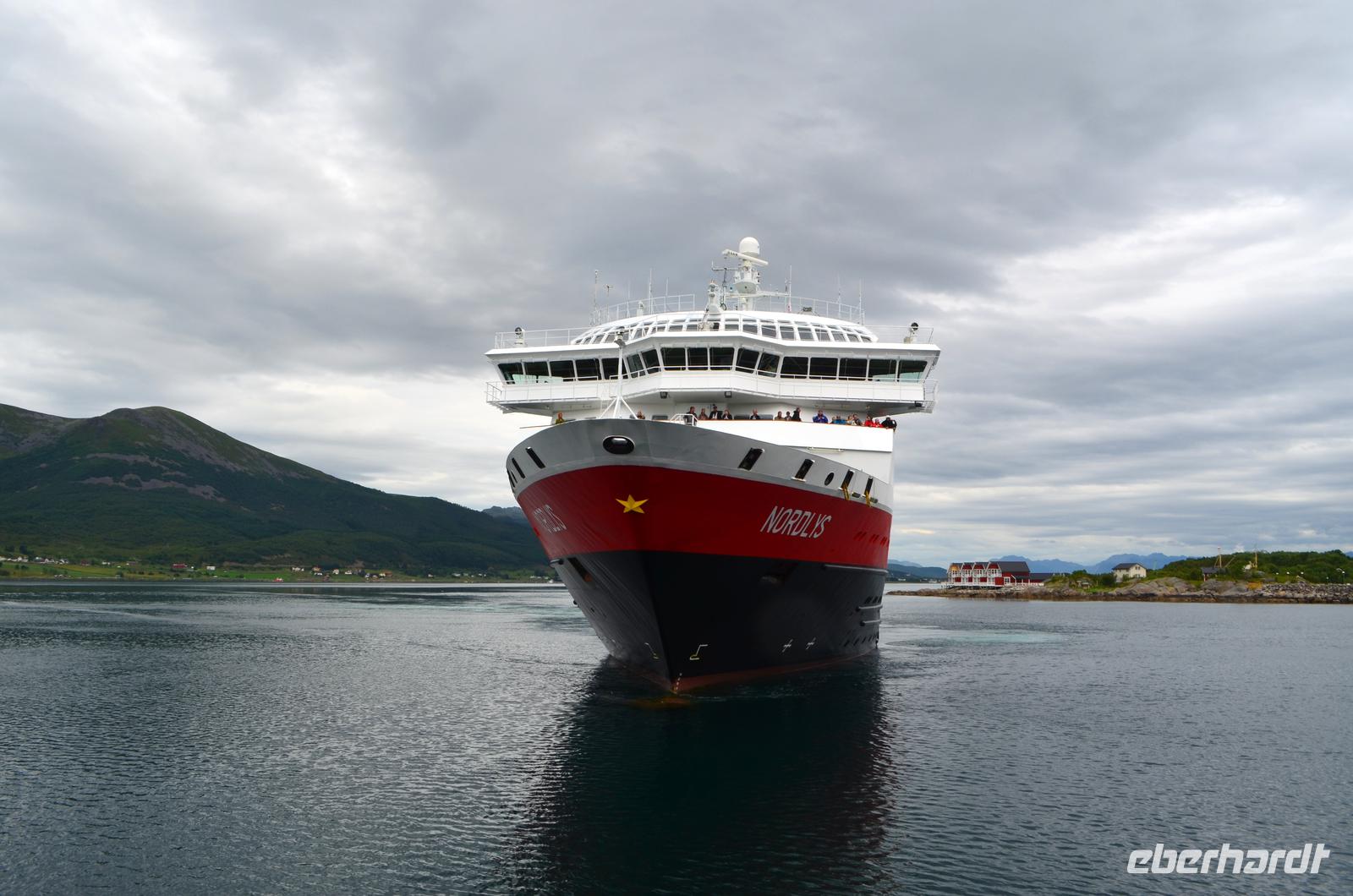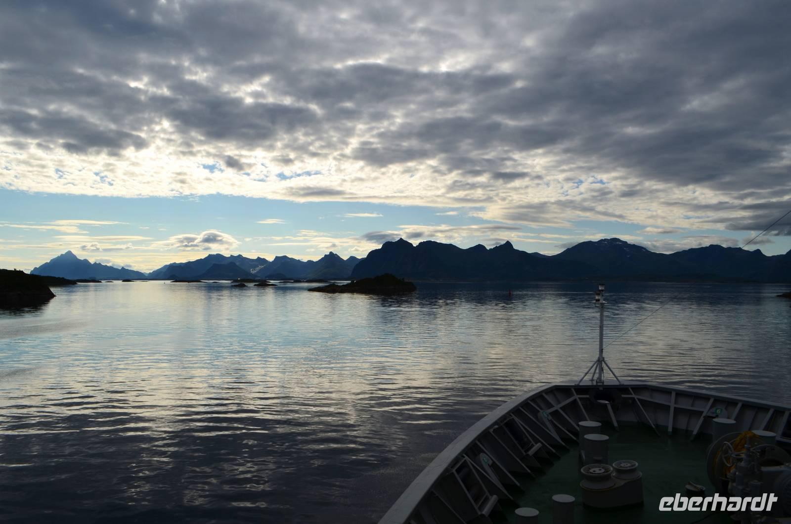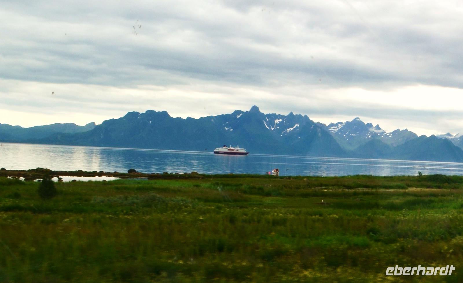 Am Morgen etwas Regen - aber die Sicht auf die grandiose Bergwelt ist frei. Wir fahren am Balsfjord vorbei, weiter durch die Berge und über die Fjelle von Troms gegenüber von Narvik am Ofotfjord entlang und dann - die Vesteralen mit Stockmarknes - dem Hurtigrutenmuseum und guter Sicht auf die Gipfelwelt der Vesteralen und der Lofoten. Unser Hurtigrutenschiff ist eines der modernen Flotte, die M/S „Nordlys" und sie steuert gerade den Hafen an, als wir ankommen. Damit können wir ihre Ankunft noch schön auf unseren Foto- und Filmgeräten festhalten. Der nächste Höhepunkt der Reise steht bevor - die schöne Fahrt durch den Raftsund, hinein in den engen Trollfjord und dann weiter durch die Inselwelt der Lofoten bis Svolvær - herrlicher Sonnenschein jetzt und die Fahrt einfach unbeschreiblich schön.