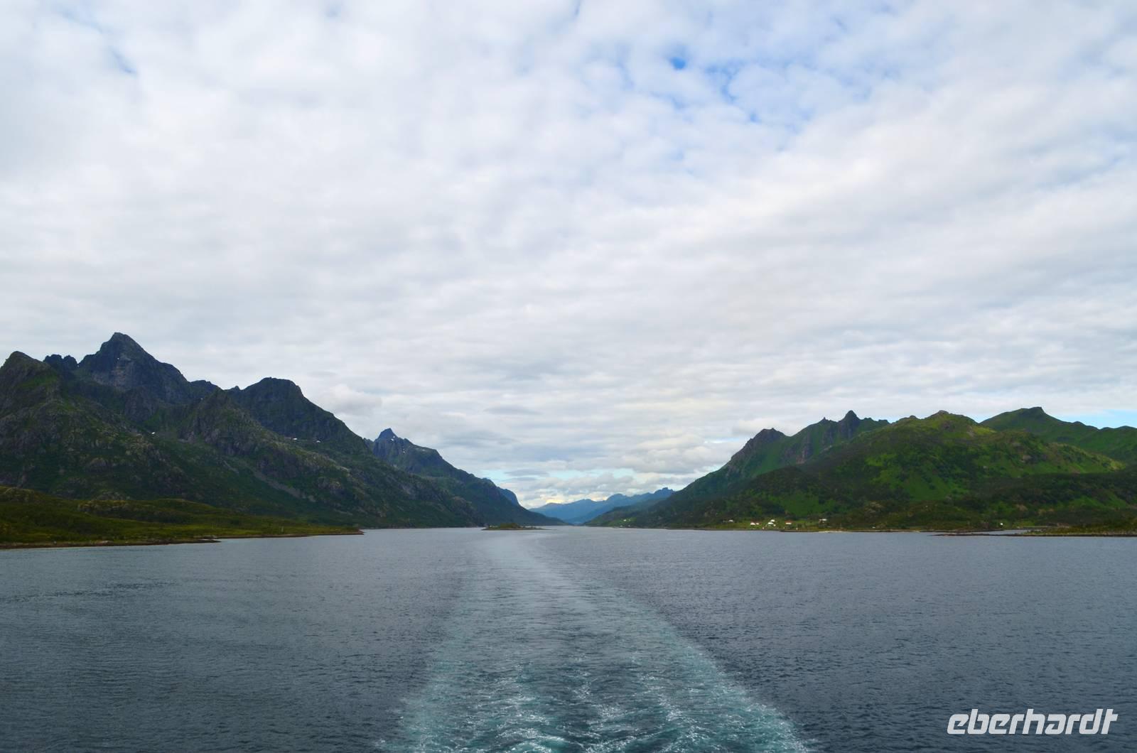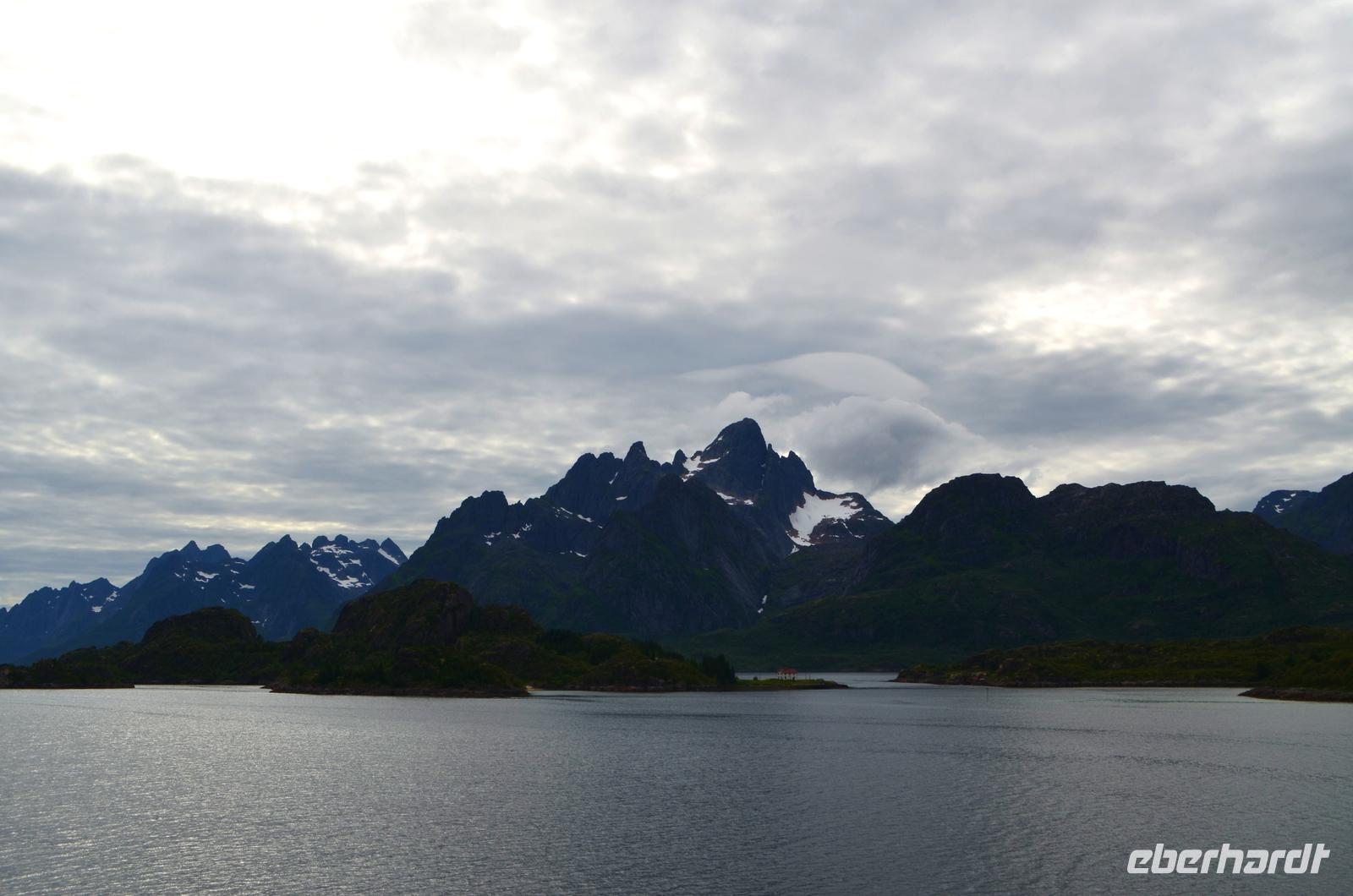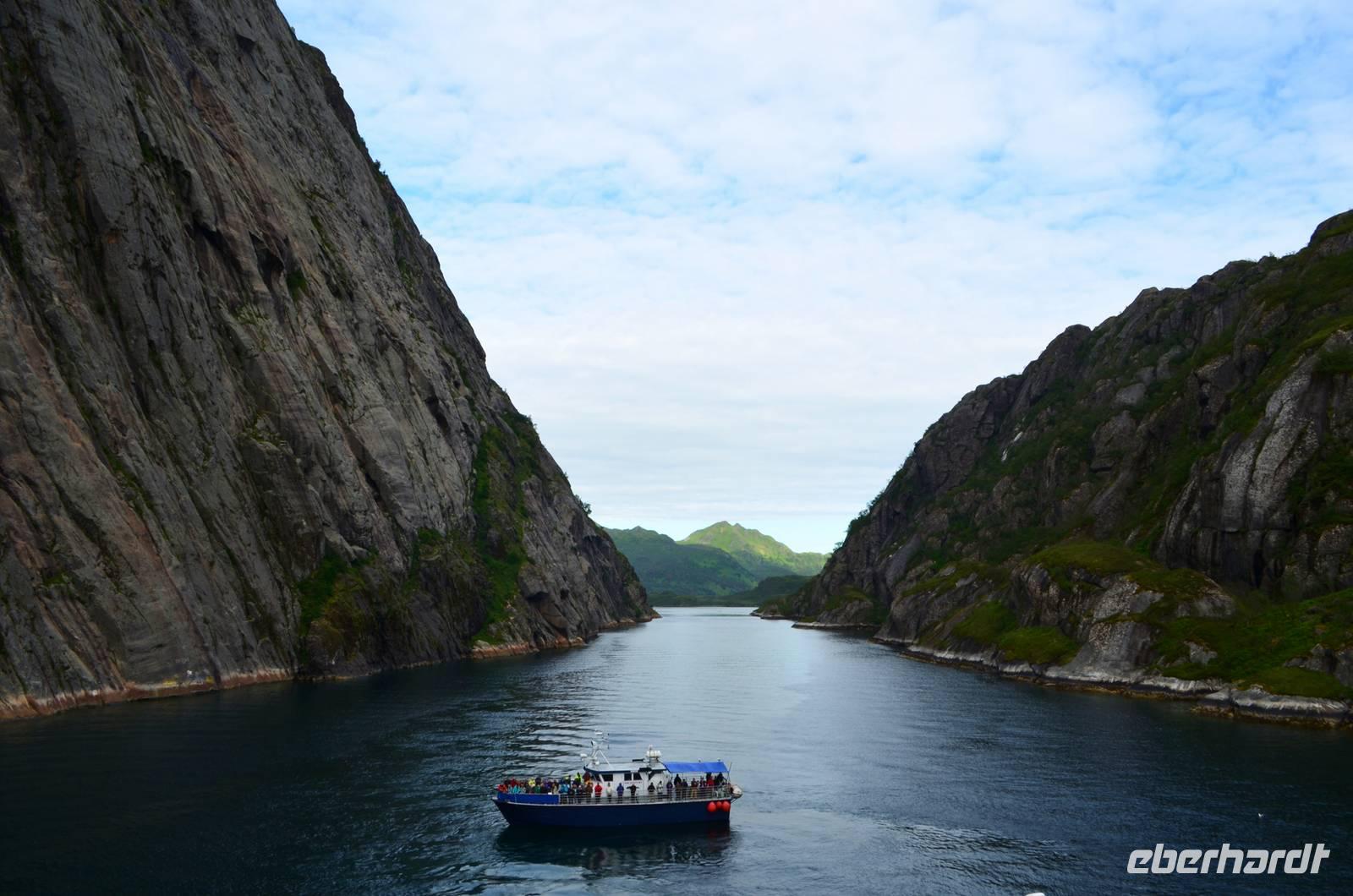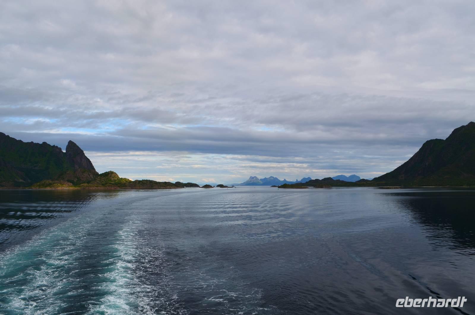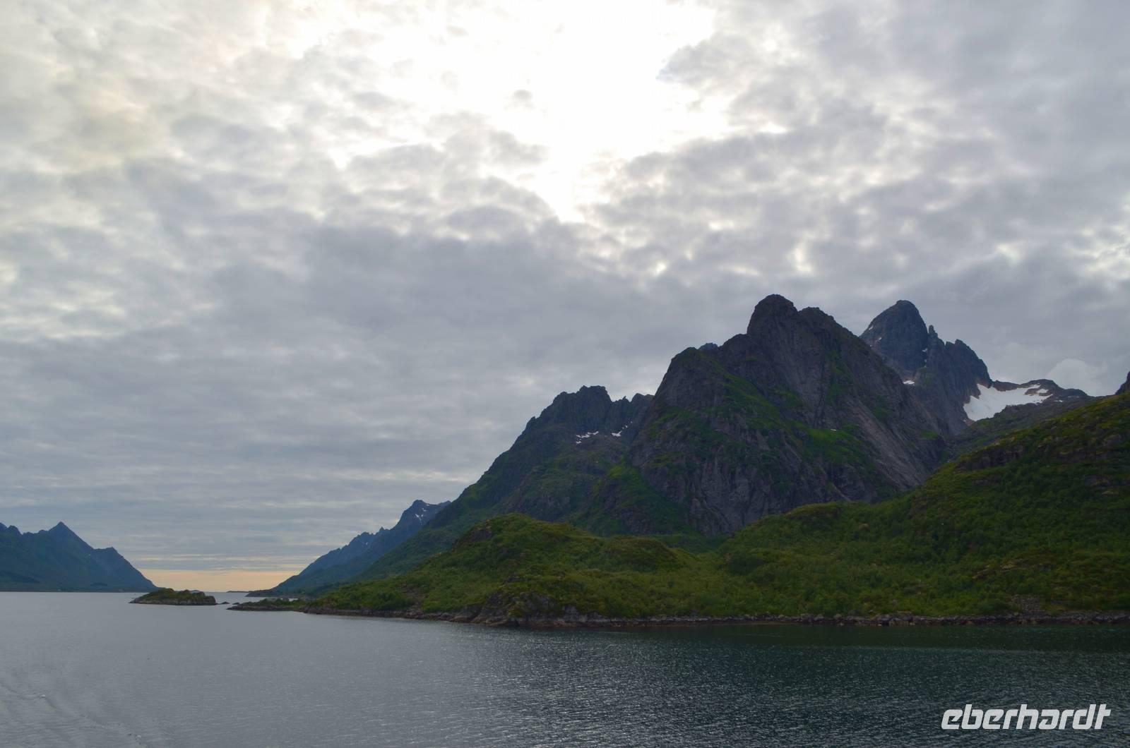 Am Morgen etwas Regen - aber die Sicht auf die grandiose Bergwelt ist frei. Wir fahren am Balsfjord vorbei, weiter durch die Berge und über die Fjelle von Troms gegenüber von Narvik am Ofotfjord entlang und dann - die Vesteralen mit Stockmarknes - dem Hurtigrutenmuseum und guter Sicht auf die Gipfelwelt der Vesteralen und der Lofoten. Unser Hurtigrutenschiff ist eines der modernen Flotte, die M/S „Nordlys" und sie steuert gerade den Hafen an, als wir ankommen. Damit können wir ihre Ankunft noch schön auf unseren Foto- und Filmgeräten festhalten. Der nächste Höhepunkt der Reise steht bevor - die schöne Fahrt durch den Raftsund, hinein in den engen Trollfjord und dann weiter durch die Inselwelt der Lofoten bis Svolvær - herrlicher Sonnenschein jetzt und die Fahrt einfach unbeschreiblich schön.