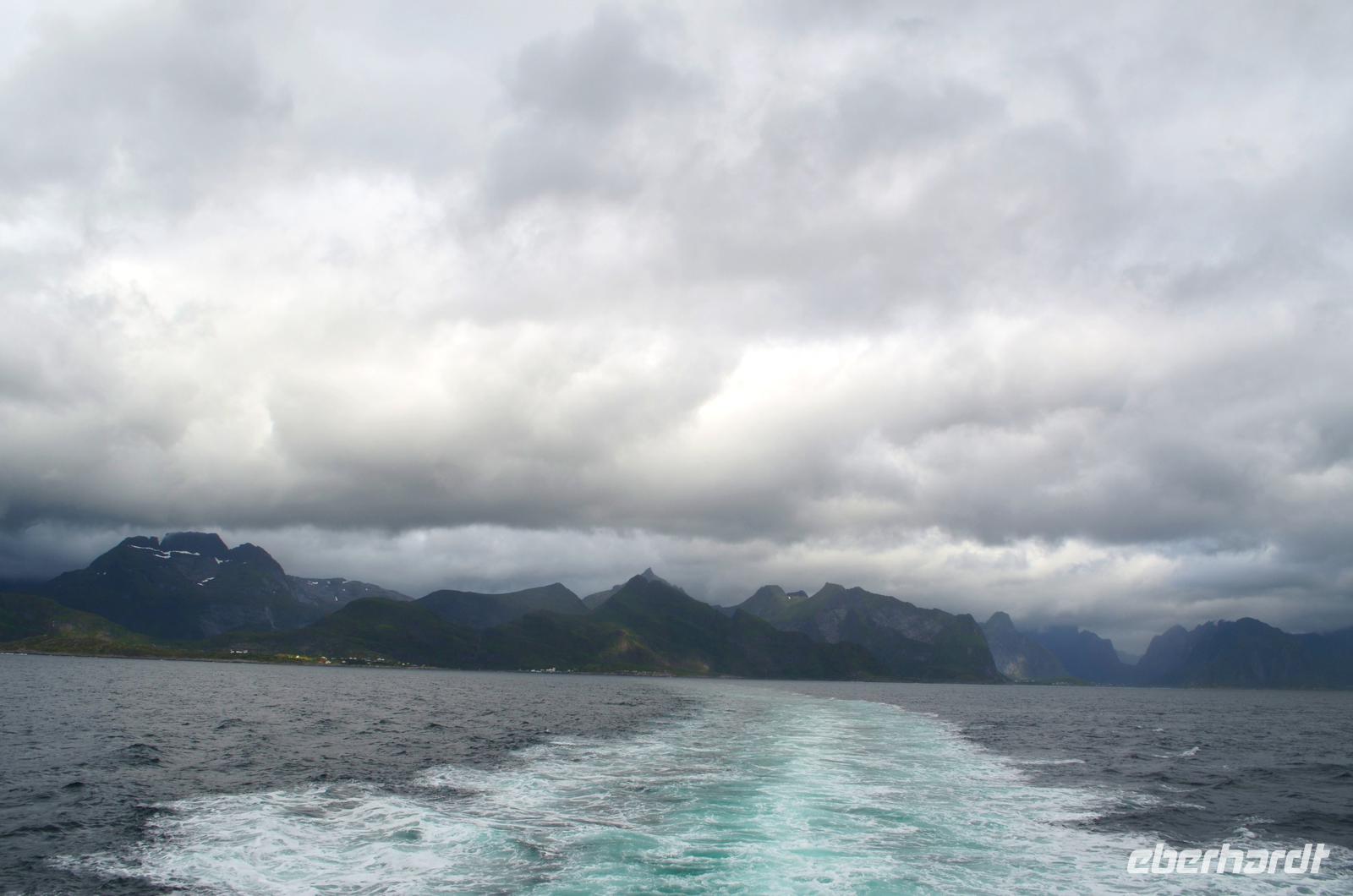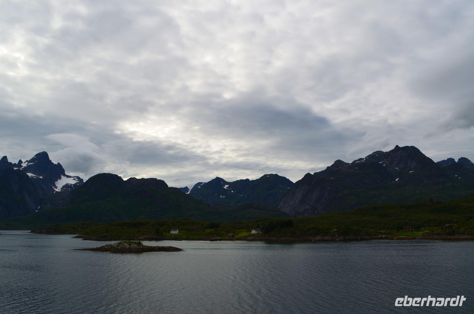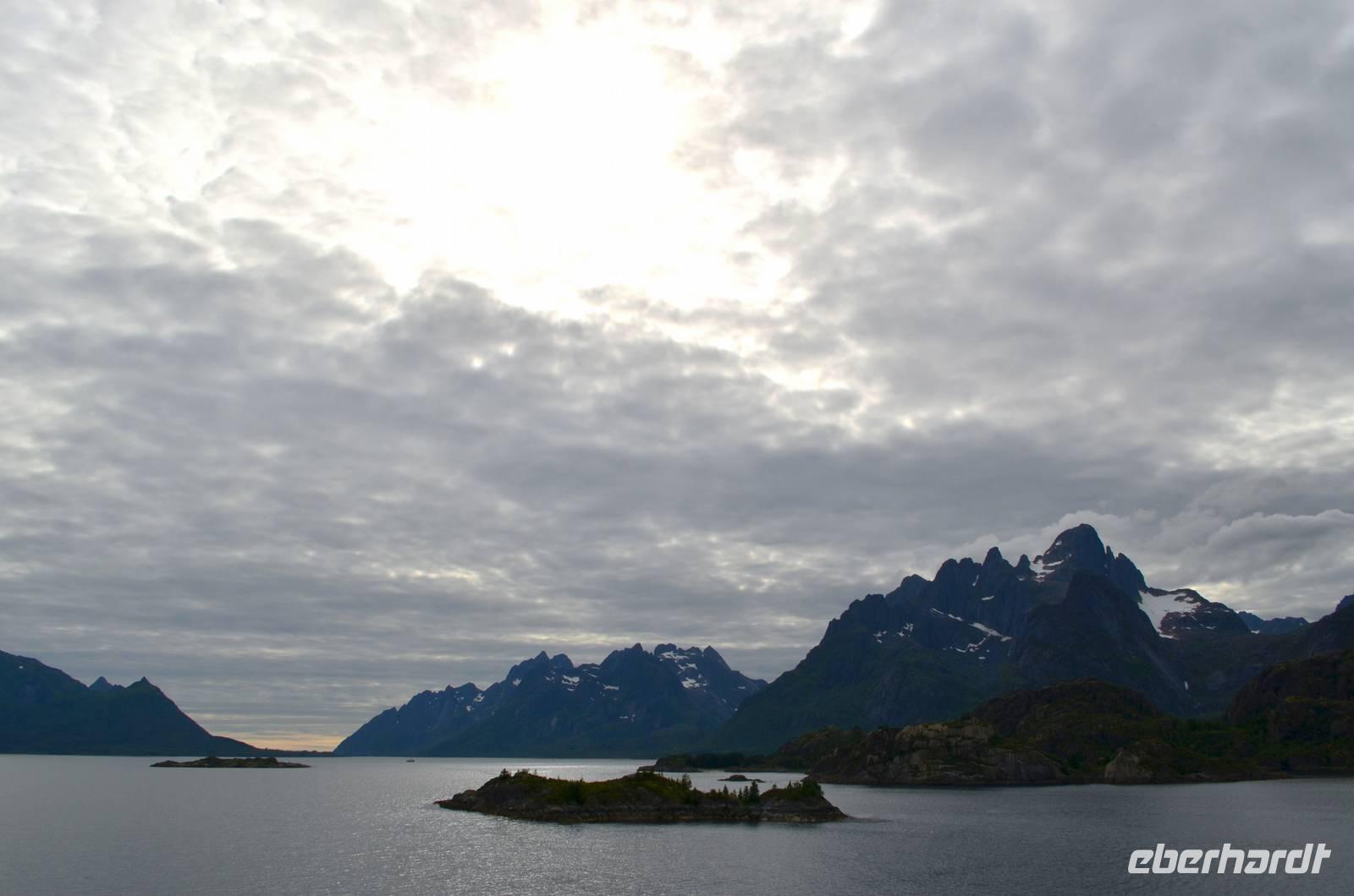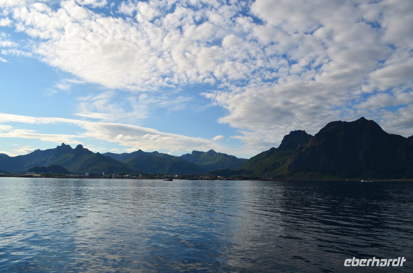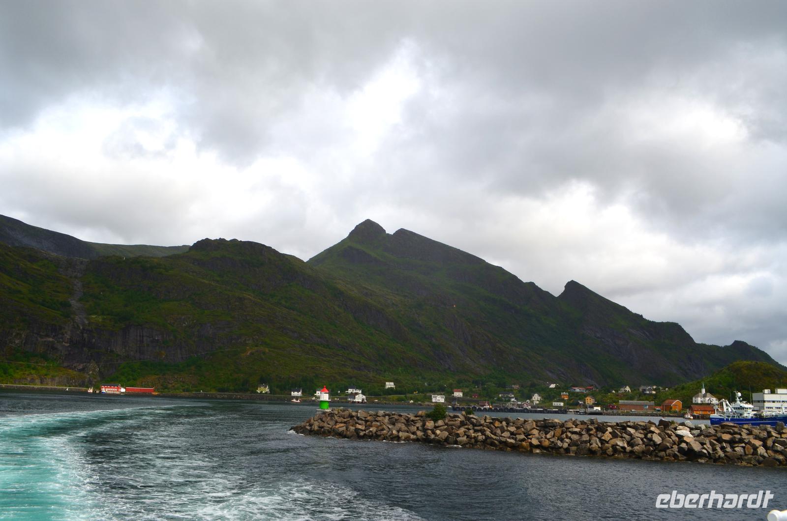 Am Morgen etwas Regen - aber die Sicht auf die grandiose Bergwelt ist frei. Wir fahren am Balsfjord vorbei, weiter durch die Berge und über die Fjelle von Troms gegenüber von Narvik am Ofotfjord entlang und dann - die Vesteralen mit Stockmarknes - dem Hurtigrutenmuseum und guter Sicht auf die Gipfelwelt der Vesteralen und der Lofoten. Unser Hurtigrutenschiff ist eines der modernen Flotte, die M/S „Nordlys" und sie steuert gerade den Hafen an, als wir ankommen. Damit können wir ihre Ankunft noch schön auf unseren Foto- und Filmgeräten festhalten. Der nächste Höhepunkt der Reise steht bevor - die schöne Fahrt durch den Raftsund, hinein in den engen Trollfjord und dann weiter durch die Inselwelt der Lofoten bis Svolvær - herrlicher Sonnenschein jetzt und die Fahrt einfach unbeschreiblich schön.