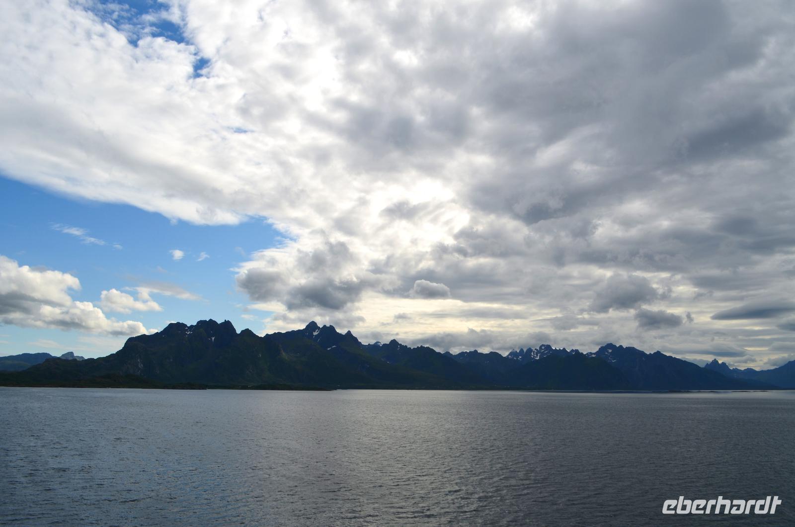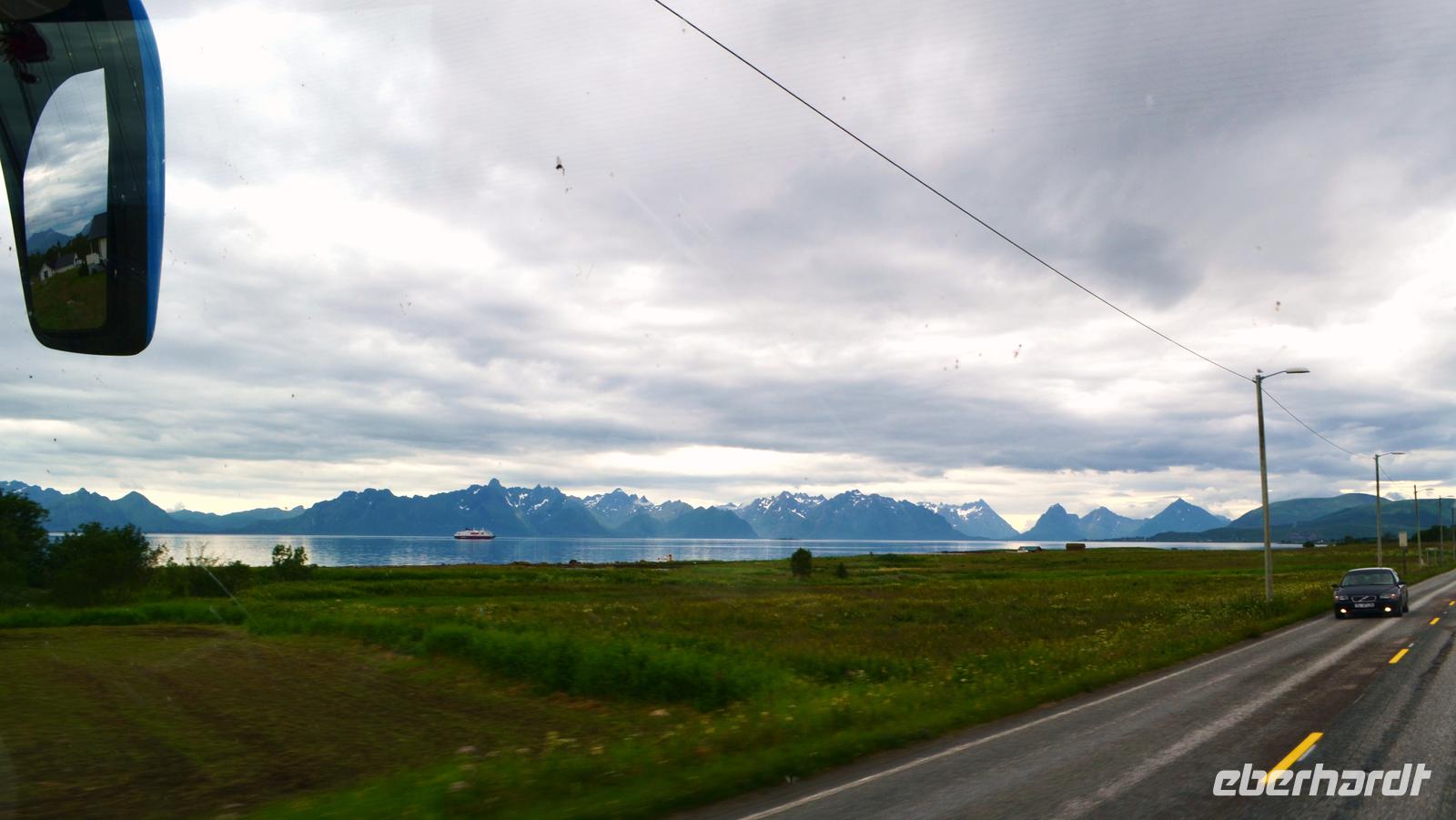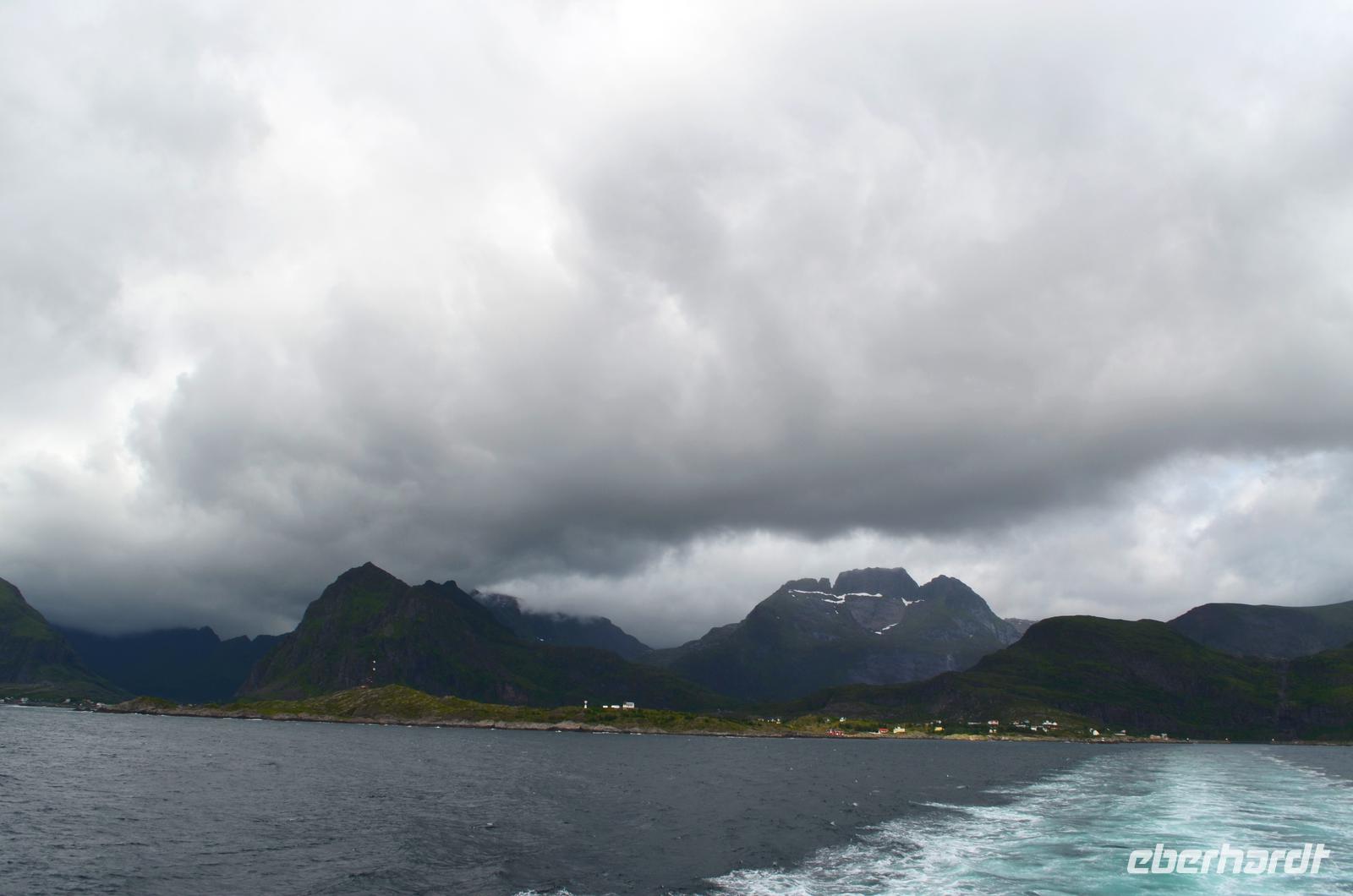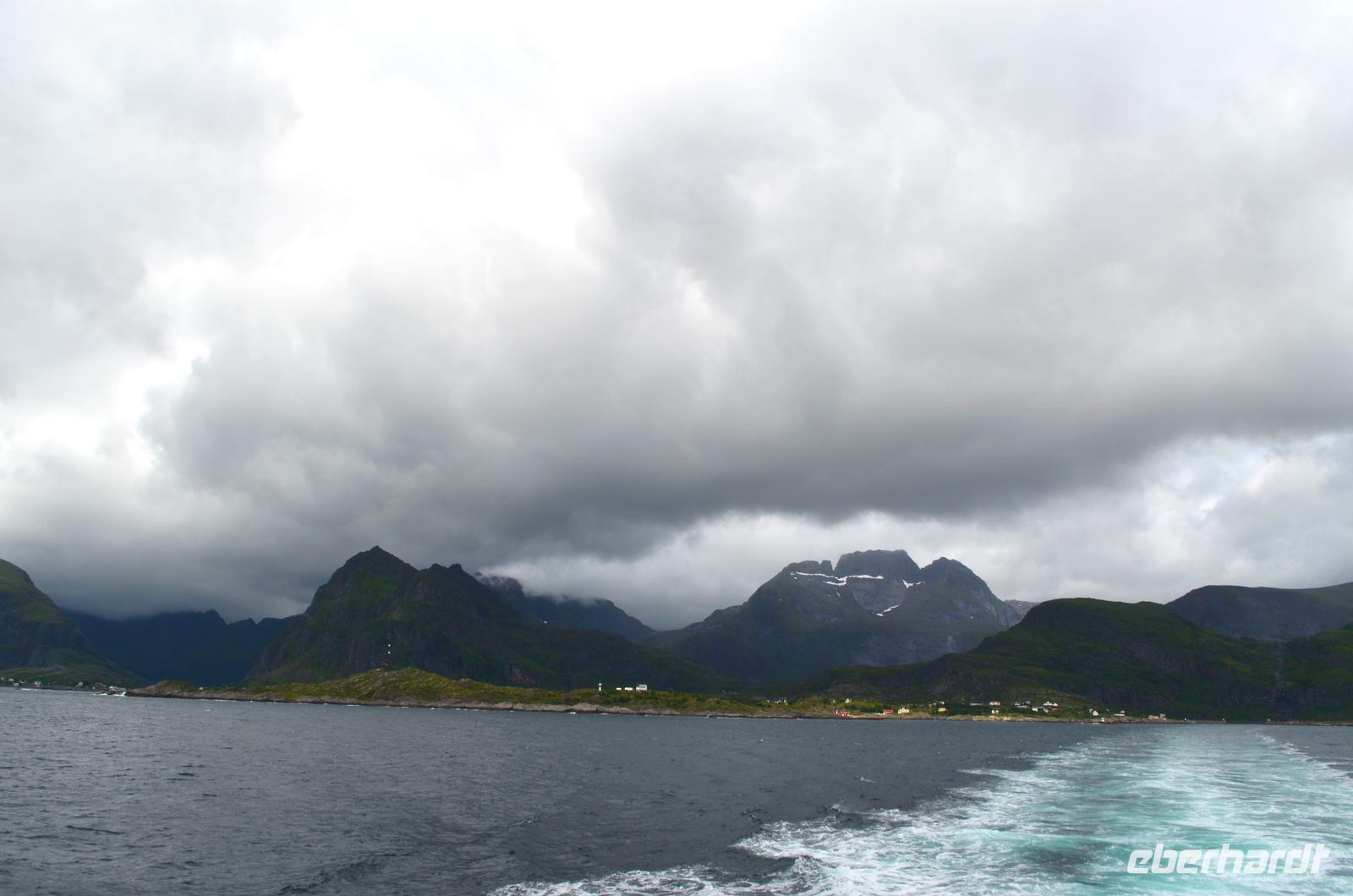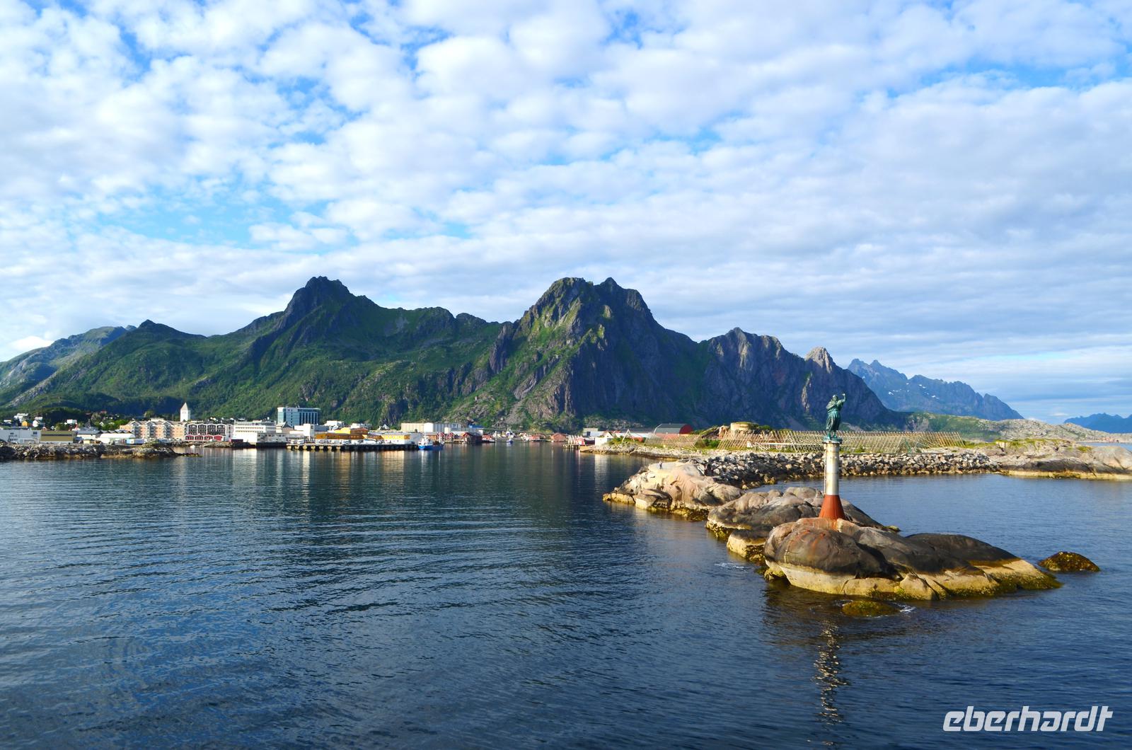 Am Morgen etwas Regen - aber die Sicht auf die grandiose Bergwelt ist frei. Wir fahren am Balsfjord vorbei, weiter durch die Berge und über die Fjelle von Troms gegenüber von Narvik am Ofotfjord entlang und dann - die Vesteralen mit Stockmarknes - dem Hurtigrutenmuseum und guter Sicht auf die Gipfelwelt der Vesteralen und der Lofoten. Unser Hurtigrutenschiff ist eines der modernen Flotte, die M/S „Nordlys" und sie steuert gerade den Hafen an, als wir ankommen. Damit können wir ihre Ankunft noch schön auf unseren Foto- und Filmgeräten festhalten. Der nächste Höhepunkt der Reise steht bevor - die schöne Fahrt durch den Raftsund, hinein in den engen Trollfjord und dann weiter durch die Inselwelt der Lofoten bis Svolvær - herrlicher Sonnenschein jetzt und die Fahrt einfach unbeschreiblich schön.