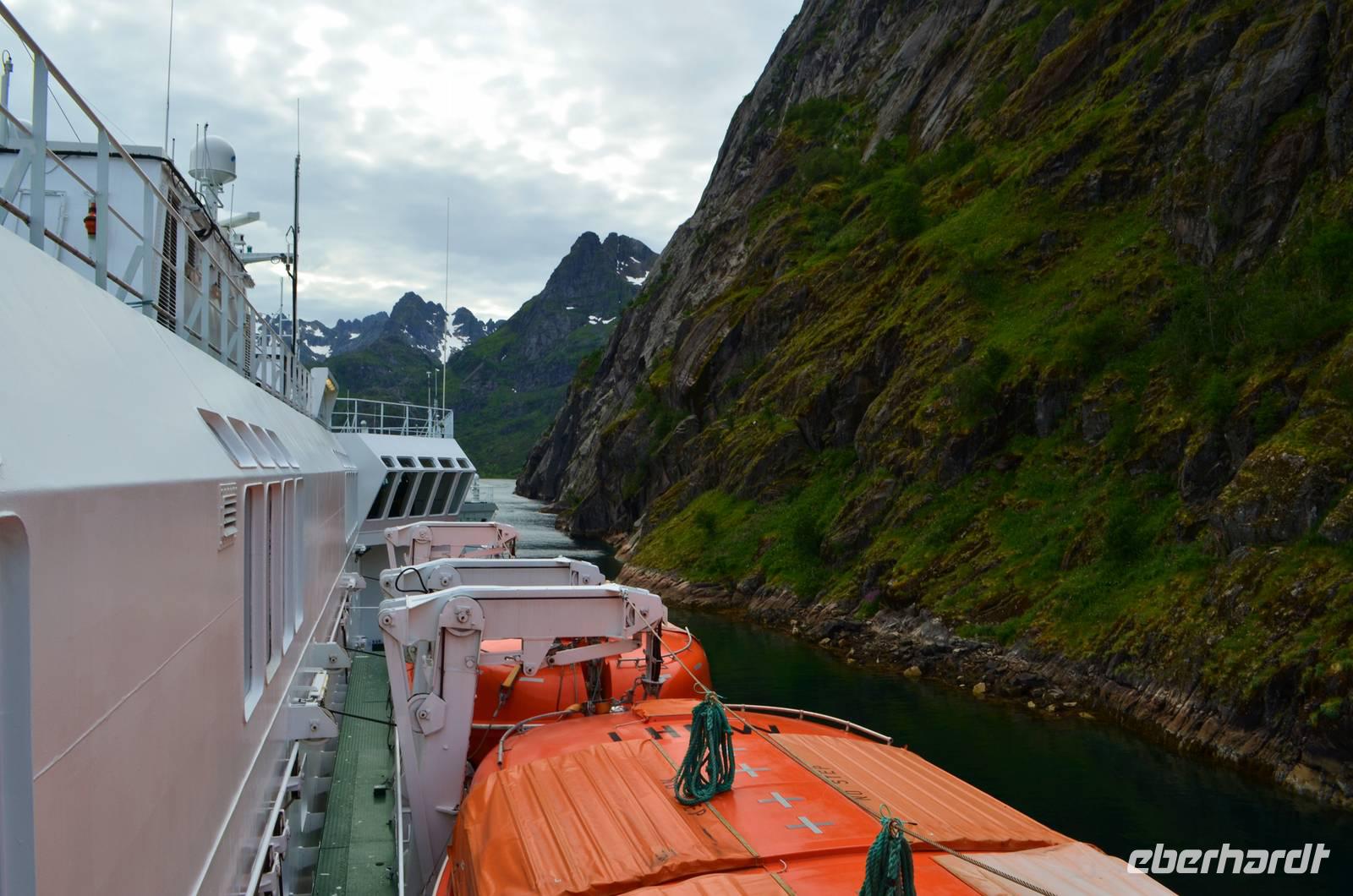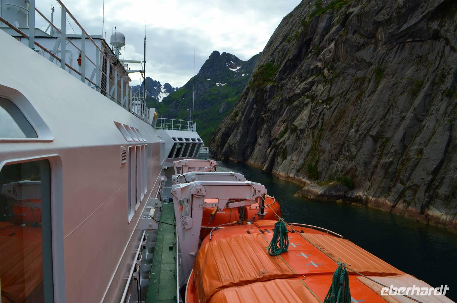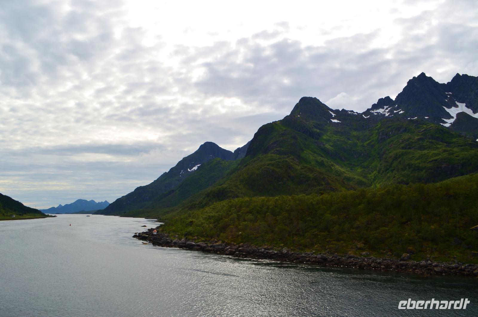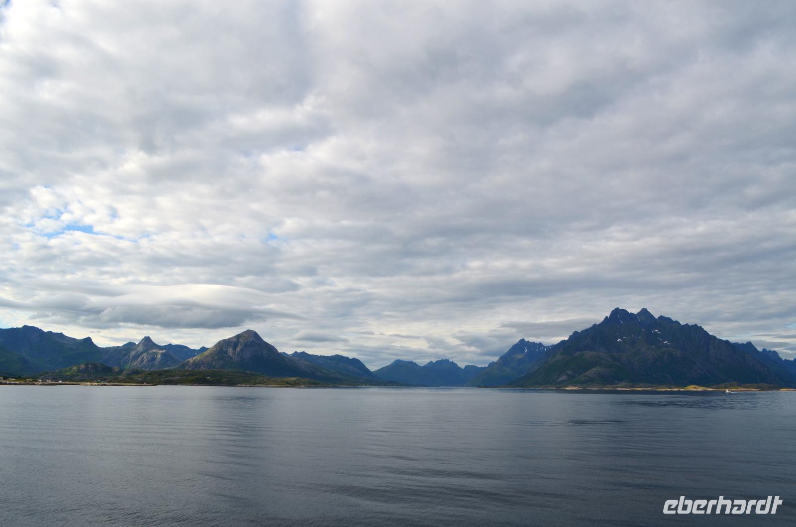 Am Morgen etwas Regen - aber die Sicht auf die grandiose Bergwelt ist frei. Wir fahren am Balsfjord vorbei, weiter durch die Berge und über die Fjelle von Troms gegenüber von Narvik am Ofotfjord entlang und dann - die Vesteralen mit Stockmarknes - dem Hurtigrutenmuseum und guter Sicht auf die Gipfelwelt der Vesteralen und der Lofoten. Unser Hurtigrutenschiff ist eines der modernen Flotte, die M/S „Nordlys" und sie steuert gerade den Hafen an, als wir ankommen. Damit können wir ihre Ankunft noch schön auf unseren Foto- und Filmgeräten festhalten. Der nächste Höhepunkt der Reise steht bevor - die schöne Fahrt durch den Raftsund, hinein in den engen Trollfjord und dann weiter durch die Inselwelt der Lofoten bis Svolvær - herrlicher Sonnenschein jetzt und die Fahrt einfach unbeschreiblich schön.