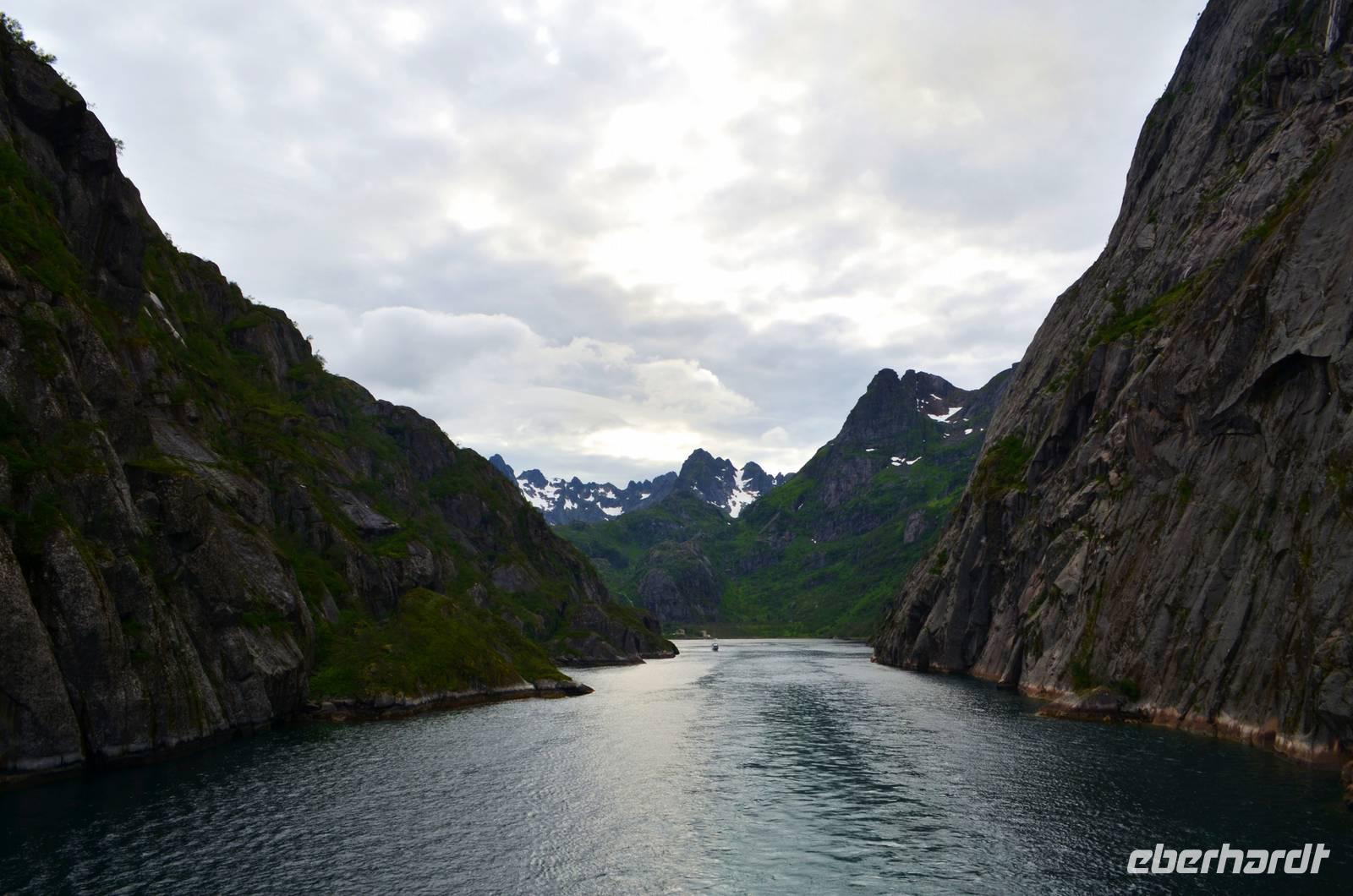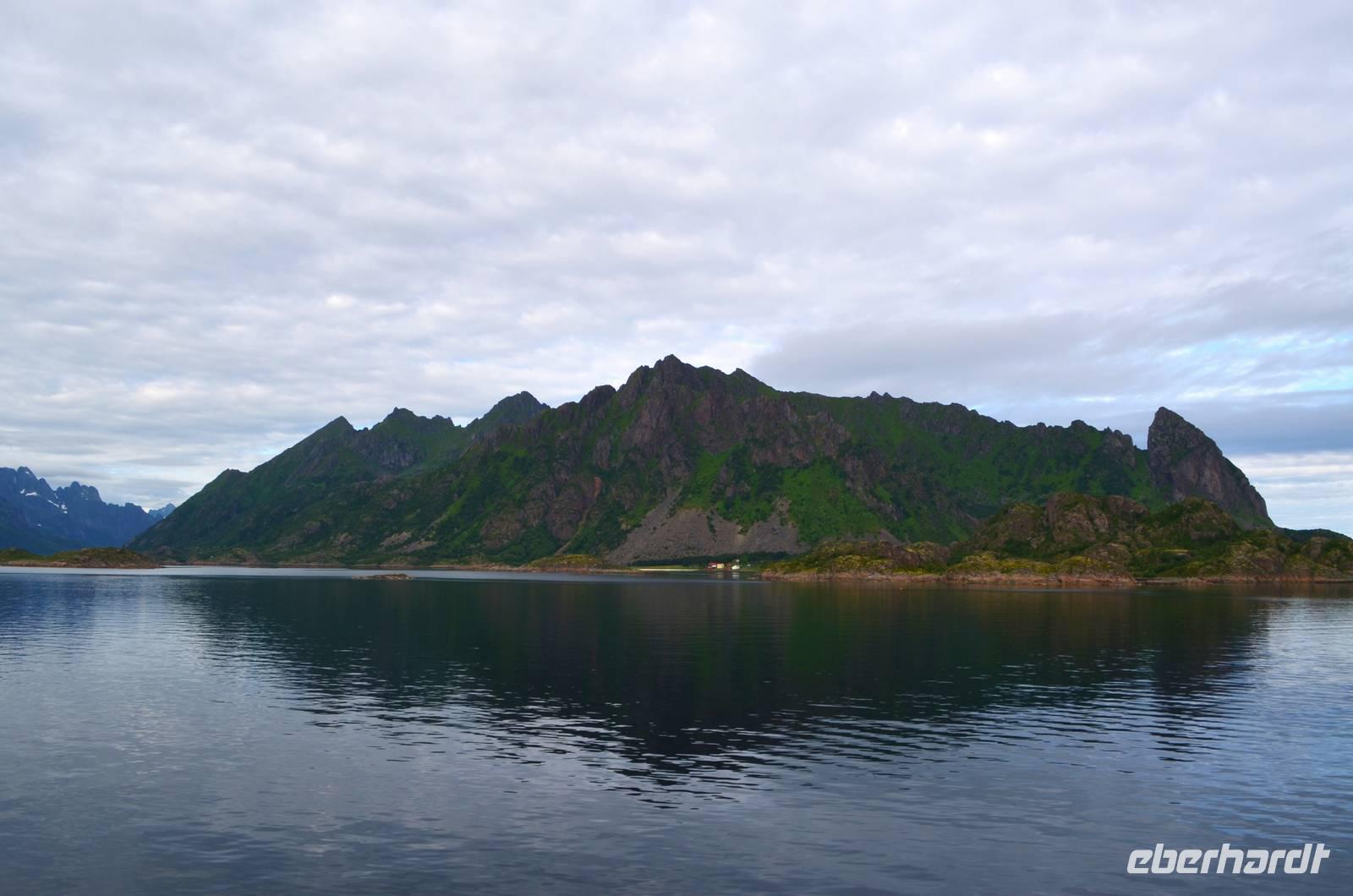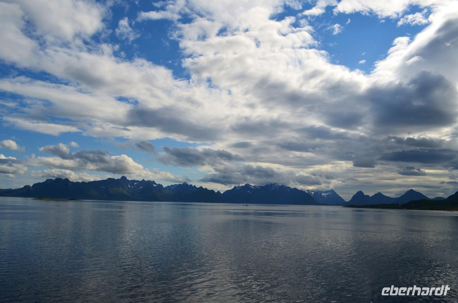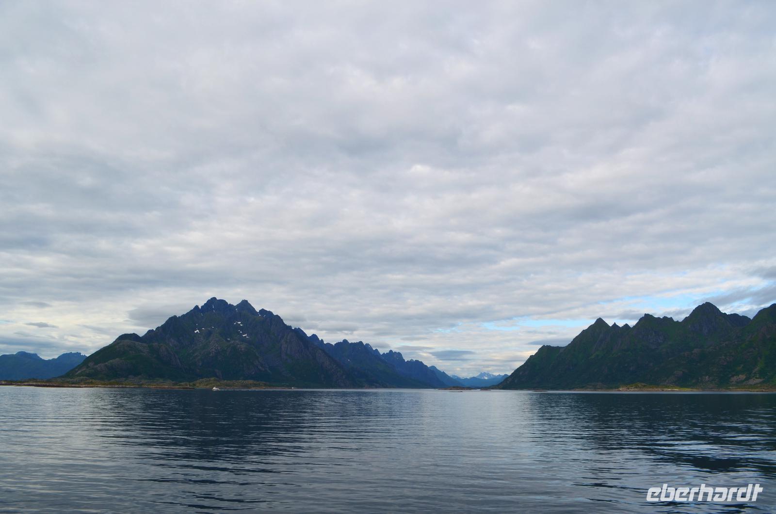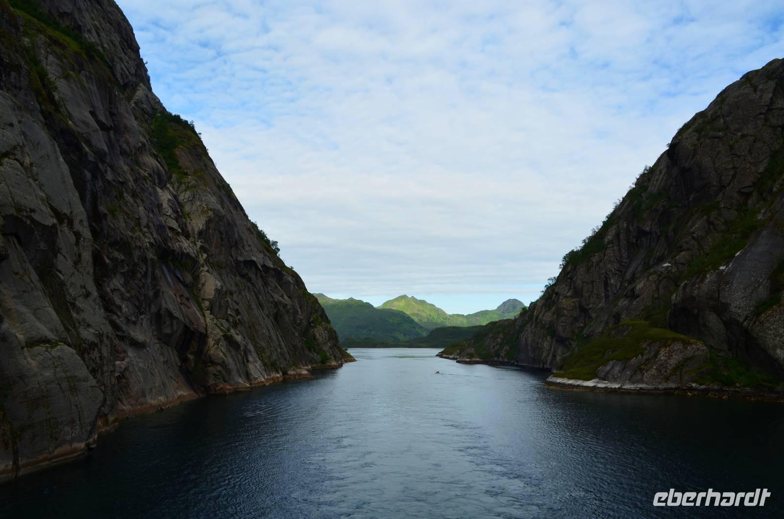 Am Morgen etwas Regen - aber die Sicht auf die grandiose Bergwelt ist frei. Wir fahren am Balsfjord vorbei, weiter durch die Berge und über die Fjelle von Troms gegenüber von Narvik am Ofotfjord entlang und dann - die Vesteralen mit Stockmarknes - dem Hurtigrutenmuseum und guter Sicht auf die Gipfelwelt der Vesteralen und der Lofoten. Unser Hurtigrutenschiff ist eines der modernen Flotte, die M/S „Nordlys" und sie steuert gerade den Hafen an, als wir ankommen. Damit können wir ihre Ankunft noch schön auf unseren Foto- und Filmgeräten festhalten. Der nächste Höhepunkt der Reise steht bevor - die schöne Fahrt durch den Raftsund, hinein in den engen Trollfjord und dann weiter durch die Inselwelt der Lofoten bis Svolvær - herrlicher Sonnenschein jetzt und die Fahrt einfach unbeschreiblich schön.