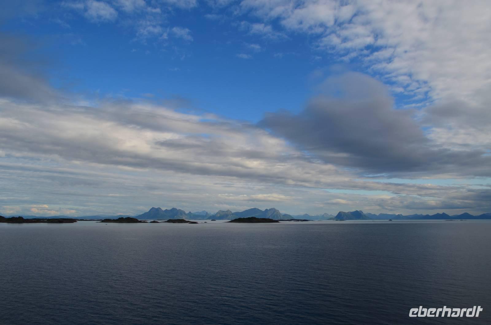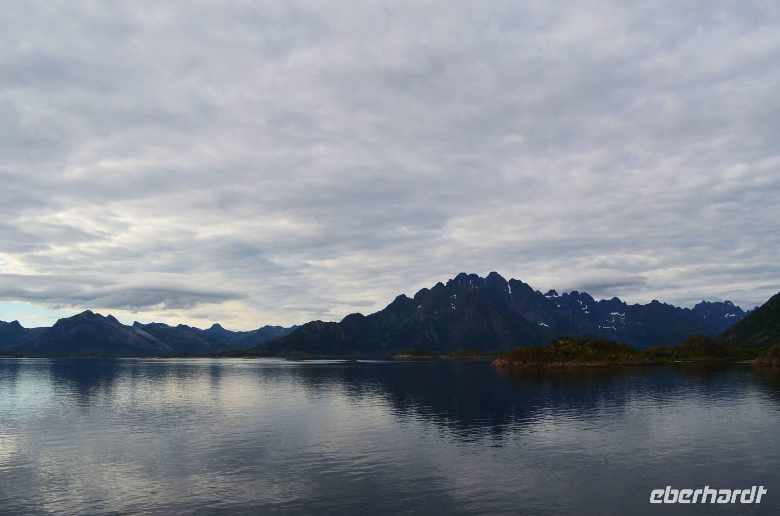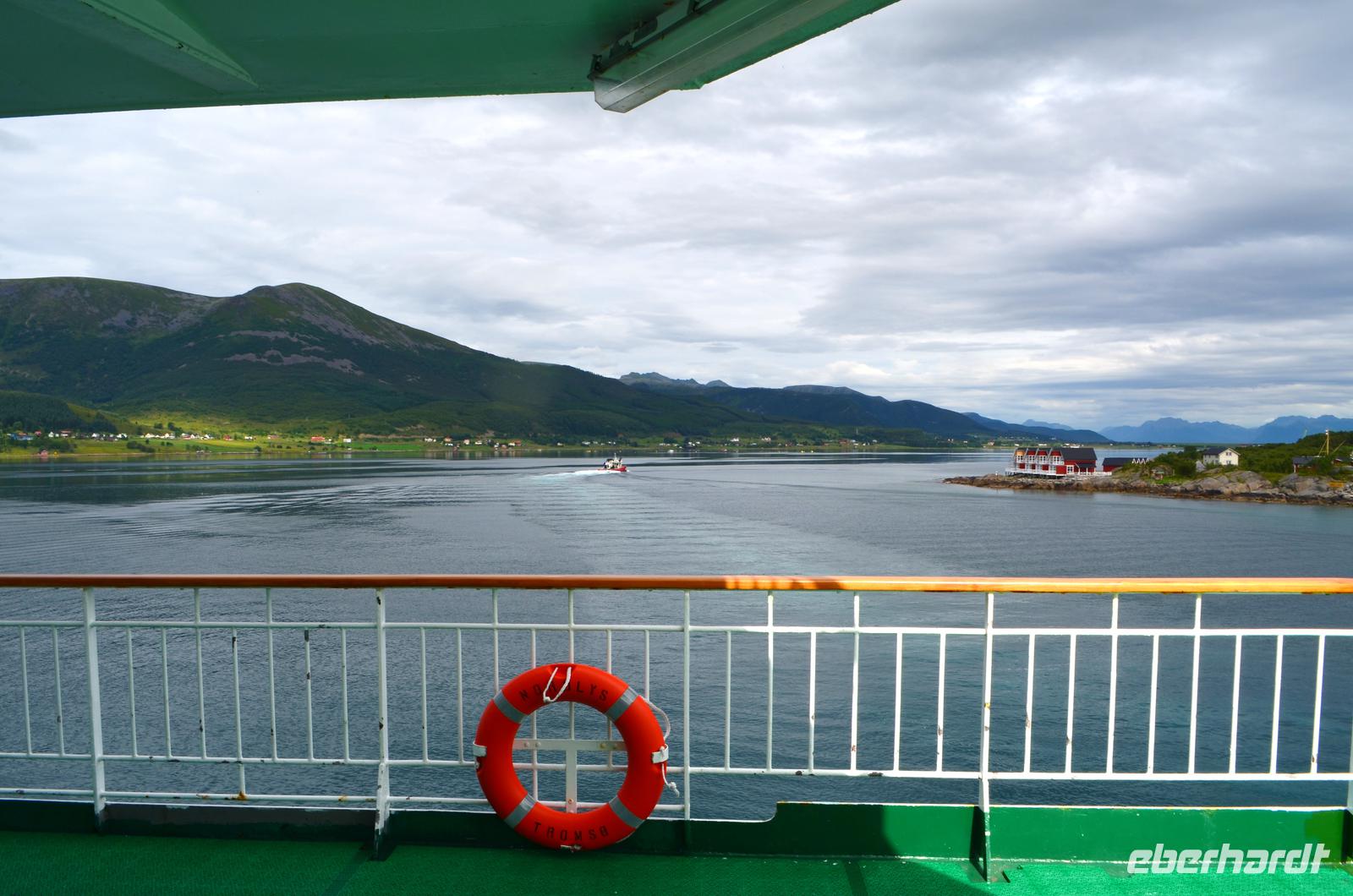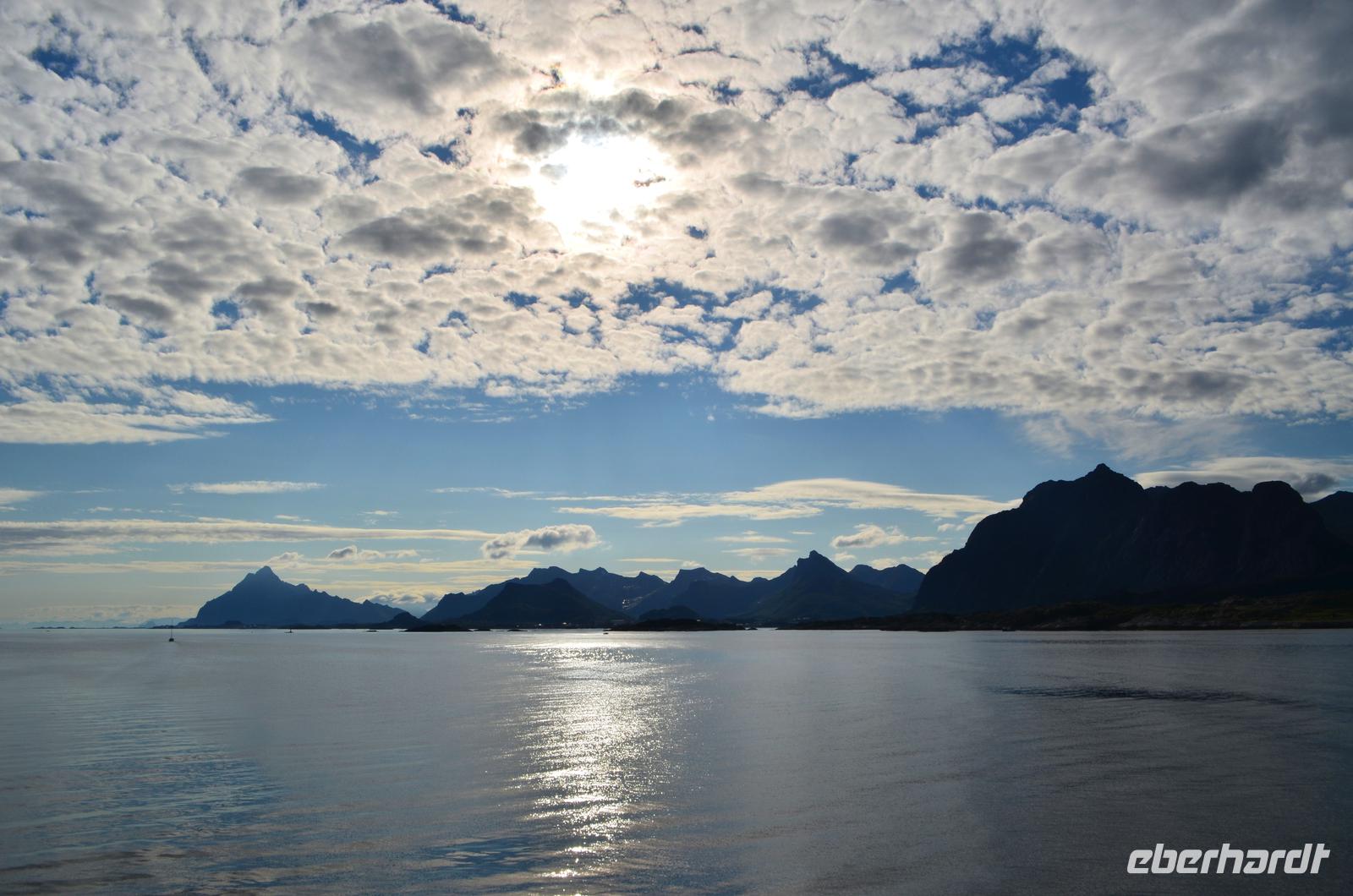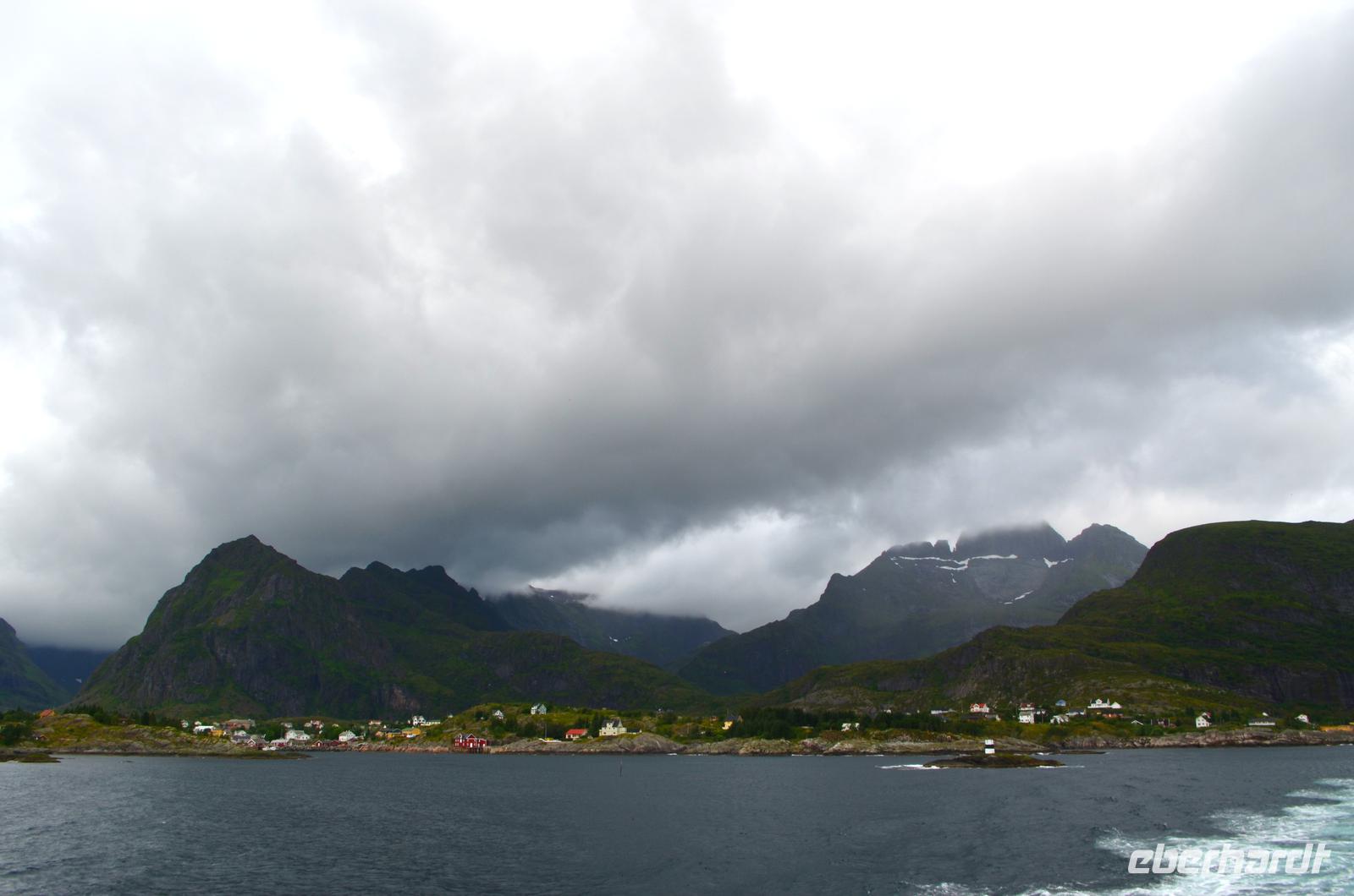 Am Morgen etwas Regen - aber die Sicht auf die grandiose Bergwelt ist frei. Wir fahren am Balsfjord vorbei, weiter durch die Berge und über die Fjelle von Troms gegenüber von Narvik am Ofotfjord entlang und dann - die Vesteralen mit Stockmarknes - dem Hurtigrutenmuseum und guter Sicht auf die Gipfelwelt der Vesteralen und der Lofoten. Unser Hurtigrutenschiff ist eines der modernen Flotte, die M/S „Nordlys" und sie steuert gerade den Hafen an, als wir ankommen. Damit können wir ihre Ankunft noch schön auf unseren Foto- und Filmgeräten festhalten. Der nächste Höhepunkt der Reise steht bevor - die schöne Fahrt durch den Raftsund, hinein in den engen Trollfjord und dann weiter durch die Inselwelt der Lofoten bis Svolvær - herrlicher Sonnenschein jetzt und die Fahrt einfach unbeschreiblich schön.