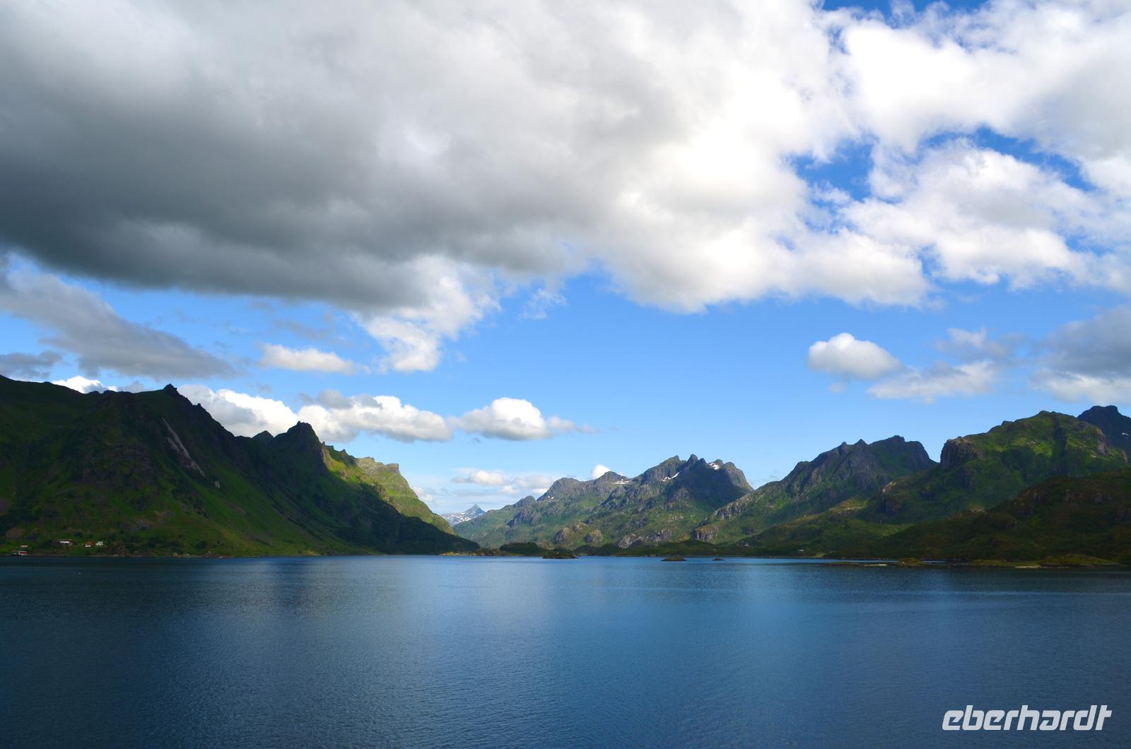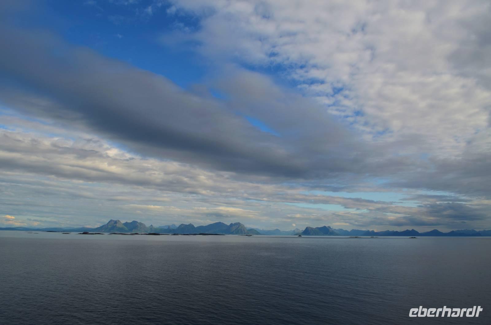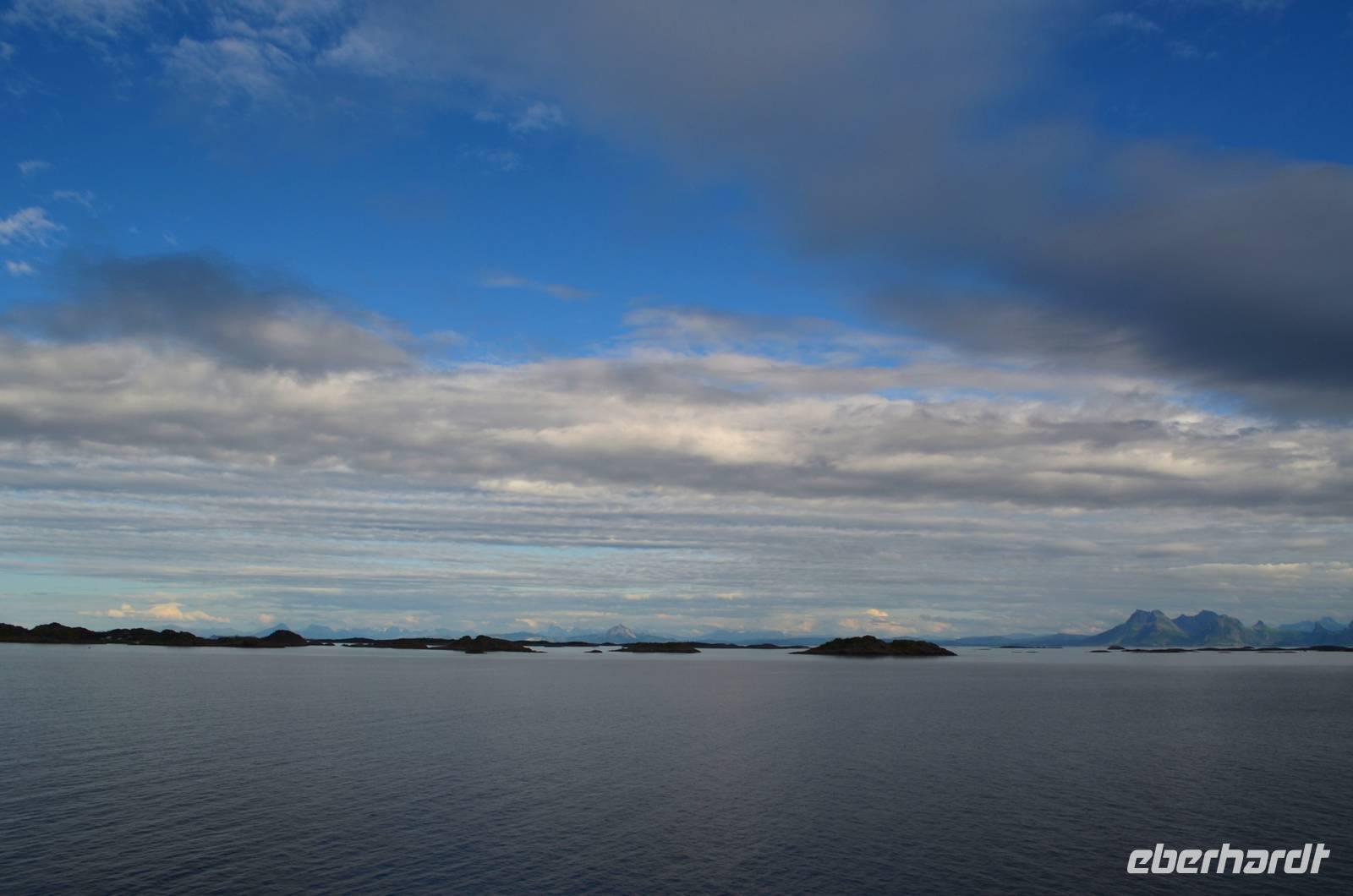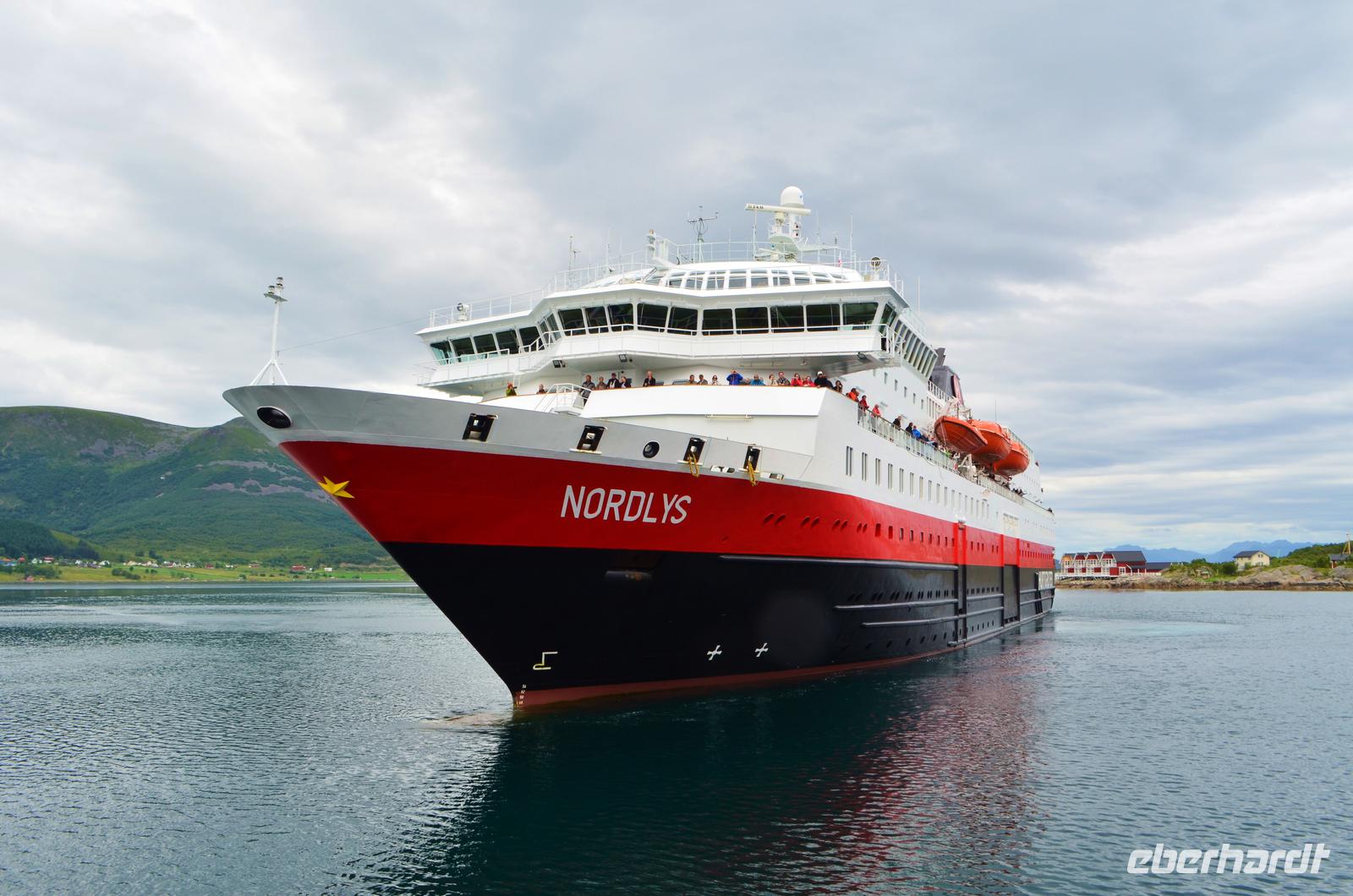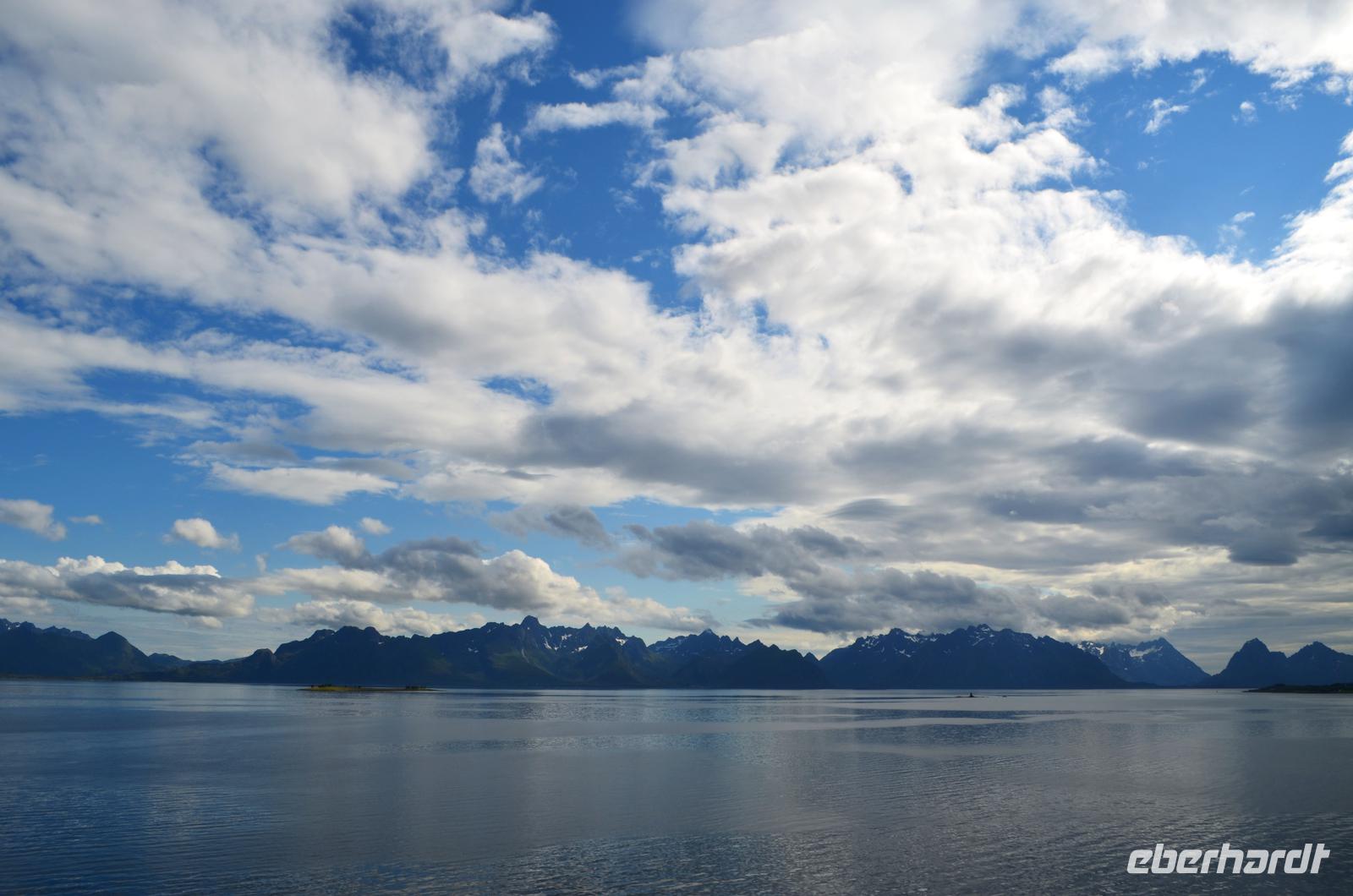 Am Morgen etwas Regen - aber die Sicht auf die grandiose Bergwelt ist frei. Wir fahren am Balsfjord vorbei, weiter durch die Berge und über die Fjelle von Troms gegenüber von Narvik am Ofotfjord entlang und dann - die Vesteralen mit Stockmarknes - dem Hurtigrutenmuseum und guter Sicht auf die Gipfelwelt der Vesteralen und der Lofoten. Unser Hurtigrutenschiff ist eines der modernen Flotte, die M/S „Nordlys" und sie steuert gerade den Hafen an, als wir ankommen. Damit können wir ihre Ankunft noch schön auf unseren Foto- und Filmgeräten festhalten. Der nächste Höhepunkt der Reise steht bevor - die schöne Fahrt durch den Raftsund, hinein in den engen Trollfjord und dann weiter durch die Inselwelt der Lofoten bis Svolvær - herrlicher Sonnenschein jetzt und die Fahrt einfach unbeschreiblich schön.