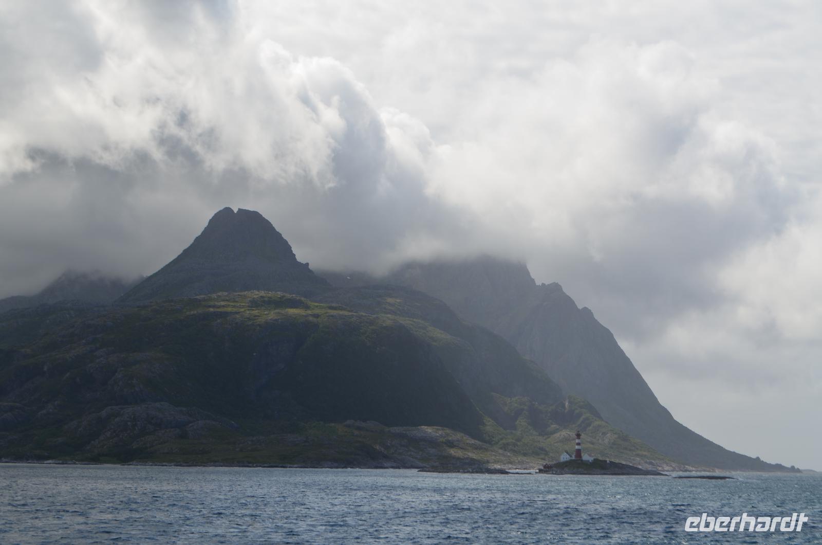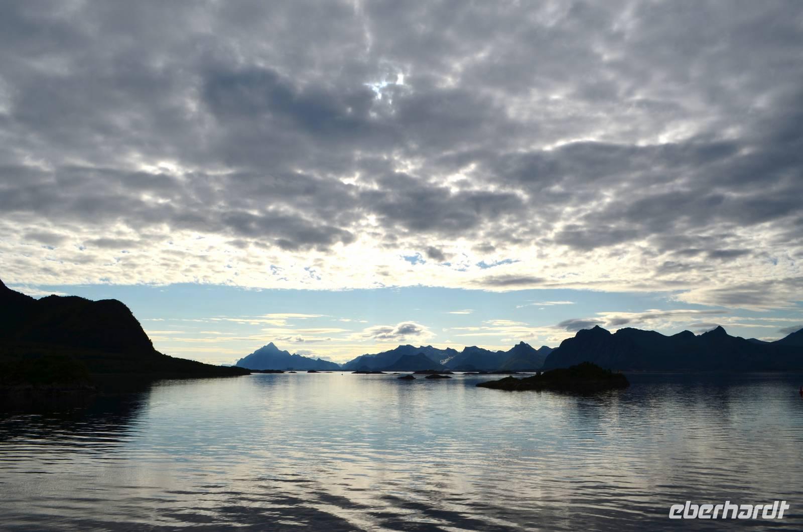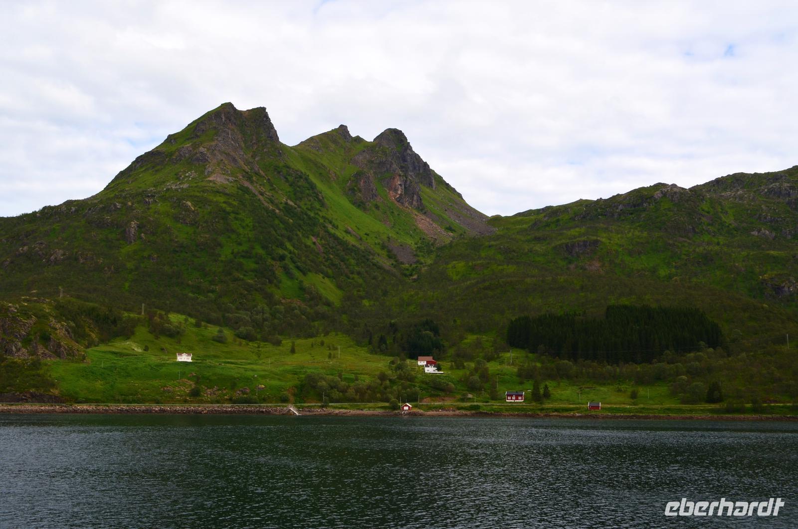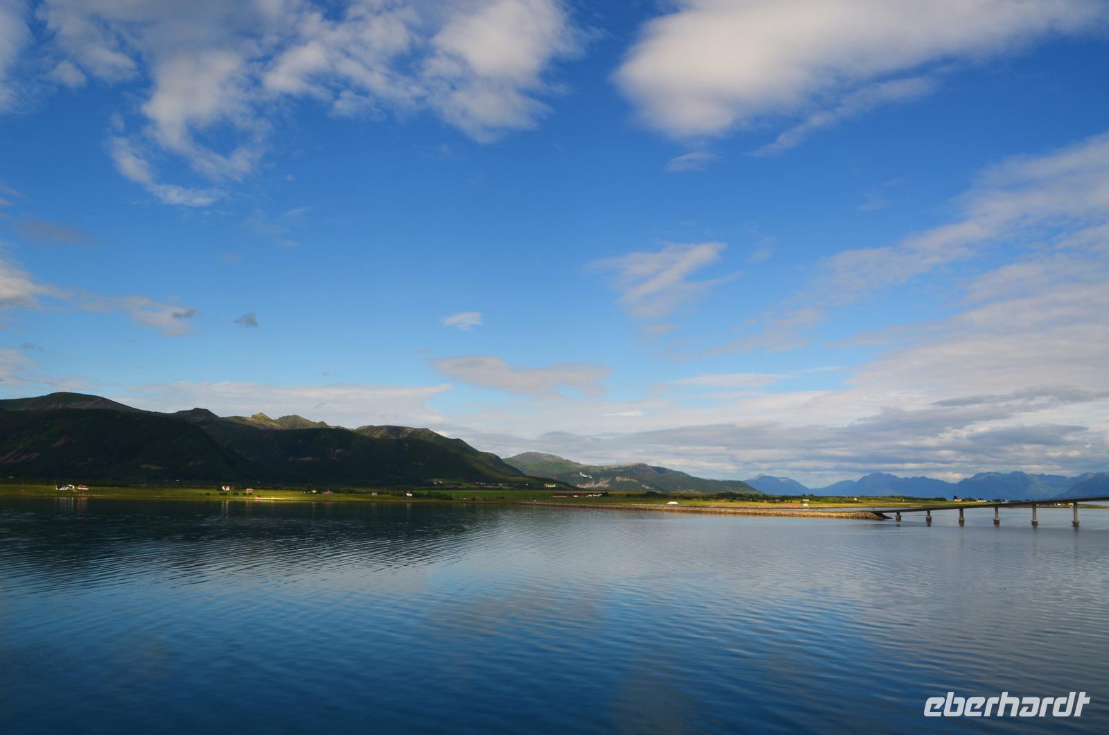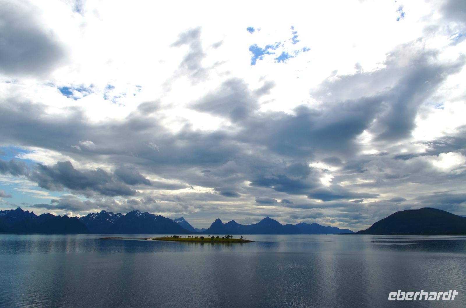Am Morgen etwas Regen - aber die Sicht auf die grandiose Bergwelt ist frei. Wir fahren am Balsfjord vorbei, weiter durch die Berge und über die Fjelle von Troms gegenüber von Narvik am Ofotfjord entlang und dann - die Vesteralen mit Stockmarknes - dem Hurtigrutenmuseum und guter Sicht auf die Gipfelwelt der Vesteralen und der Lofoten. Unser Hurtigrutenschiff ist eines der modernen Flotte, die M/S „Nordlys" und sie steuert gerade den Hafen an, als wir ankommen. Damit können wir ihre Ankunft noch schön auf unseren Foto- und Filmgeräten festhalten. Der nächste Höhepunkt der Reise steht bevor - die schöne Fahrt durch den Raftsund, hinein in den engen Trollfjord und dann weiter durch die Inselwelt der Lofoten bis Svolvær - herrlicher Sonnenschein jetzt und die Fahrt einfach unbeschreiblich schön.