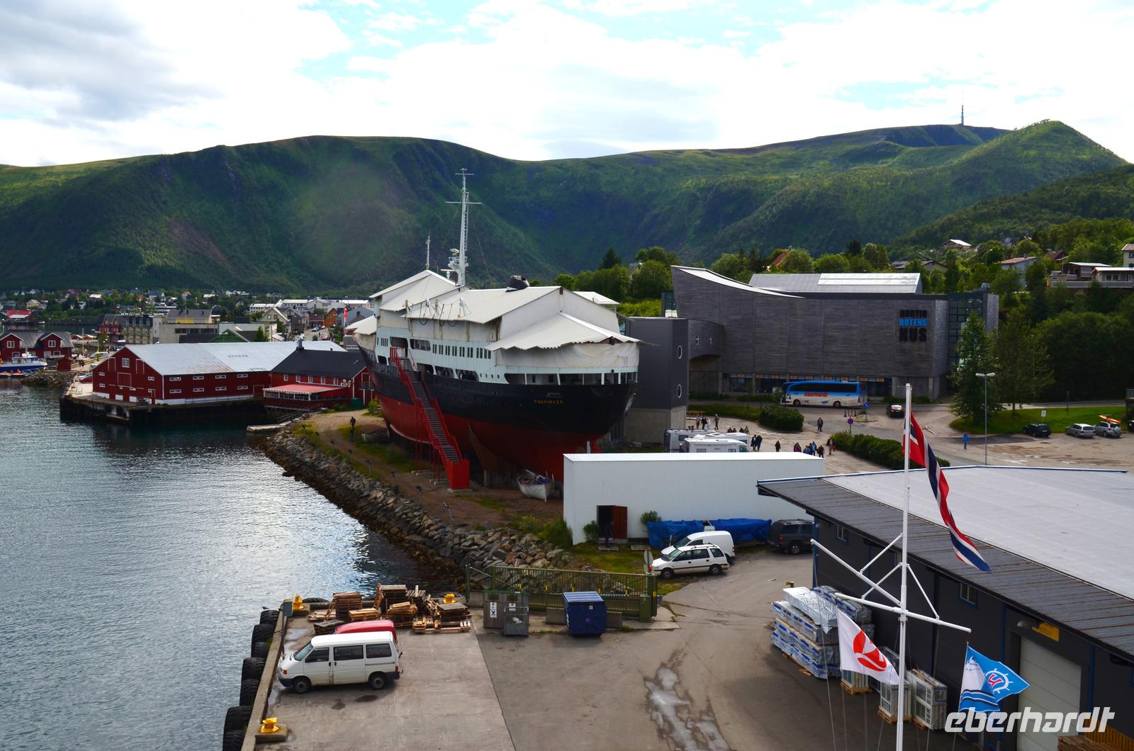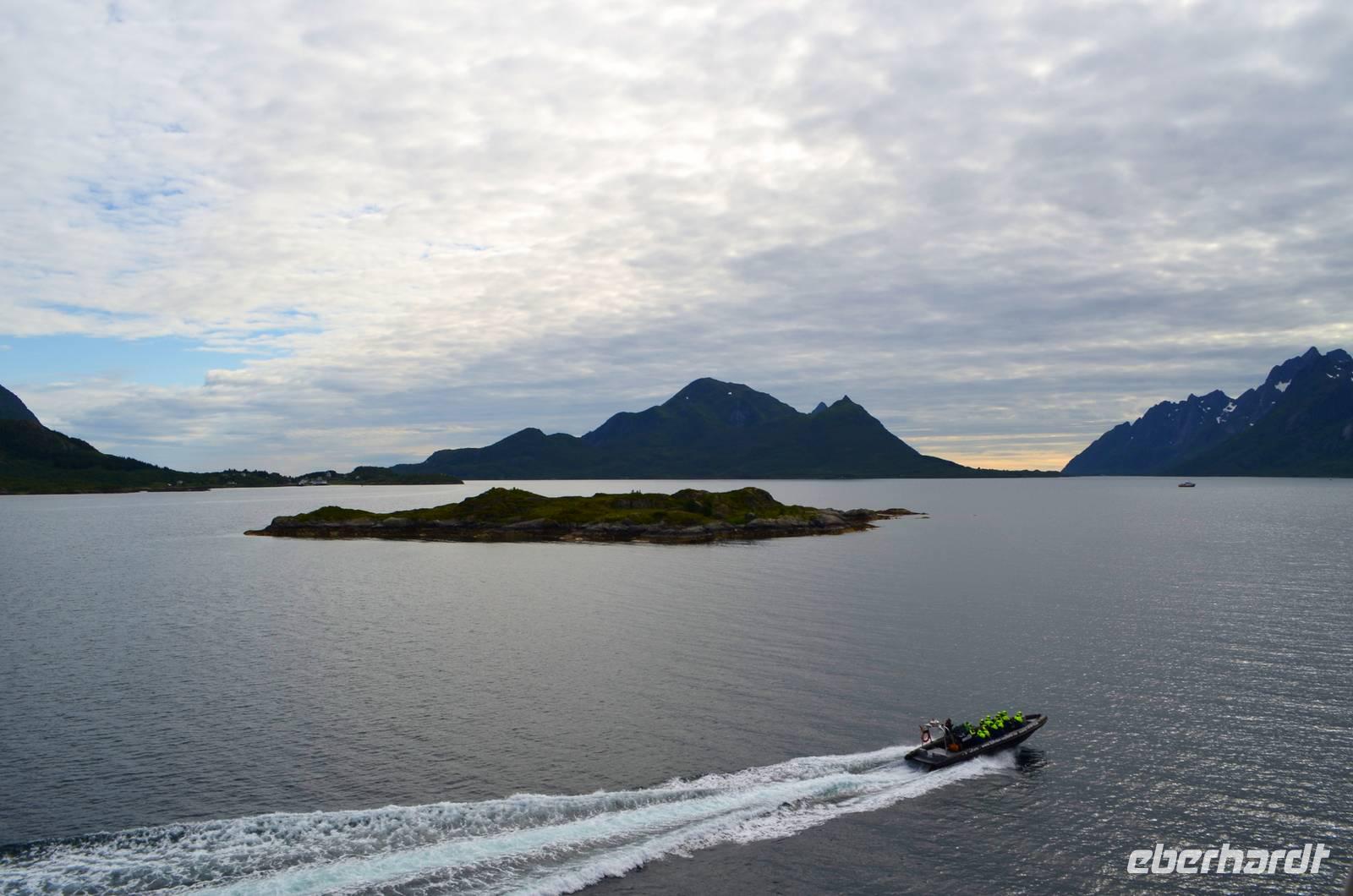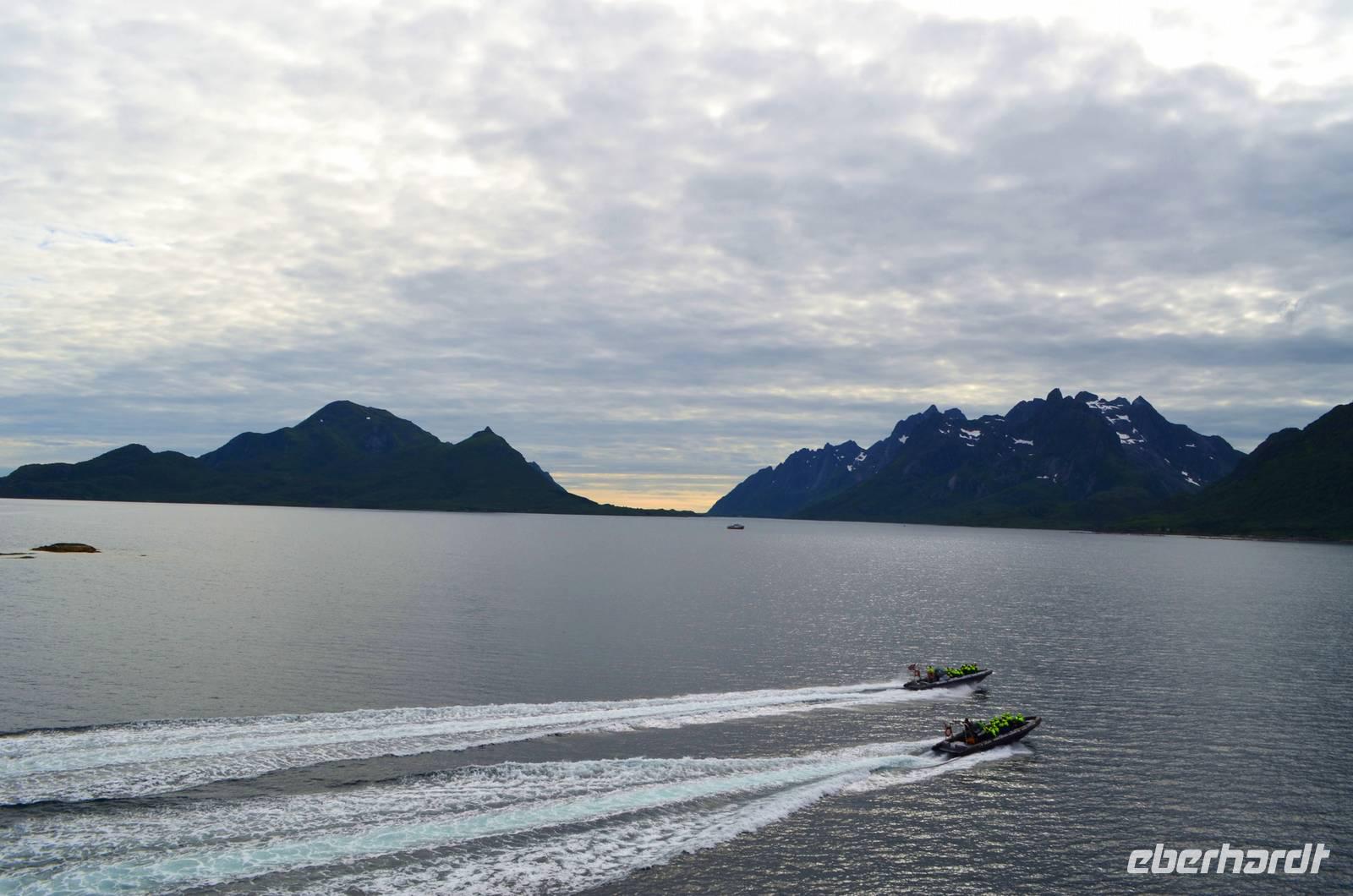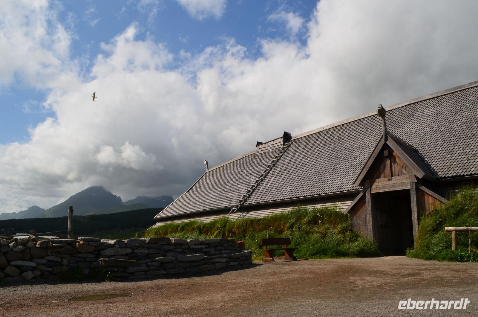 Wir lassen den neuen Tag mal etwas geruhsam angehen. Schönes Frühstück und dann Beginn der Lofotenrundfahrt. Ein Kreuzfahrtschiff im Fjord ist das Fotomotiv an diesem Morgen. Leider regnet es, aber wir besuchen zuerst das interessante Kriegsmuseum in Svolvaer und anschließend das Wikingermuseum in Borg. Letzteres ist ein „Museum zum Anfassen". Hier essen wir nach unserer Führung leckere Wikingersuppe, die mit dem als eberhardt-WOW gereichten Bier und Wein nochmal so gut mundet.
