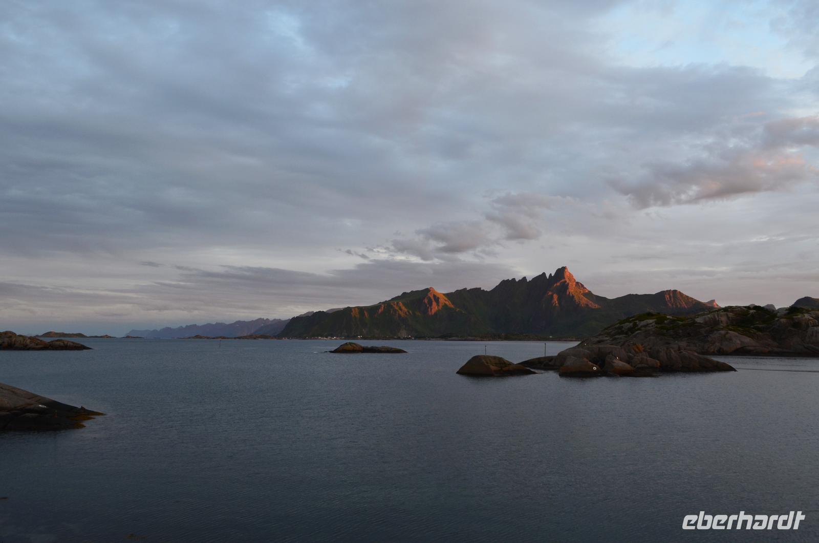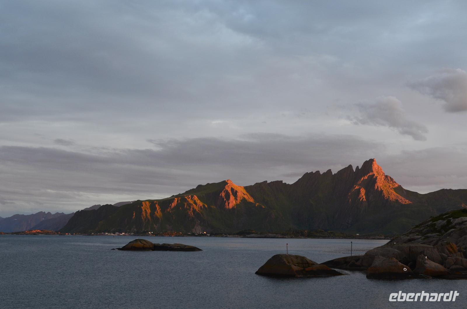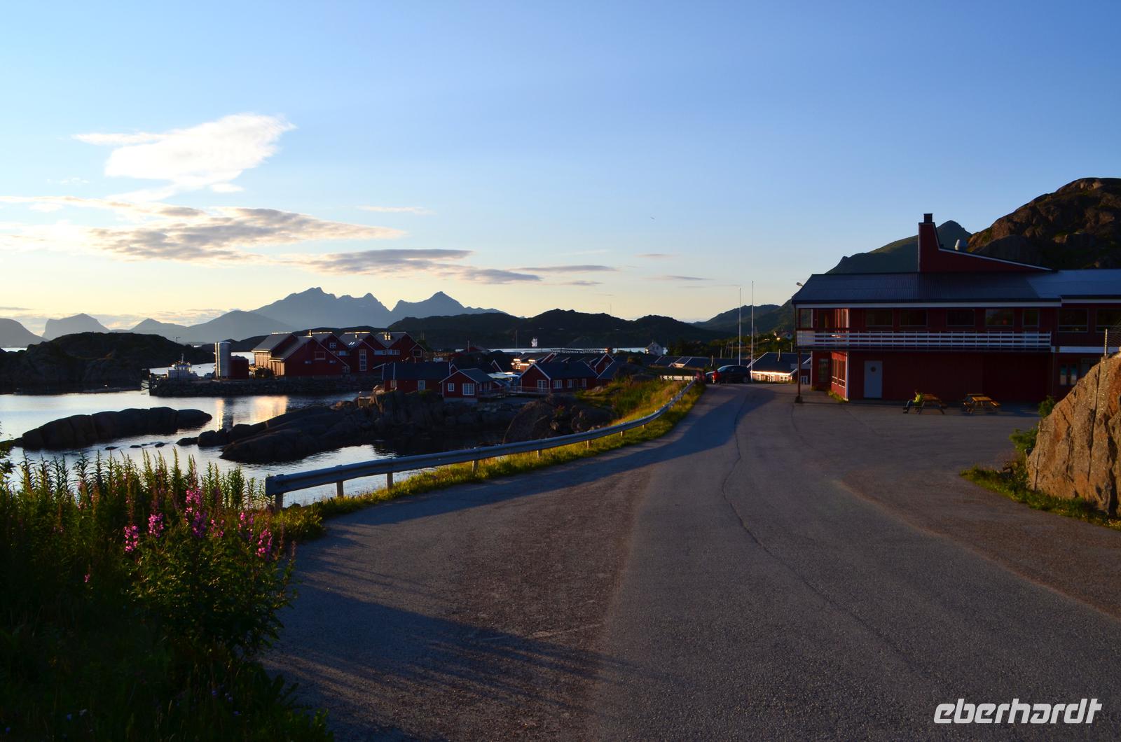 Die Lofoten sind ein weiterer, echter Höhepunkt der Reise, das zeigt sich auch als wir in Svolvaer wieder in unseren Reisebus steigen und zur Übernachtung zu den Rorbuhütten von Mortsund über die Inseln fahren. Die Häuschen mit allem Komfort und dazu die herzliche Begrüßung in Statles Robucenter. Uns fehlt es an Nichts und die Sonne taucht die Landschaft in wundervolles Licht und tolle Farben.