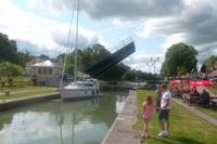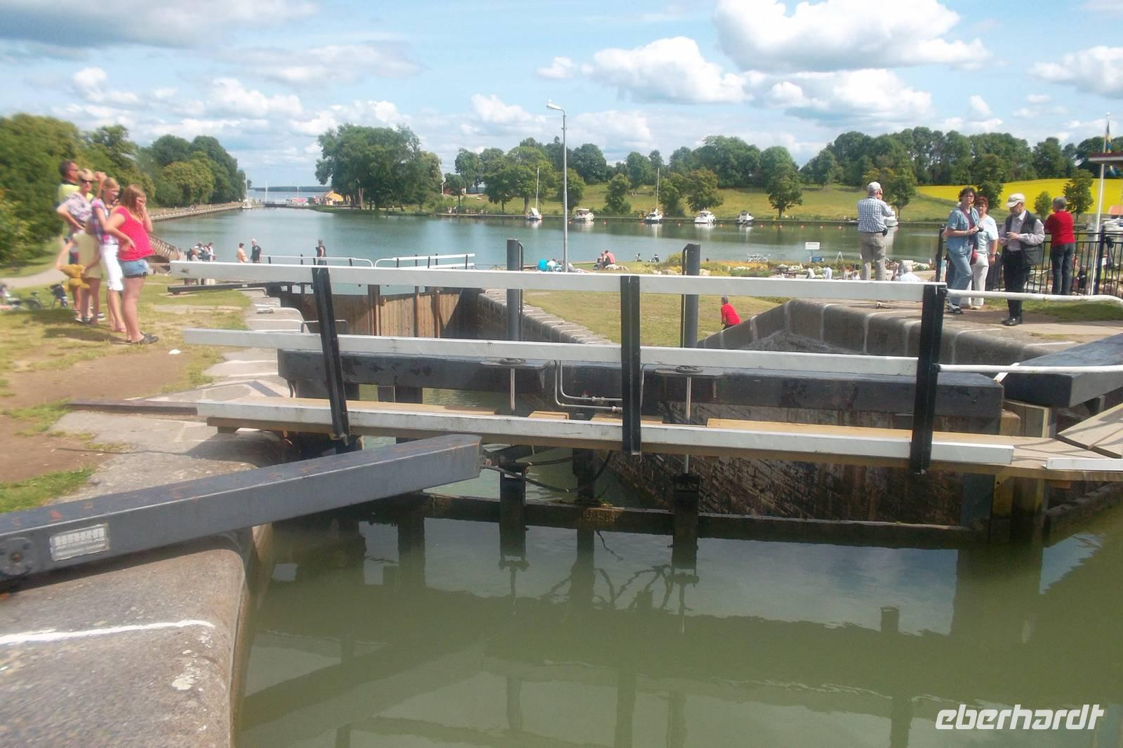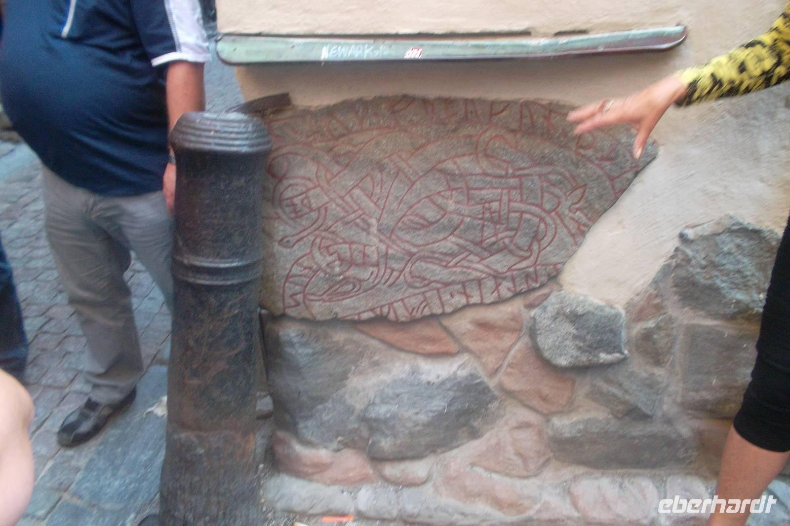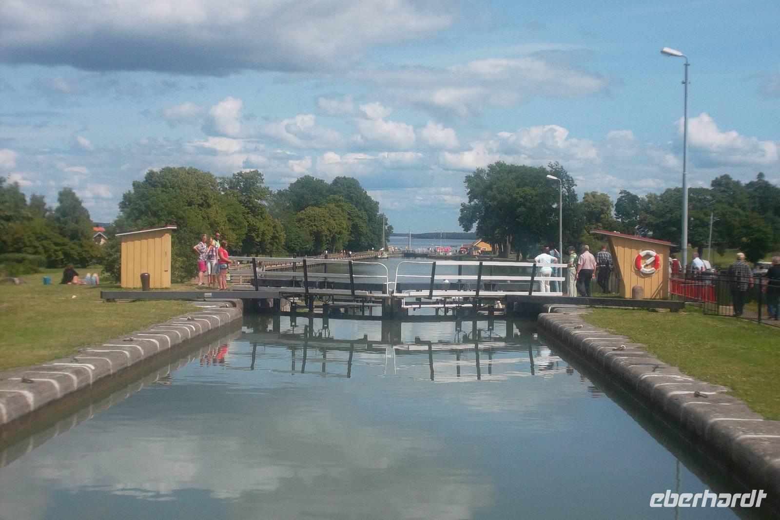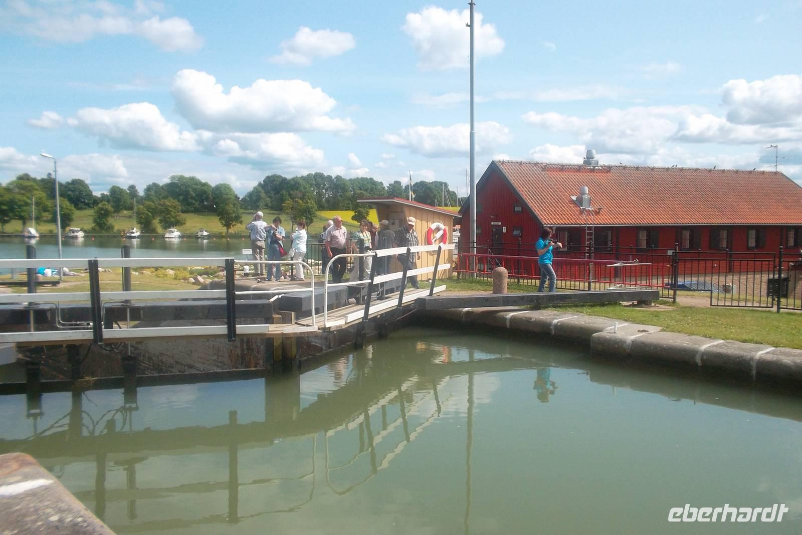 Zur Mittagspause hatten wir uns einen interessanten kleinen Umweg, als „Richtig Reisen!"-Extra ausgedacht. Nach etwa vierzig Minuten Fahrzeit von den „Gyllene Yttern" erreichten wir den berühmten Runenstein von Rök. Er gilt als „schwedisches Nationalheiligtum" und ist der skandinavische Runenstein mit den meisten Runen - zum Teil im „Spezialalphabet" - ein weithin bekannter Denkstein der alten Wikinger und ein abseits der Hauptstraßen liegendes beliebtes Ausflugsziel der Schweden. Nachdem ich einen kleinen Vortrag Runen, Runensteinen und Runenmeistern gehalten hatte und wir den Bordservice mit Würstchen- und Kaffeeausgabe durchgeführt hatten, fuhren wir weiter. Gleich gab es das nächste Extra, denn da die Zeit es erlaubte fuhren wir den Götakanal an. Im 19. Jahrhundert erbaut, ist er der längste Kanal Schwedens. Teil eines Wasserwege-Systems reicht er quer durch Südschweden und verbindet über mehrere Seen Stockholm mit dem Skagerrak und der Nordsee. Er wurde gebaut, um für kleinere Transportschiffe den Weg um Südschweden herum und damit die Zollzahlungen an Dänemark zu umgehen. 58 Schleusen überwinden Höhenunterschiede von über 90 m - die Schleusen von Berg sind die malerischsten! Natürlich haben wir hier eine Pause gemacht, die zu idyllischen Spaziergängen genutzt und zum Eisessen gebraucht werden konnte! Herrliches Wetter ließ so richtig Urlaubsstimmung aufkommen.