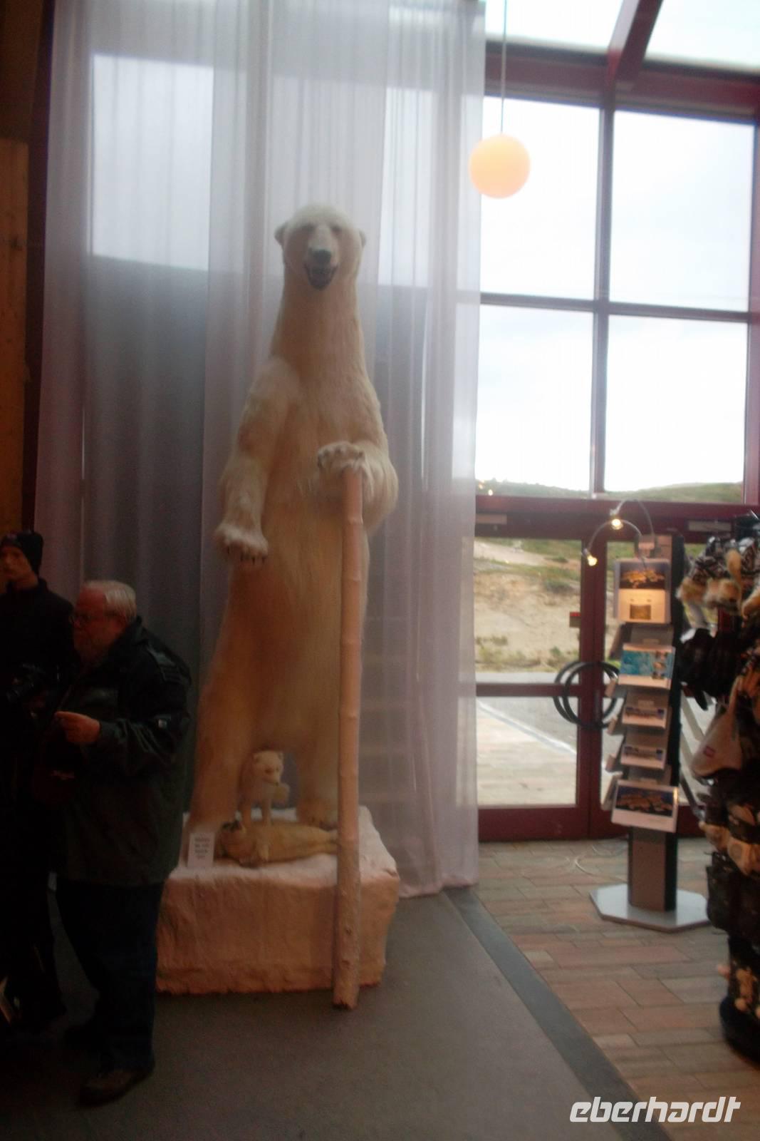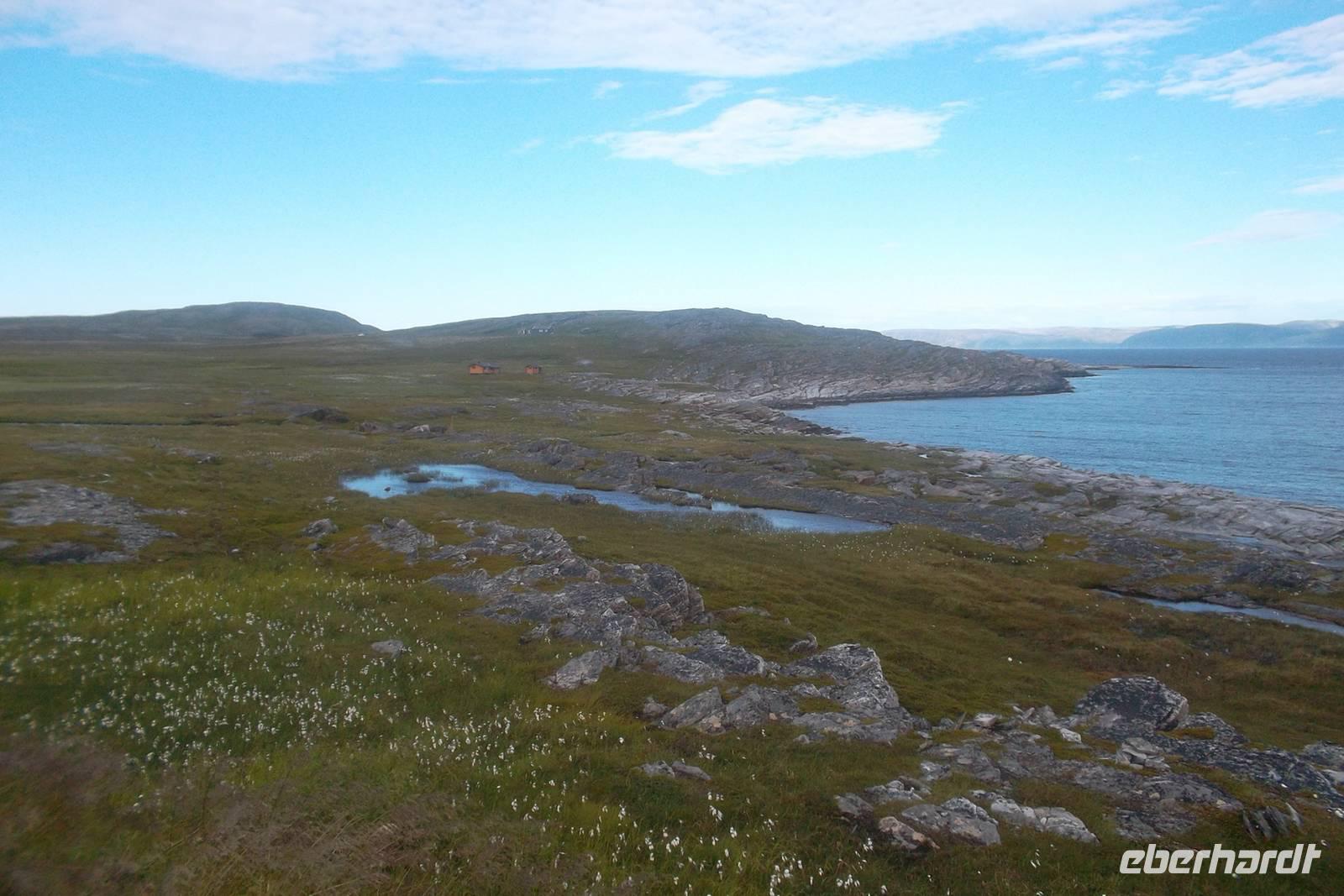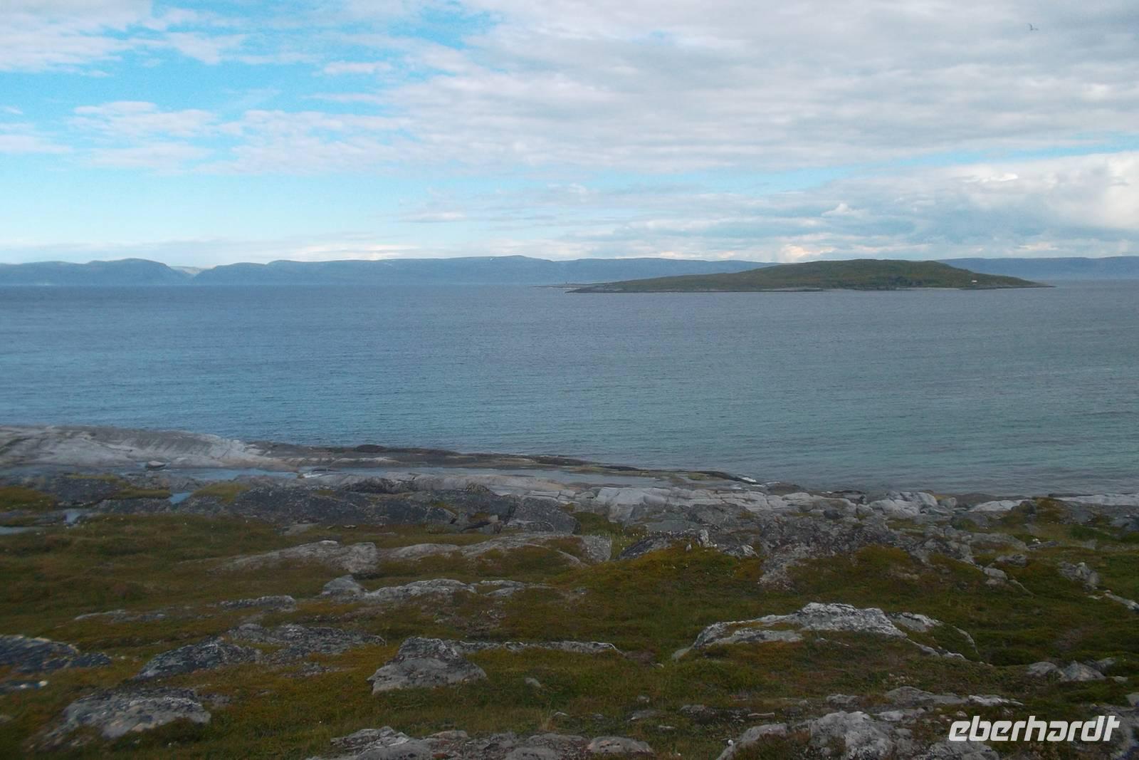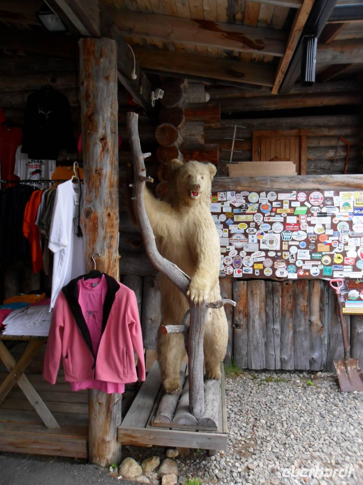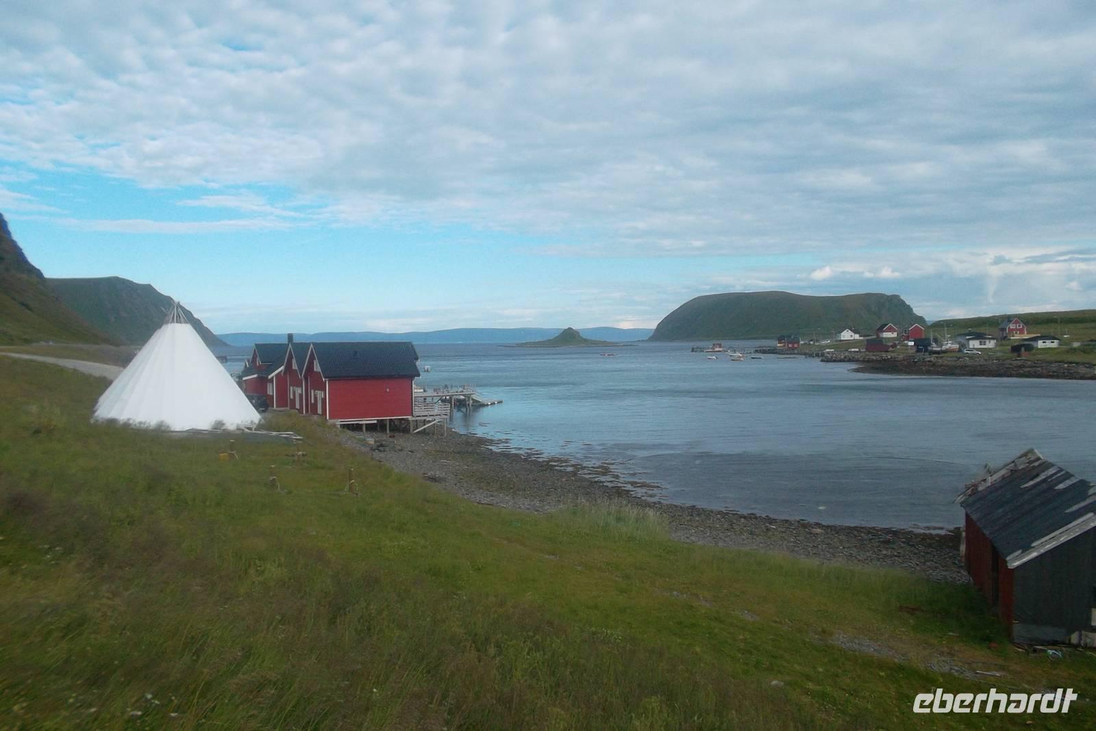 Schon gleich nach dem Aufbruch von Saariselkä gab es einem Stopp an der „Bärenhöhle", deren Hauptattraktionen ein ausgestopfter Braunbär, ein Eisbär und eine samische Souvenirverkaufstelle sind. Weiter ging es zum Inarisee, den ich wegen seiner Präsenz in vielen Rätseln gerne den „Kreuzworträtselsee" nenne. Nach einem kurzen Stopp hier fuhren wir durch die Waldtundra Finnlands zur norwegischen Grenze. Nach einem kleinen Fotostopp, der einer „Lappengamme" galt, dem „ständigen" Winterquartier, das die samischen Nomaden aus Holz, Erde und Grassoden fertigen, erreichten wir bald Karasjok, den Hauptort der norwegischen Samen, (diese Einwohner Lapplands werden bei uns gern „Lappen" genannt) Während unsere Gäste in der Tourist-Information Toiletten und Geldtauschmöglichkeiten nutzten, kaufte ich frisches Brot und letzte Leckereien für ein geplantes Mittagspicknick ein, und Busfahrer Gerd fuhr tanken. Nun ging es immer nach Norden und durch die norwegische Wald- und Fjelltundra zum Porsangerfjord. Die Vorbeifahrt hier ist die letzte Etappe der Fahrt zum Nordkap. Der mit glasklarem Wasser gesegnete Fjord ist sehr malerisch, insbesondere durch viele, kleine Fischerdörfchen und wild wirkende Gebirgsketten als Umrahmung. Am ersten großen Parkplatz - direkt am Wasser - bauten Gerd und ich ein landestypisches Mittagspicknick auf, für das wir zuvor in Finnland und kurz in Norwegen eingekauft hatten. Unsere Gäste fanden die Nordland-Spezialitäten recht köstlich und bestätigten, dass ein solches Picknick immer eine gute Idee sei. Mit mehreren Fotostopps unterwegs und einer Kaffeepause an einer Silberschmiede, deren Besitzer Stockfische ausstellt und vieles dazu zu berichten weiß, erfolgte die Weiterfahrt entlang des Porsangerfjordes. Durch den Nordkapunnel und die FATIMA (Abkürzung für „Fastlandsförbindelse til Magerøya") gelangten wir zu unseren ein Stück hinter der Hafenstadt Honningsvåg gelegenen Sommerhotel.