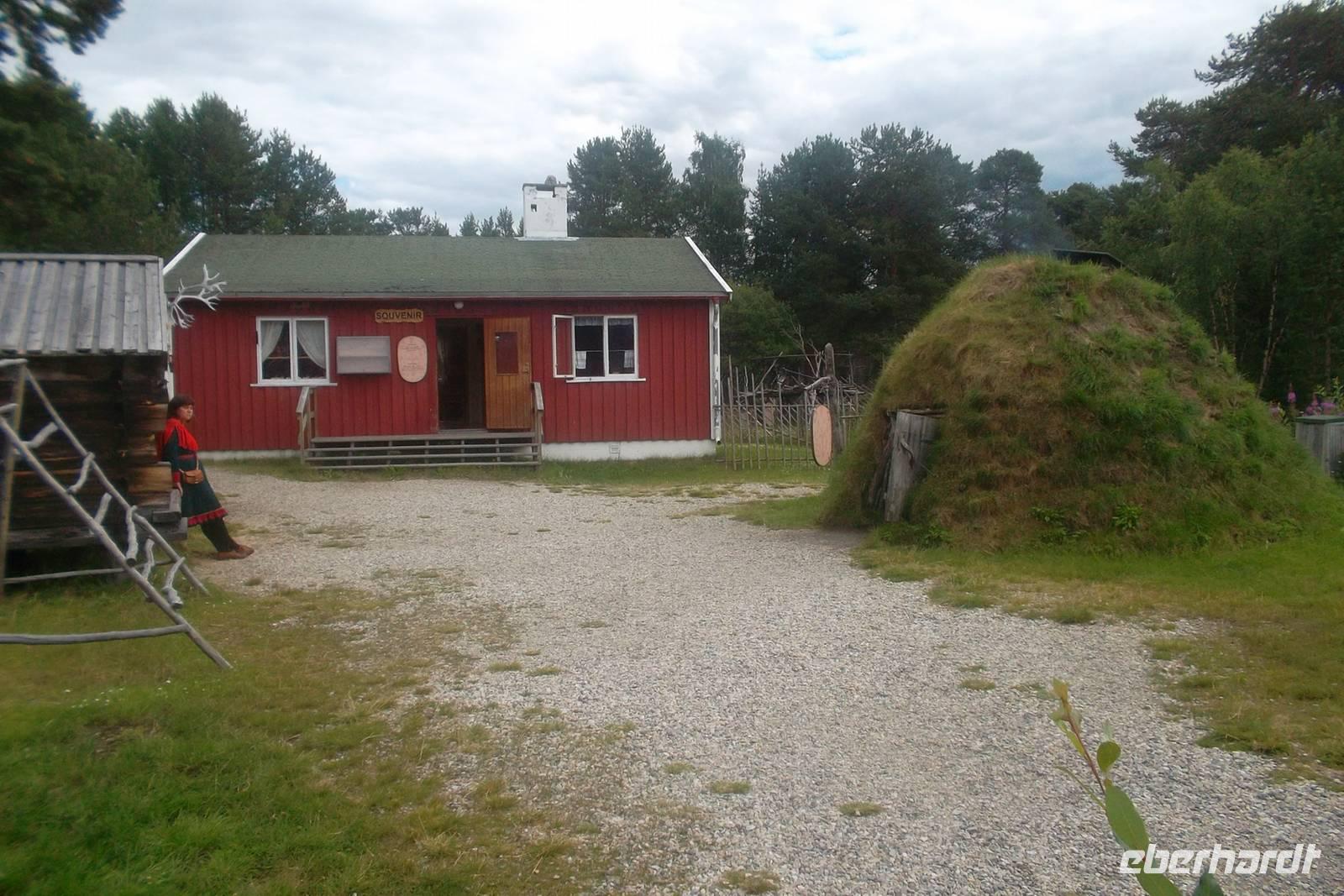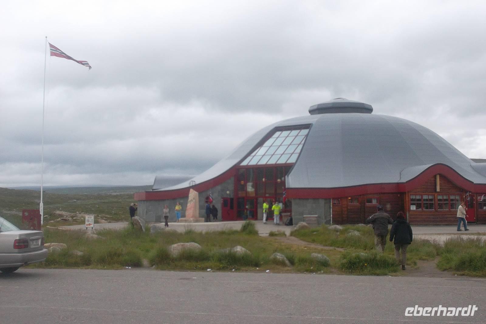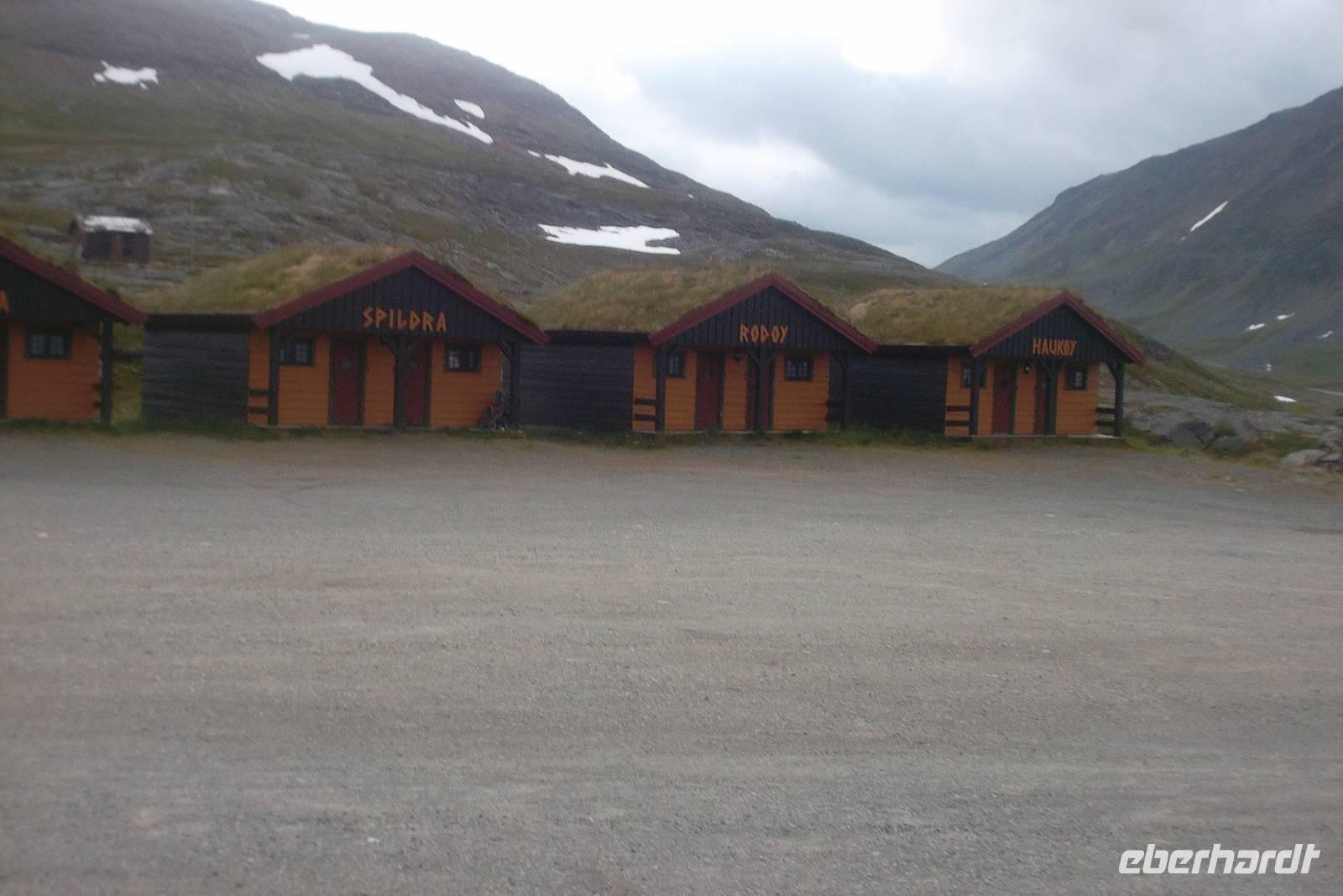 Wir folgten der Straße entlang einiger Fjordufer, bevor wir eine Pause am „Gildetun" einlegten, einem als Hotel und Campingunterkunft dienenden und in traditioneller Blockbauweise errichteten, mit Grassoden gedecktem Hotel. „Mitten in der Wildnis" findet sich hier eine im Stil eines alten Gehöfts gestaltete Touristen-Unterkunft.