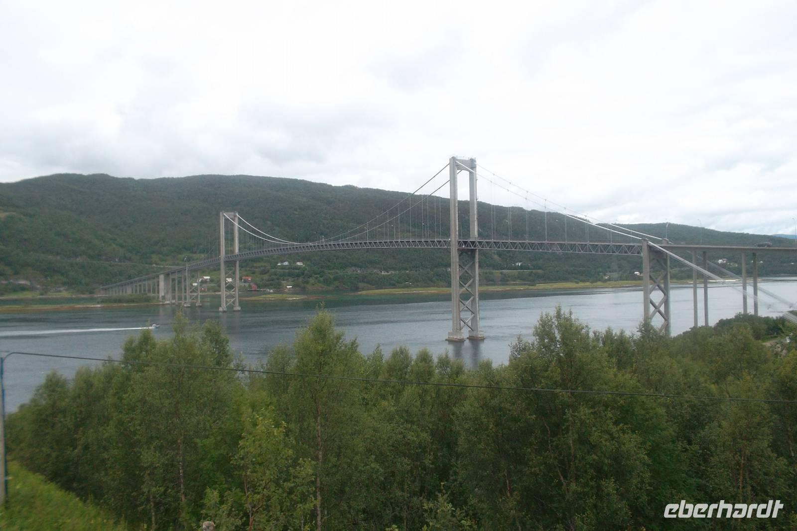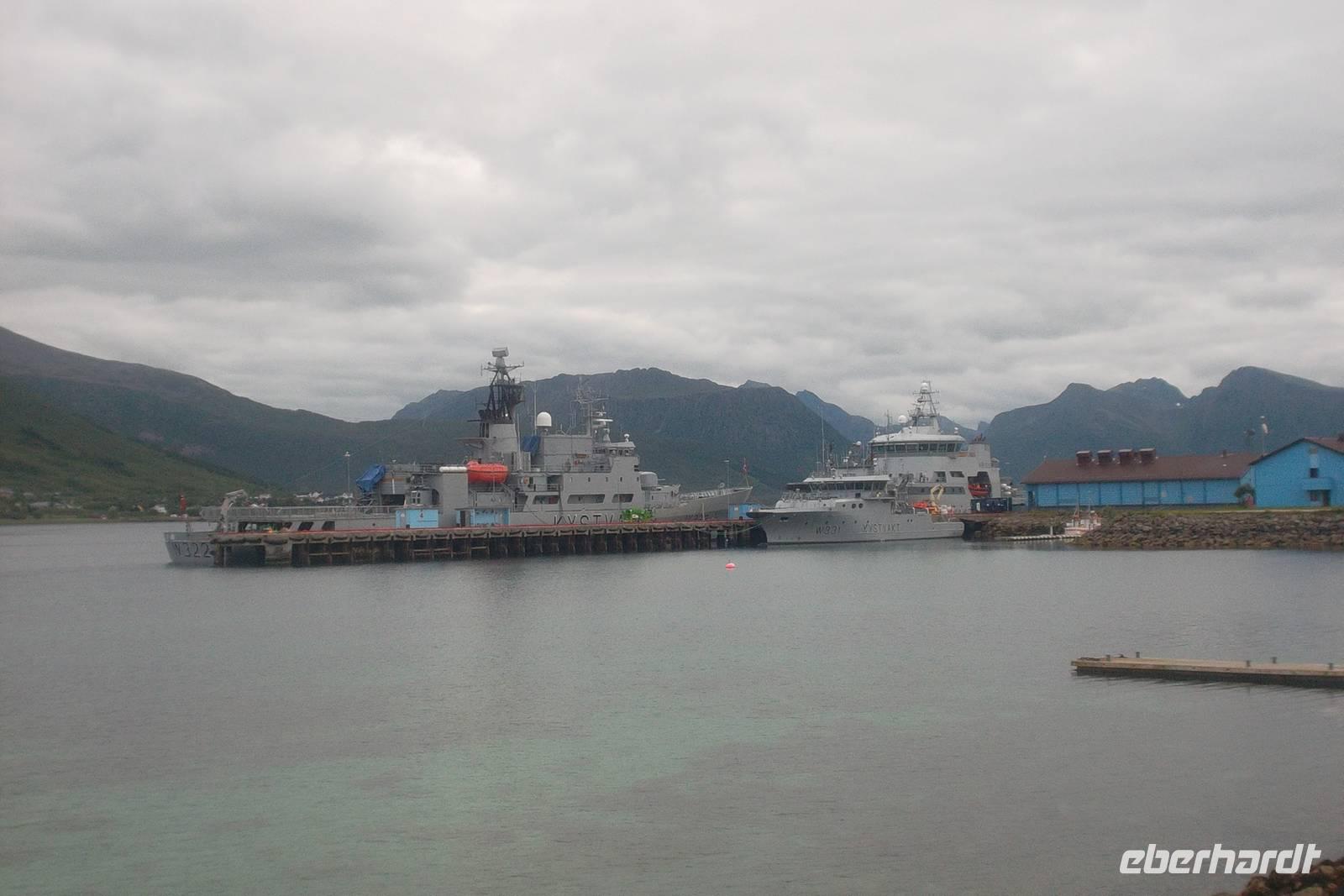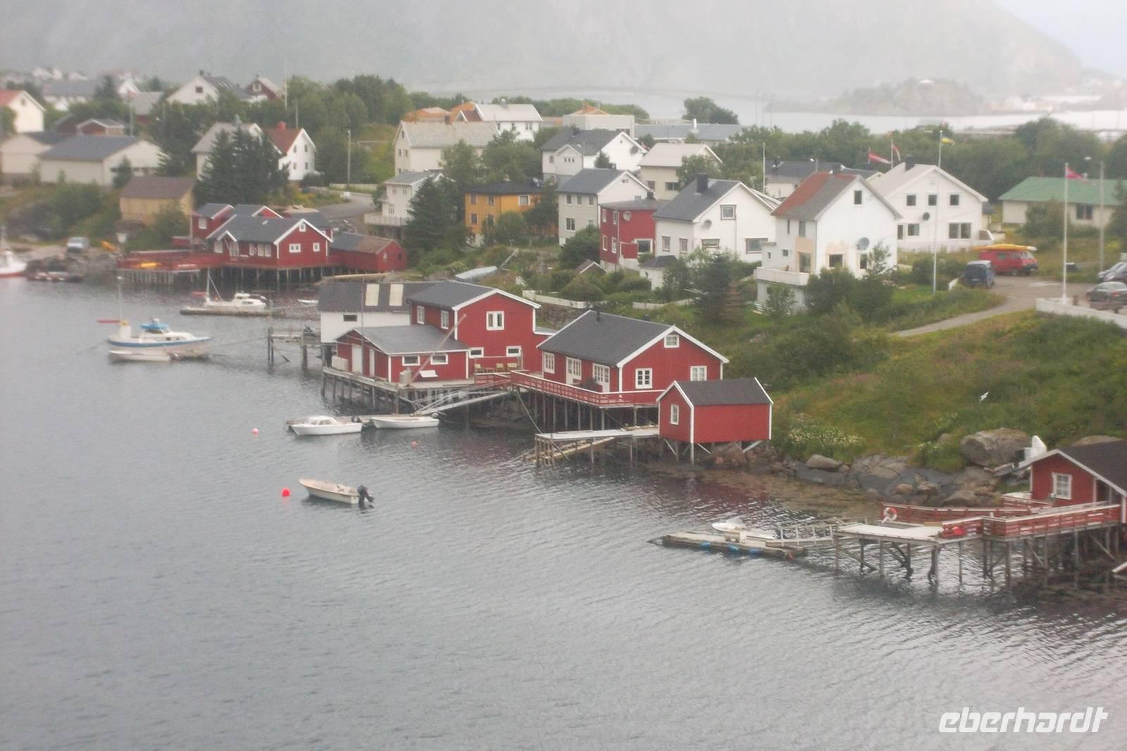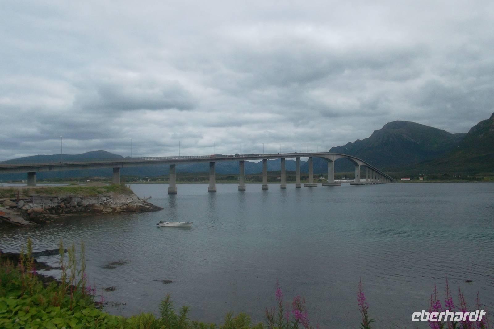 Der heutige, recht lange Tag durch die nicht zu unterschätzenden Entfernungen in Norwegen führte weiter auf der Europastraße 6. Diese Durchgangsstraße zieht sich längs durch Norwegen in den hohen Norden. Einst diente sie vor allem der Anbindung von Narvik, Norwegens bedeutendstem Erzhafen. Überall auf der Straße und an den Parkplätzen finden sich Kriegsdenkmale und Schautafeln mit Hinweise auf den zweiten Weltkrieg und die erbitterten Schlachten mit den Truppen Hitlers. Bei Bjerkvik bogen wir dann auf die Europastraße 10 ab, den sogenannten „Kong Olafs Vei", da dieser norwegische König die Fernstraße eingeweiht hatte. Über die Vesterålen und die Lofoten führt die Straße bis zum südlichen Endpunkt, dem Ort å i Lofoterna. Zunächst legten wir einen Stopp am Herjangsfjord ein und sahen dabei auf der anderen Fjordseite die Stad Narvik liegen, dann überquerten wir den Tjeldsund auf der gewaltigen Steinslandbrücke und erreichten die Insel Hinnøya auf den Vesterålen. Die zweitgrößte (nach Spitzbergen) Insel Norwegens ist die bedeutendste der nördlich der Lofoten gelegenen Inselgruppe. Weniger bekannt und weniger touristisch erschlossen als Lofoten, sind die Vesterålen dennoch sehr schön und warten beispielsweise mit einer eindrucksvollen Küstenlinie und -straße auf. Wir überquerten die 984 m lange Sortland-Brücke zur Insel Langøya und erreichten schließlich das herrlich malerisch gelegene Stokmarknes. Die Insel Hadseløya ist mit Langøya durch eine typisch norwegische Brückenkonstruktion verbunden.