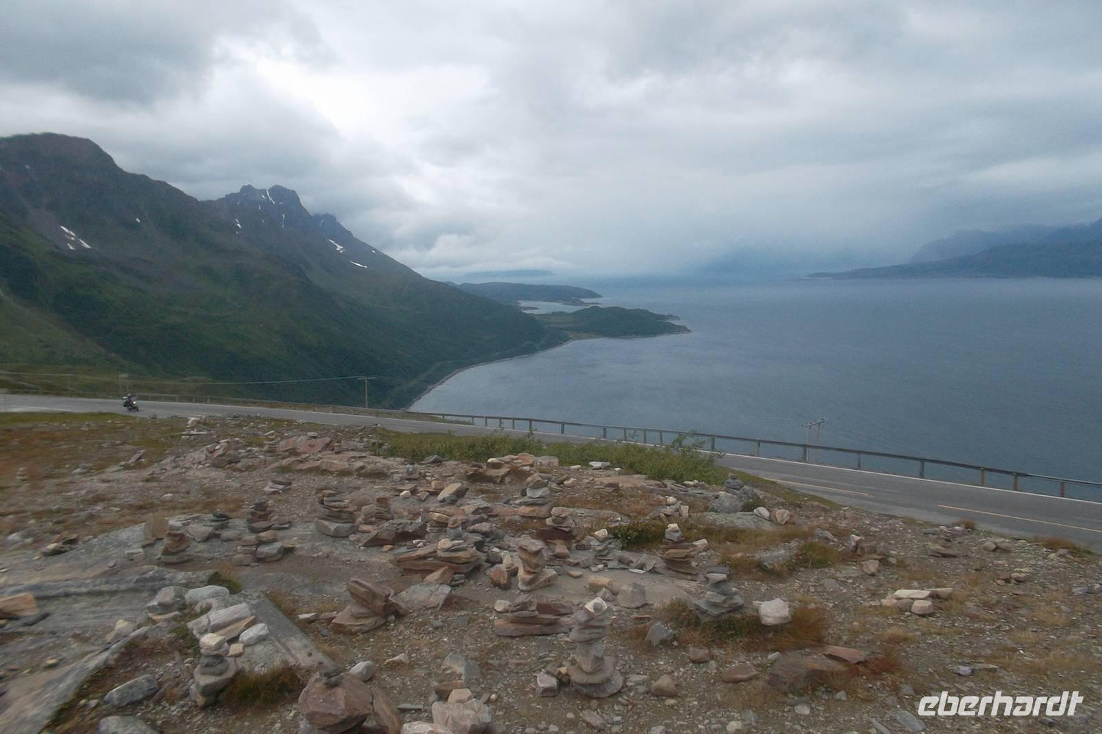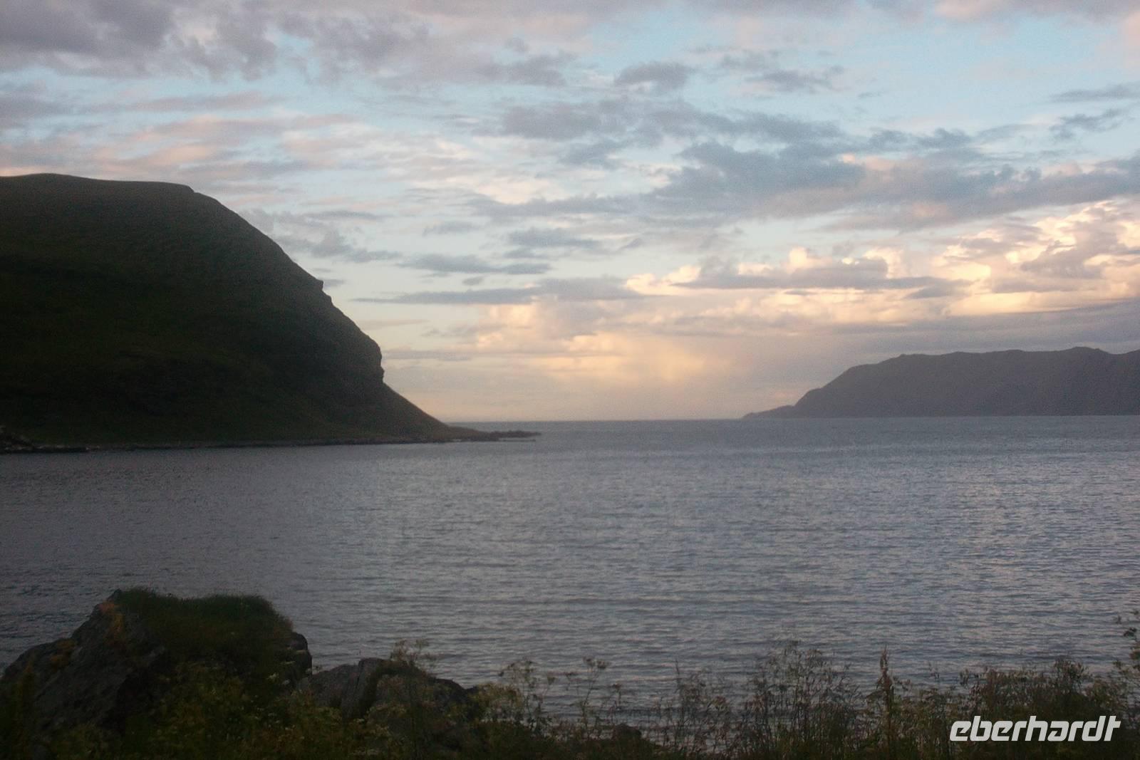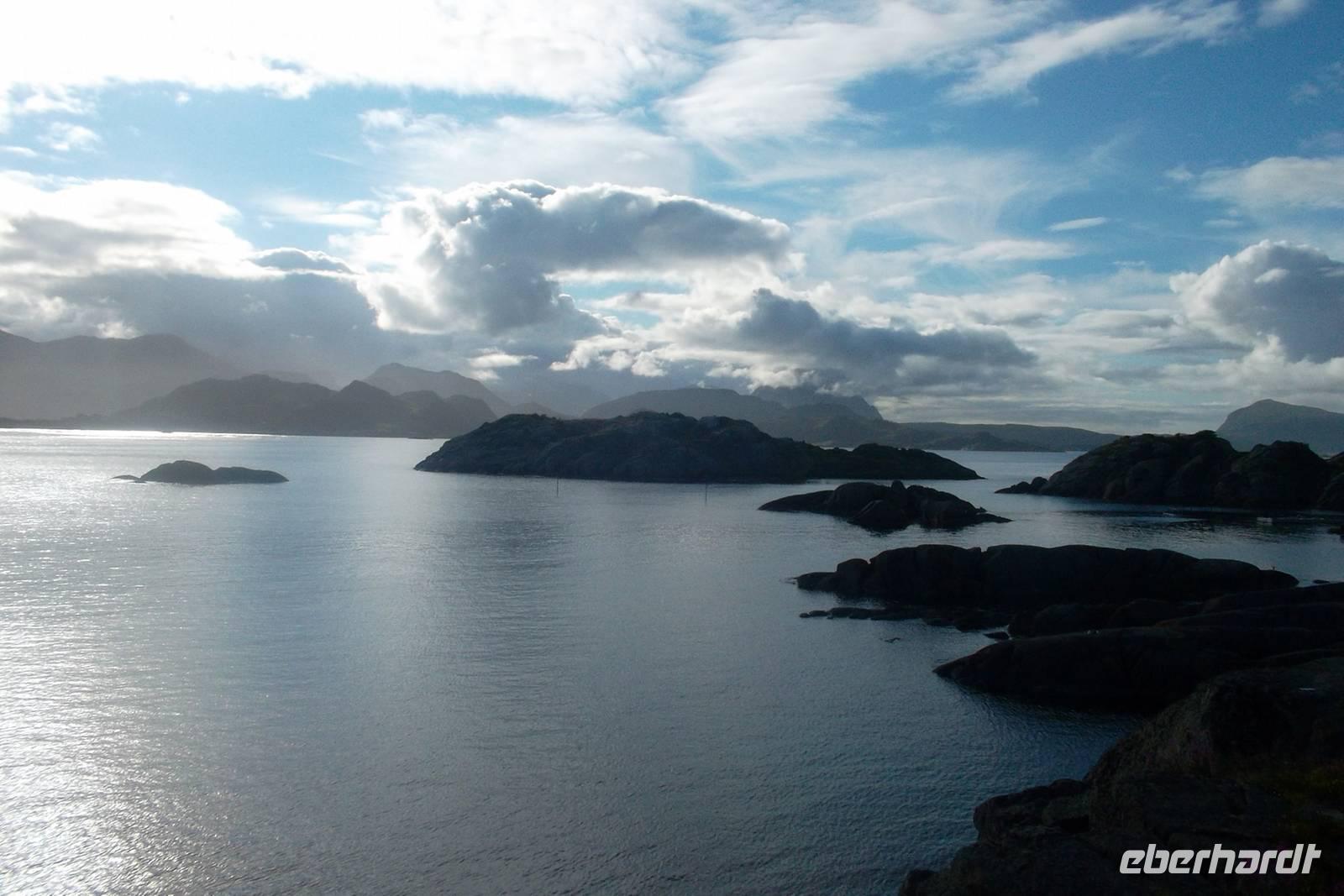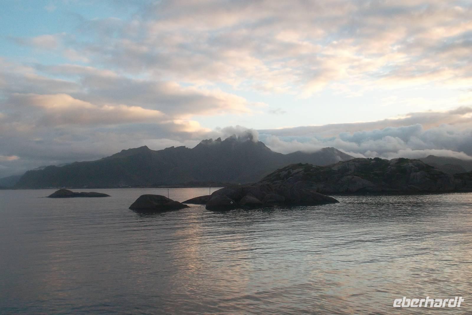 Der heutige, recht lange Tag durch die nicht zu unterschätzenden Entfernungen in Norwegen führte weiter auf der Europastraße 6. Diese Durchgangsstraße zieht sich längs durch Norwegen in den hohen Norden. Einst diente sie vor allem der Anbindung von Narvik, Norwegens bedeutendstem Erzhafen. Überall auf der Straße und an den Parkplätzen finden sich Kriegsdenkmale und Schautafeln mit Hinweise auf den zweiten Weltkrieg und die erbitterten Schlachten mit den Truppen Hitlers. Bei Bjerkvik bogen wir dann auf die Europastraße 10 ab, den sogenannten „Kong Olafs Vei", da dieser norwegische König die Fernstraße eingeweiht hatte. Über die Vesterålen und die Lofoten führt die Straße bis zum südlichen Endpunkt, dem Ort å i Lofoterna. Zunächst legten wir einen Stopp am Herjangsfjord ein und sahen dabei auf der anderen Fjordseite die Stad Narvik liegen, dann überquerten wir den Tjeldsund auf der gewaltigen Steinslandbrücke und erreichten die Insel Hinnøya auf den Vesterålen. Die zweitgrößte (nach Spitzbergen) Insel Norwegens ist die bedeutendste der nördlich der Lofoten gelegenen Inselgruppe. Weniger bekannt und weniger touristisch erschlossen als Lofoten, sind die Vesterålen dennoch sehr schön und warten beispielsweise mit einer eindrucksvollen Küstenlinie und -straße auf. Wir überquerten die 984 m lange Sortland-Brücke zur Insel Langøya und erreichten schließlich das herrlich malerisch gelegene Stokmarknes. Die Insel Hadseløya ist mit Langøya durch eine typisch norwegische Brückenkonstruktion verbunden.