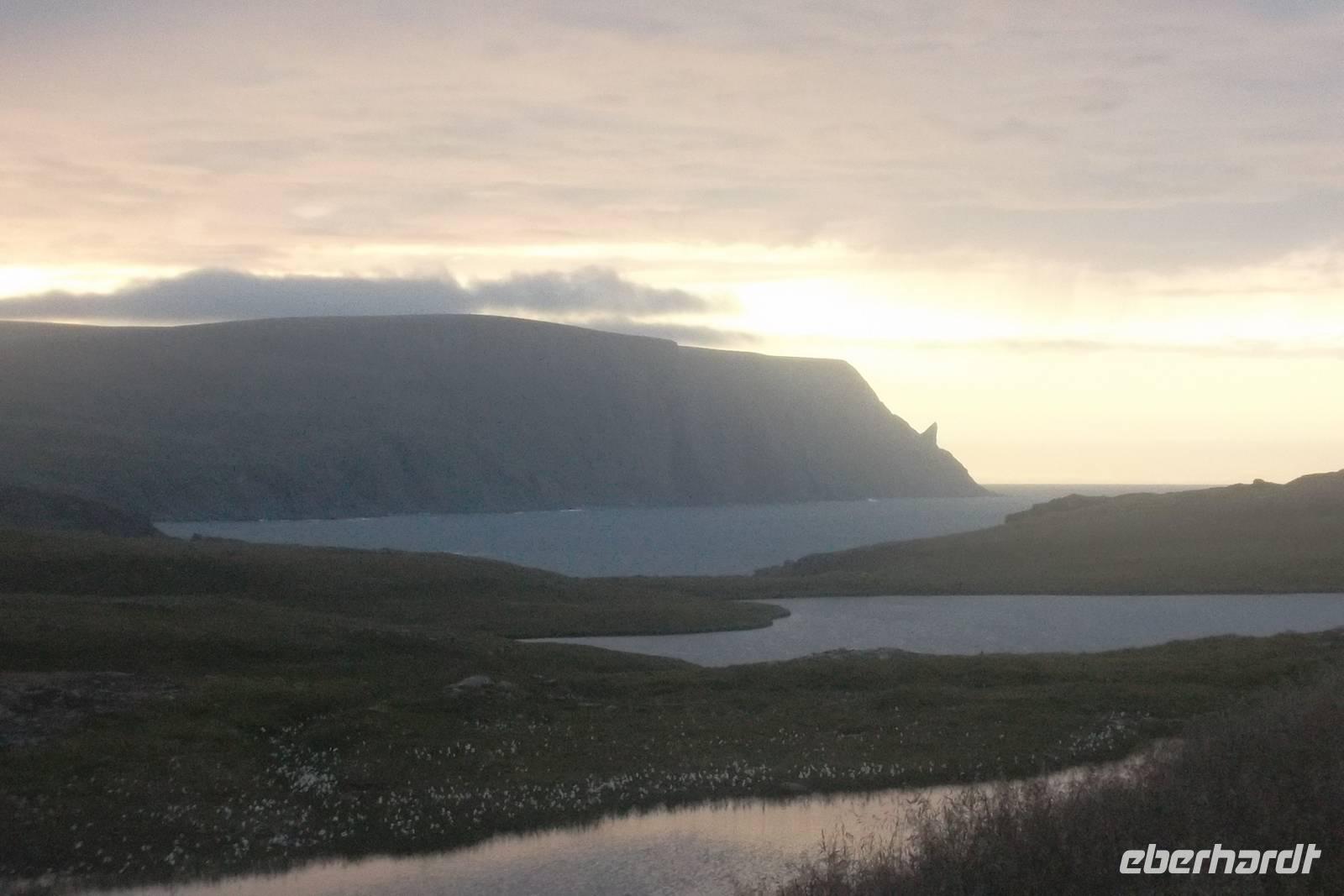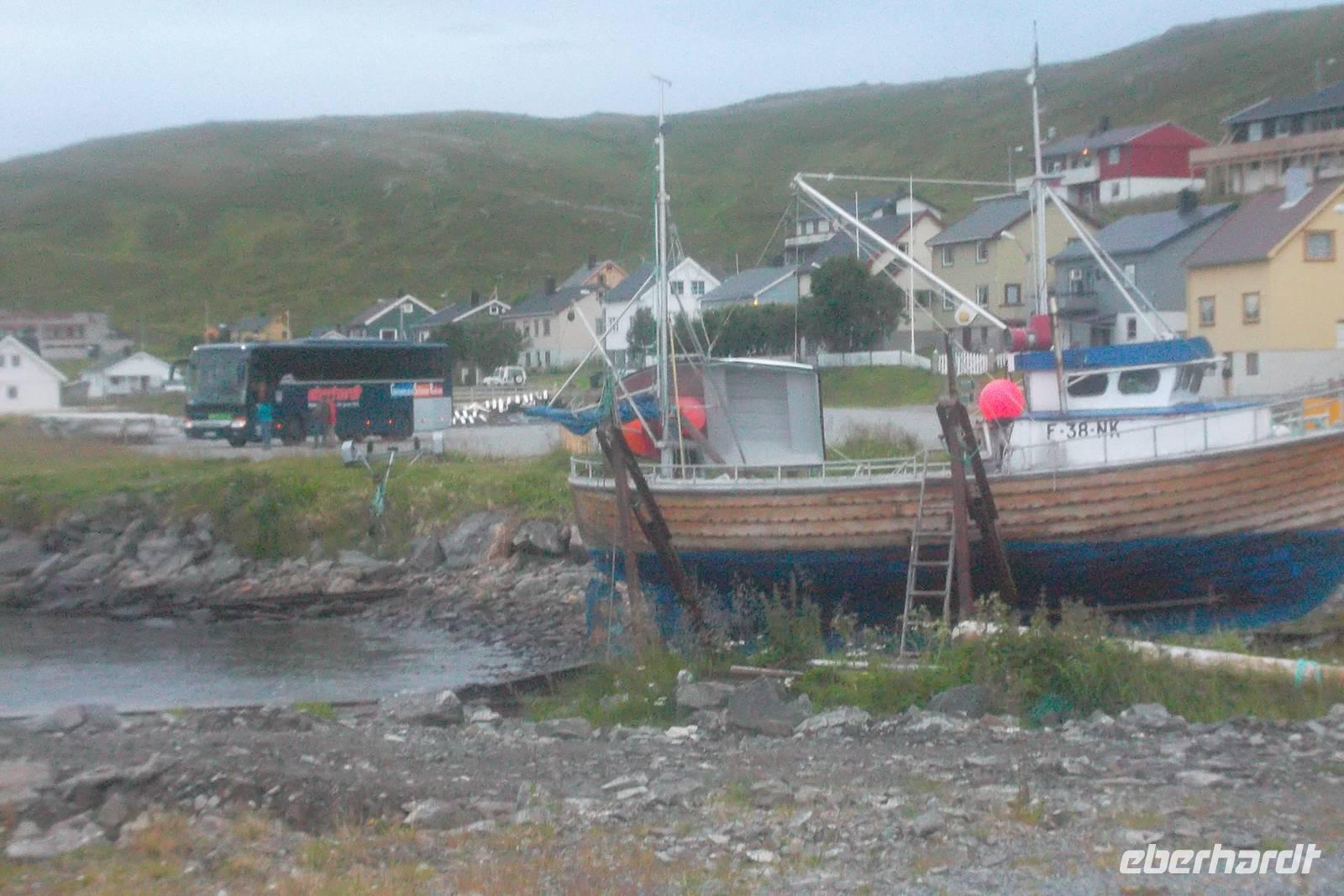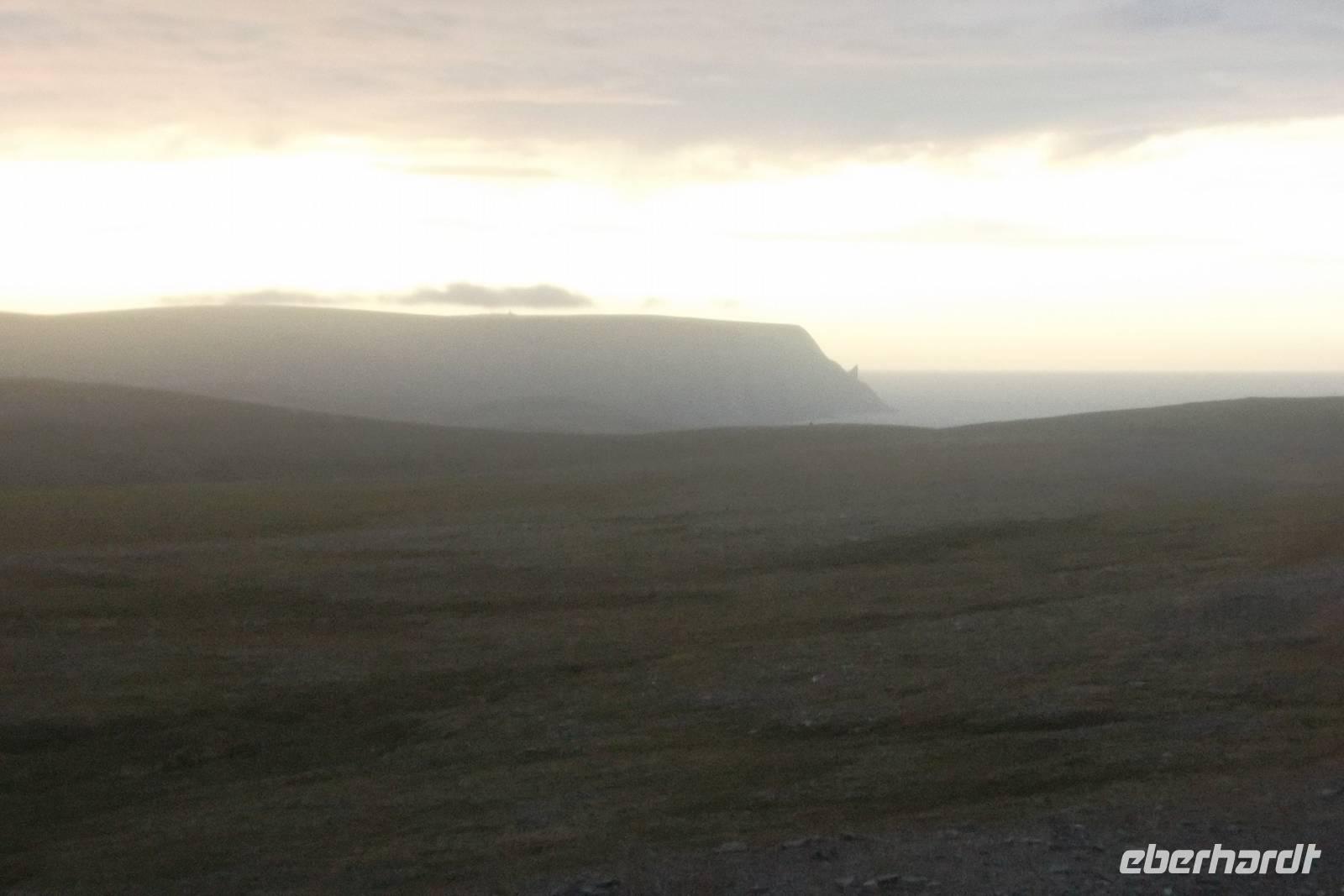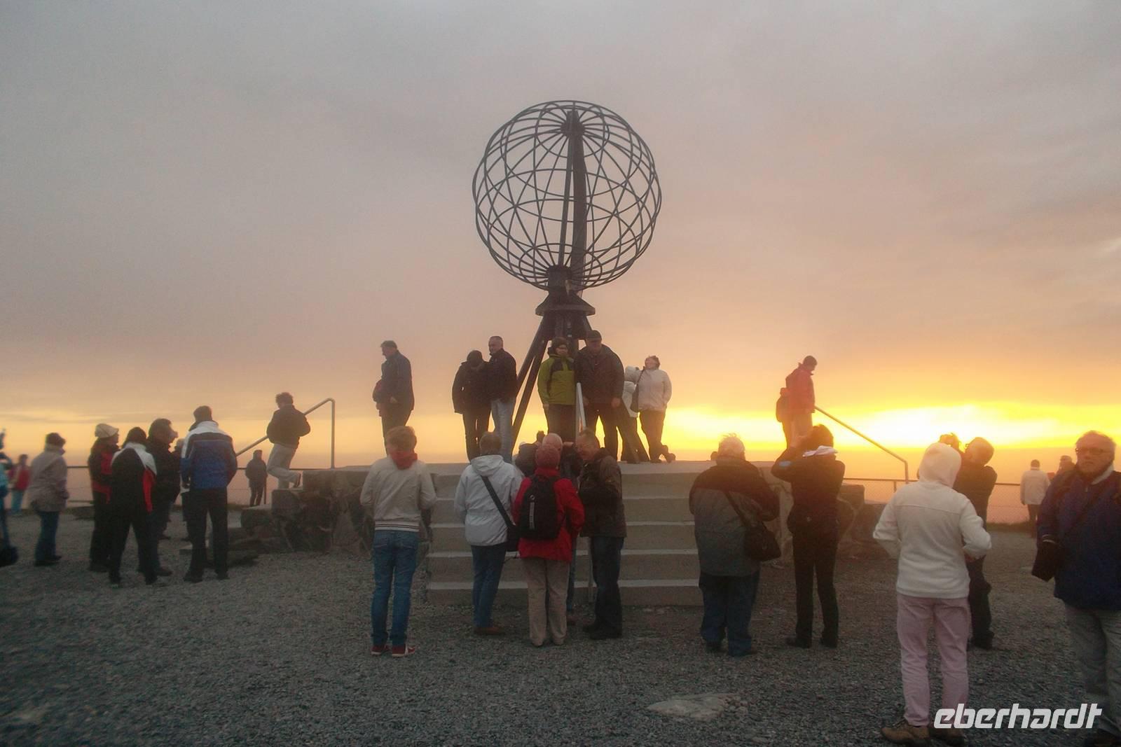 Das Abendessen war nordisch gut und danach waren wir zur „Mitternachts-Sonnen-Tour" verabredet. Ein Fahrer vom Nordkapp-Chauffeur-Service holte uns ab, denn unser Stammfahrer Gerd Köppe musste seine Lenkzeitpause einhalten. Fleming Pedersen aus Dänemark zeigte uns ein paar zusätzliche Extras, die im Sinne der Eberhardt „Richtig Reisen!"-Philosophie das Nordkap wunderbar ergänzten: Zunächst zwei Fotostopps, die den Nordkap-Felsen von Ferne und von der Seite zeigten, ein Landschafts-Stopp in einem Fischerdorf und dann ein Halt in Skarsvåg, dem nördlichsten Fischerdorf der Welt. Das Wetter war - für Nordkap-Verhältnisse sehr gut - die Sonne, teilweise hinter einer geschlossenen Wolkendecke verborgen, tauchte den Himmel in zarte Pastelltöne. Direkt am Nordkap war es diesig und später neblig, dennoch machten wir zunächst ein Gruppenfoto am berühmten Globus auf dem Kapfelsen, der das „Ende der Welt" symbolisiert. Wie gesagt - das Wetter war nicht echt toll, aber beim Ruf des Nordkaps - mehr als 300 Tage Regen und Nebel im Jahr - hatten wir dennoch Glück. Zwei Stunden bis halb eins nach Mitternacht konnten die Gäste nun individuell verbringen - vielleicht im kleinen Nordkap-Museum mit Dioramen, mit Besuch des „königlichen" Aussichtspunktes, im Kino mit Nordkap-Film oder in Bar und Café der Nordkap-Halle. Natürlich gab es auch einen riesigen Souvenirladen und das berühmte Nordkap-Postamt, in dem jede hier abgeschickte Postkarte eine eigene Nordkap-Abstempelung erhält. Das Wetter konnte sich neben Nebel nur manchmal zu tiefhängenden Wolken und Nebelschwaden über das Kap durchringen, an wenigen Aufklarungspunkten schien auch mal die Sonne. Gegen ein Uhr nachts waren wir zurück im Hotel, aber jeder hatte tolle Fotos und so viele Erlebnisse, dass wir den Ausflug als „sehr lohnend" in unser Reisetagebuch eintragen konnten!