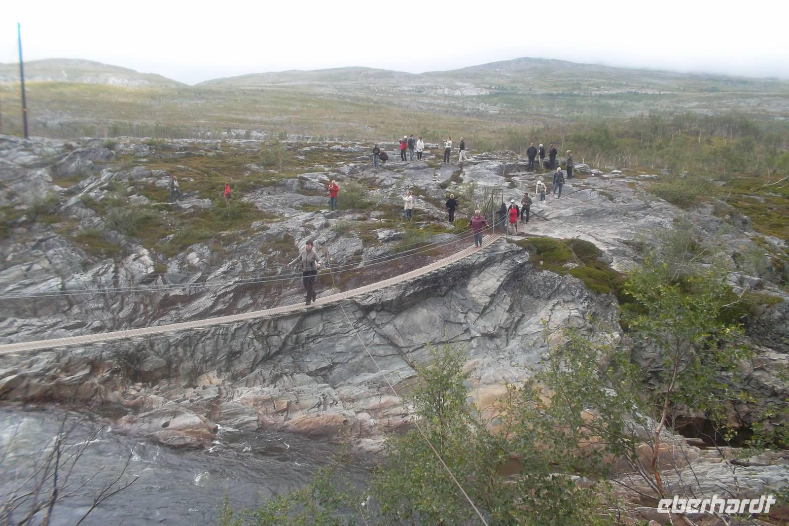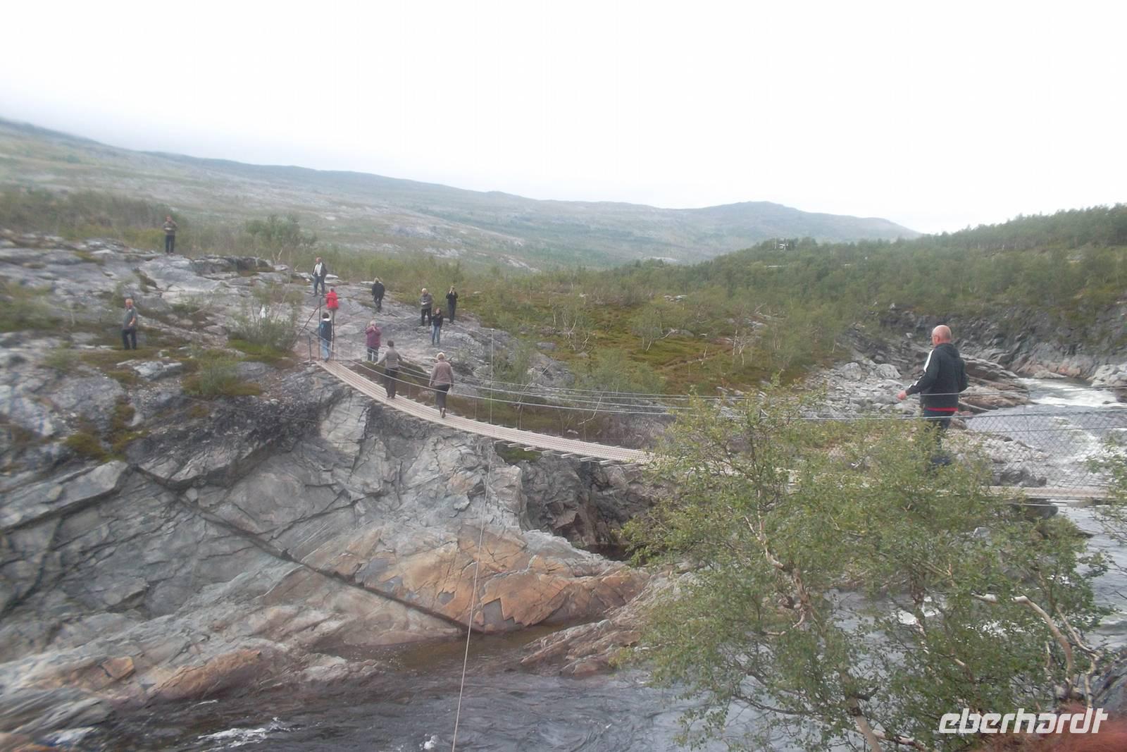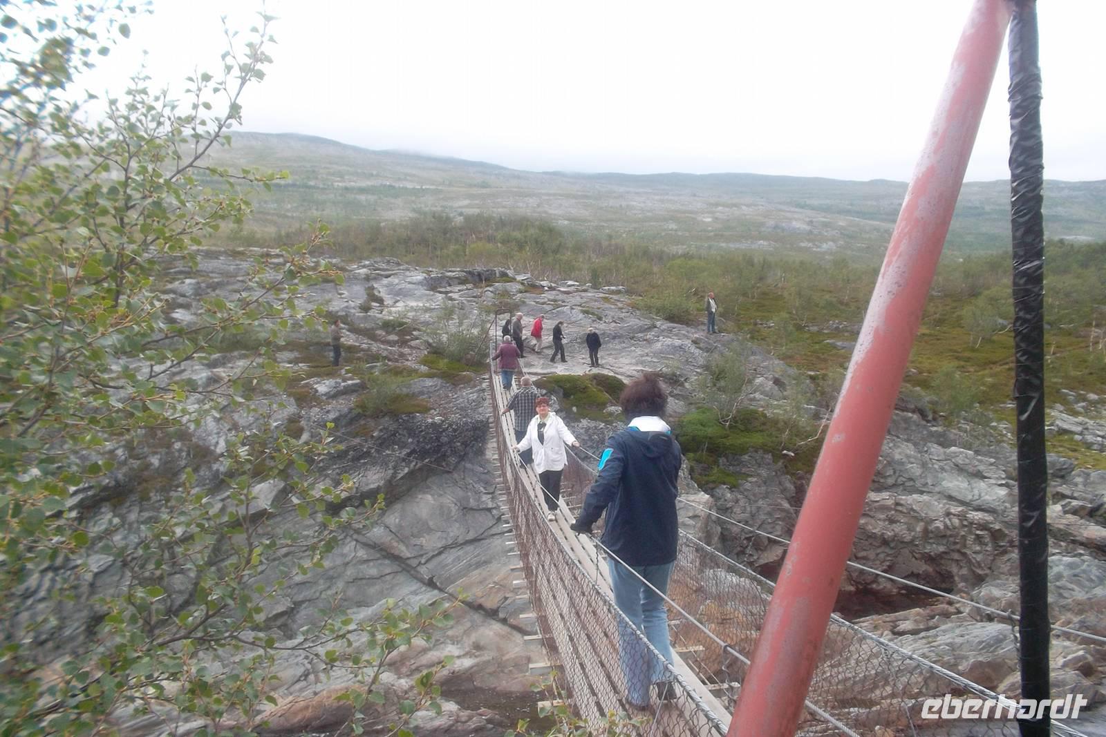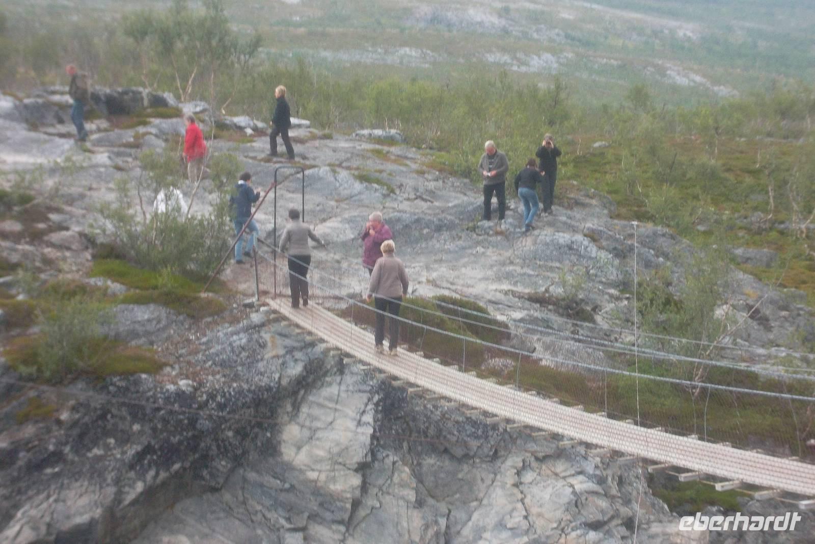 Nach einem unserer üblichen zweistündigen „Bequemlichkeitsstopps" legten wir dann einen Stopp gemäß der Eberhardt „Richtig reisen!"-Philosophie ein. Etwas abenteuerlich war das Überqueren der Hängebrücke über den .... -Fluss. Sie ist etwas schwankend, aber viele unserer Gäste haben sich den Spaß gemacht und haben den Fluss auf diese unkonventionelle Art zweimal überquert. Nach diesem „Abenteuer" konnten wir dann einen Höhepunkt menschlicher Kultur und Geschichte genießen: die bekannten und überaus interessanten Felszeichnungen von Alta (Gebiet Hjemmeluft) sind mehrere tausend Jahre alt. Sie stammen aus der Jungsteinzeit und der Bronzezeit, den ersten Jahren menschlicher Besiedelung des Nordens nach der Eiszeit. Hier in Hjemmeluft findet man Jagdszenen, Tiere und Menschen - sogar Boote - die als Hauptfiguren die einzigartigen Felsritzungen beleben.